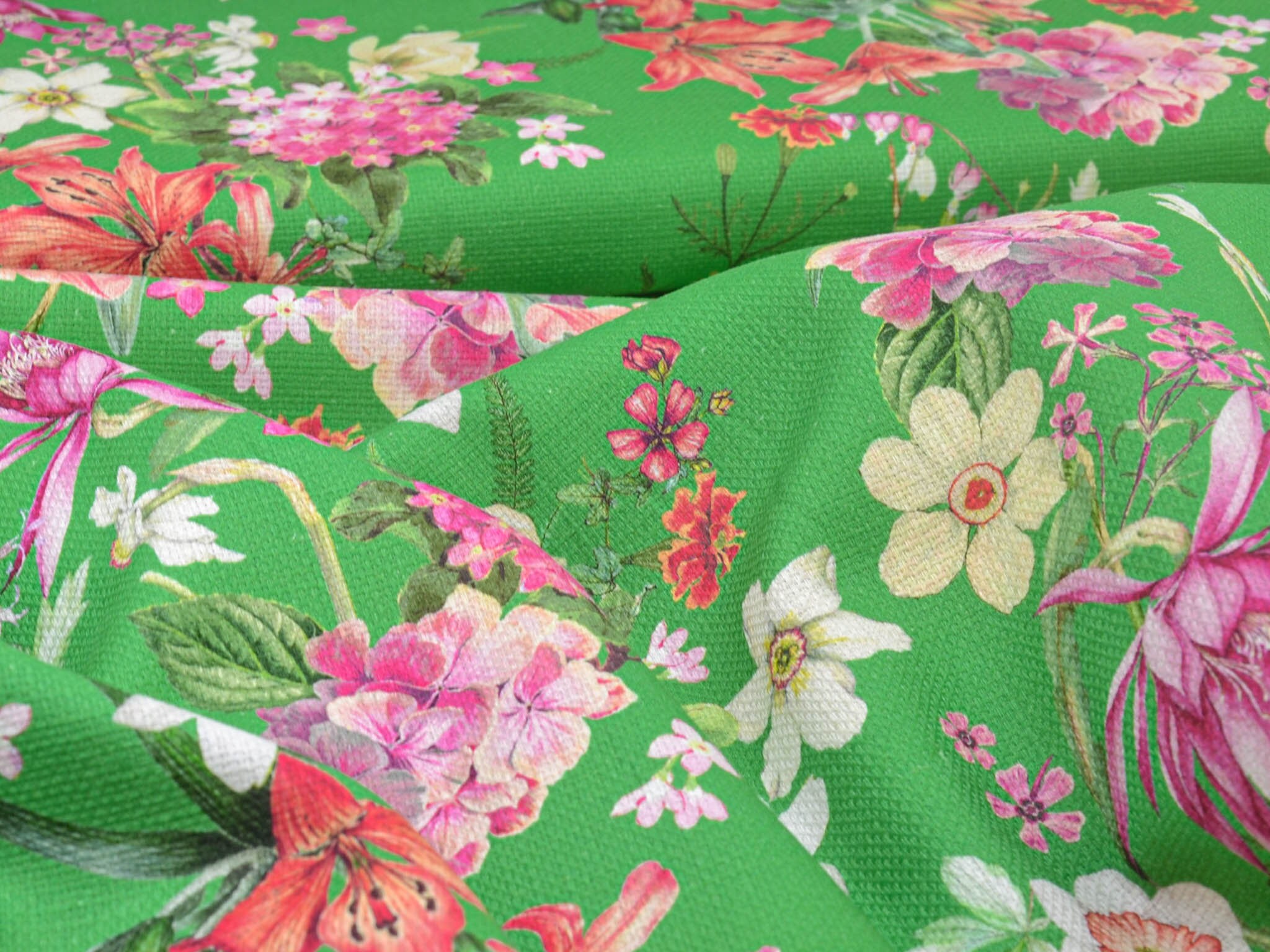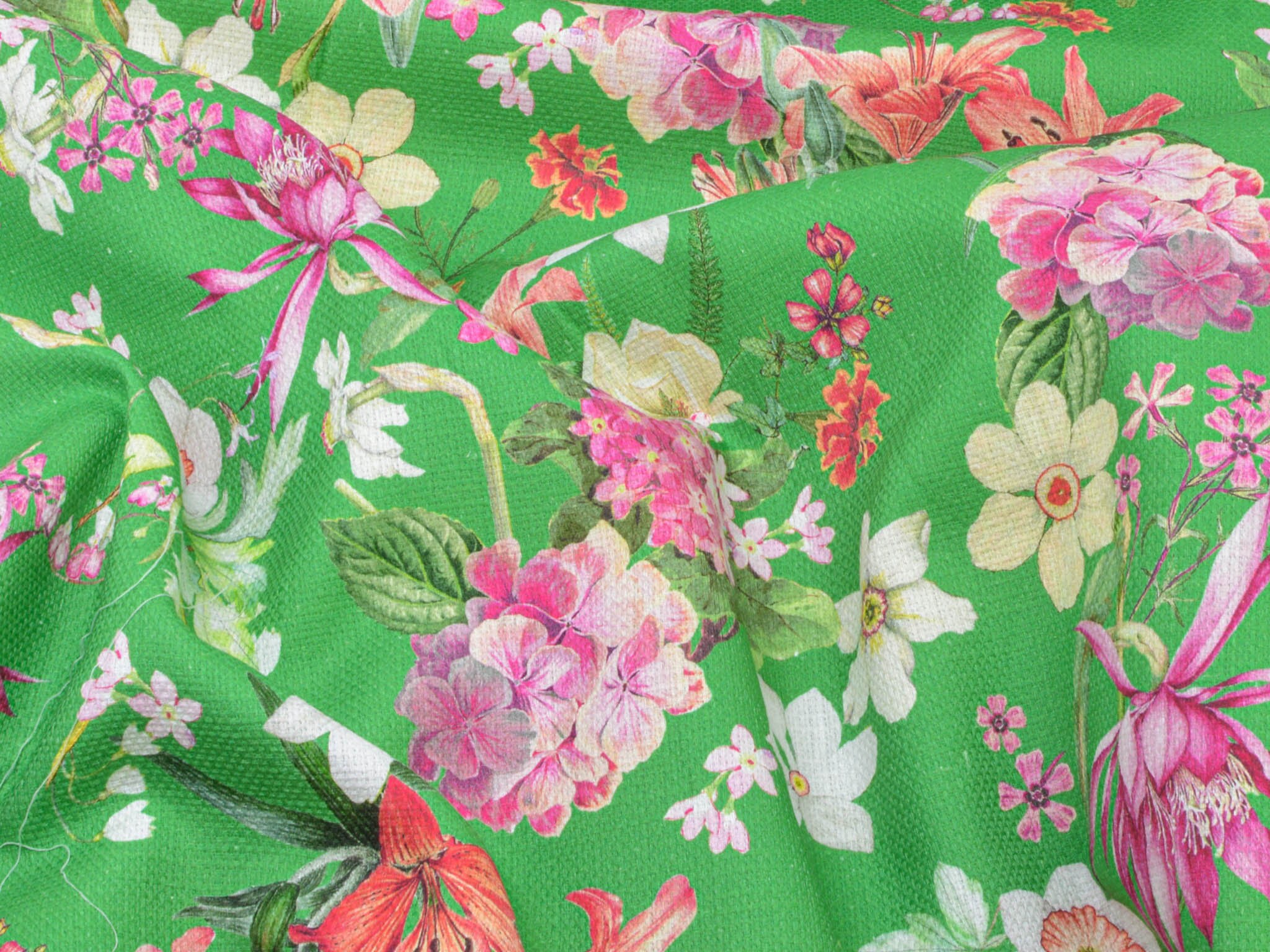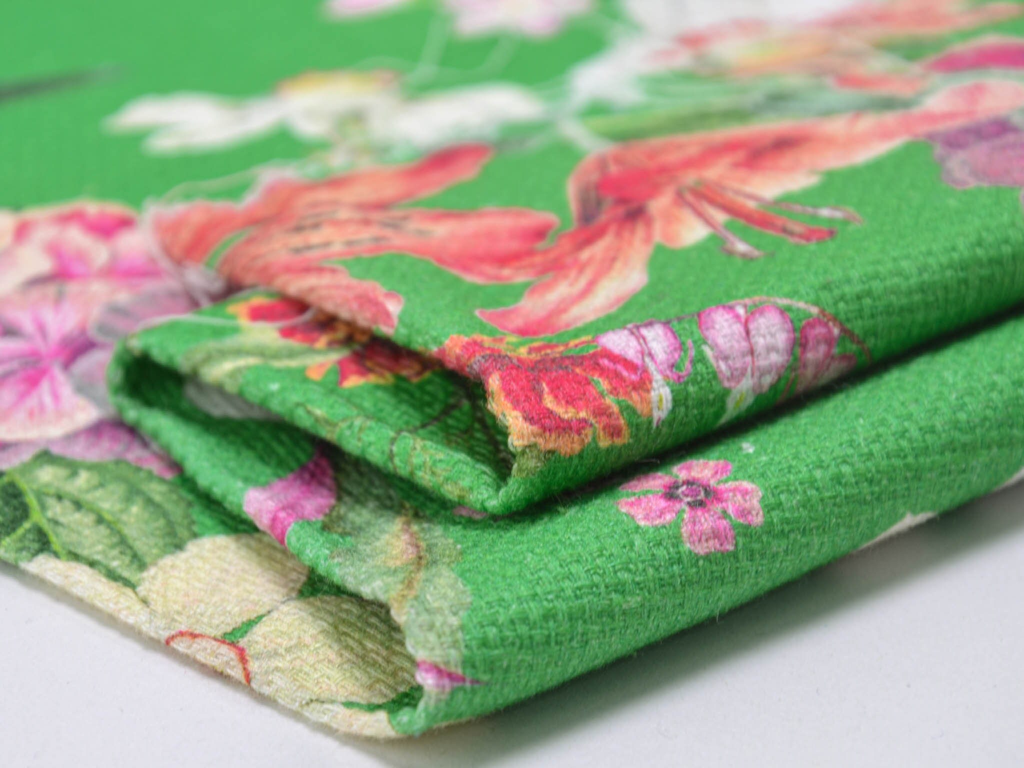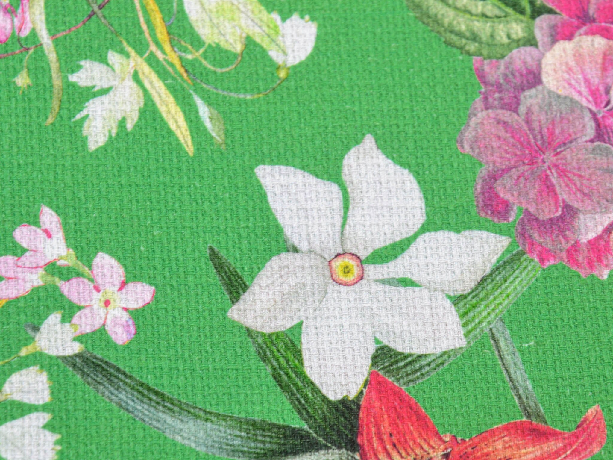 Hochwertiger Leinenstoff aus Italien. Der grüne Stoff zeigt große Blumen in pink, rosa, weiß. Geeignet für Röcke, Kleider, Hosen, Jacken und vieles mehr.