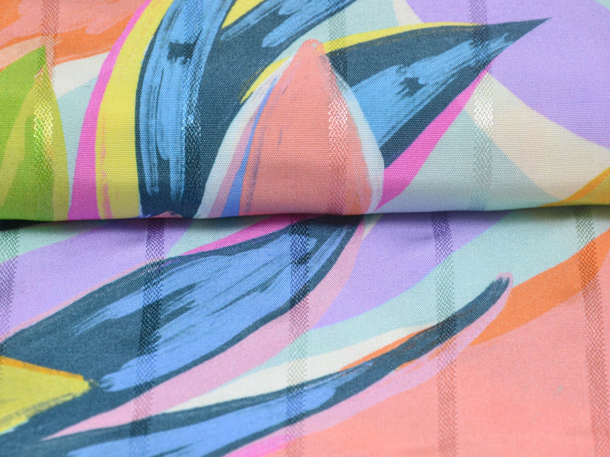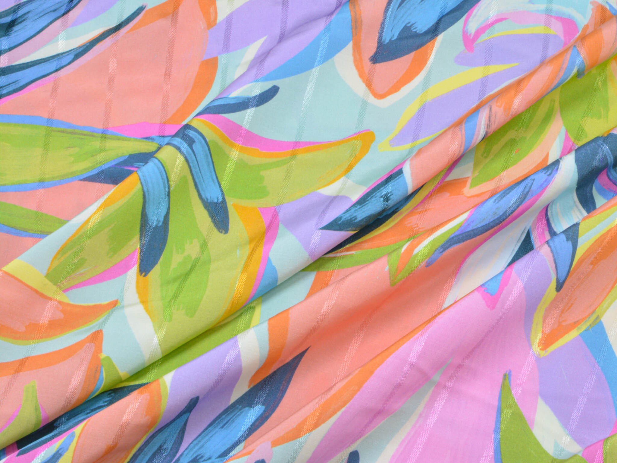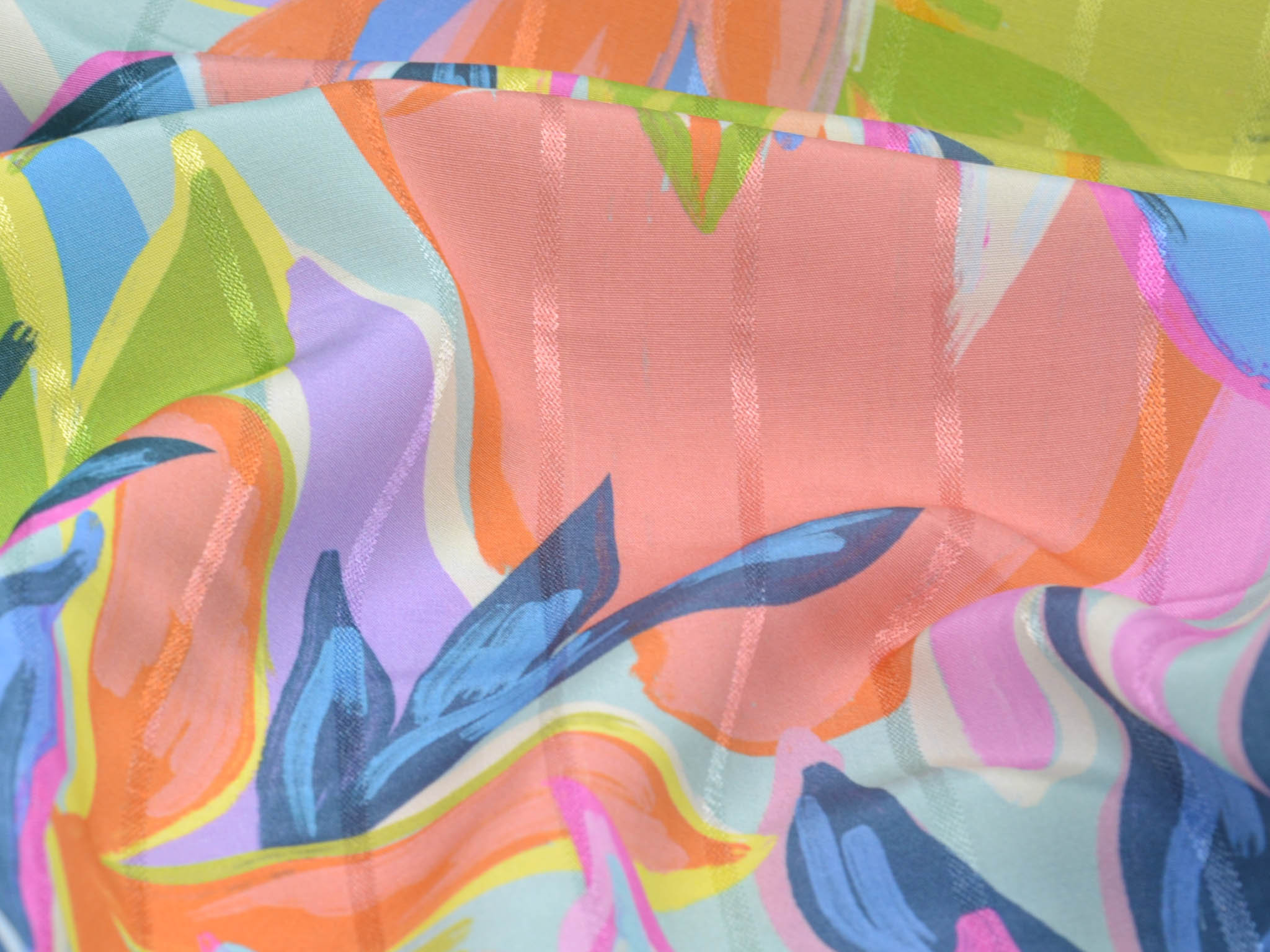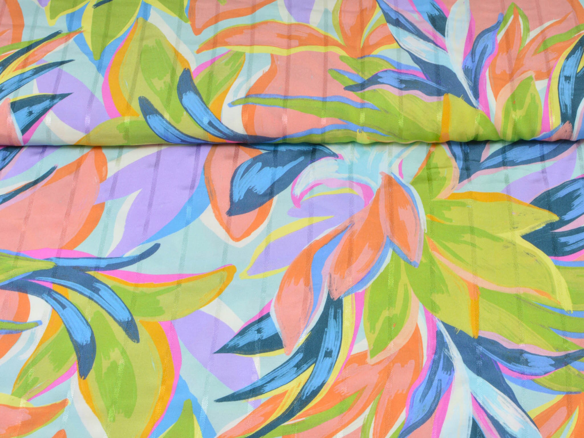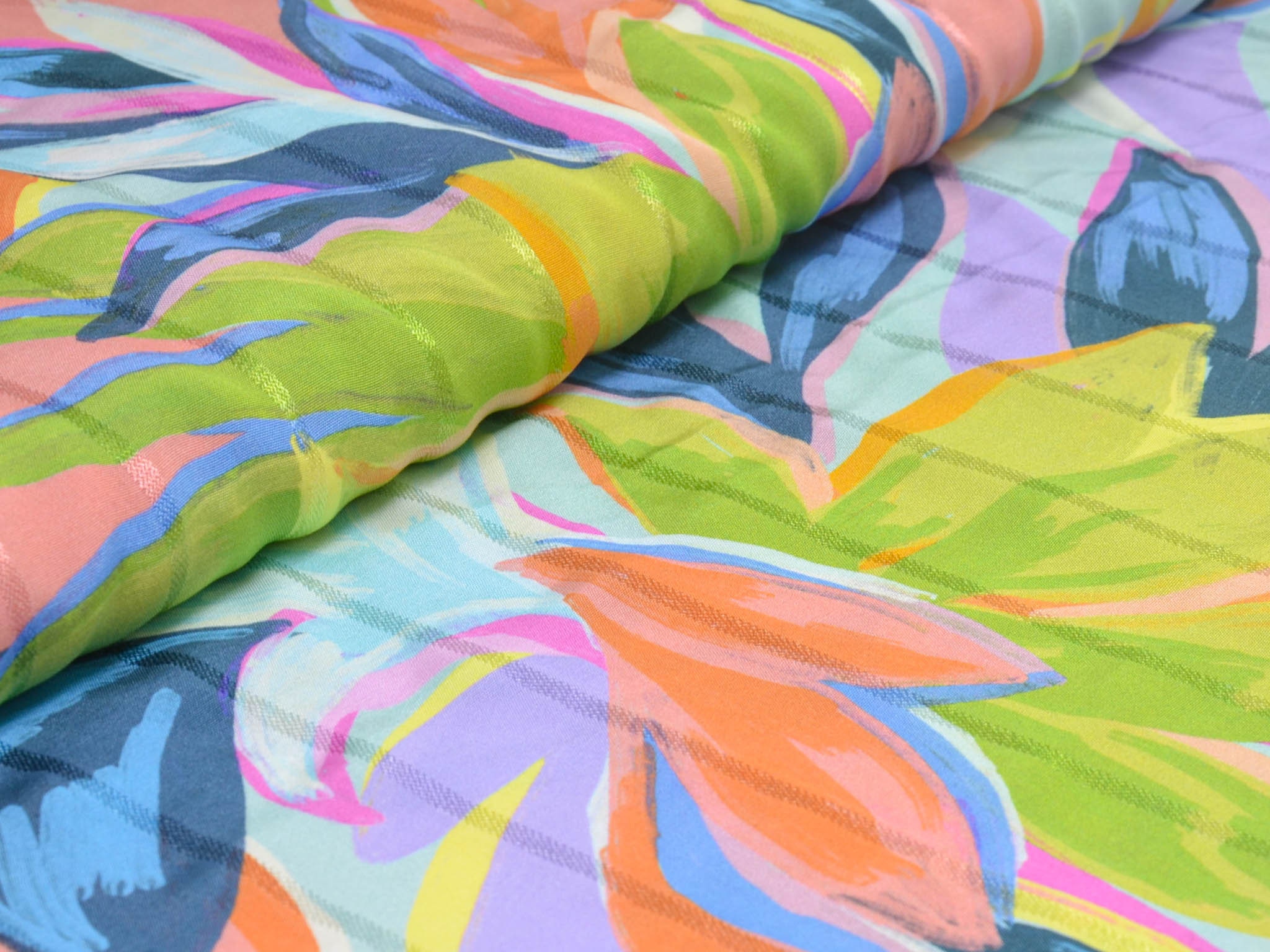 Hochwertiger Viskose Stoff aus Italien. Der Stoff zeigt bunte Blätter. Glänzende Streifen verzieren den Stoff. Er eignet sich zum Nähen von Blusen, Röcke, Kleidern und vielem mehr. Er hat einen fließenden Fall.
