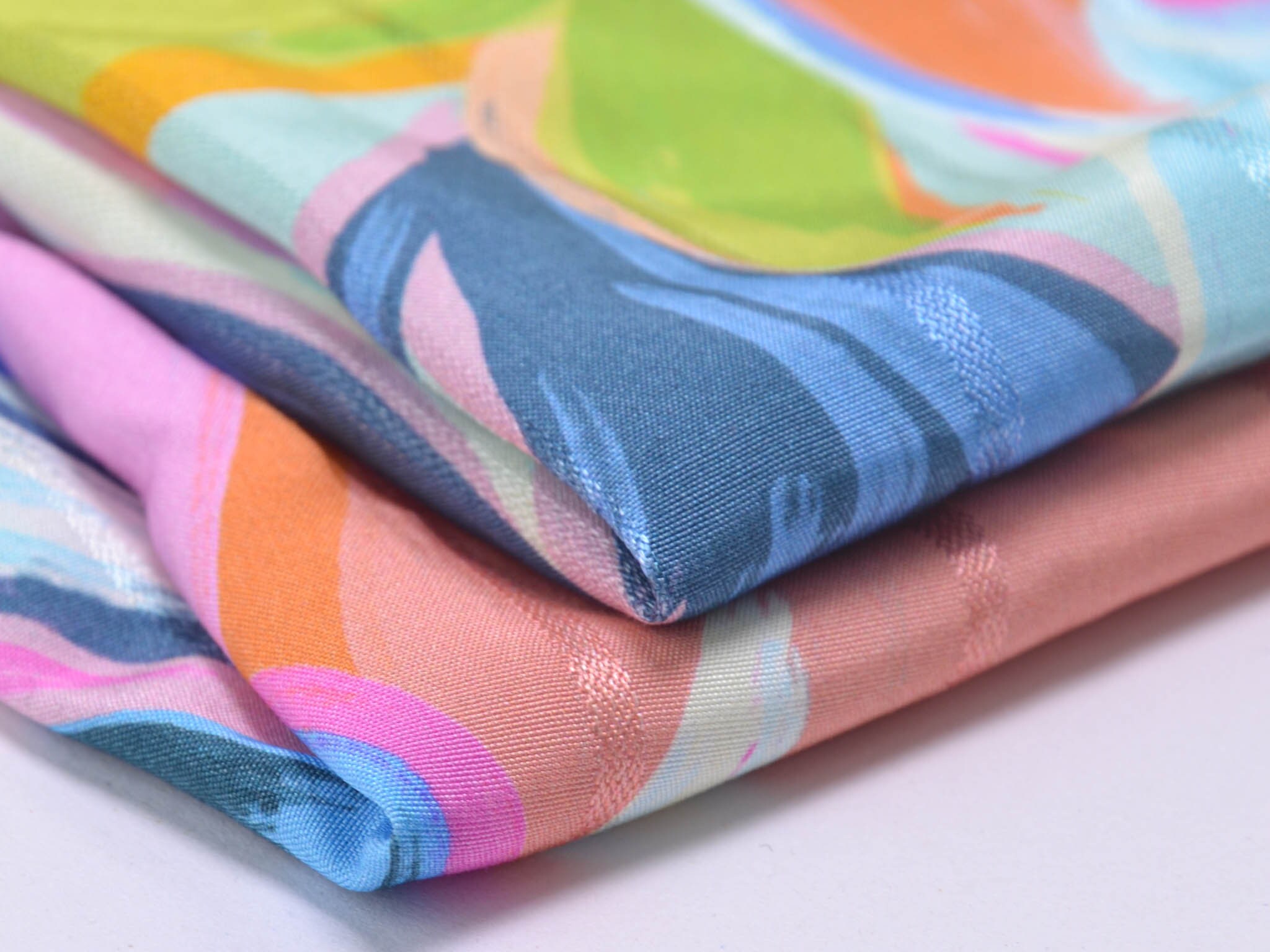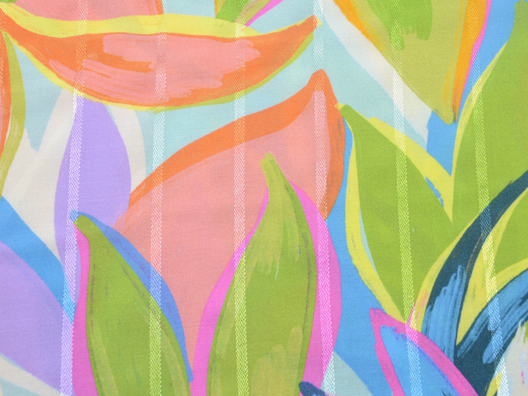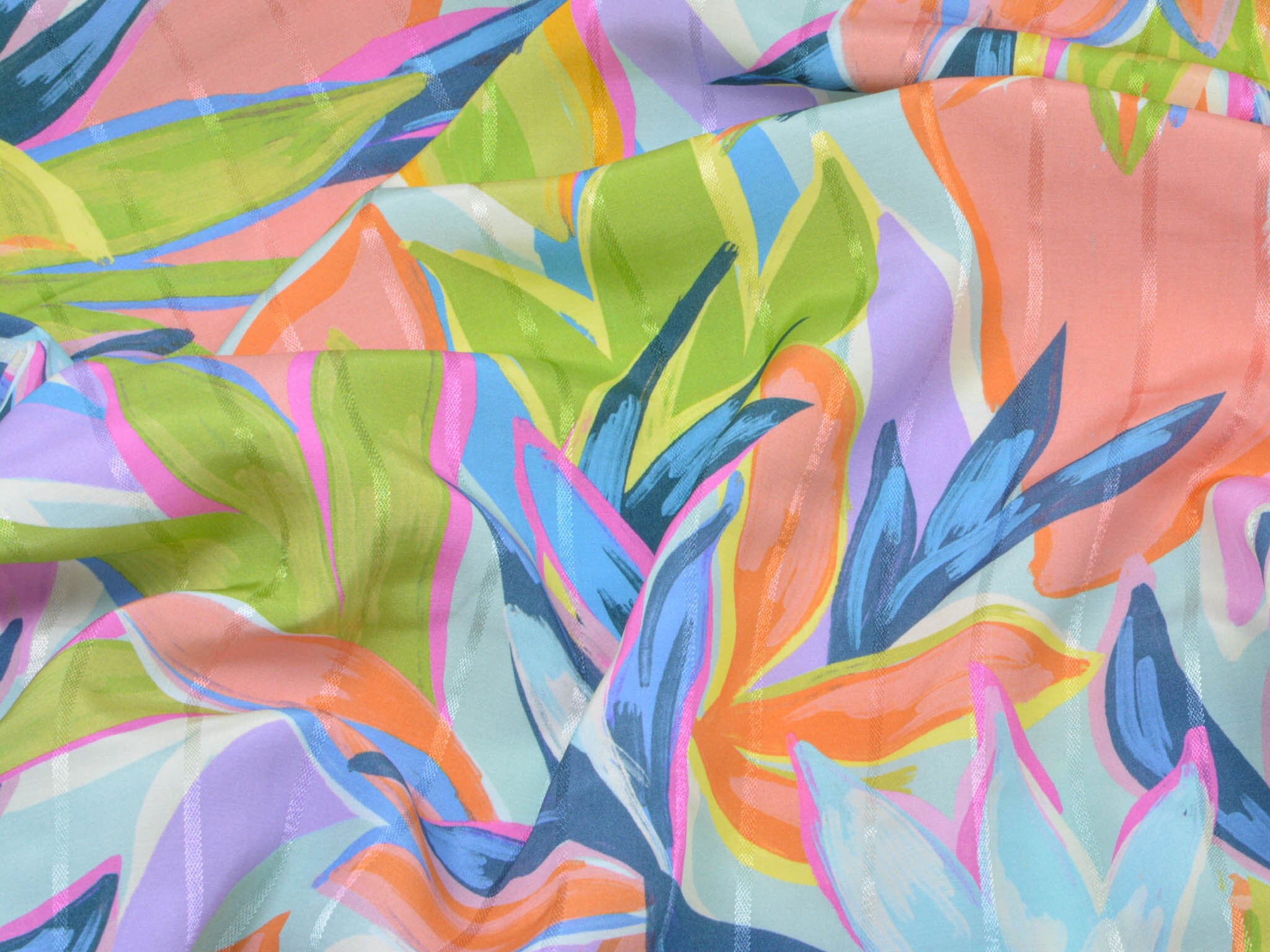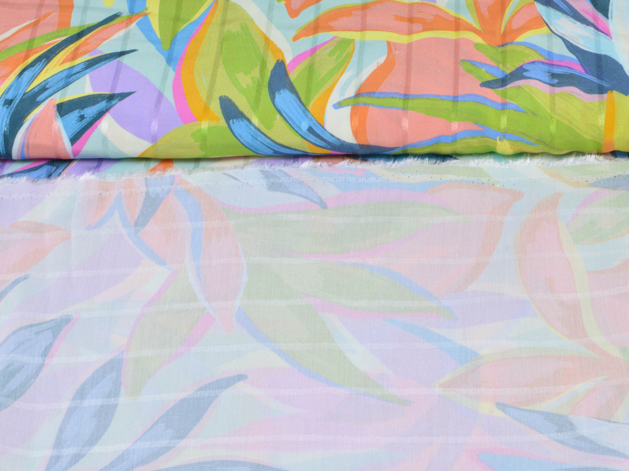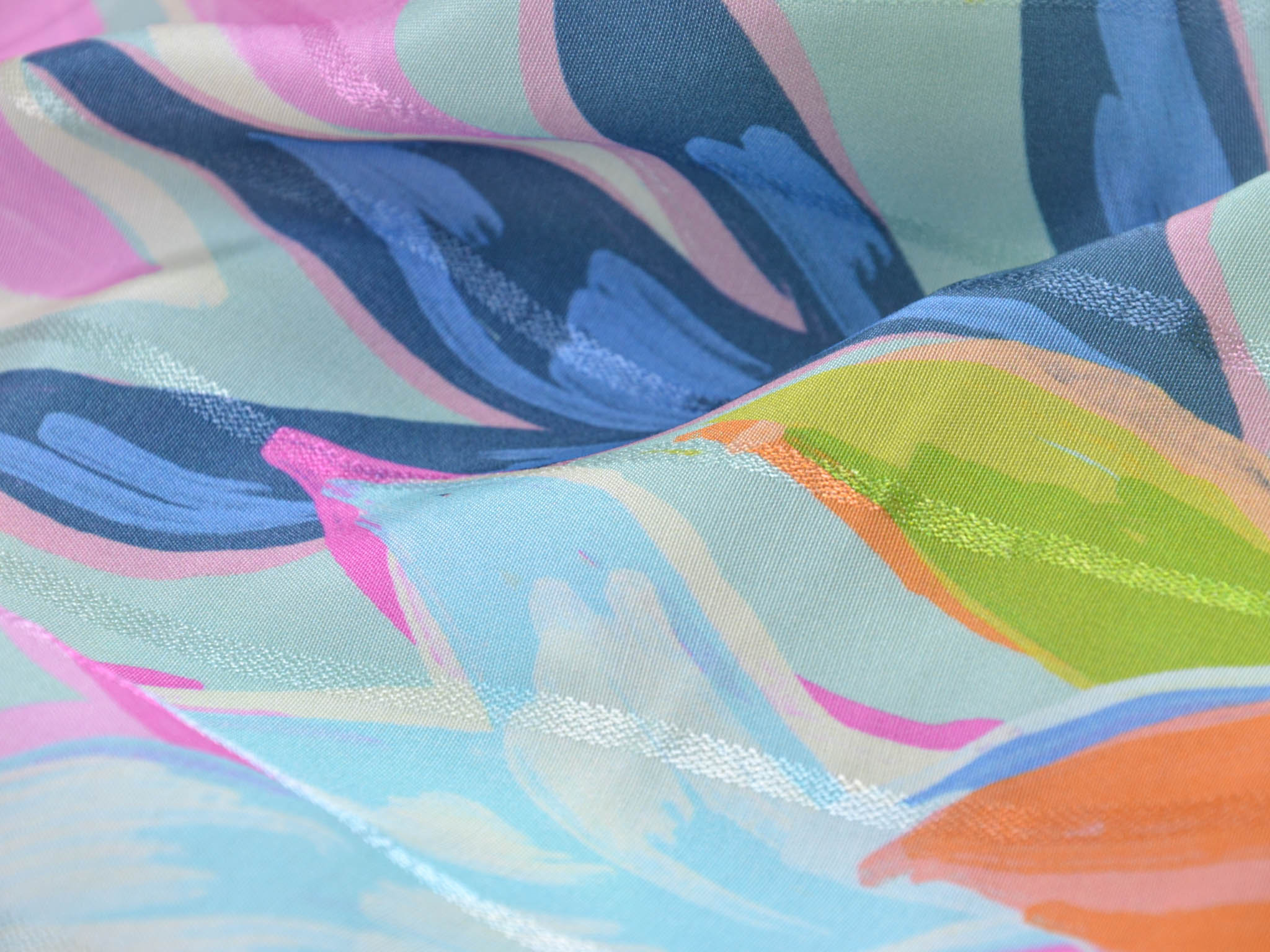 Hochwertiger Viskose Stoff aus Italien. Der Stoff zeigt bunte Blätter. Glänzende Streifen verzieren den Stoff. Er eignet sich zum Nähen von Blusen, Röcke, Kleidern und vielem mehr. Er hat einen fließenden Fall.