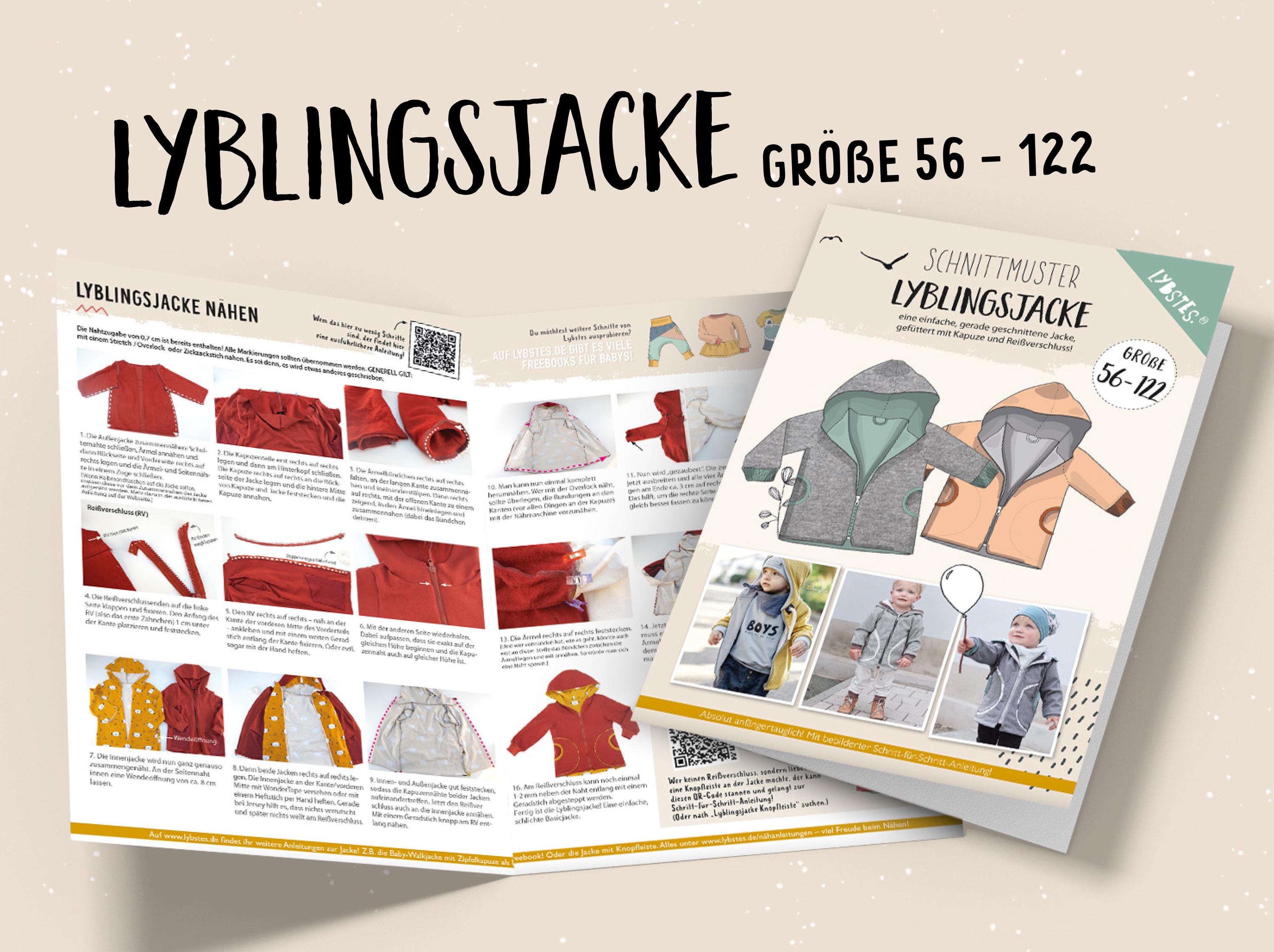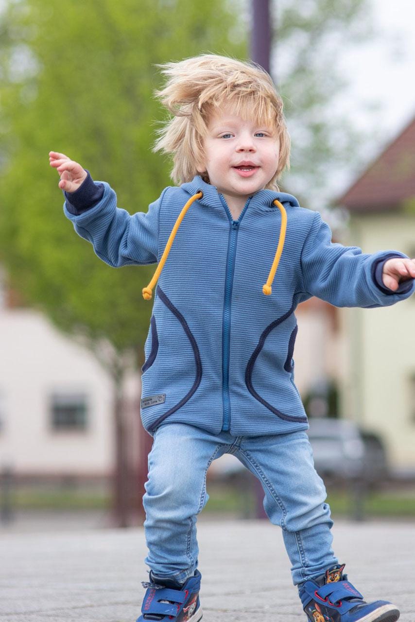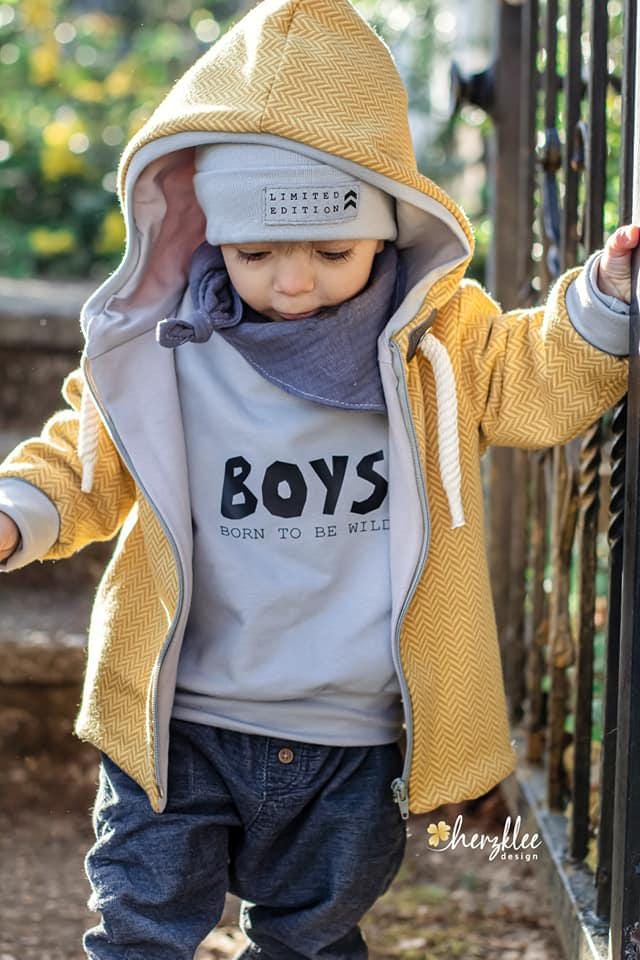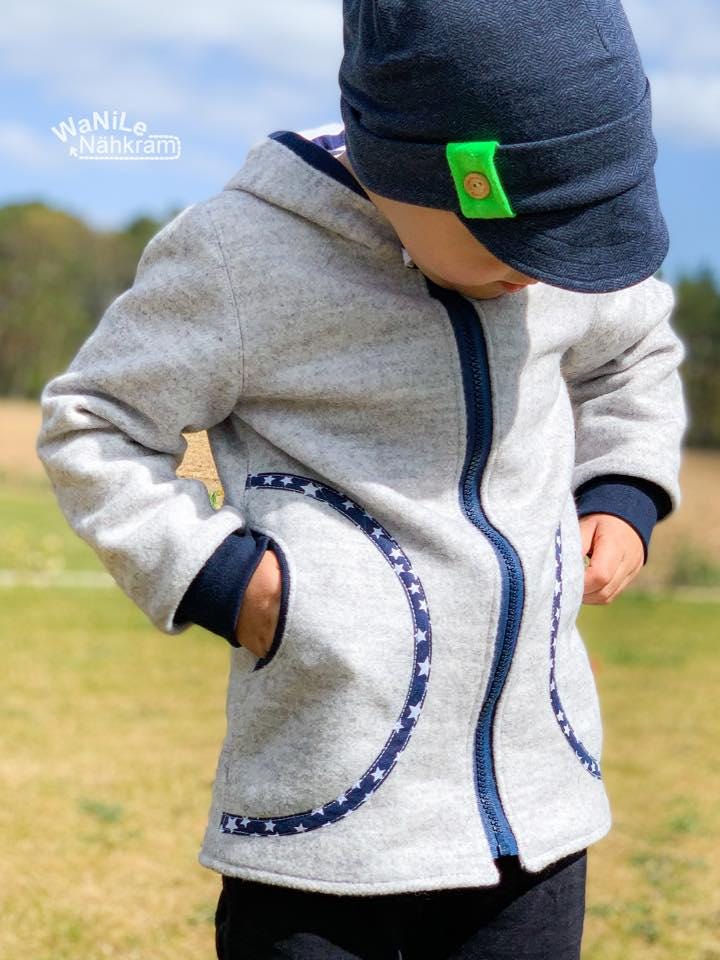 It's designed for both boys and girls. It can be sewn from a variety of materials: sweat and jersey, but also from sturdy woven fabrics, denim, coat fabrics, softshell, or dry oilskin.