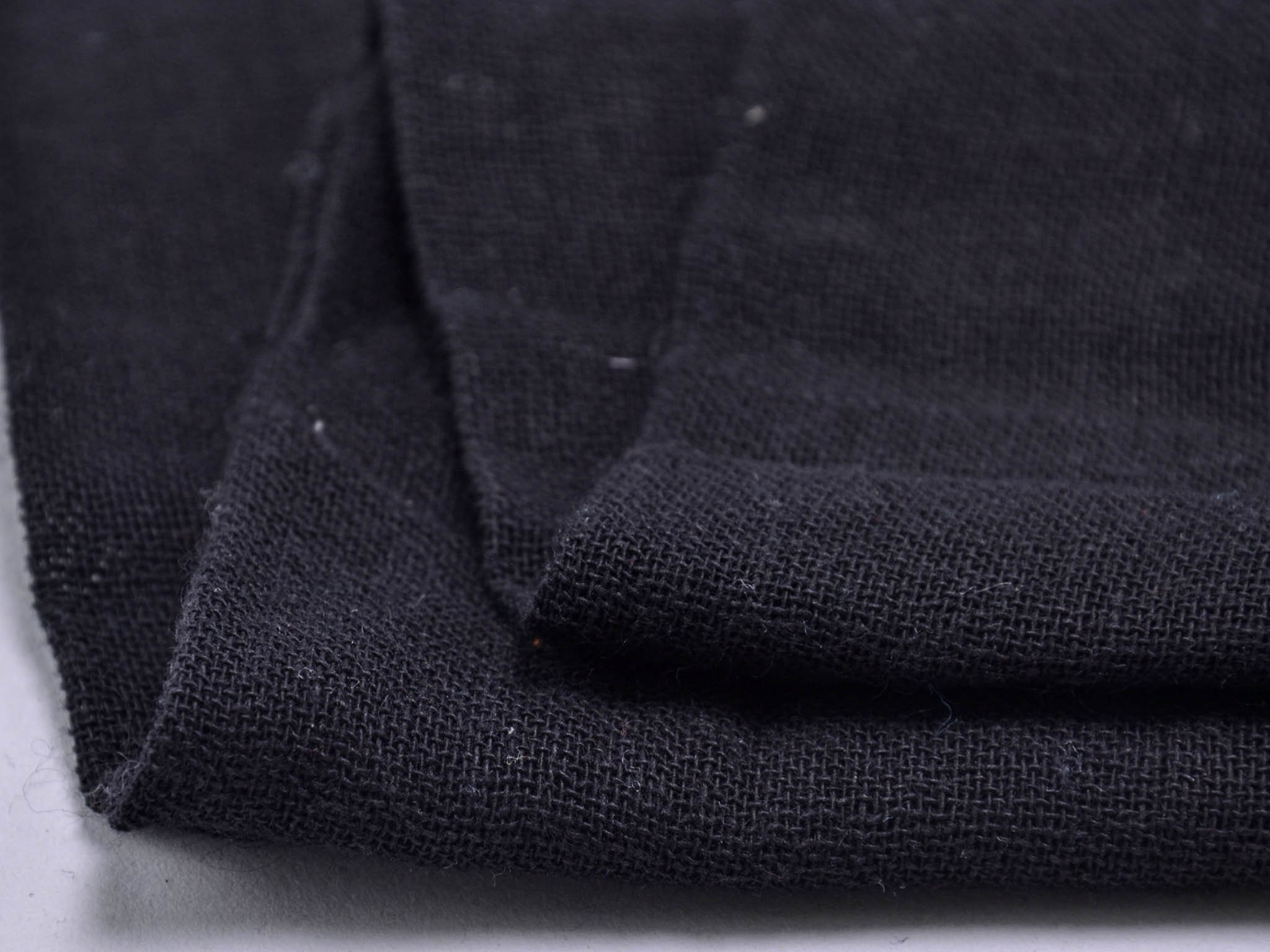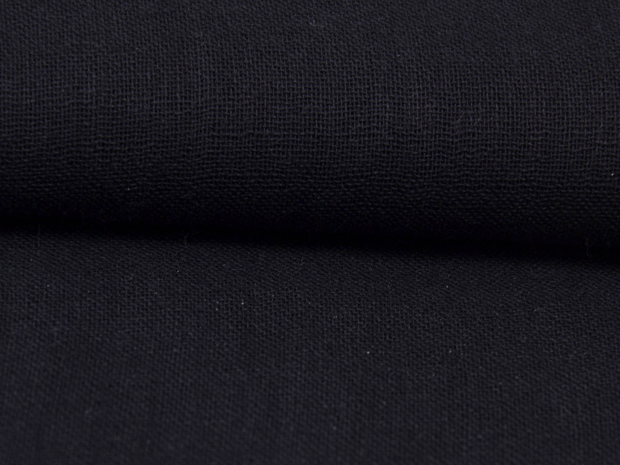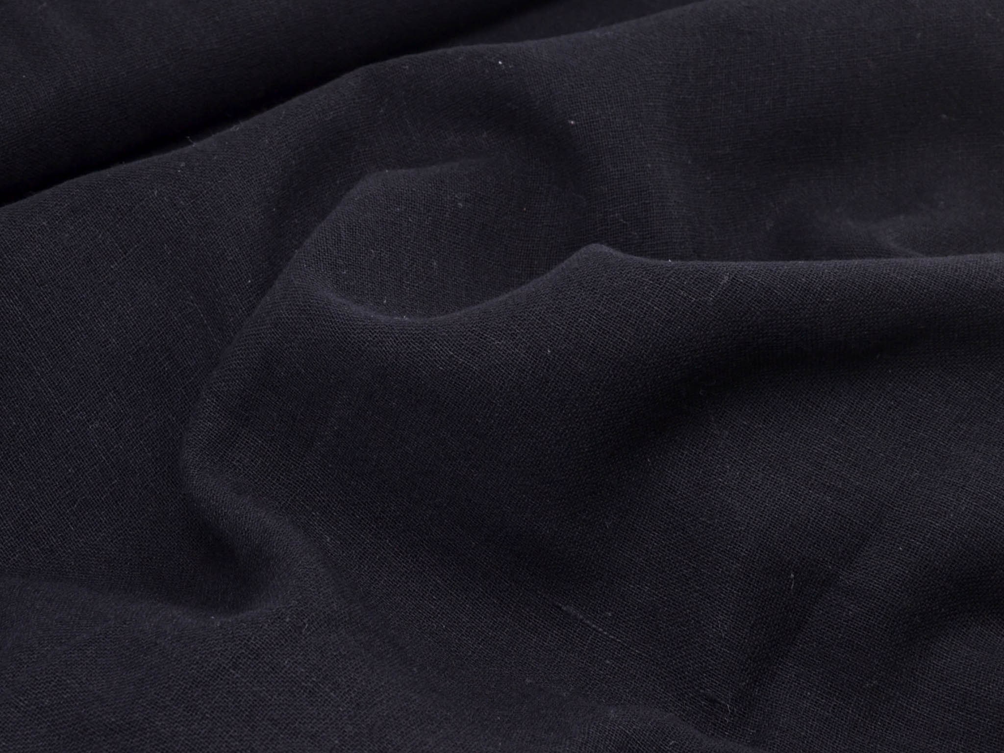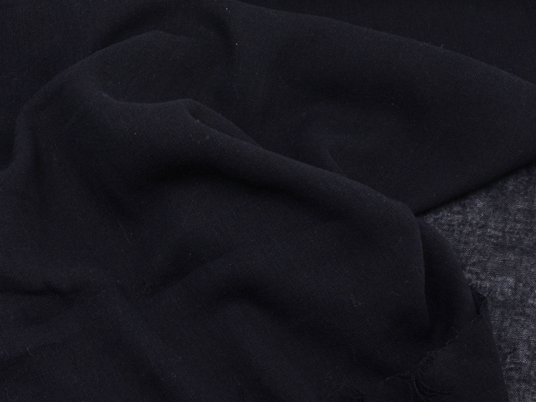 Lightweight linen and rayon fabric in plain black. The fabric is loosely woven and therefore translucent. It is suitable for sewing thin jackets, loose-fitting dresses, and skirts. It may need to be lined.