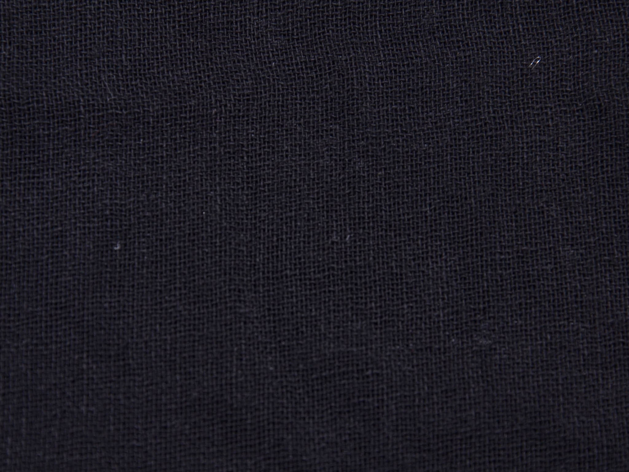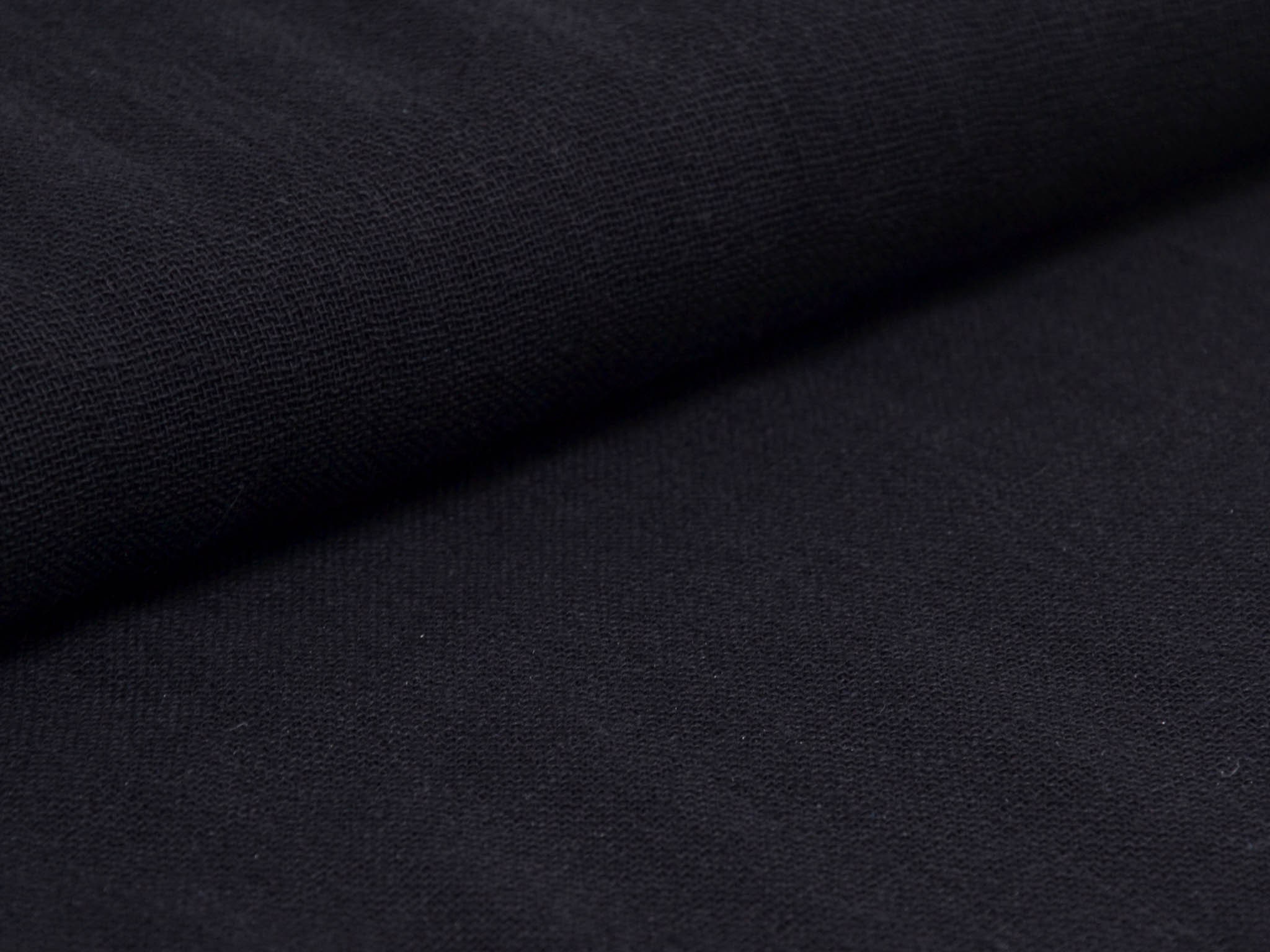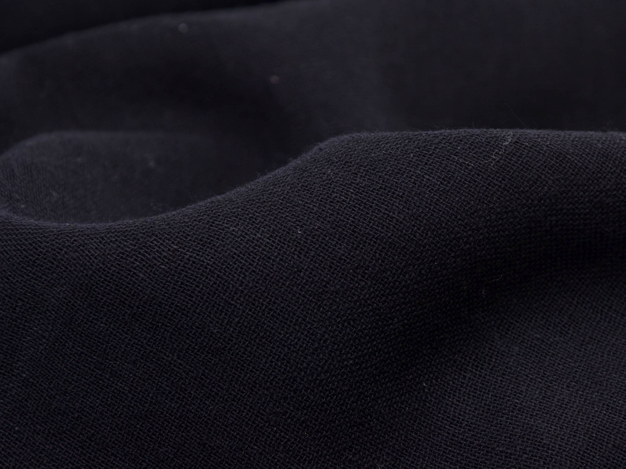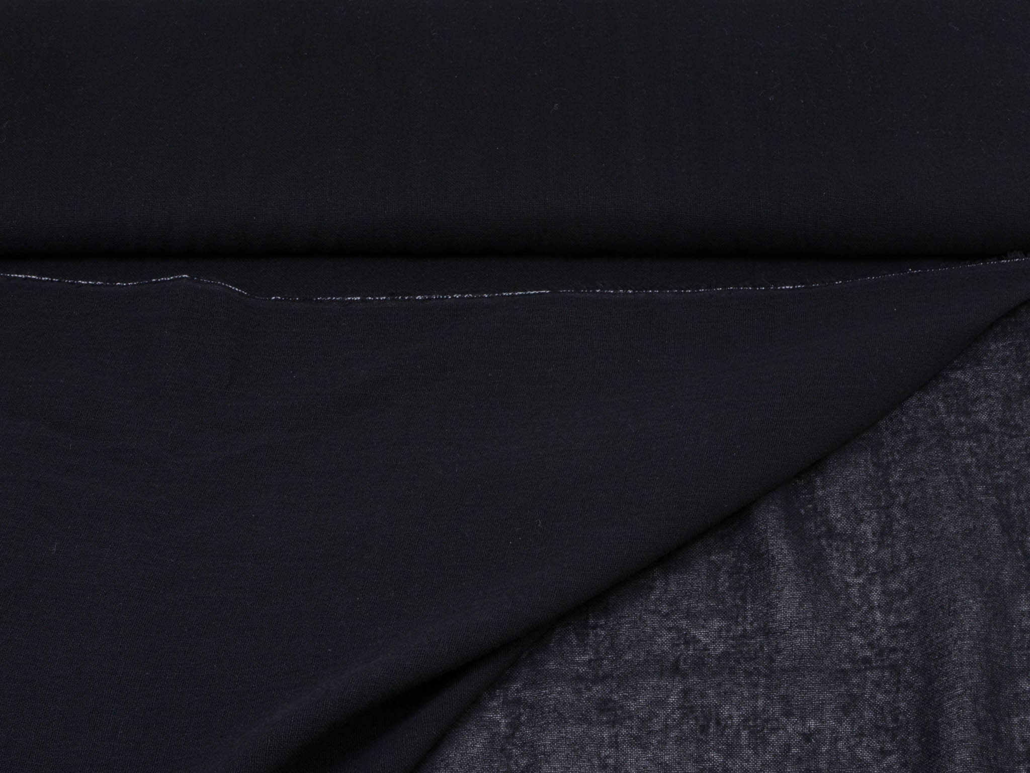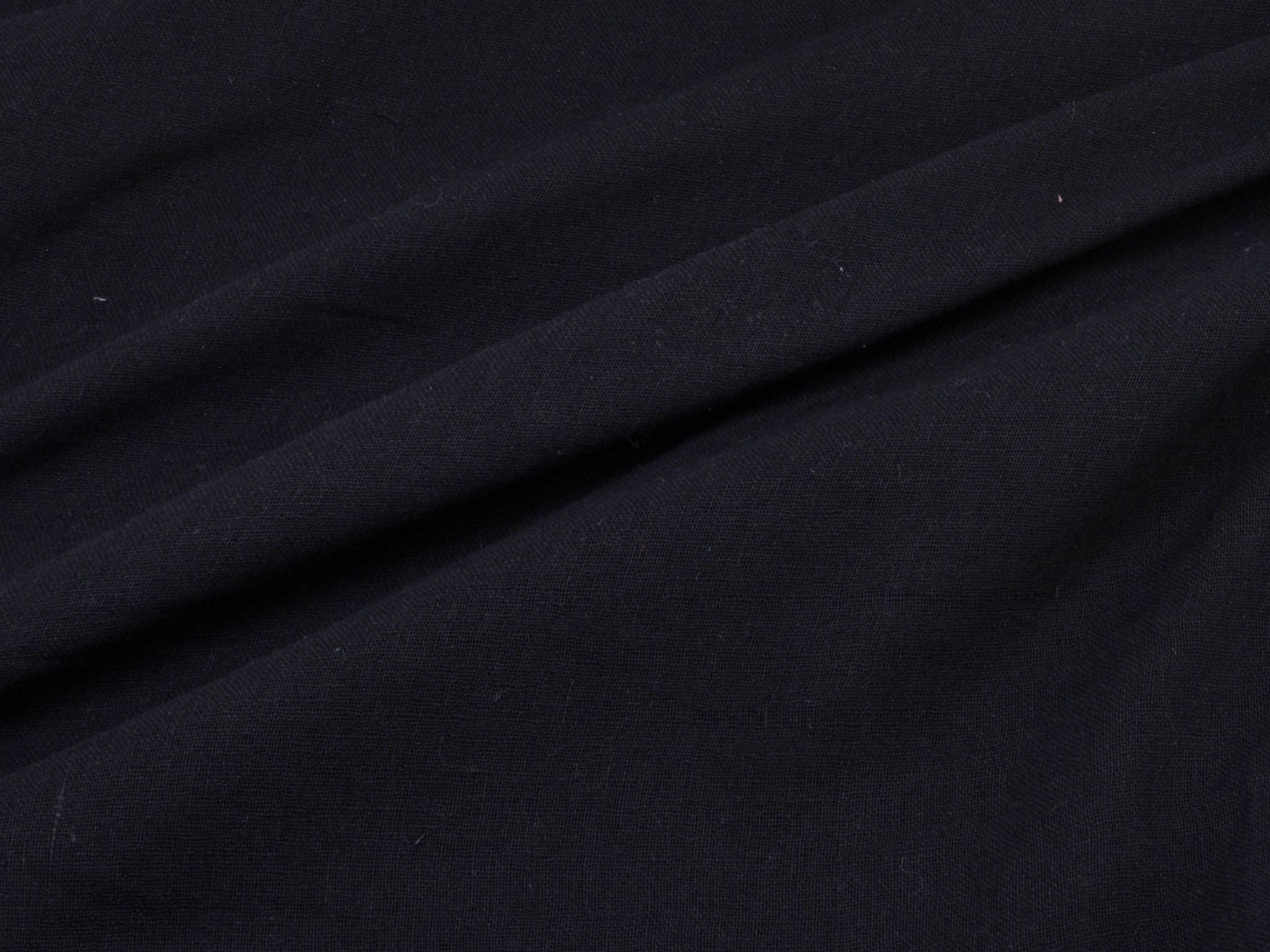 Lightweight linen and rayon fabric in plain black. The fabric is loosely woven and therefore translucent. It is suitable for sewing thin jackets, loose-fitting dresses, and skirts. It may need to be lined.
