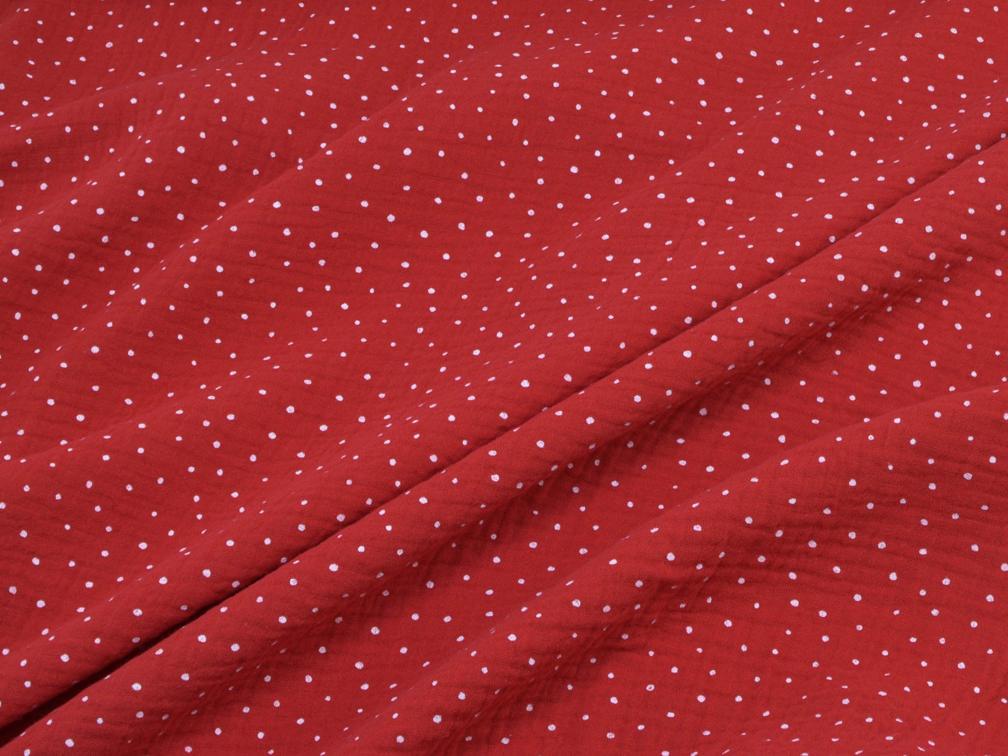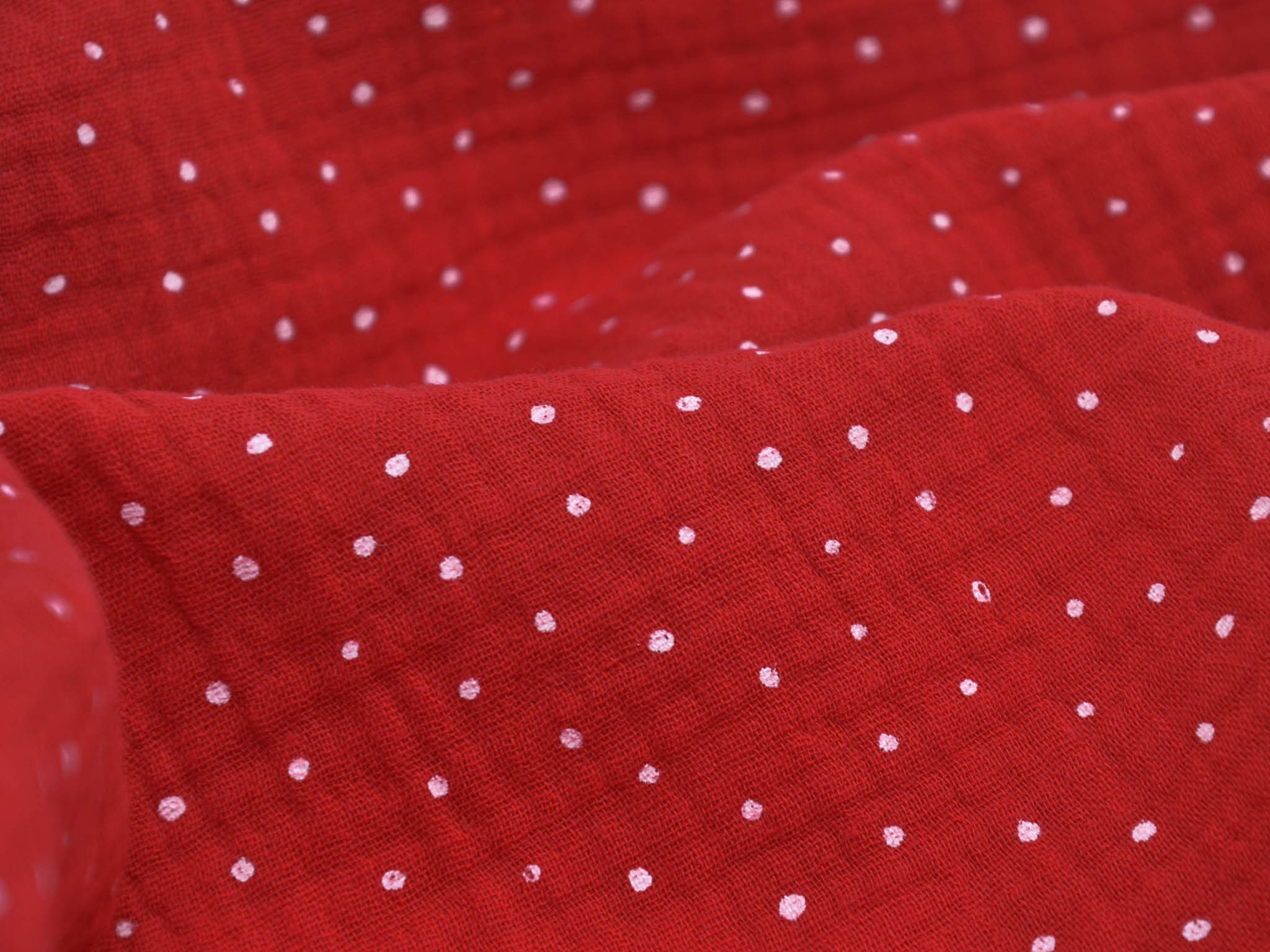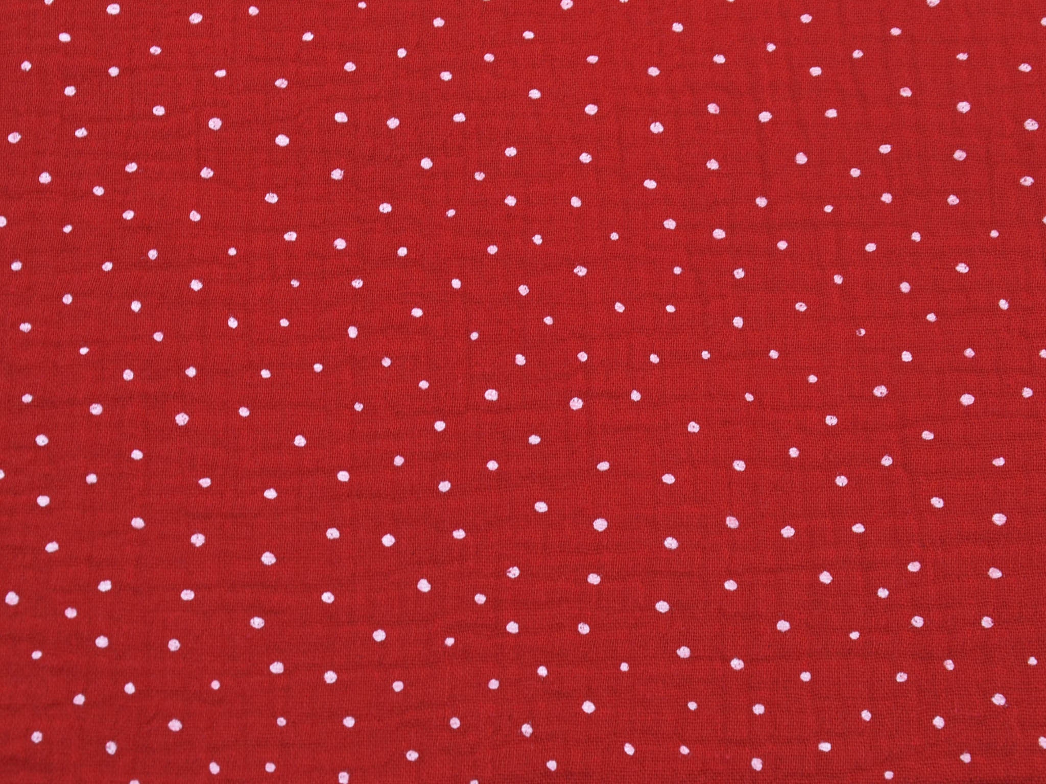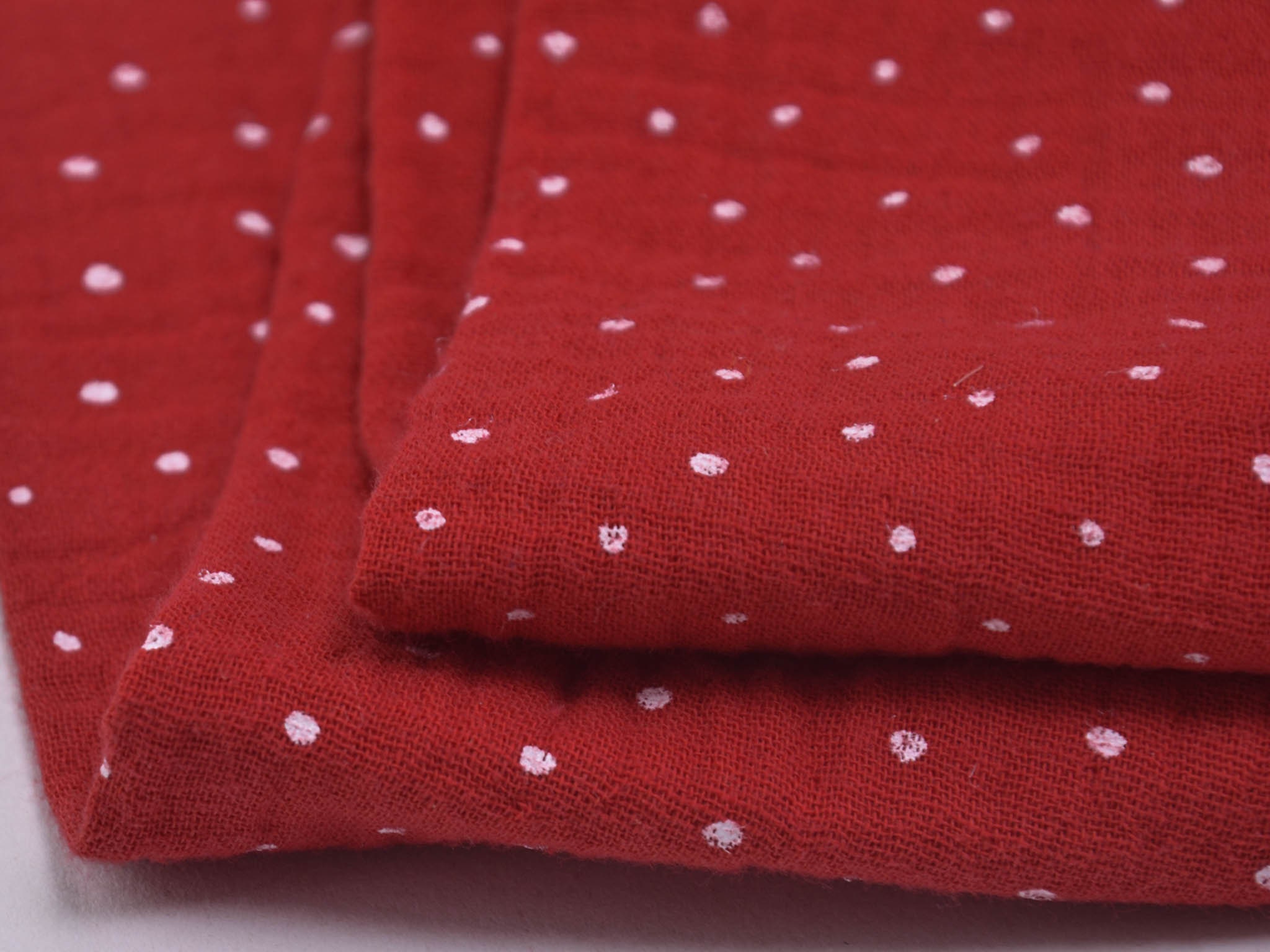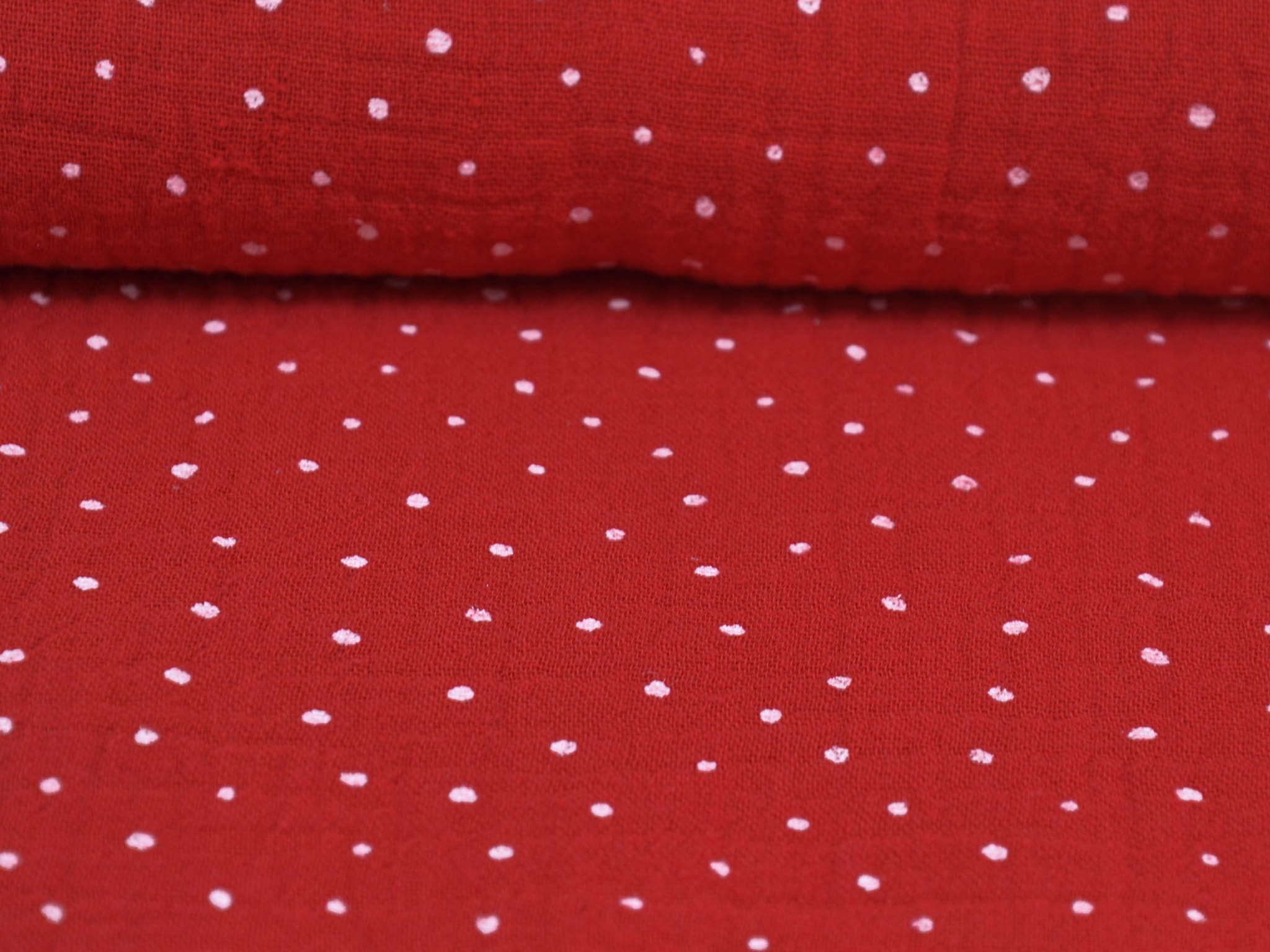 High-quality muslin fabric from Hilco. This cotton fabric is red with small white dots. It's perfect for sewing blouses, dresses, skirts, bedspreads, and much more.