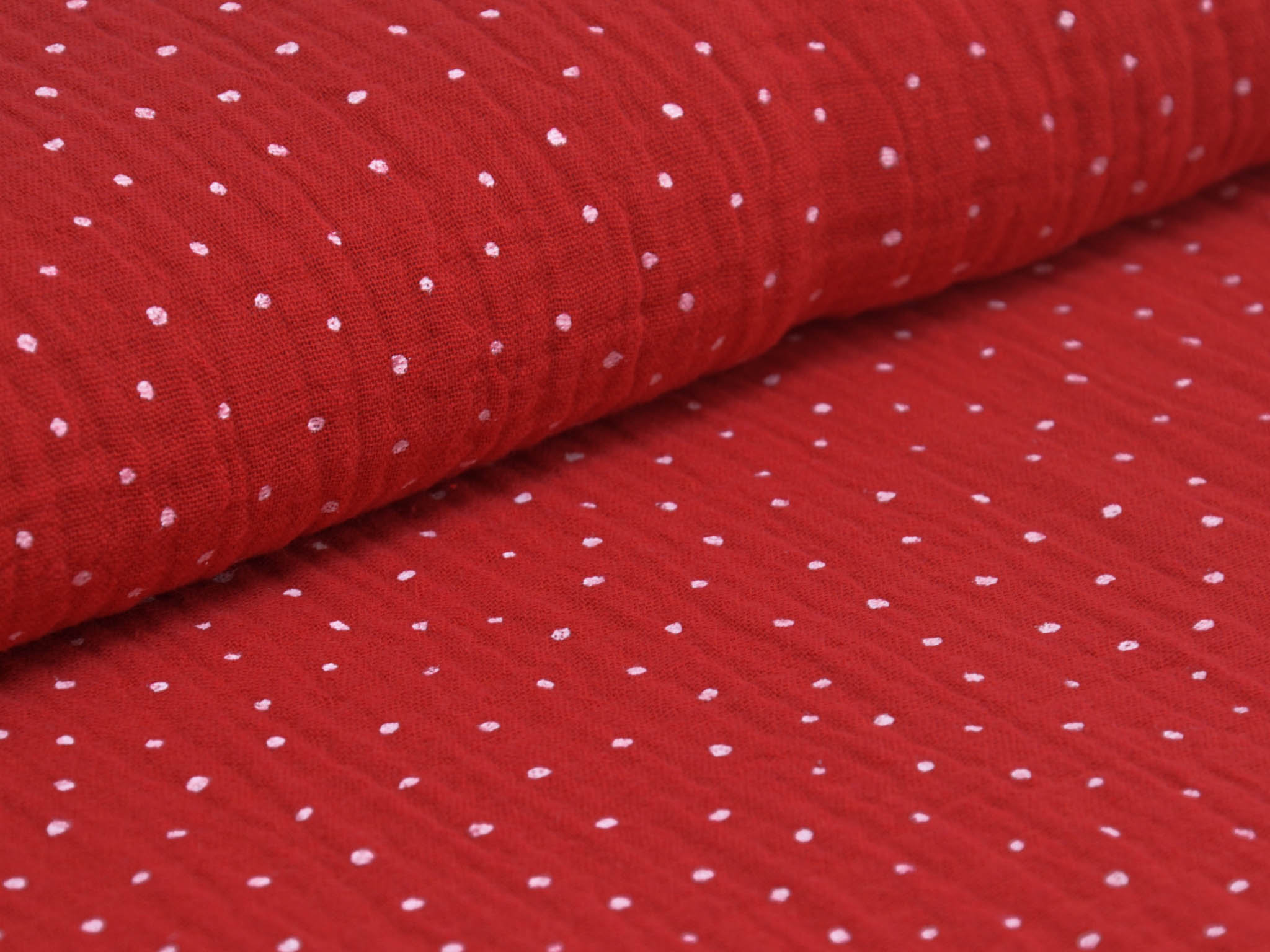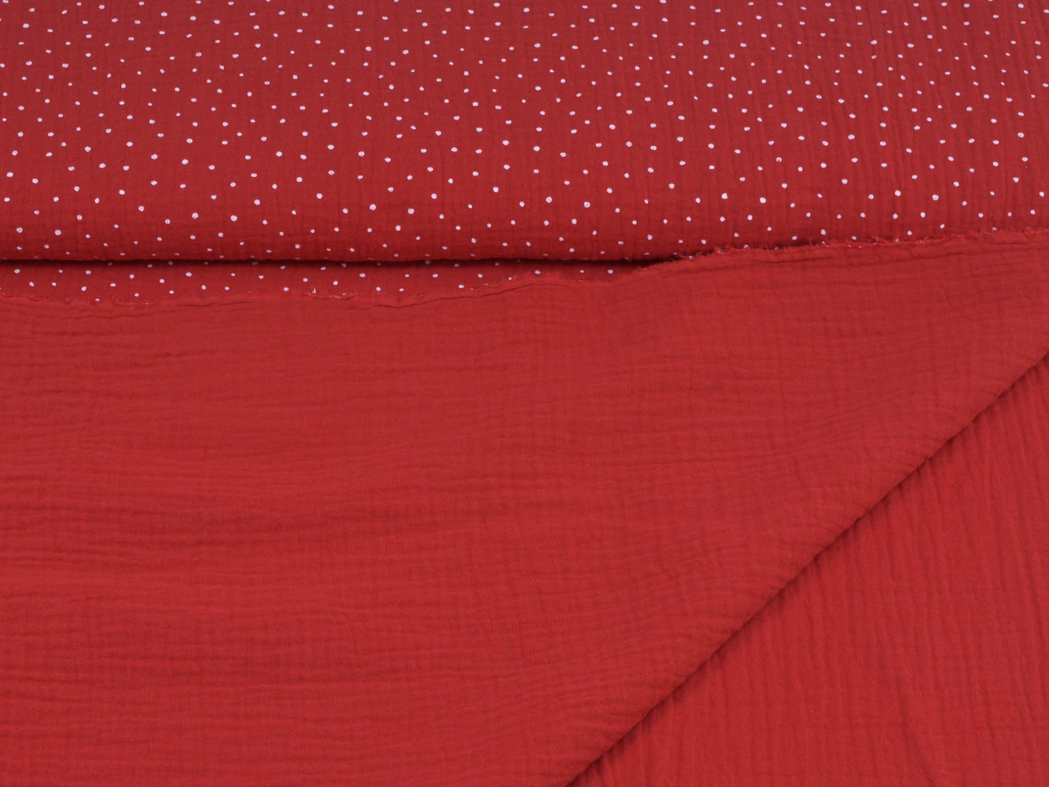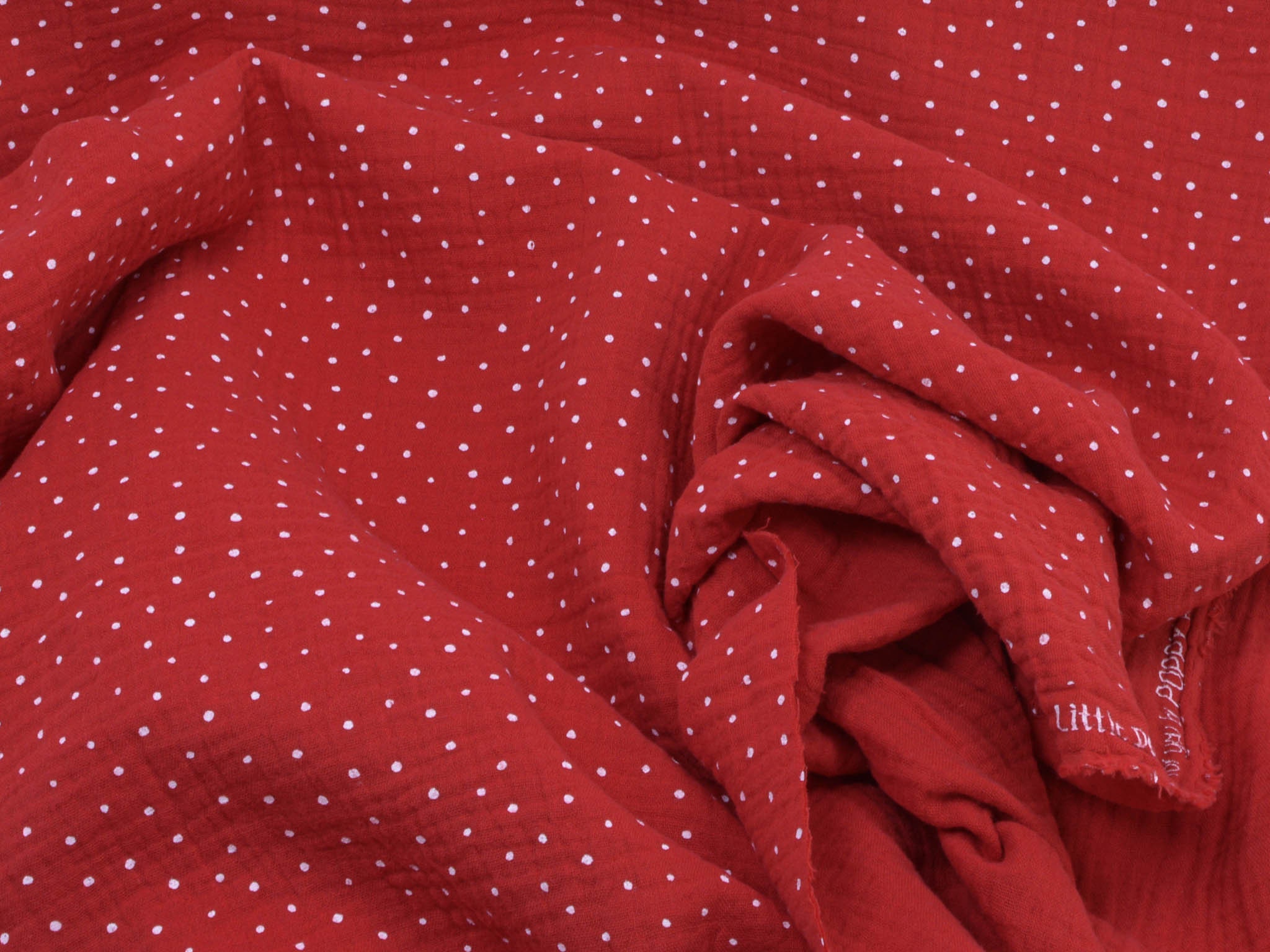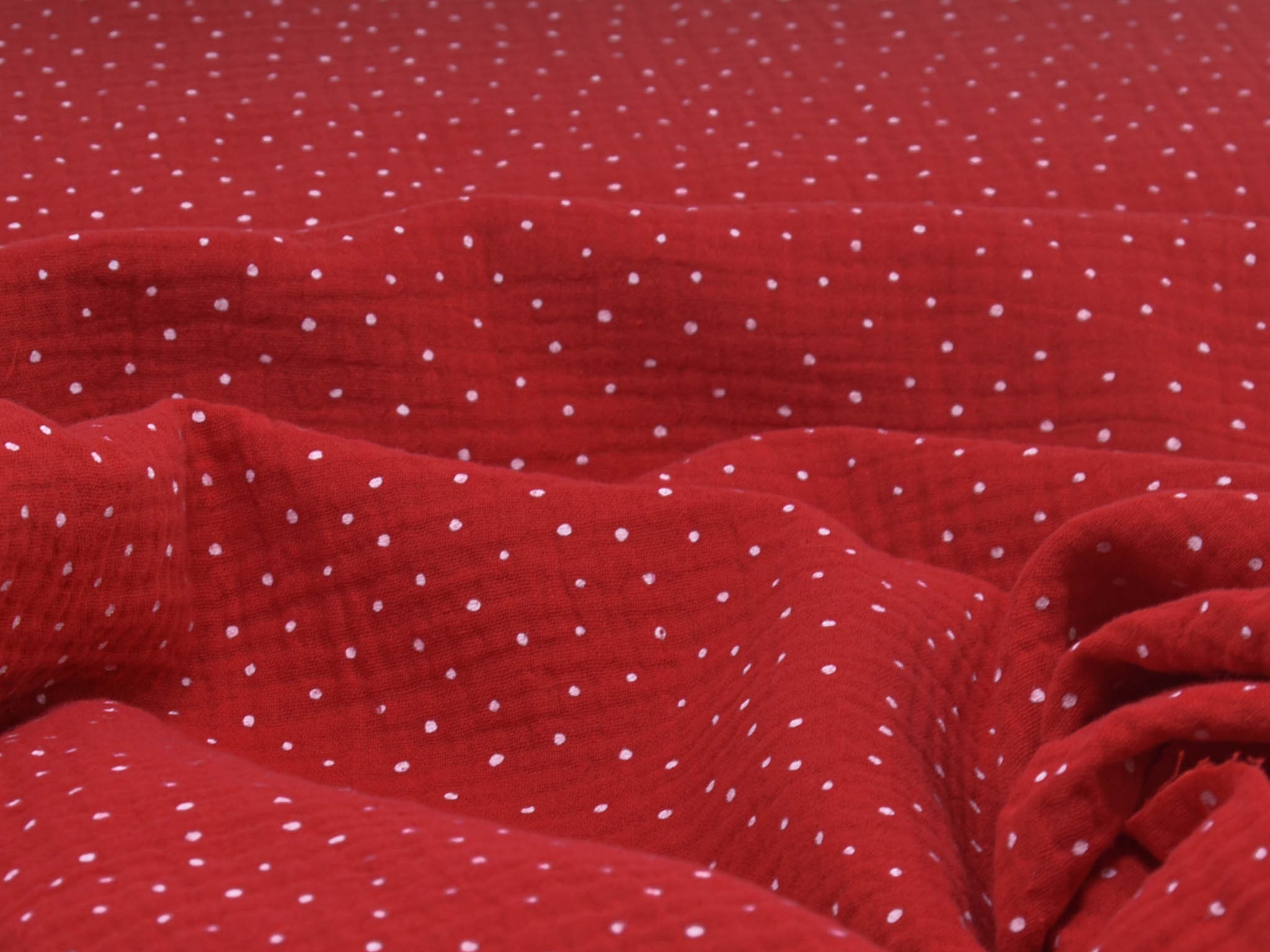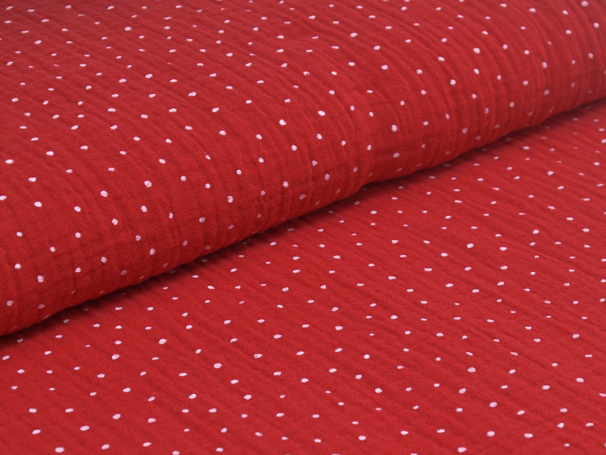 High-quality muslin fabric from Hilco. This cotton fabric is red with small white dots. It's perfect for sewing blouses, dresses, skirts, bedspreads, and much more.