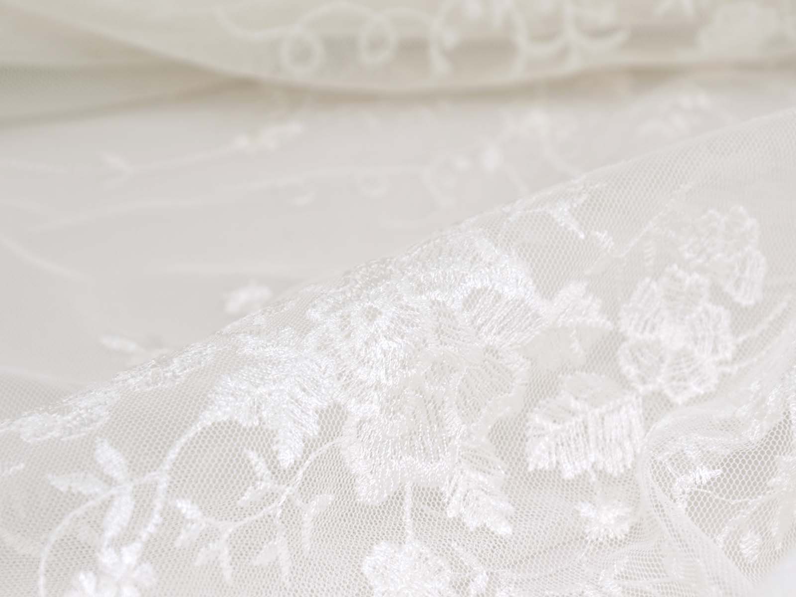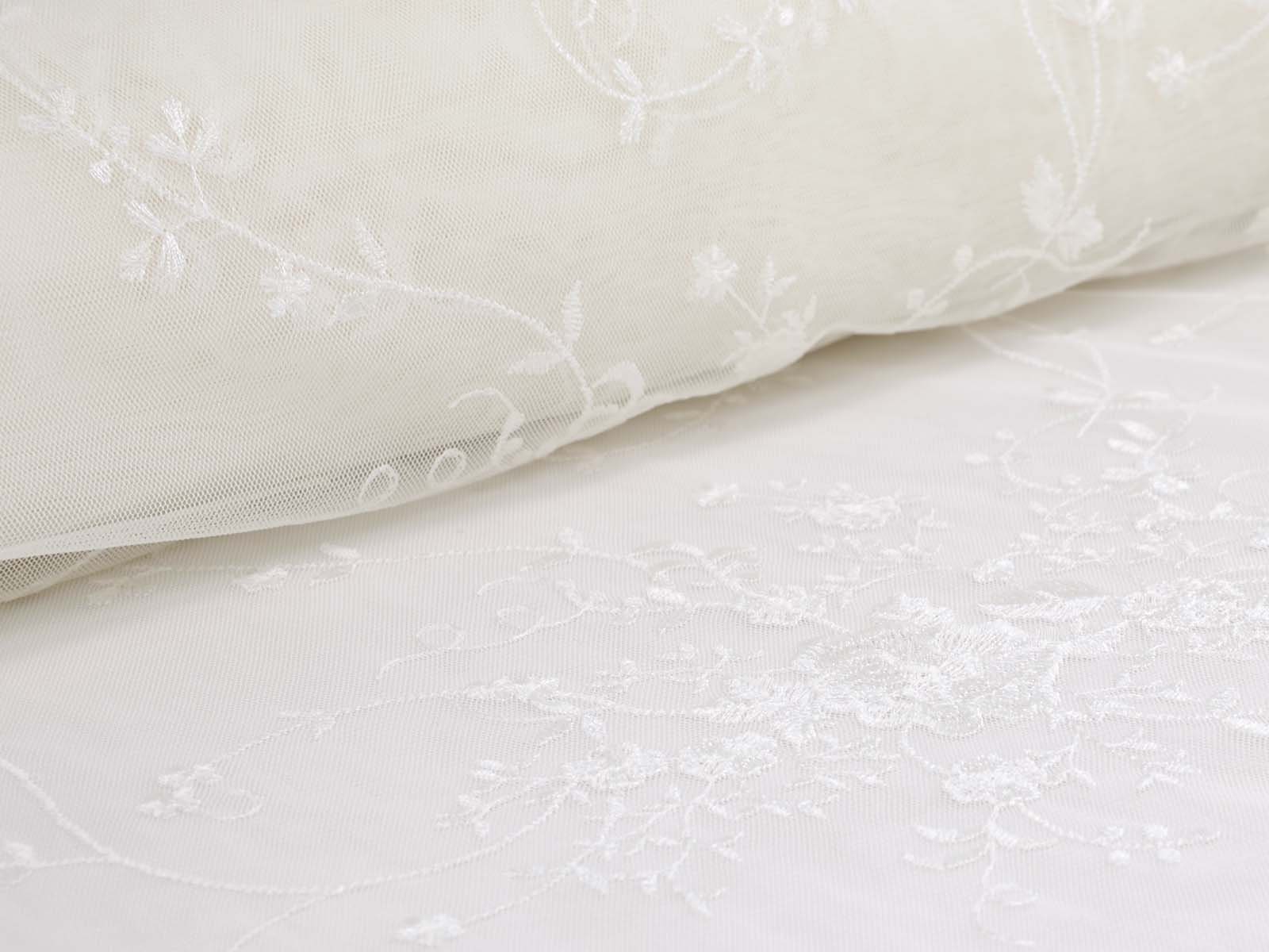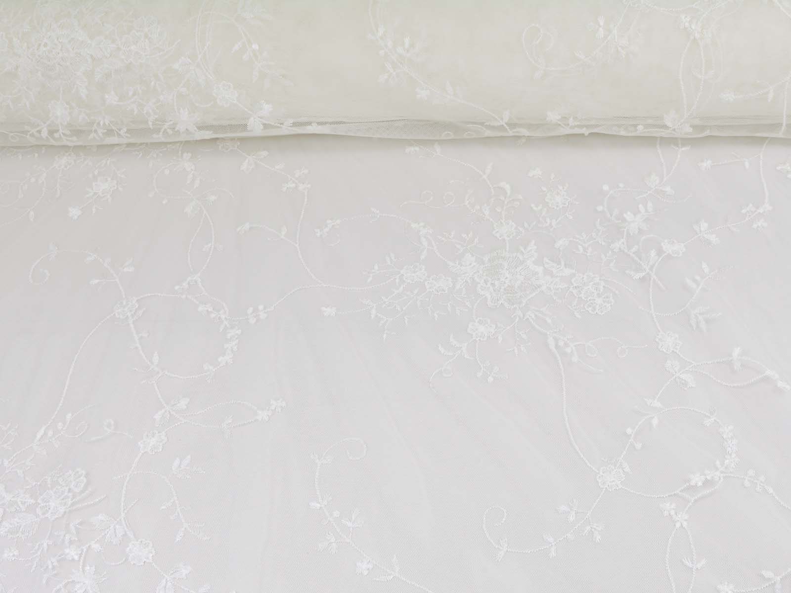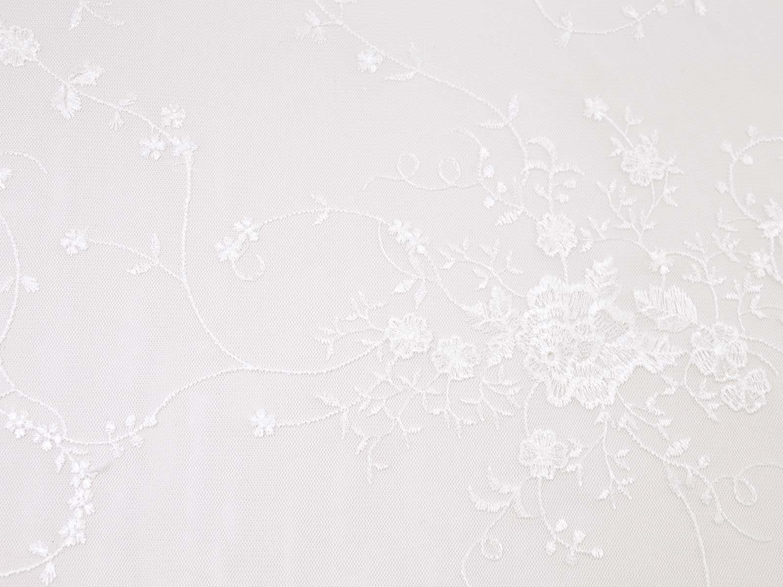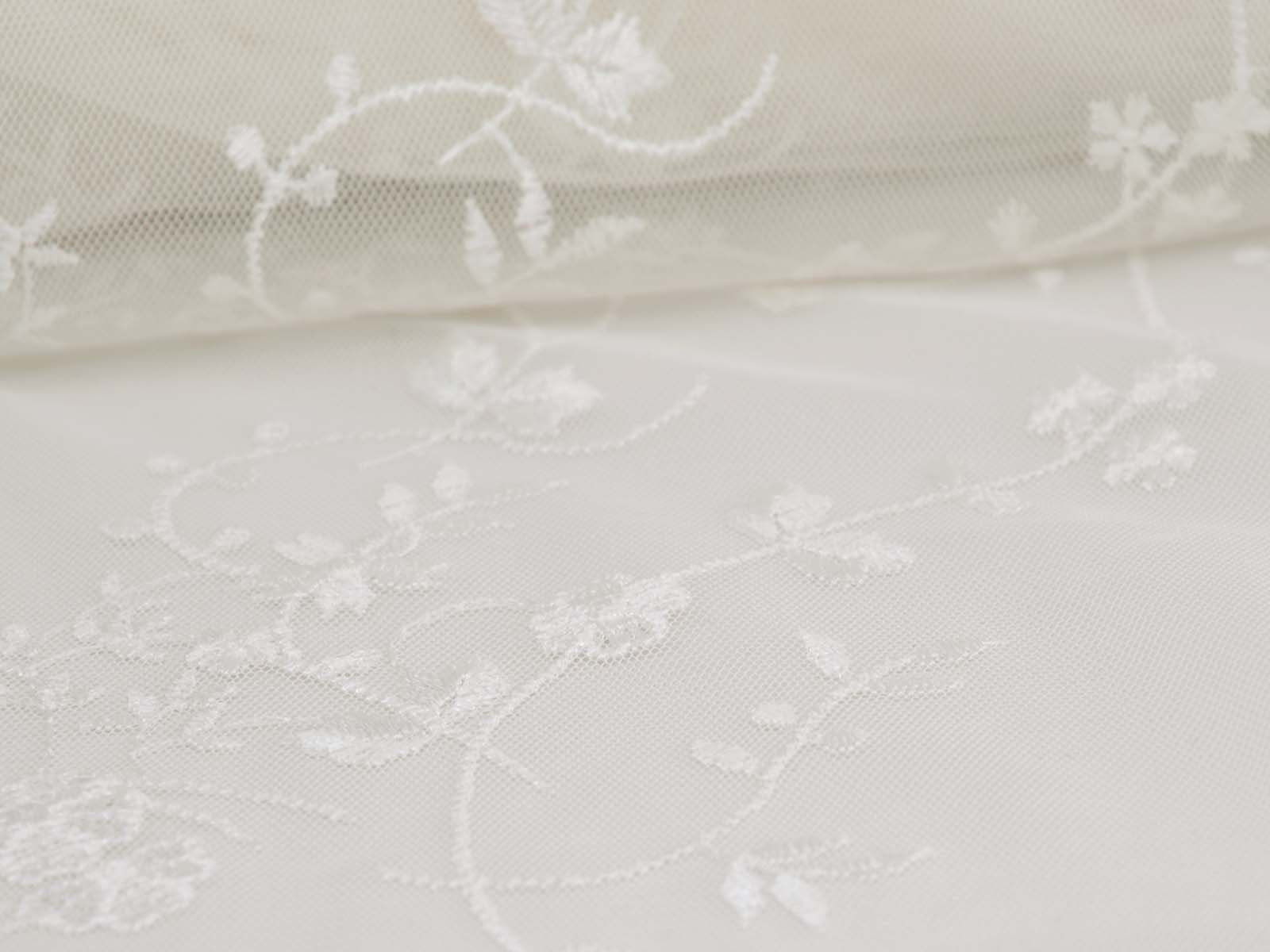 Wunderschöne Spitze für Brautkleider, Abschlussbälle, Verlobungen, Partys und vieles mehr. Der Tüll ist mit Blumen und Ranken bestickt. Die Blumen, Ranken und Blätter sind Ton-in-Ton gestickt. Die größte Blume ist ca. 5 cm x 4,5 cm groß. Das Muster ist eher weitläufig. Die Farbe ist ein gebrochenes weiß, creme-weiß. Es ist kein hartes, reines, kaltes weiß. Die Spitze hat rechts und links eine Bogenkante mit Blumen.