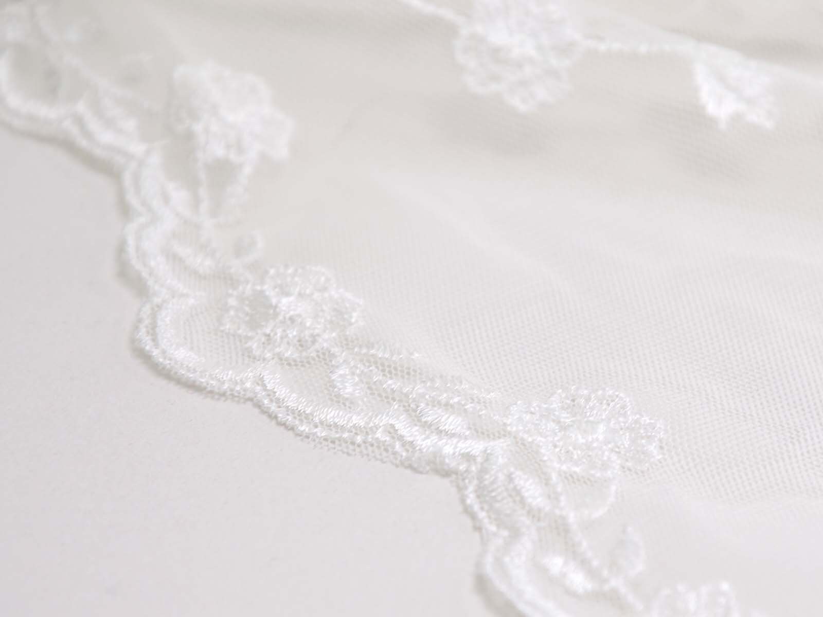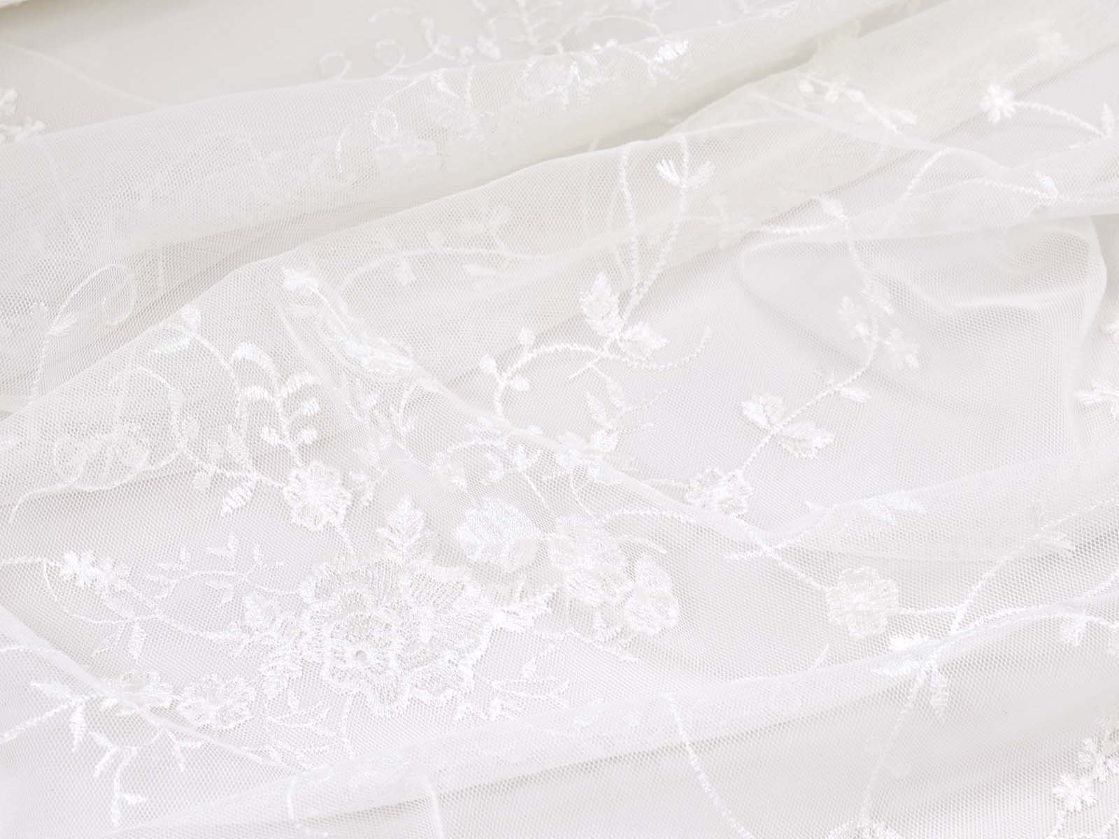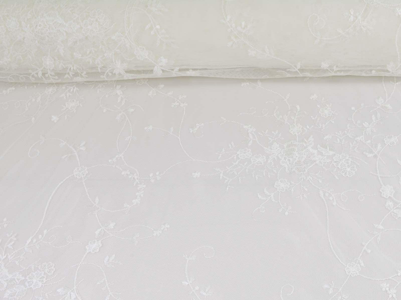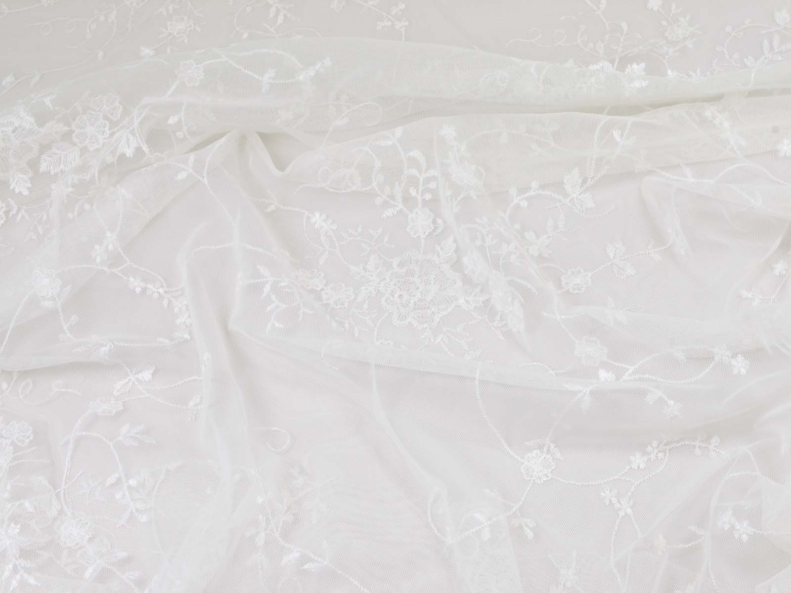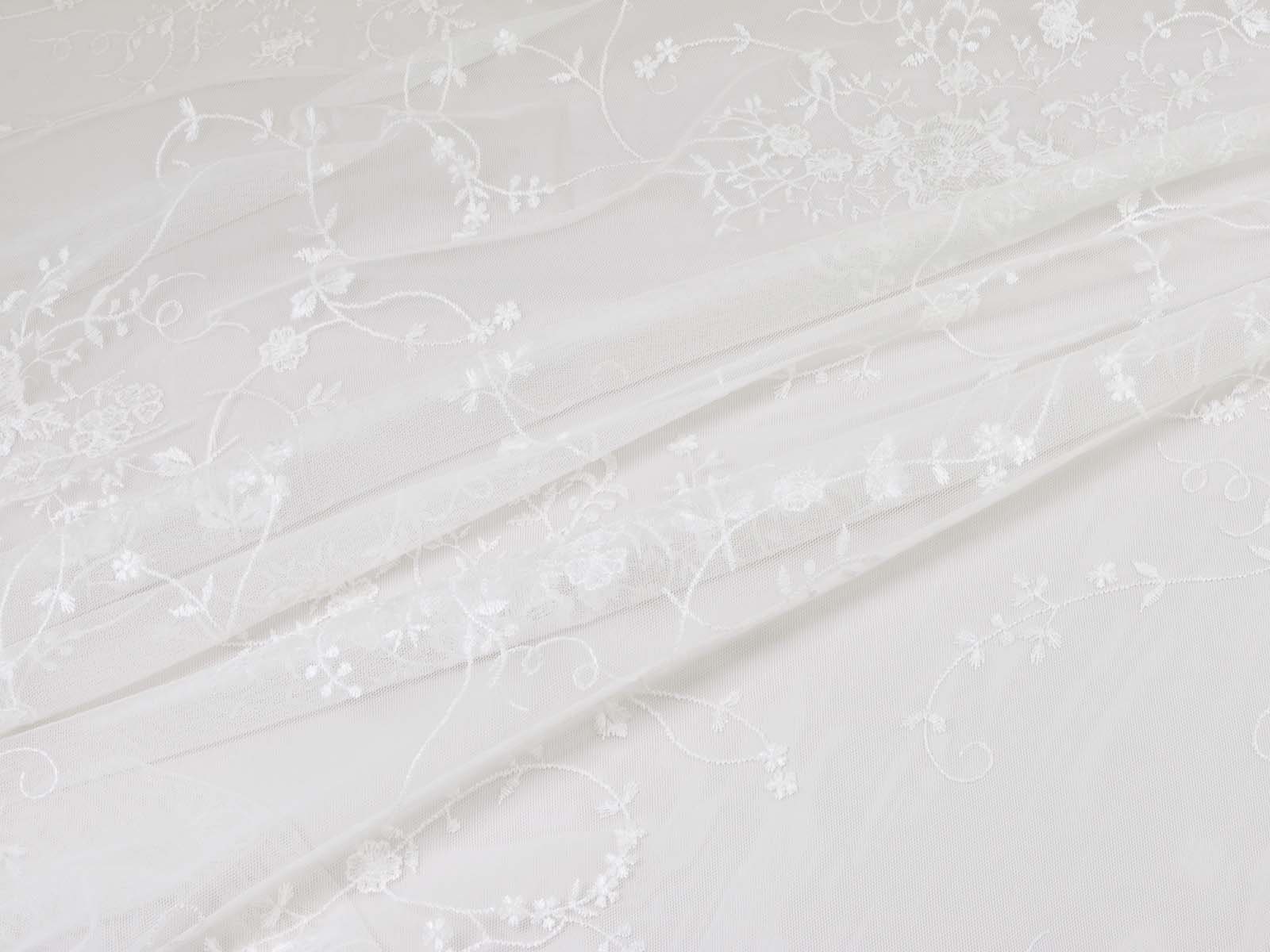 Wunderschöne Spitze für Brautkleider, Abschlussbälle, Verlobungen, Partys und vieles mehr. Der Tüll ist mit Blumen und Ranken bestickt. Die Blumen, Ranken und Blätter sind Ton-in-Ton gestickt. Die größte Blume ist ca. 5 cm x 4,5 cm groß. Das Muster ist eher weitläufig. Die Farbe ist ein gebrochenes weiß, creme-weiß. Es ist kein hartes, reines, kaltes weiß. Die Spitze hat rechts und links eine Bogenkante mit Blumen.