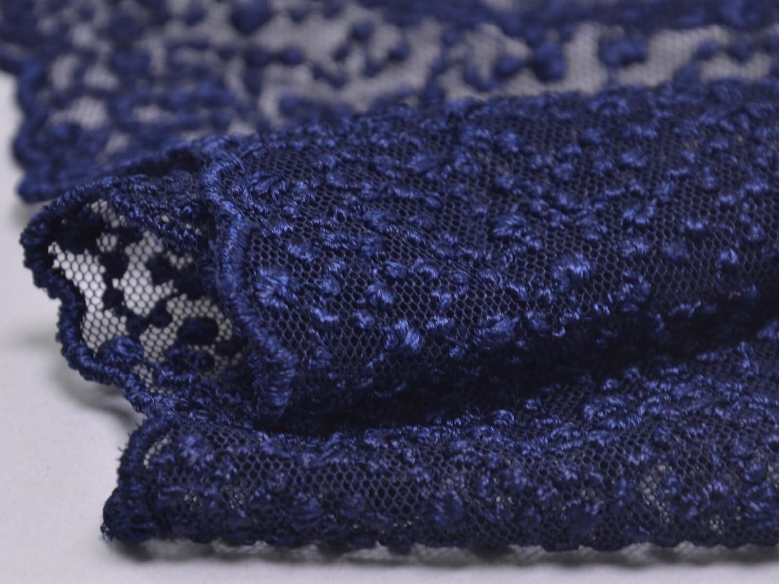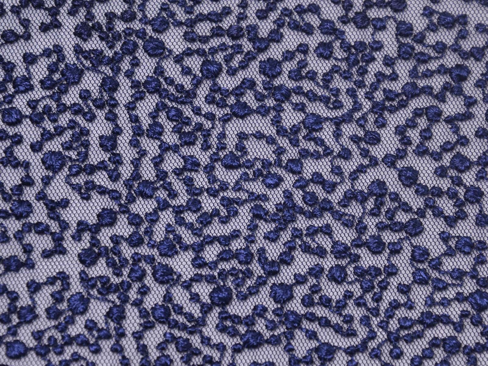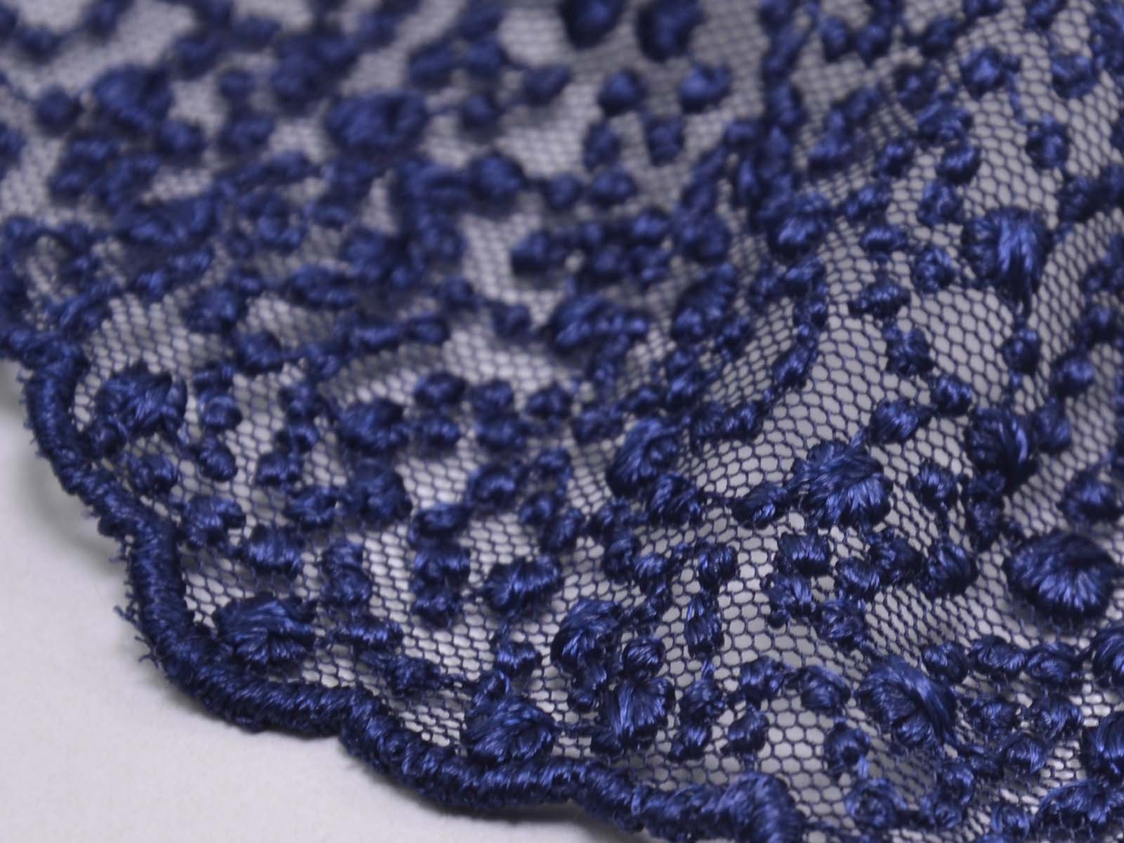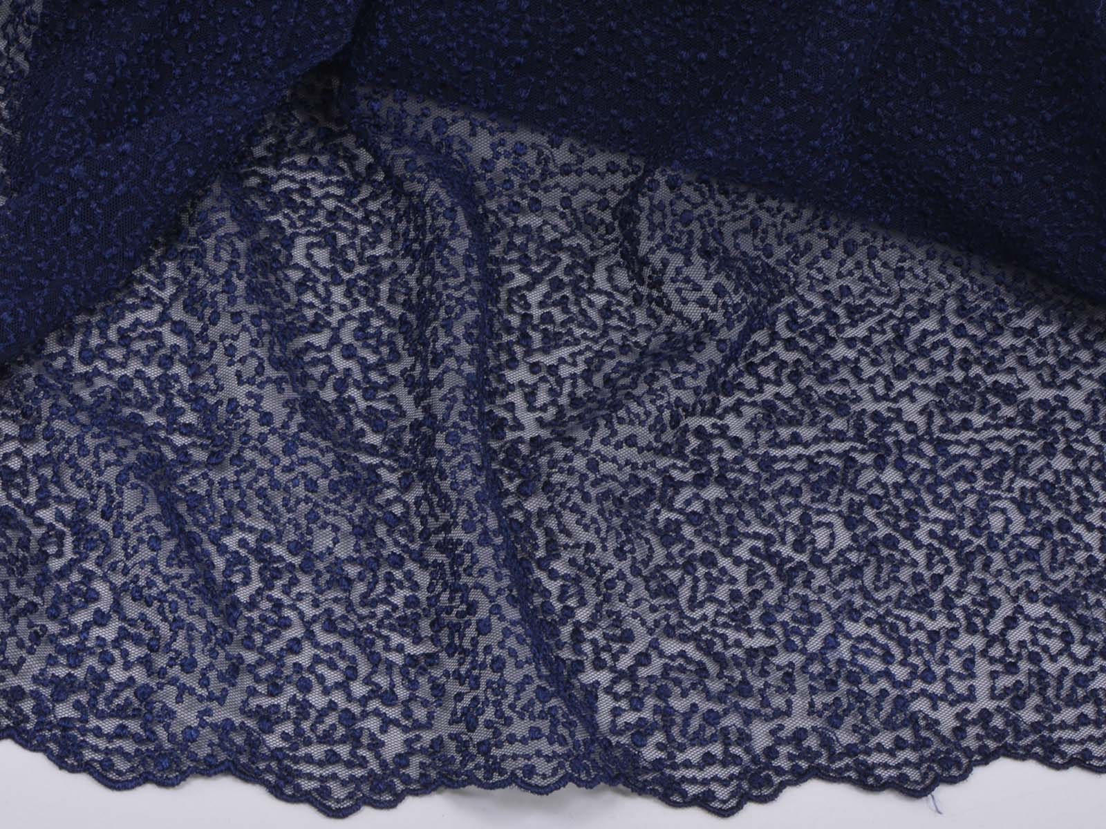Wunderschöne Spitze für Abendmode, Abschlussbälle, Verlobungen, Partys und vieles mehr. Der Tüll ist mit kleinen Punkten in verschiedenen Größen bestickt. Die Farbe ist dunkelblau. Die Spitze hat rechts und links eine kleine Bogenkante.