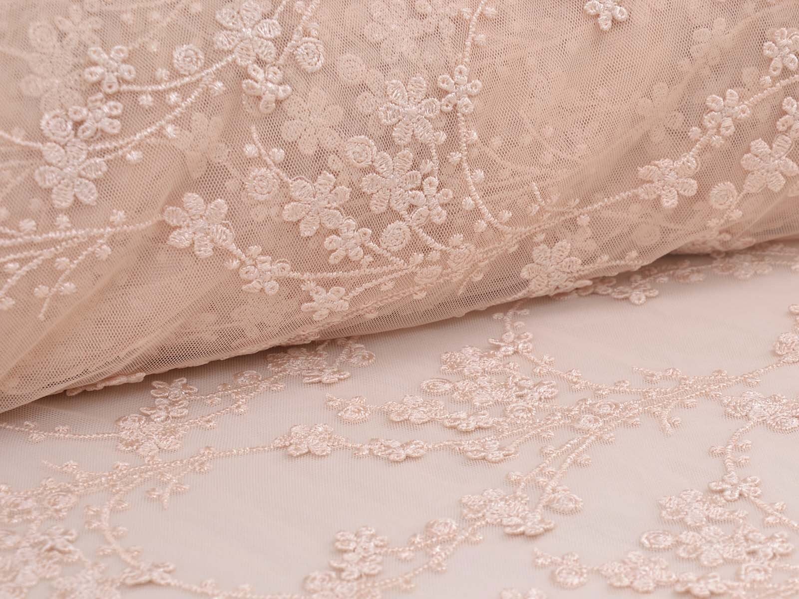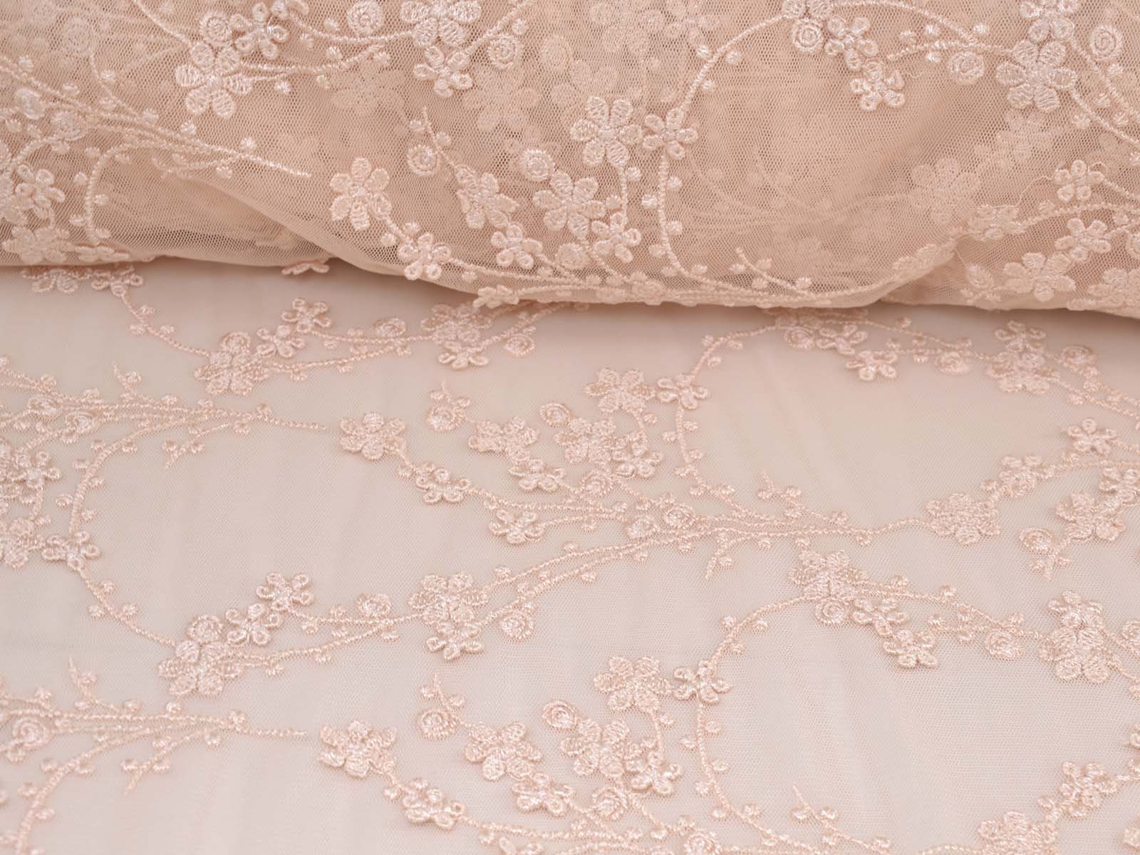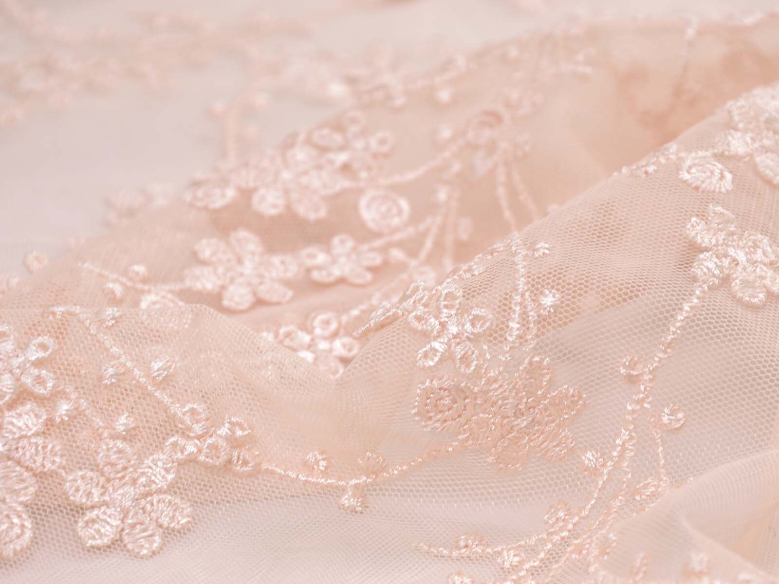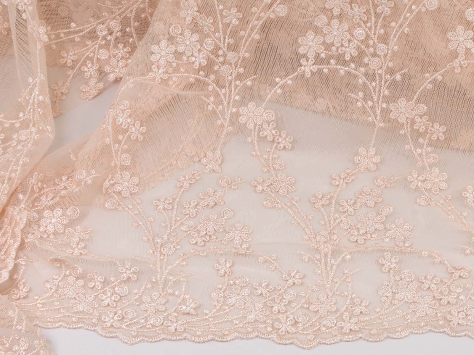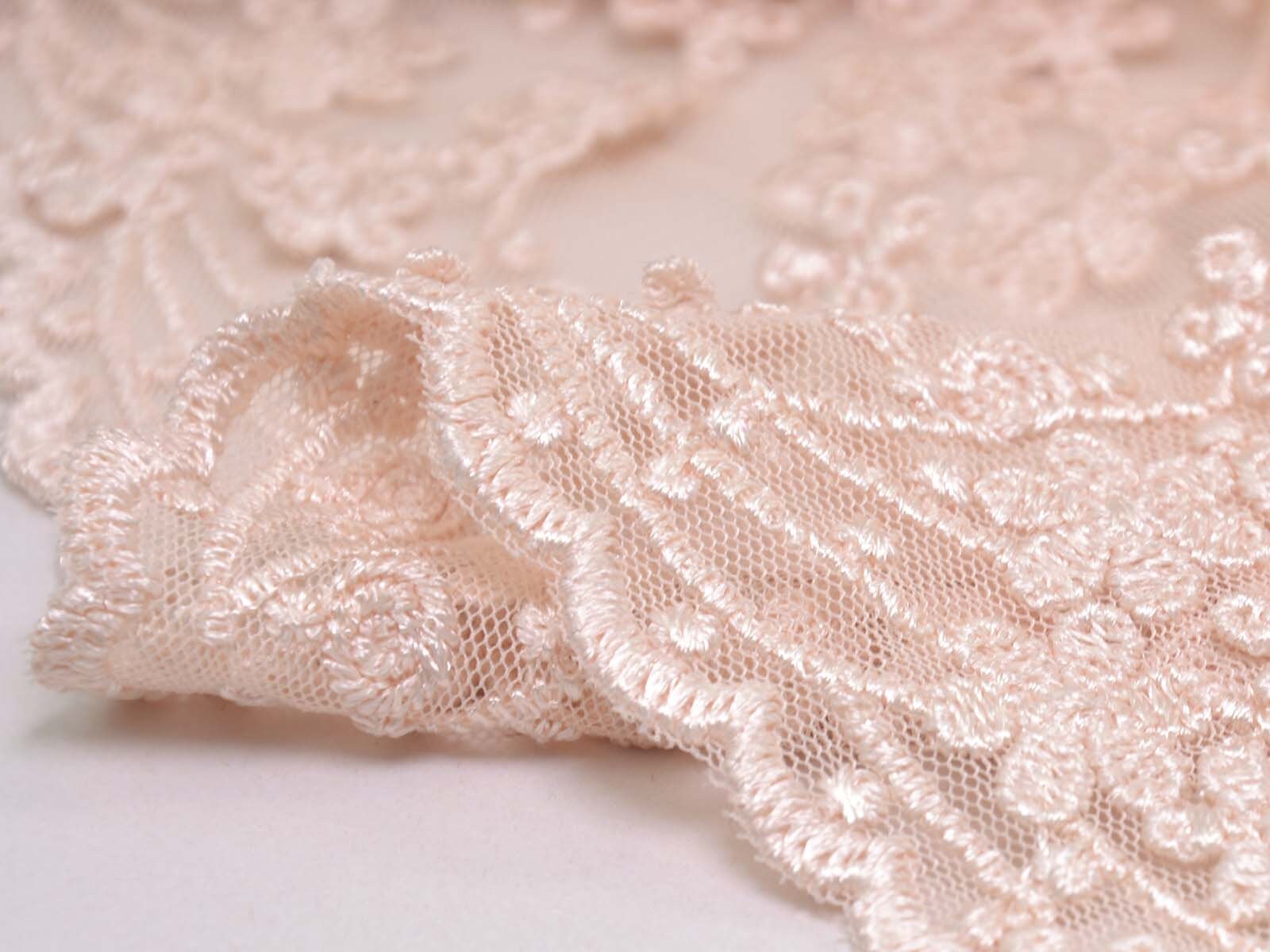 Wunderschöne Spitze für Brautkleider, Abschlussbälle, Verlobungen, Partys und vieles mehr. Der Tüll ist mit Blumenranken in 3D bestickt. Die Farbe ist ein schönes, zartes, helles rosa, haut. Die Spitze hat rechts und links eine kleine Bogenkante.