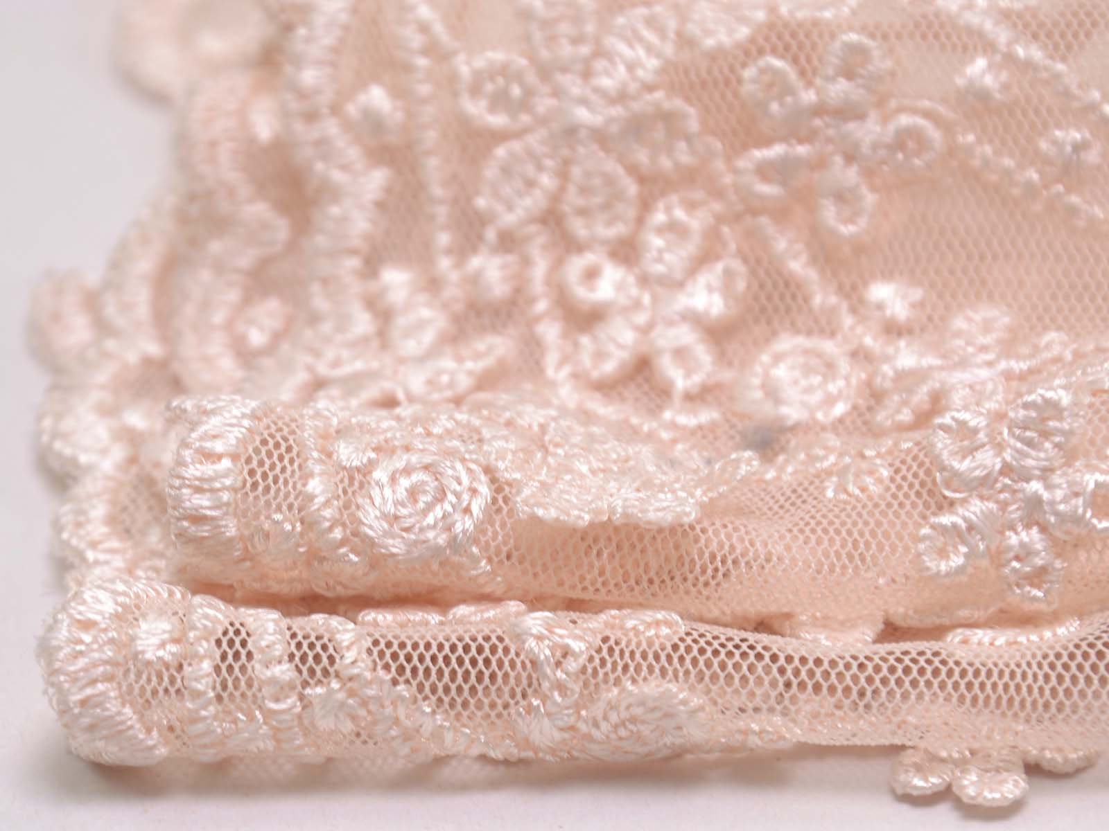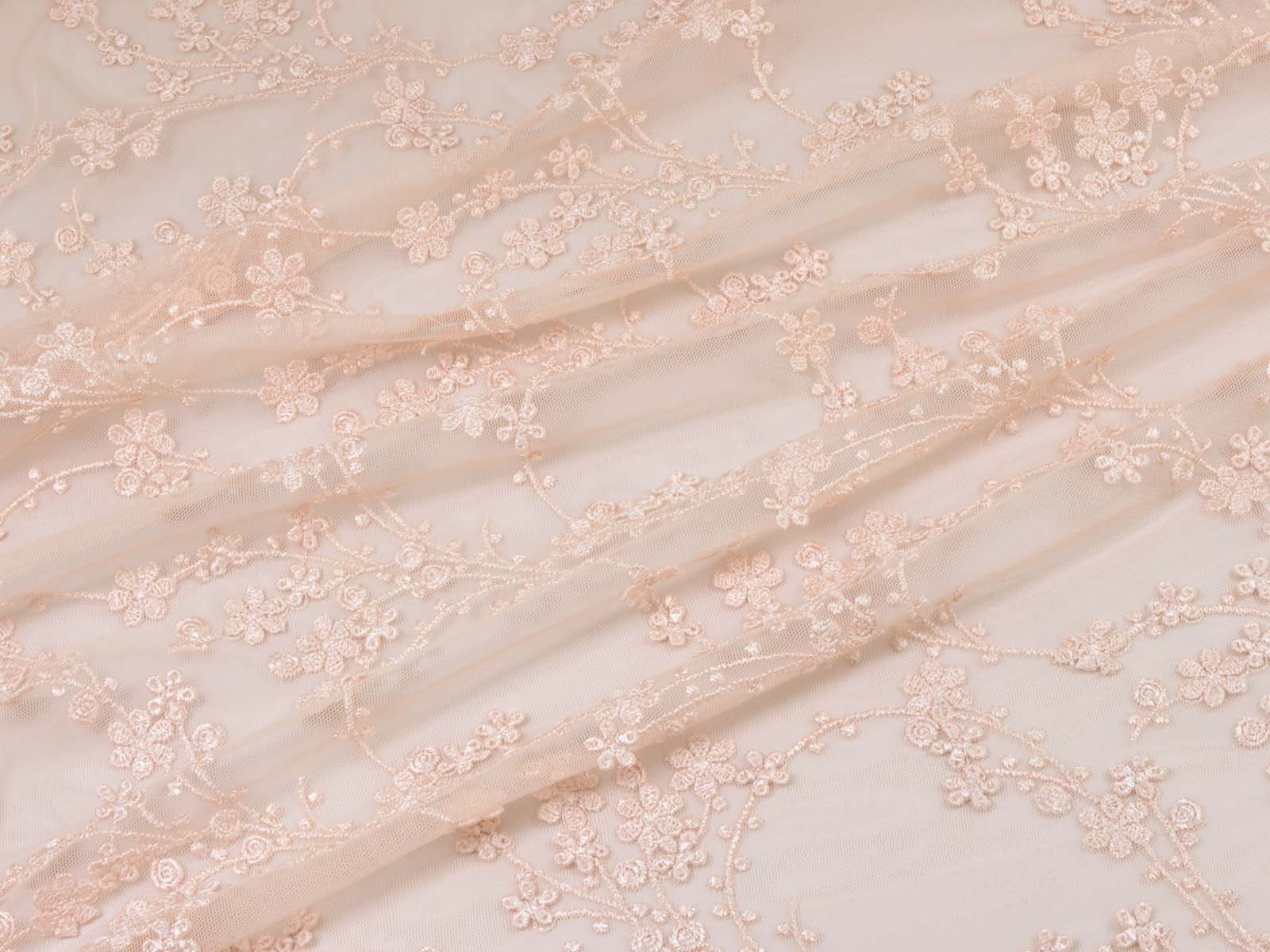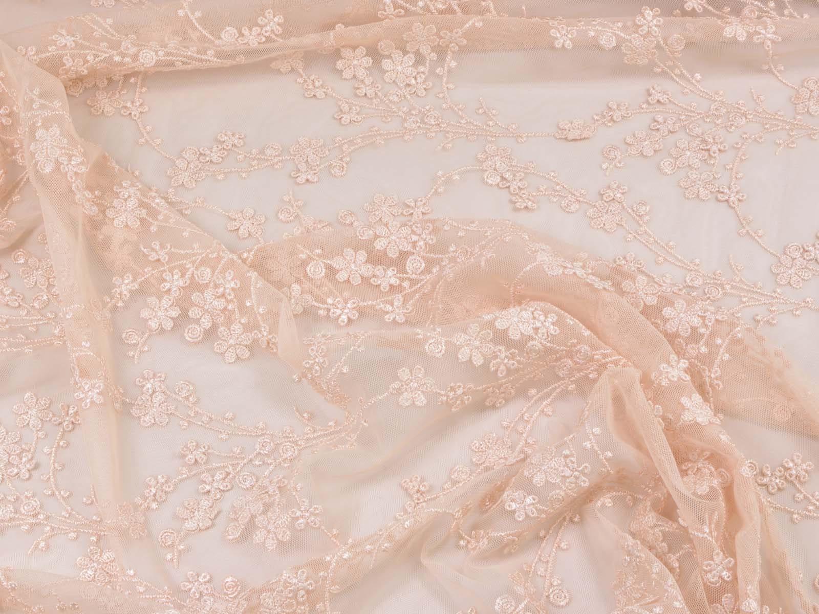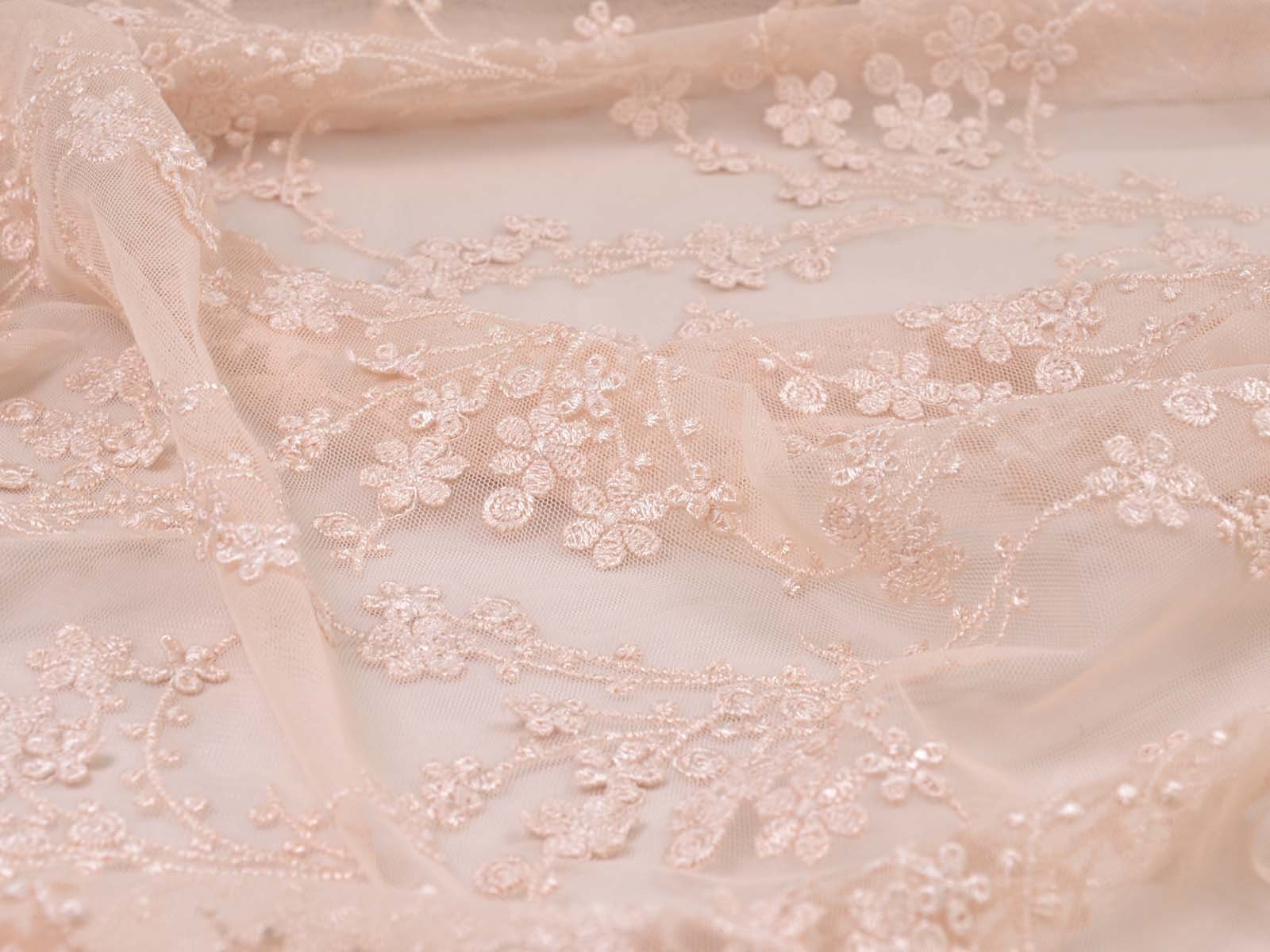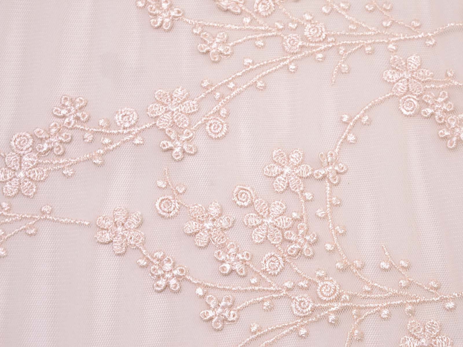 Wunderschöne Spitze für Brautkleider, Abschlussbälle, Verlobungen, Partys und vieles mehr. Der Tüll ist mit Blumenranken in 3D bestickt. Die Farbe ist ein schönes, zartes, helles rosa, haut. Die Spitze hat rechts und links eine kleine Bogenkante.
