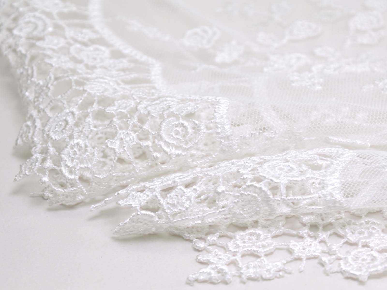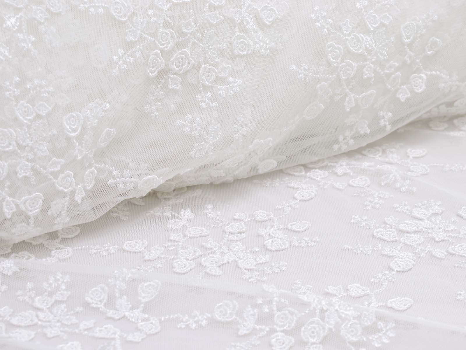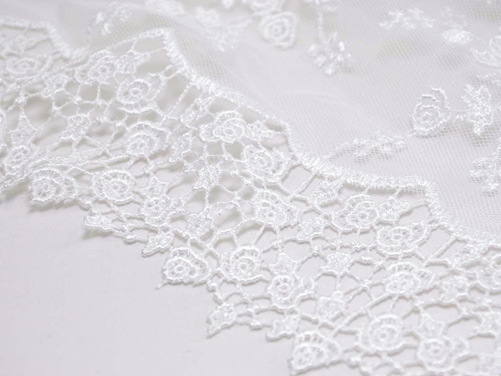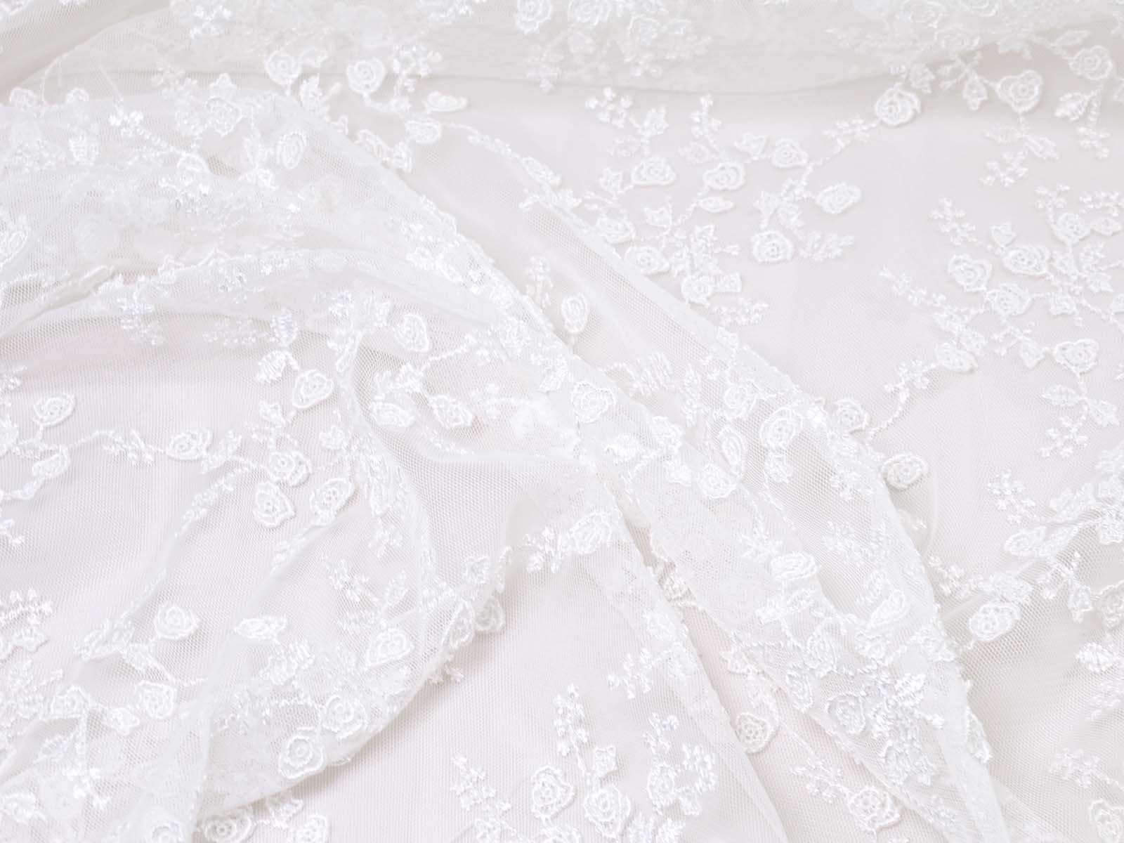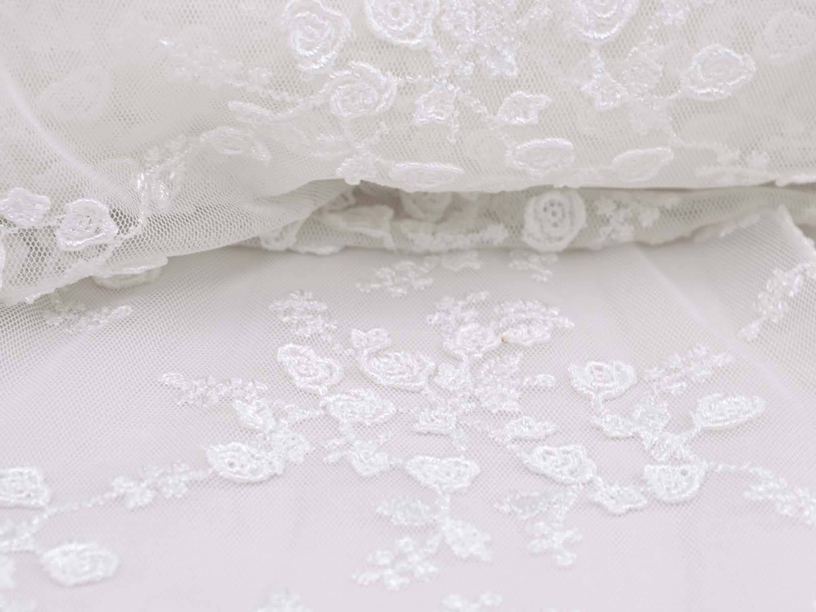 Wunderschöne Spitze für Brautkleider, Abschlussbälle, Verlobungen, Partys und vieles mehr. Der Tüll ist mit kleinen Rosen in 3D bestickt. Die Farbe ist weiß, gebrochenes weiß. Es ist kein hartes, reines, kaltes weiß. Die Spitze hat rechts und links eine Bogenkante. An der Bogenkante ist nochmals ein ca. 5cm breites Spitzenband angenäht. Der Abschluss ist gezackt.