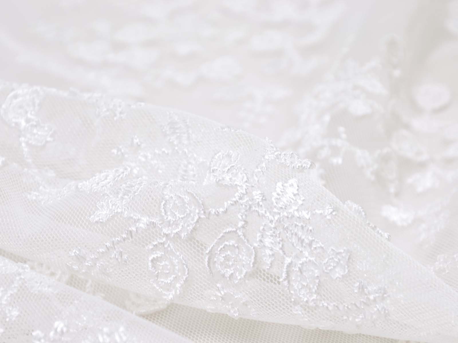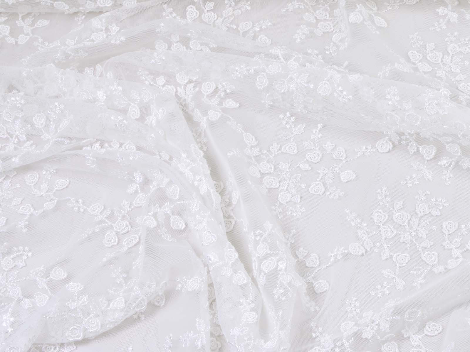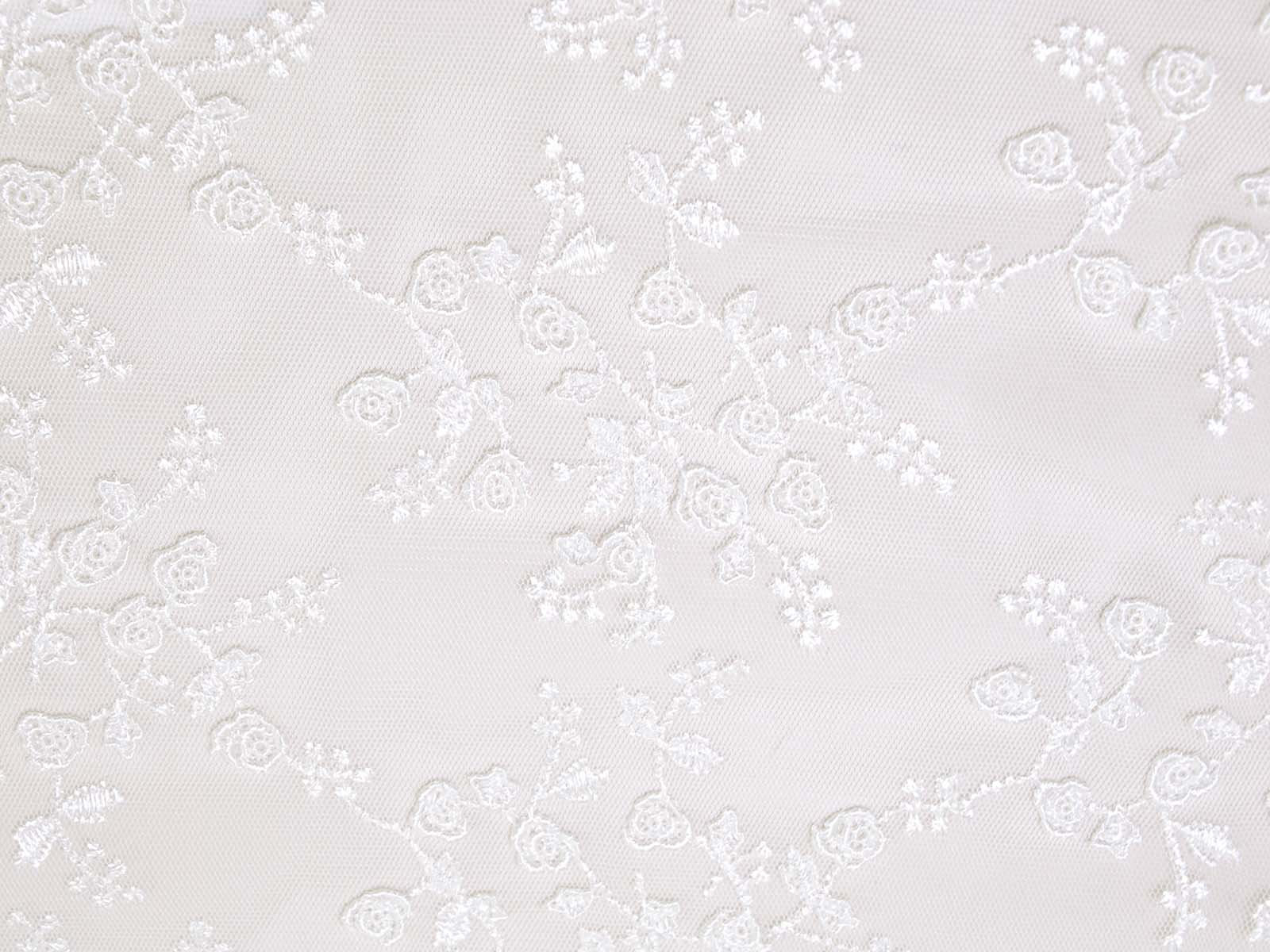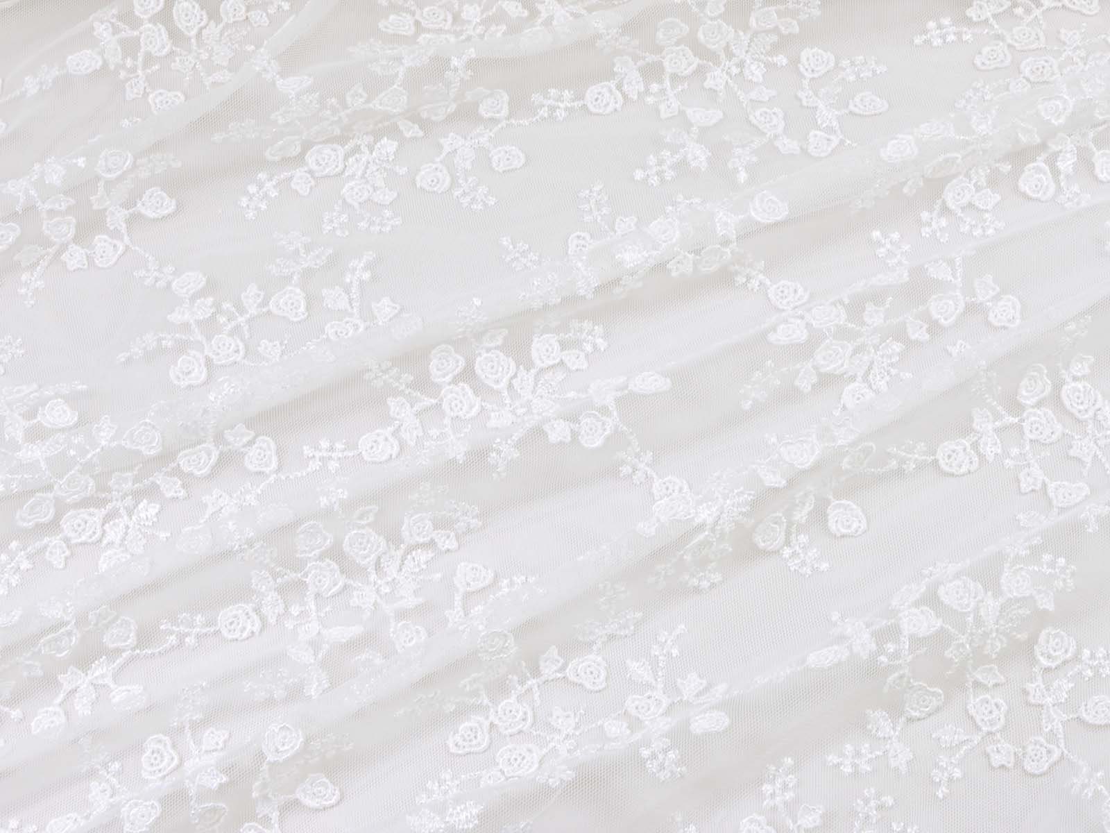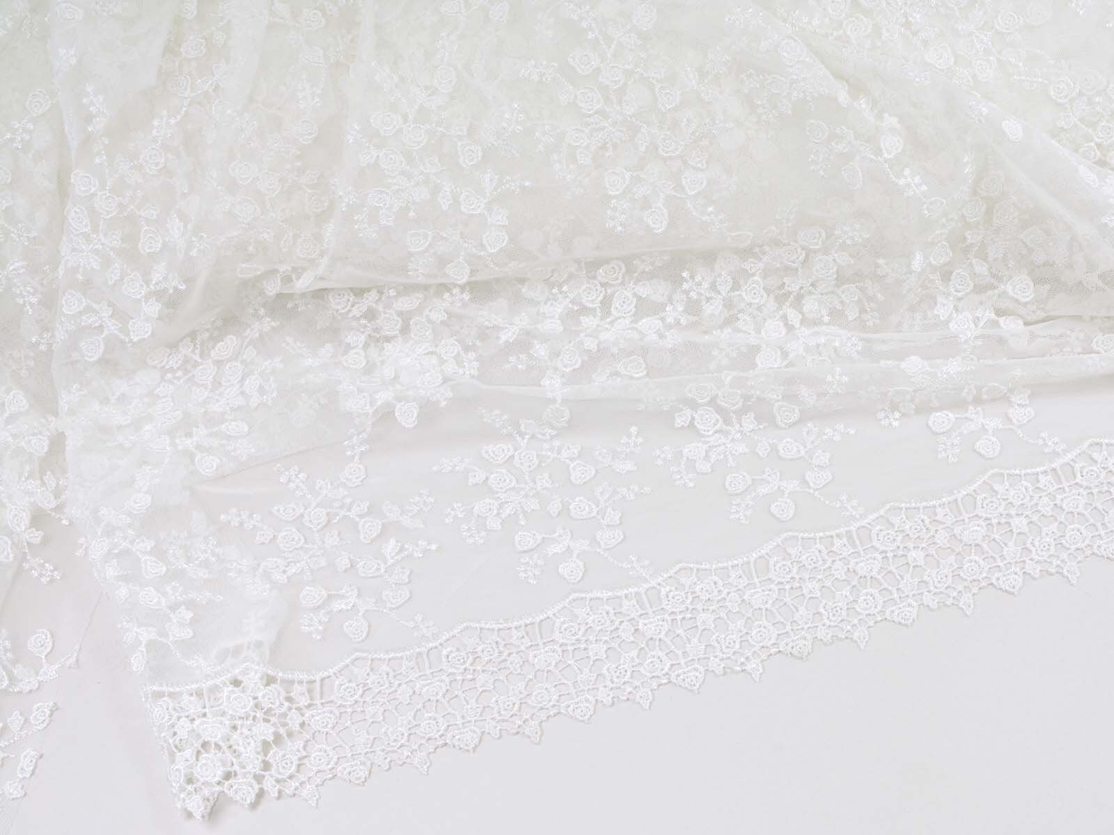 Wunderschöne Spitze für Brautkleider, Abschlussbälle, Verlobungen, Partys und vieles mehr. Der Tüll ist mit kleinen Rosen in 3D bestickt. Die Farbe ist weiß, gebrochenes weiß. Es ist kein hartes, reines, kaltes weiß. Die Spitze hat rechts und links eine Bogenkante. An der Bogenkante ist nochmals ein ca. 5cm breites Spitzenband angenäht. Der Abschluss ist gezackt.