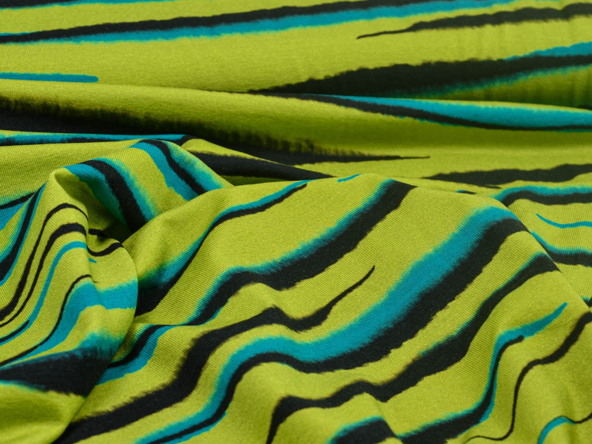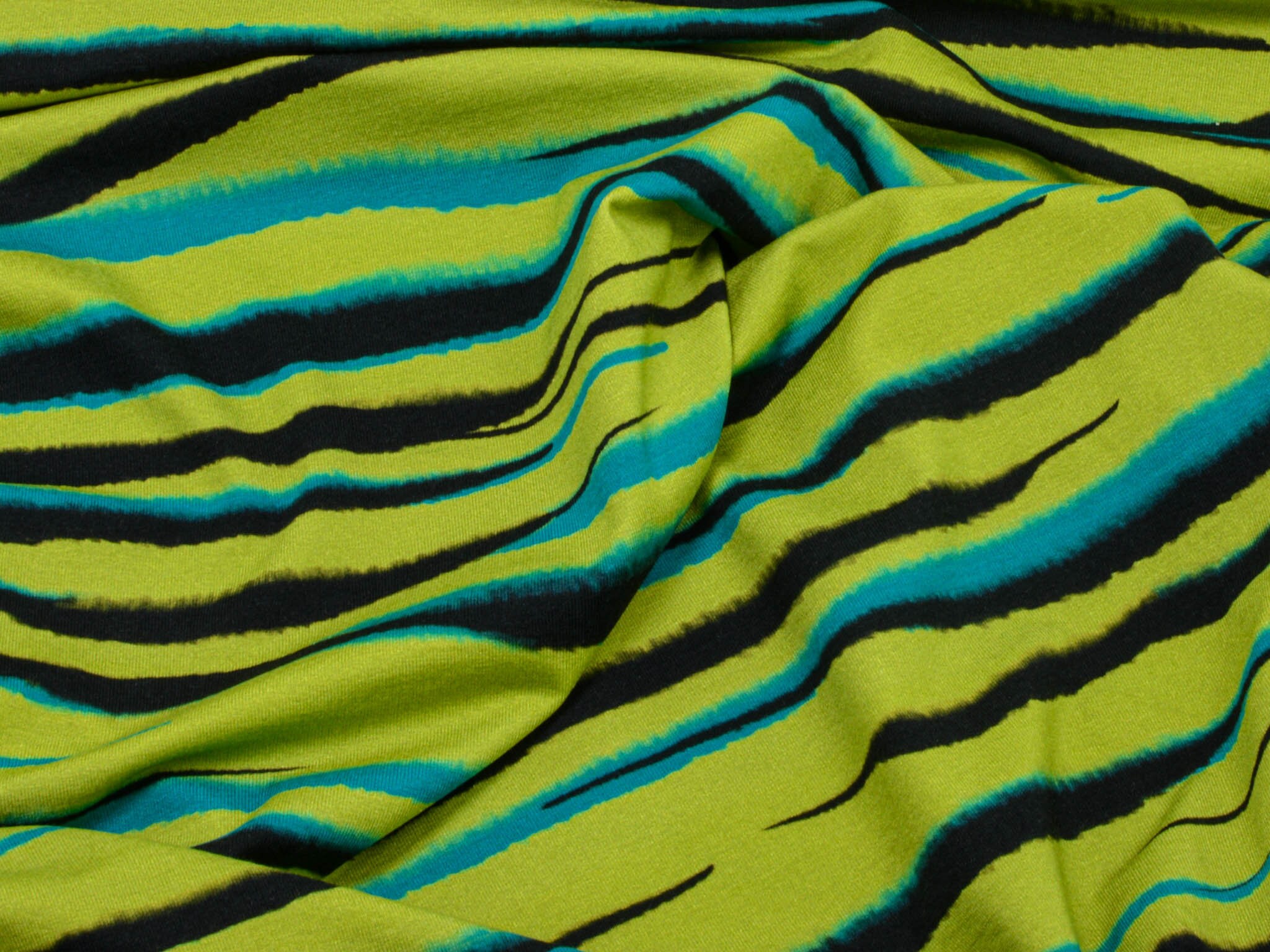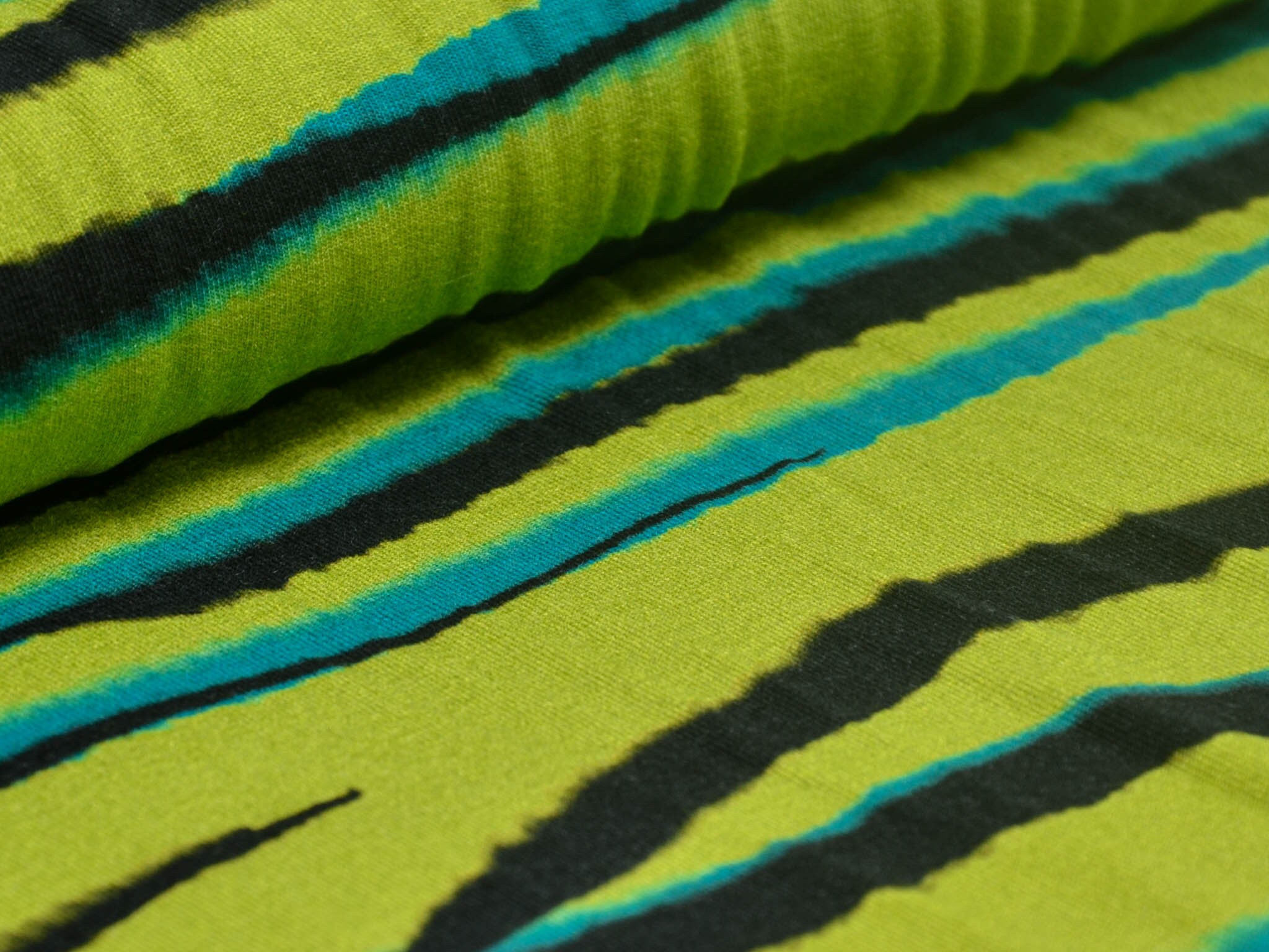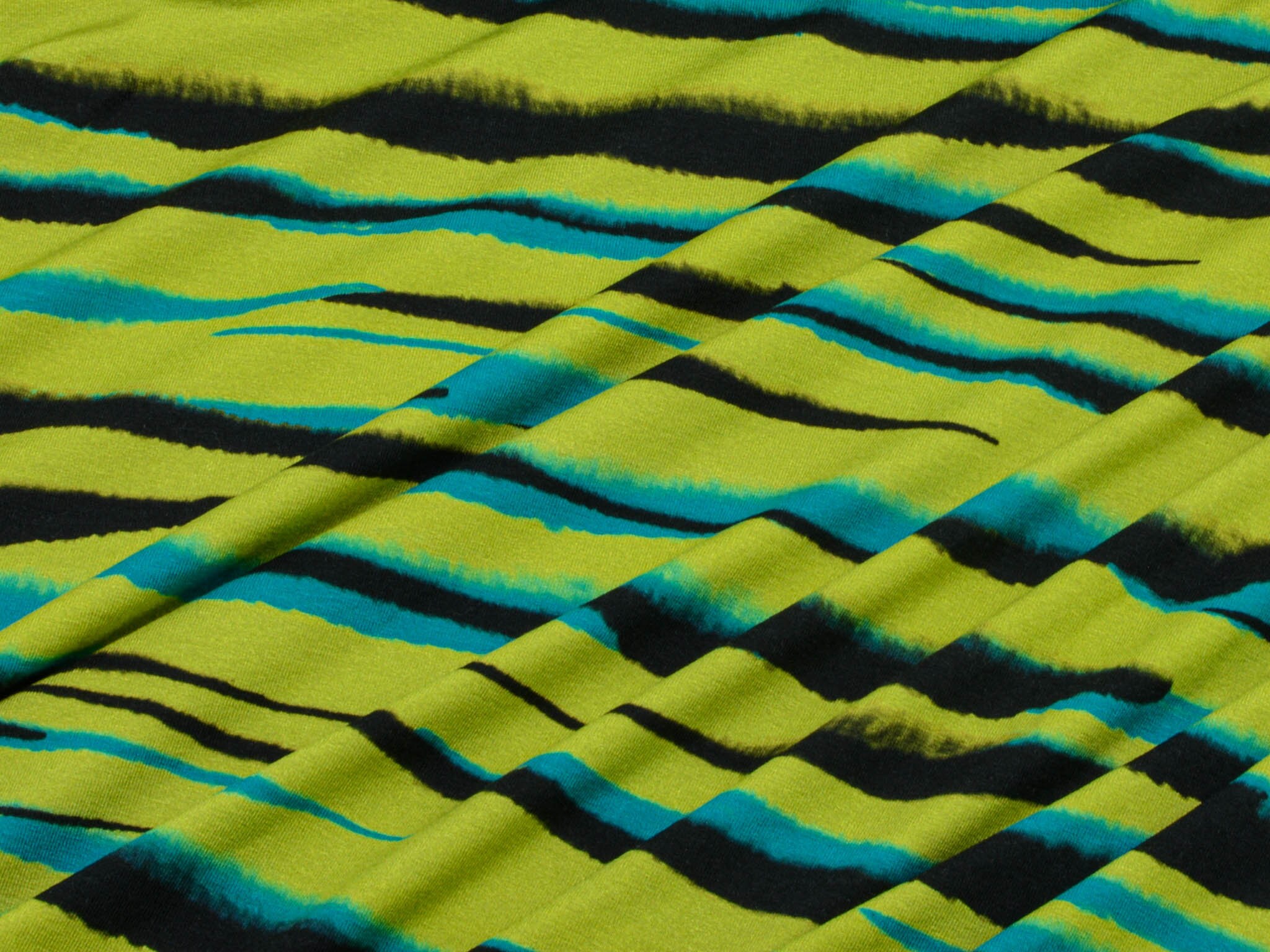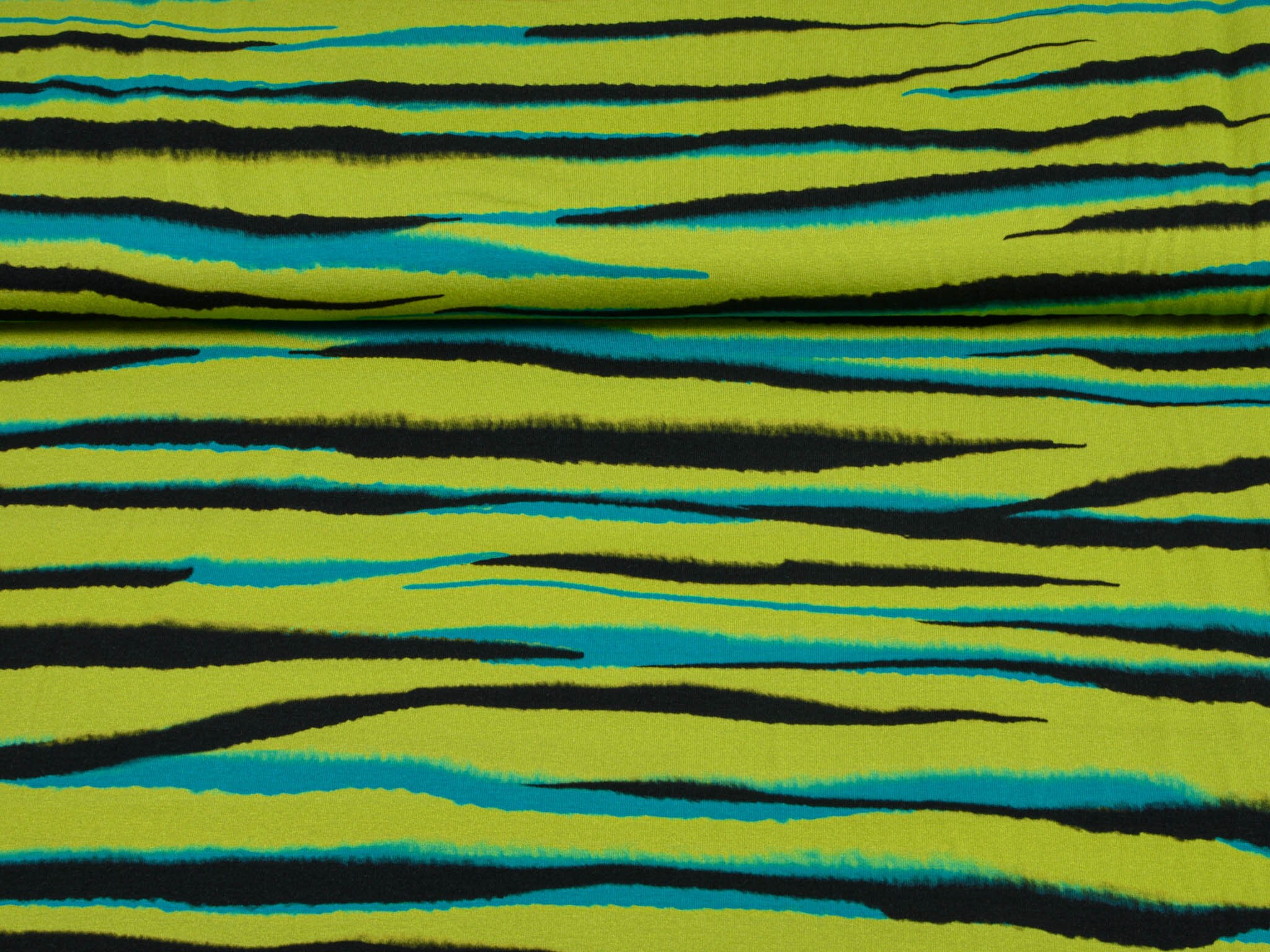 Viskose Jersey gemustert von Hilco. Der Jersey zeigt ein Zebramuster in grün, türkis und schwarz. Er eignet sich wunderbar zum Nähen von T-Shirts, Kleidern, Röcken und vielem mehr.