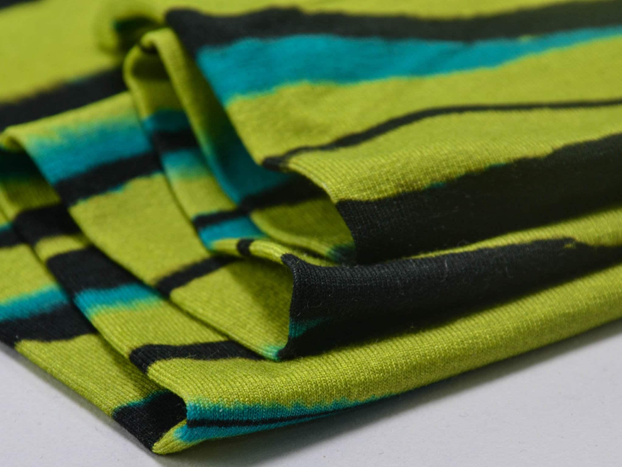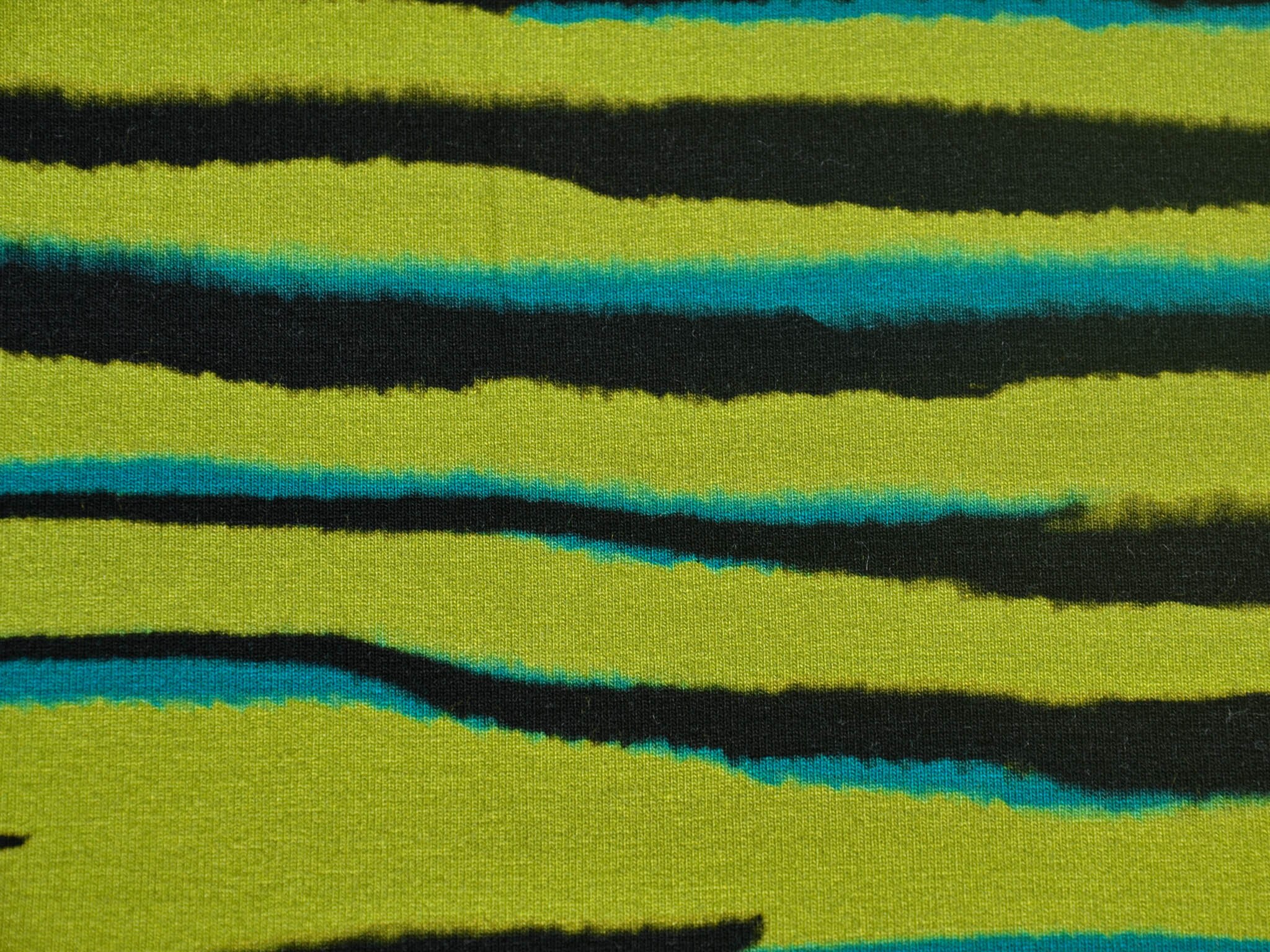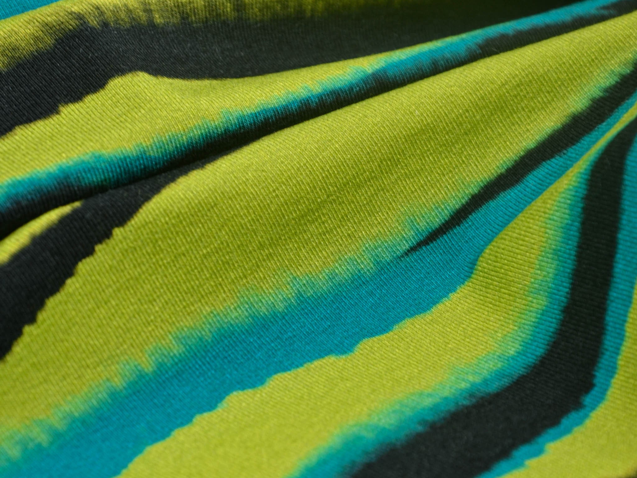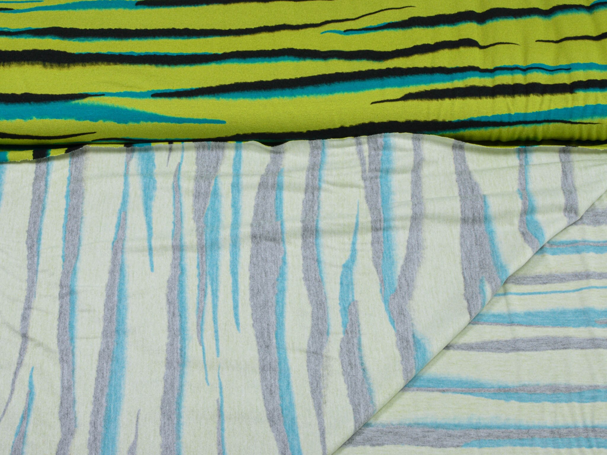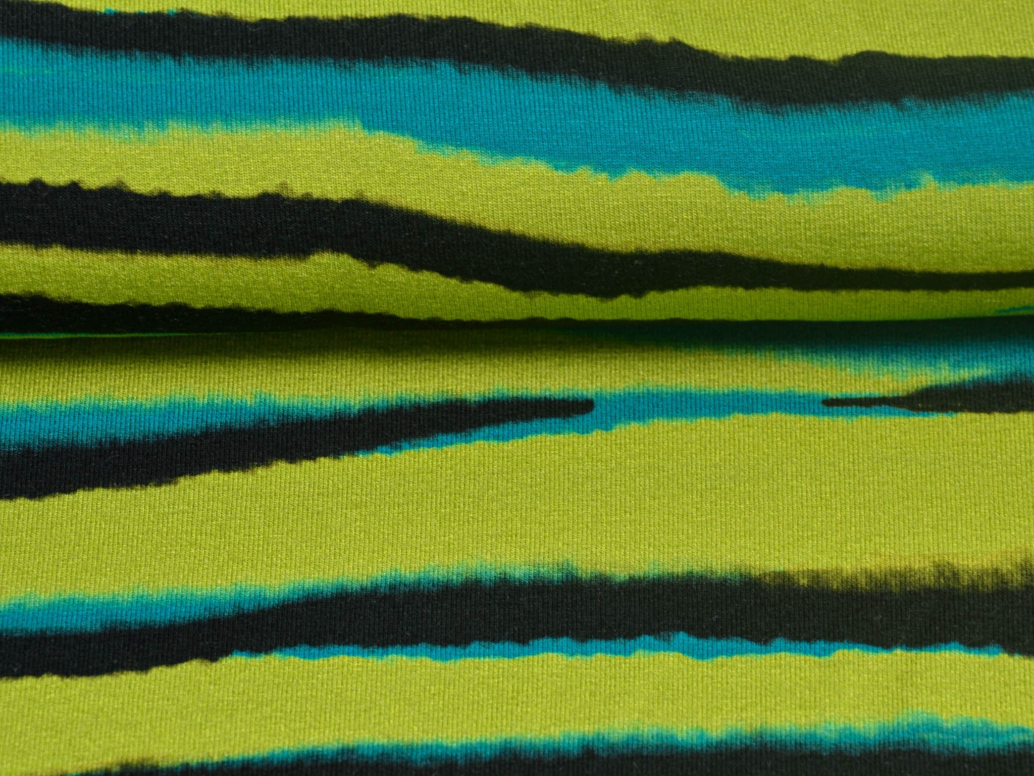 Viskose Jersey gemustert von Hilco. Der Jersey zeigt ein Zebramuster in grün, türkis und schwarz. Er eignet sich wunderbar zum Nähen von T-Shirts, Kleidern, Röcken und vielem mehr.