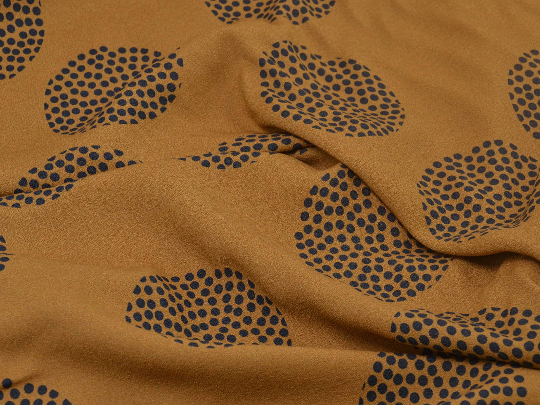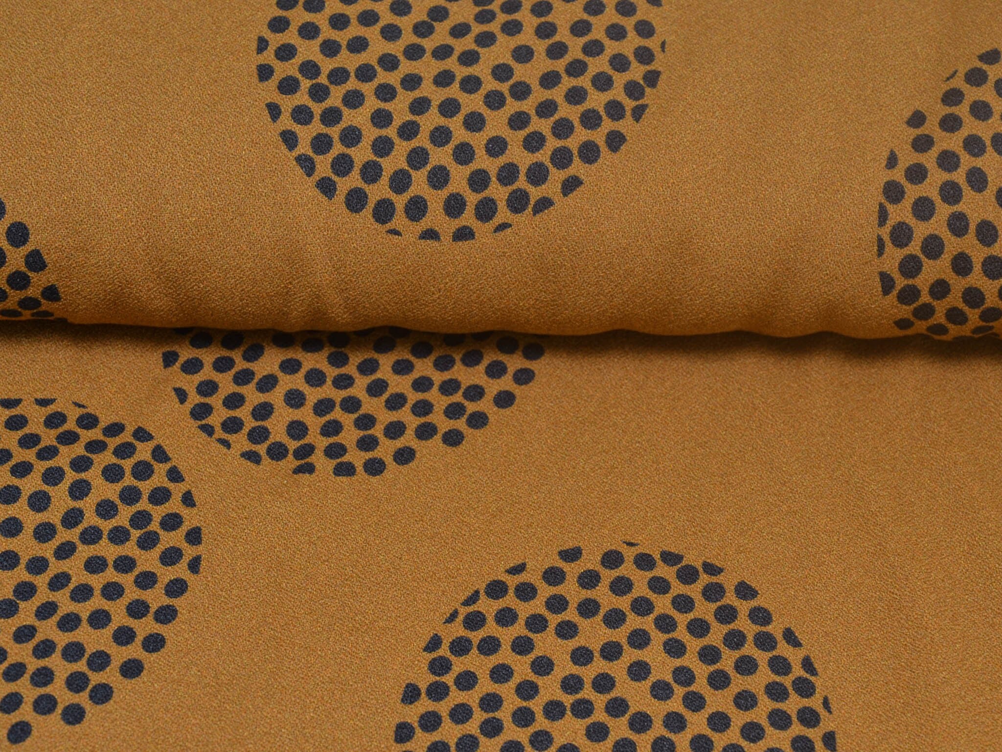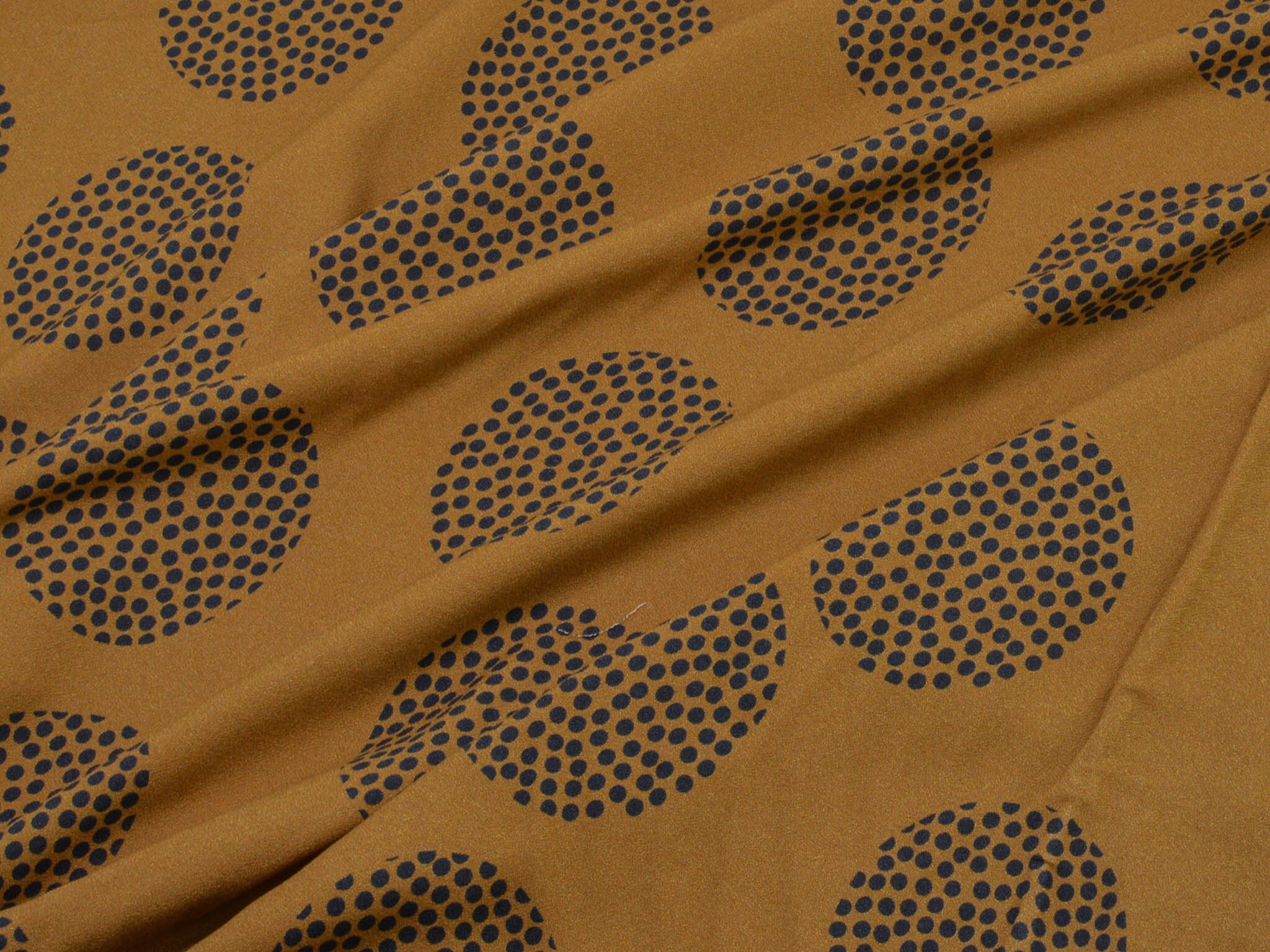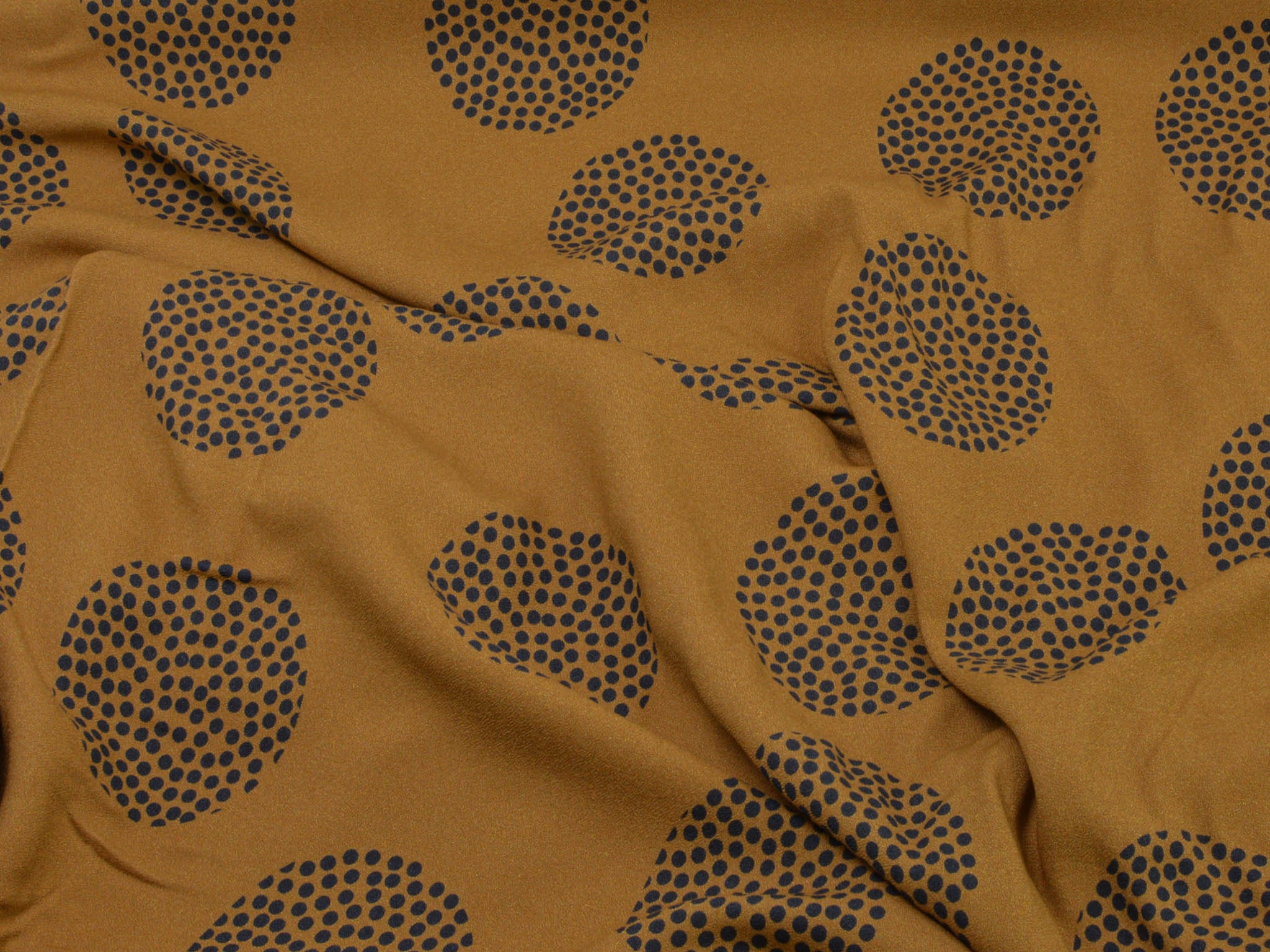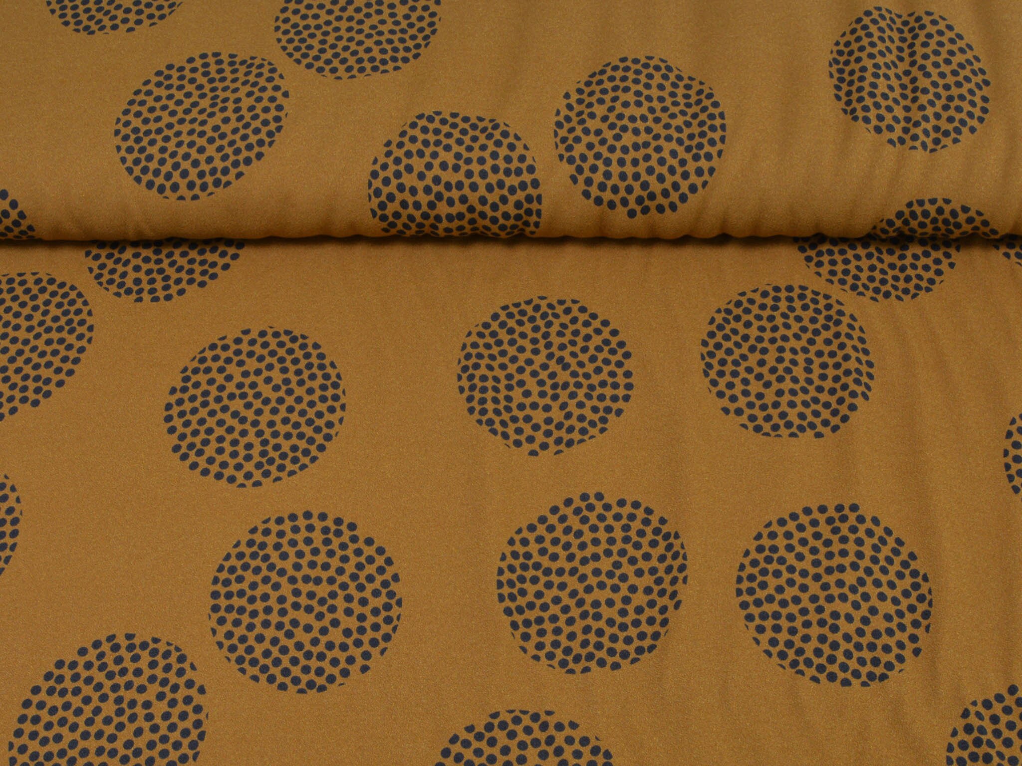 Blouse fabric from Hilco in mustard yellow with dark gray circles containing small dots. The lightweight viscose fabric has a crinkled feel. Viscose woven fabric has a wonderful, flowing drape. You can sew light dresses, flowing skirts, blouses, and trousers from this fabric.