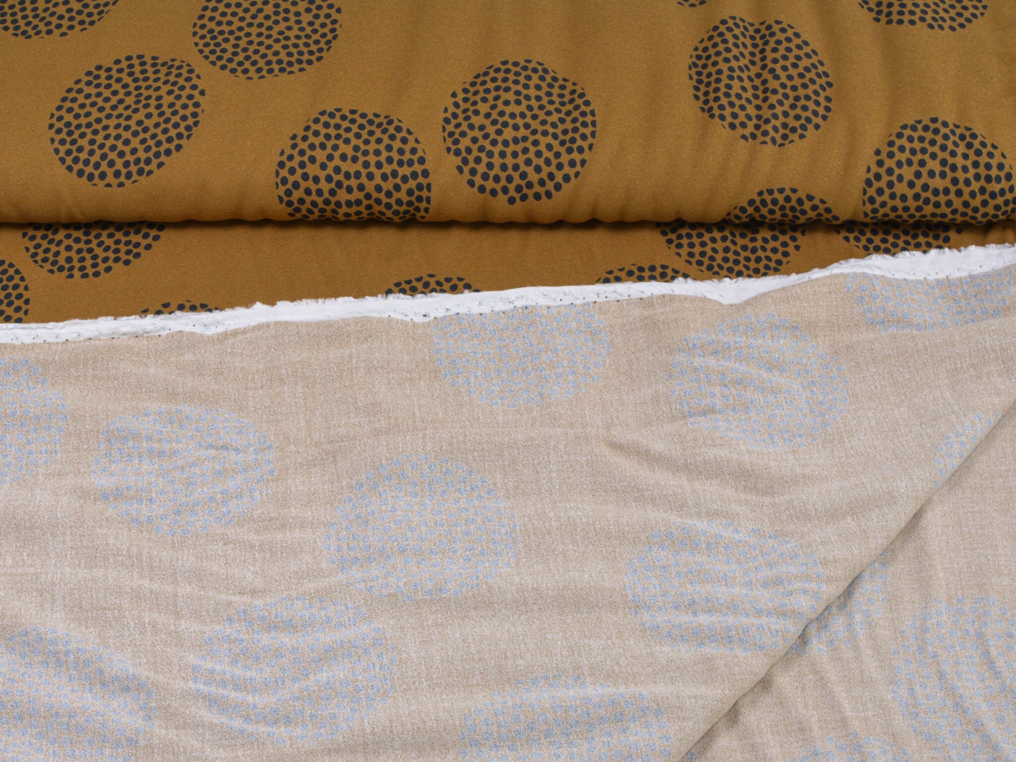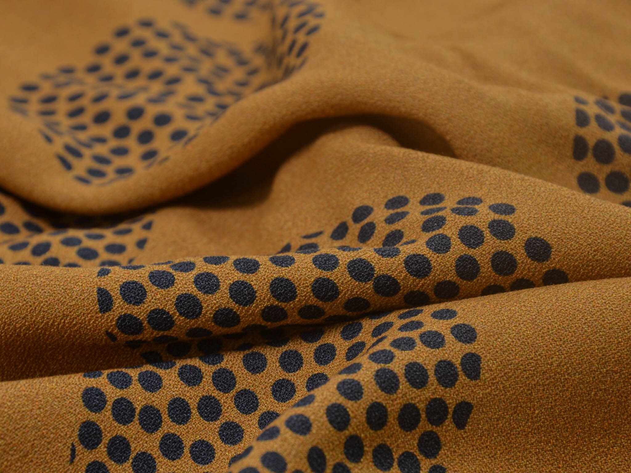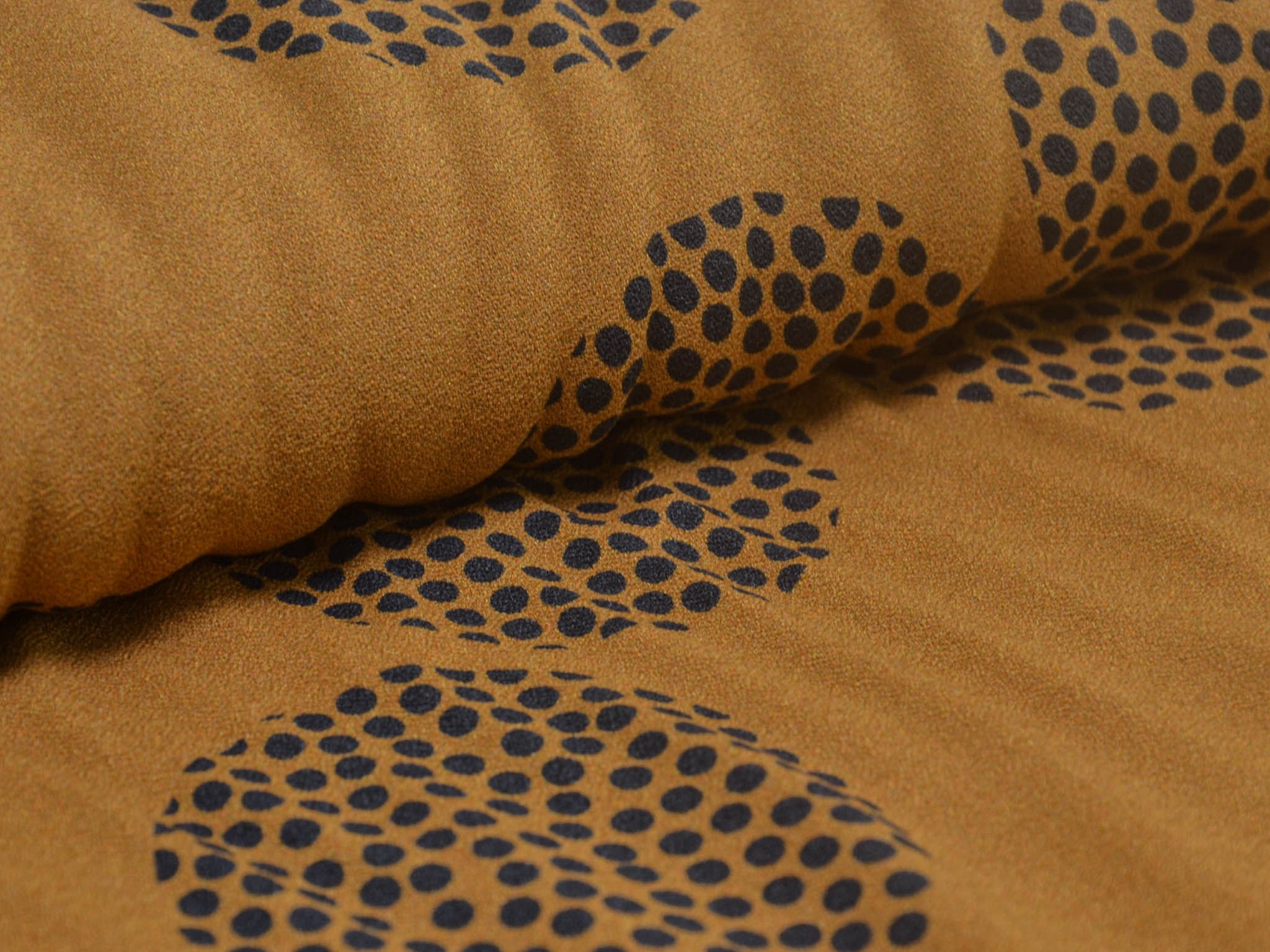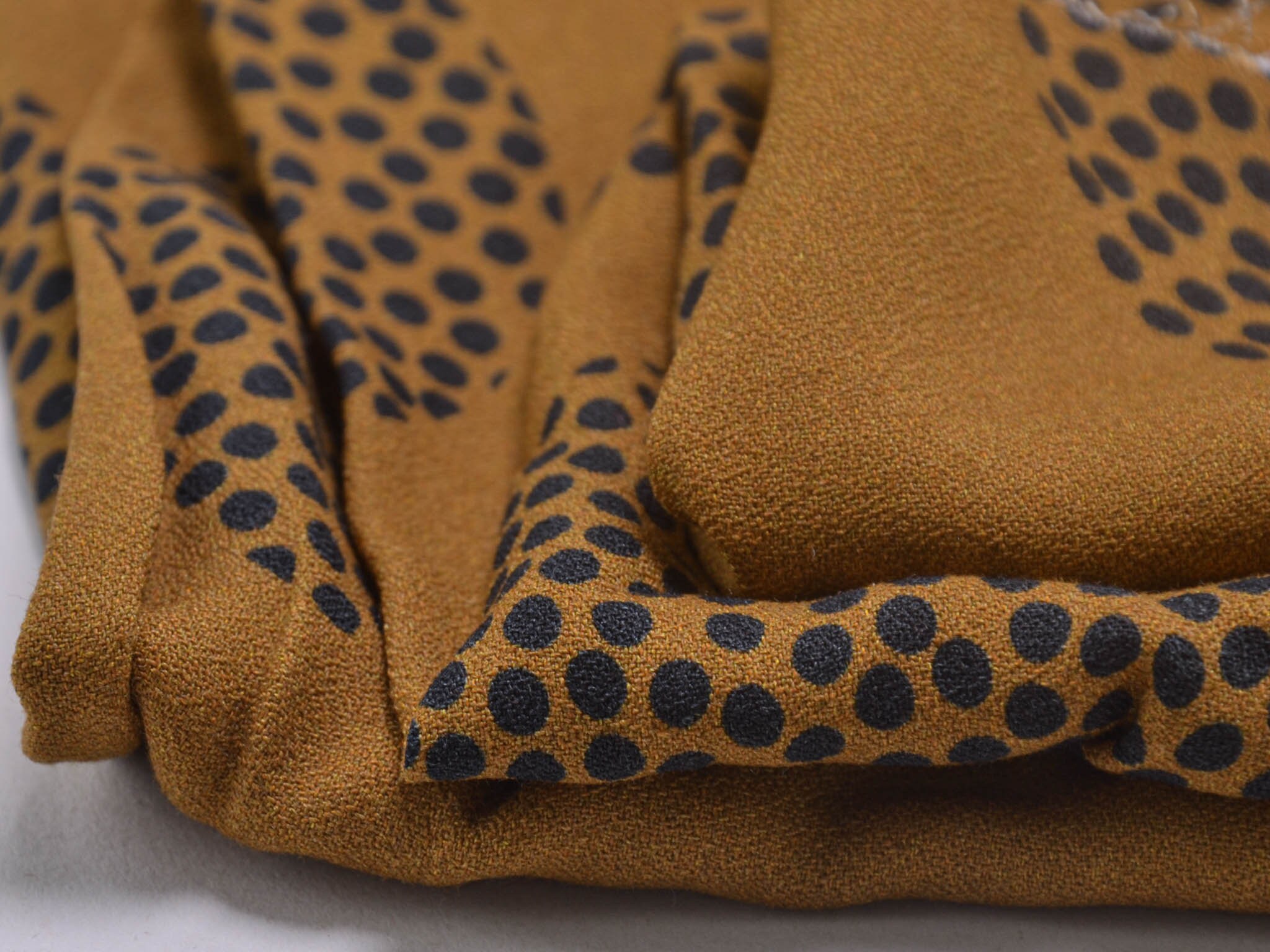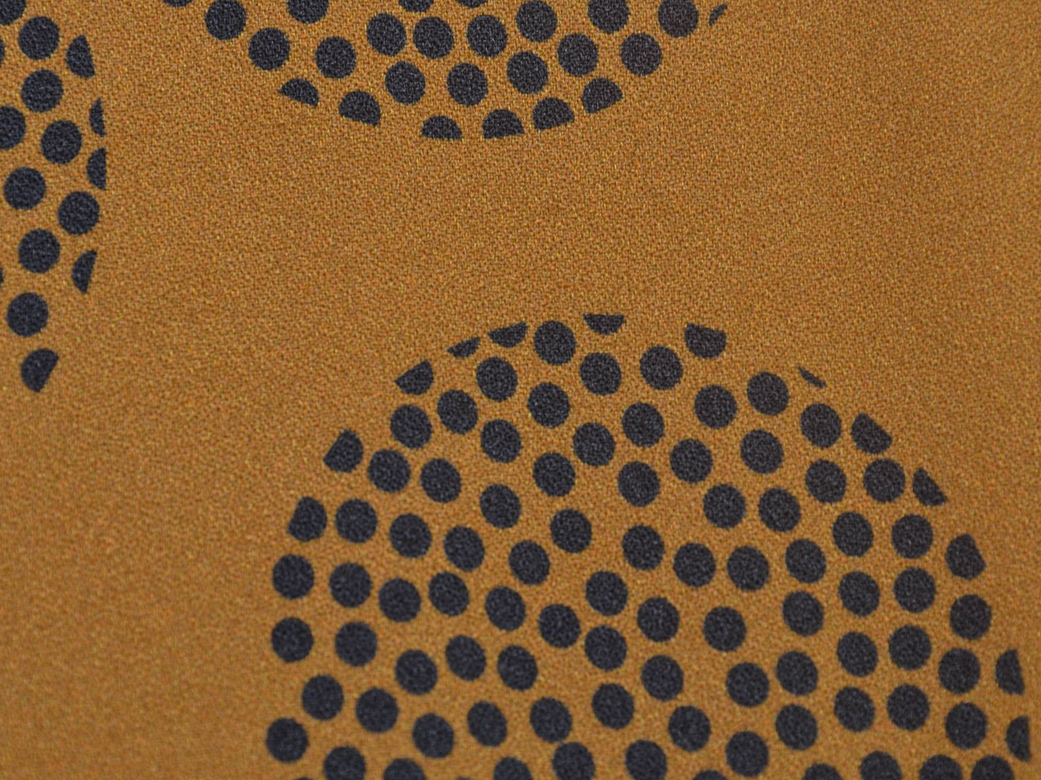 Blouse fabric from Hilco in mustard yellow with dark gray circles containing small dots. The lightweight viscose fabric has a crinkled feel. Viscose woven fabric has a wonderful, flowing drape. You can sew light dresses, flowing skirts, blouses, and trousers from this fabric.
