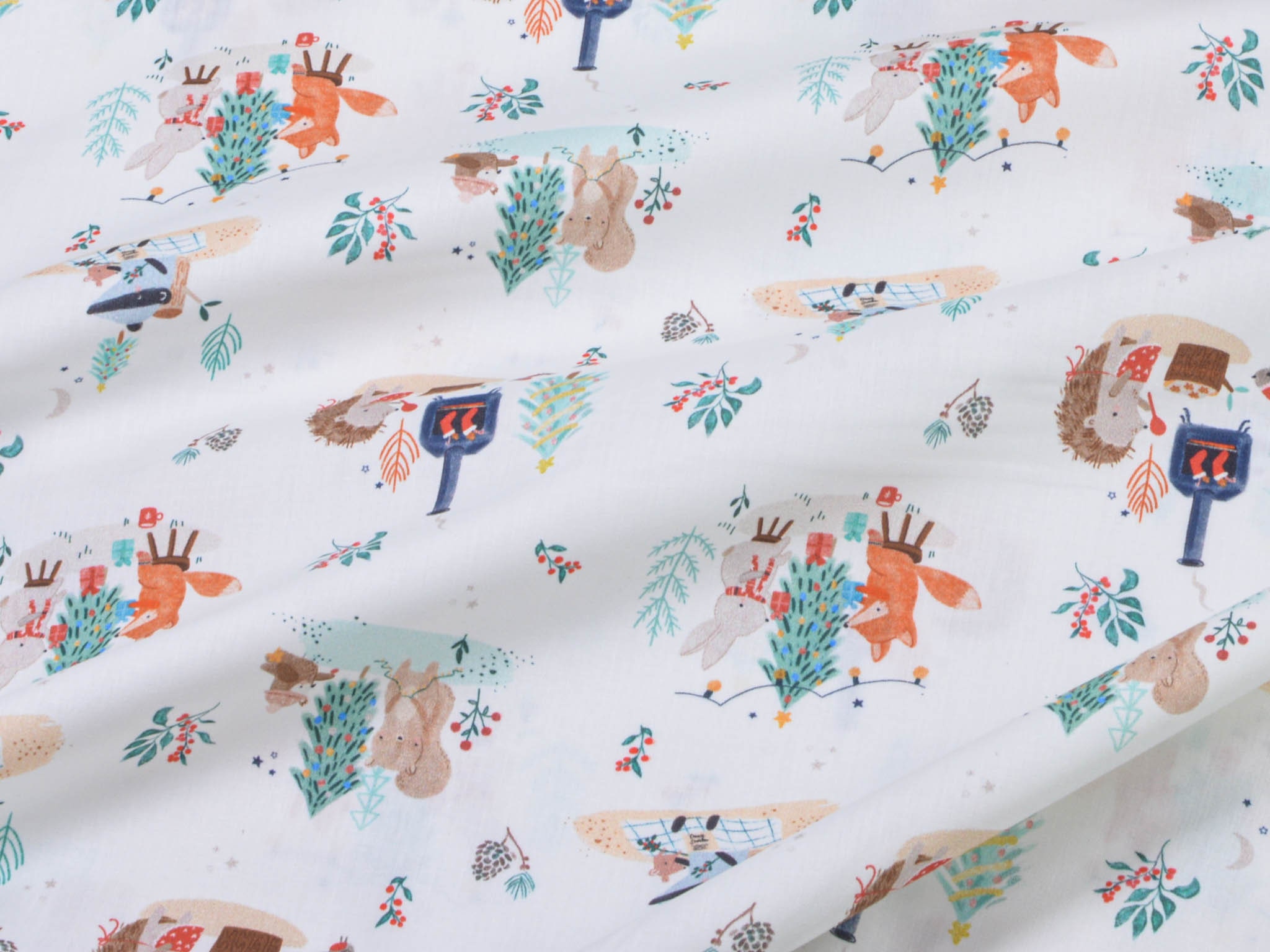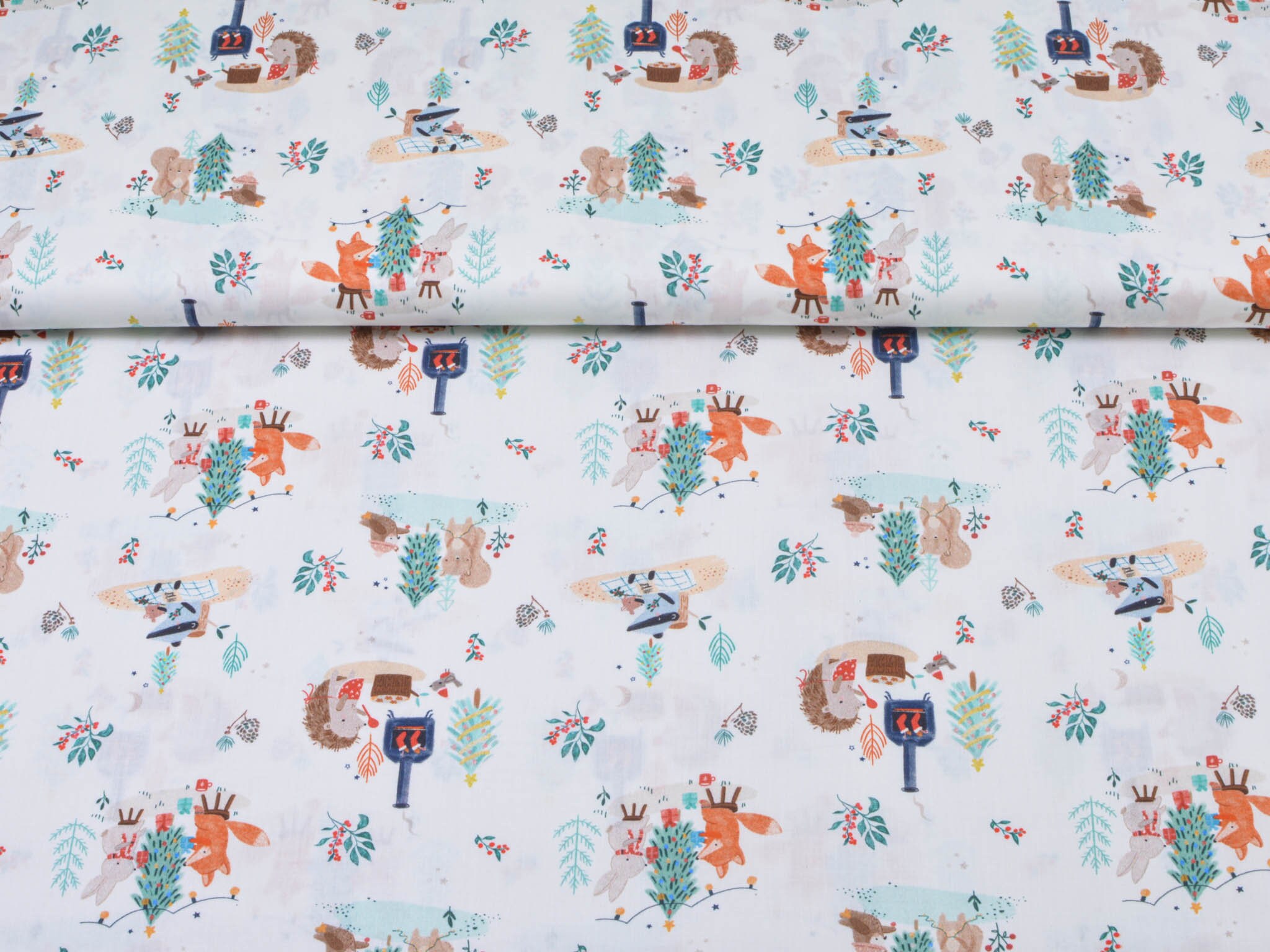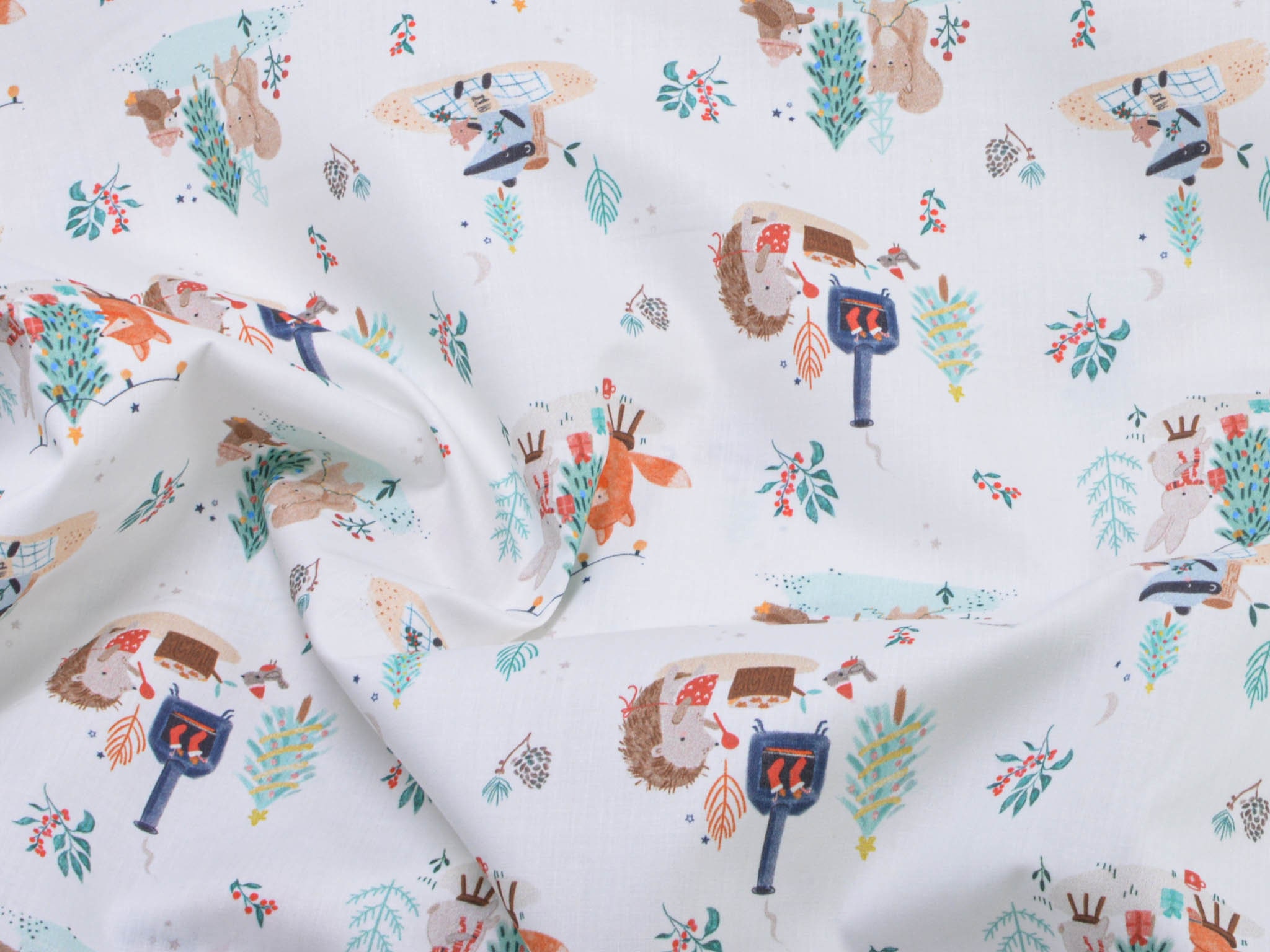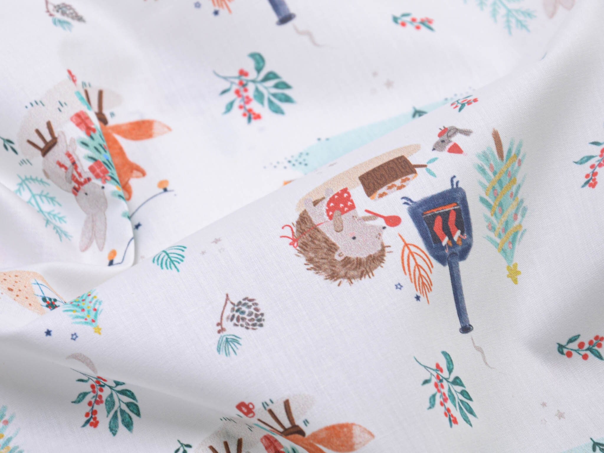 Dünner Popeline aus Baumwolle. Der Stoff ist weiß mit Winter-Motiv. Der Stoff kann zum Nähen von Kissen, für Weihnachtsdeko, Röcke, Kleider und vieles mehr verwendet werden.