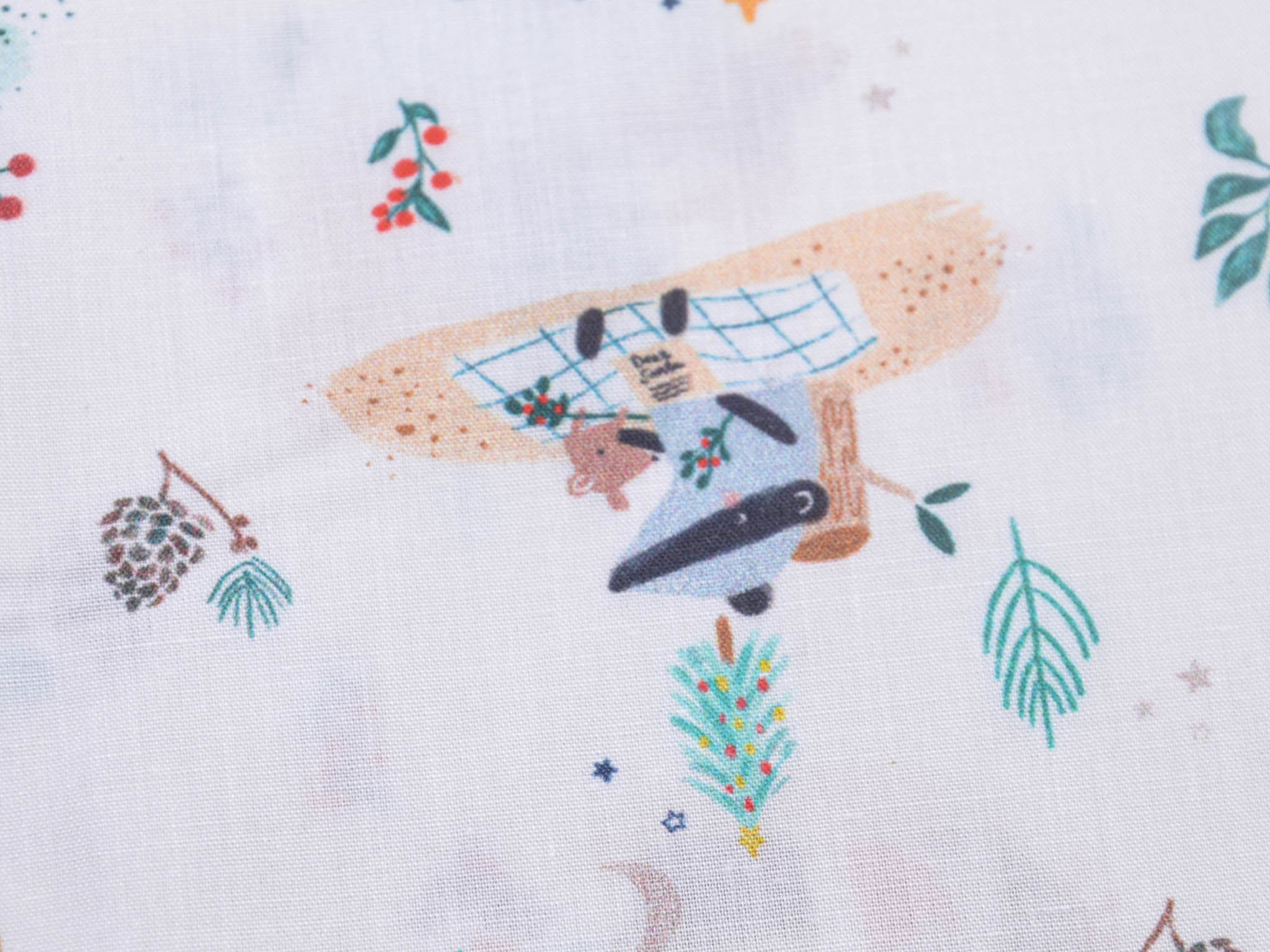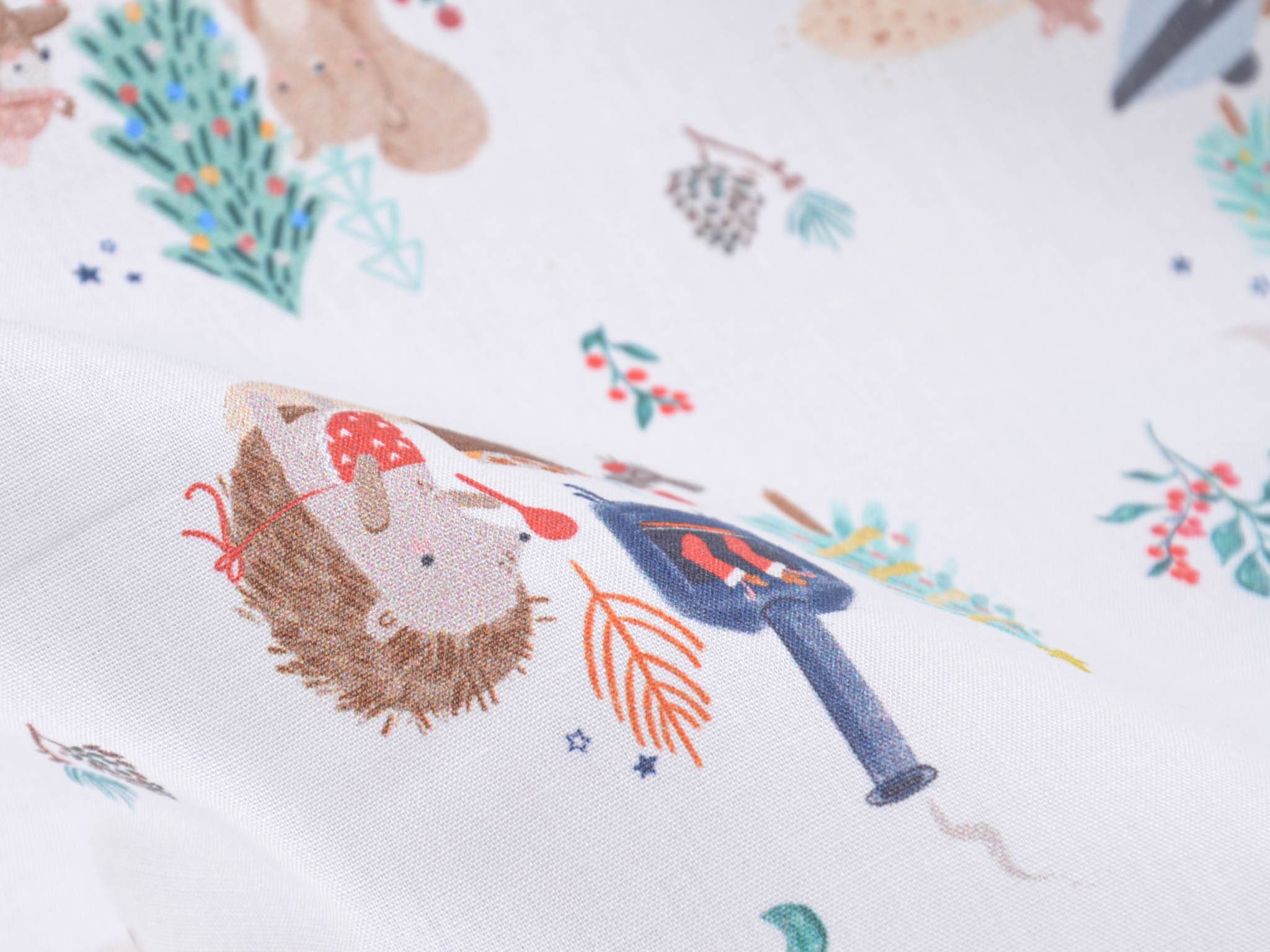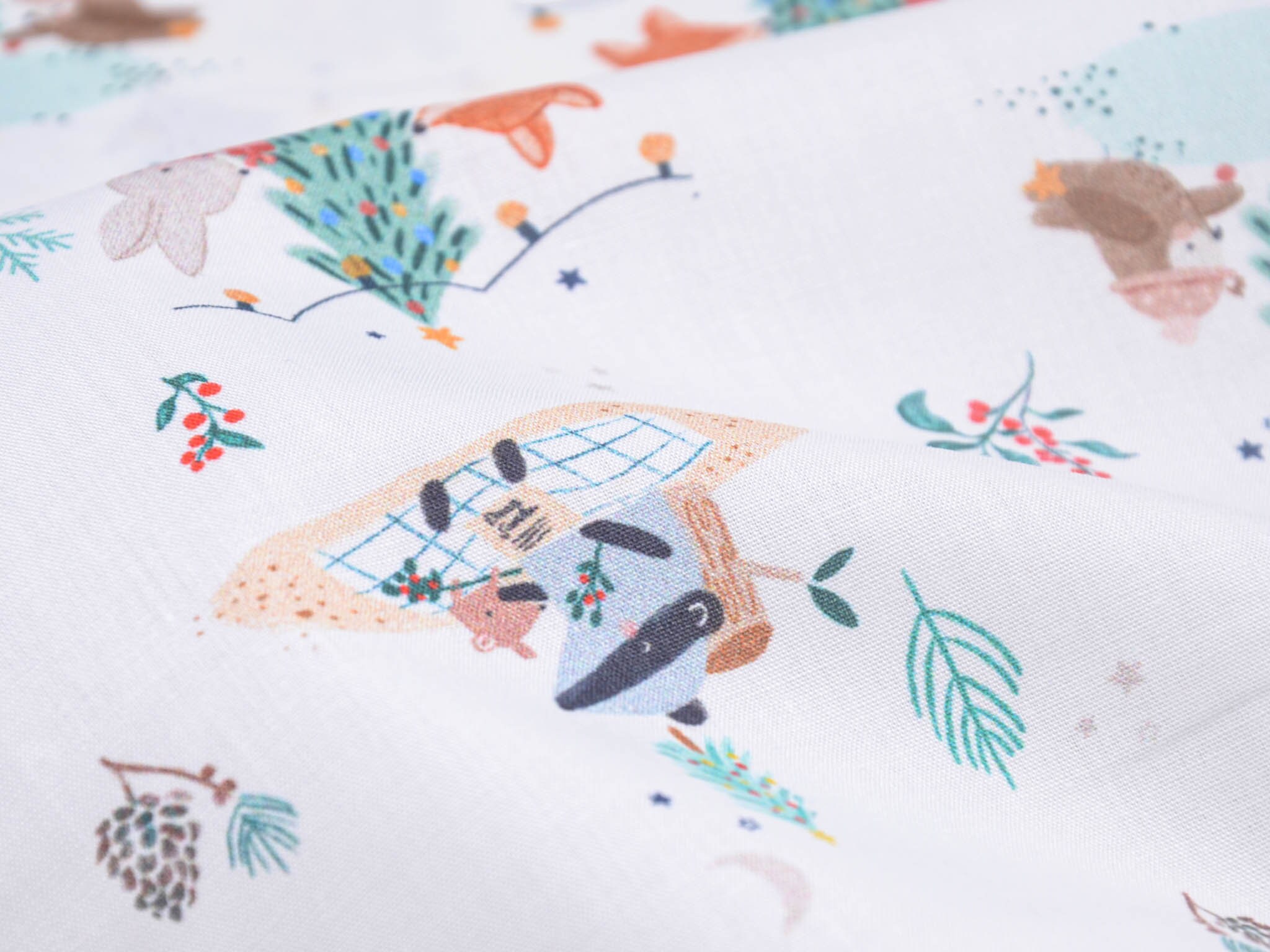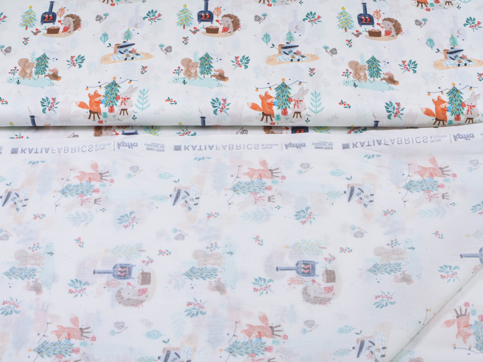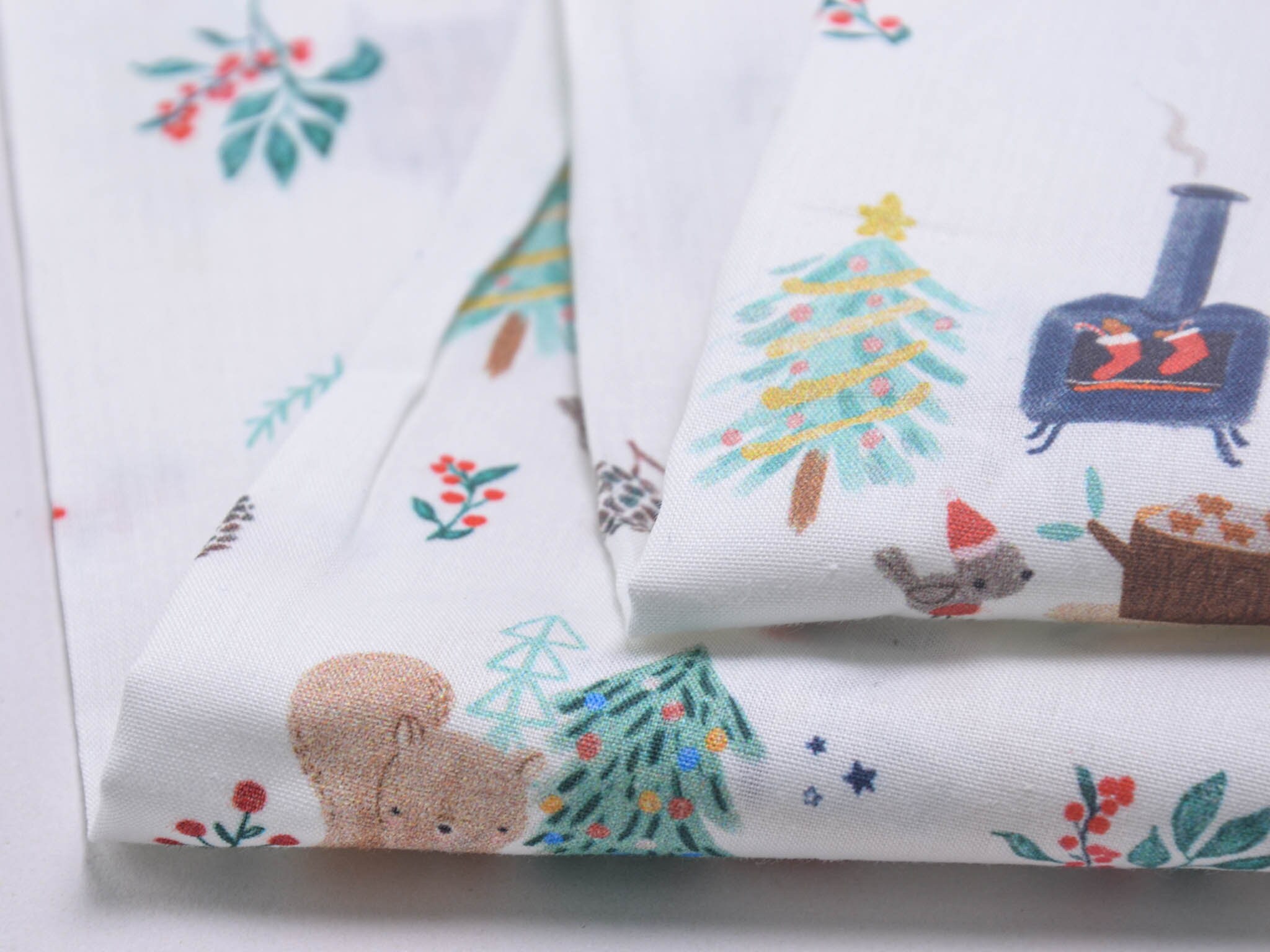 Dünner Popeline aus Baumwolle. Der Stoff ist weiß mit Winter-Motiv. Der Stoff kann zum Nähen von Kissen, für Weihnachtsdeko, Röcke, Kleider und vieles mehr verwendet werden.