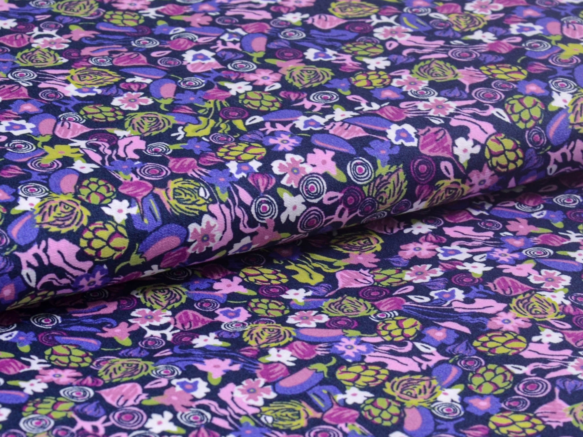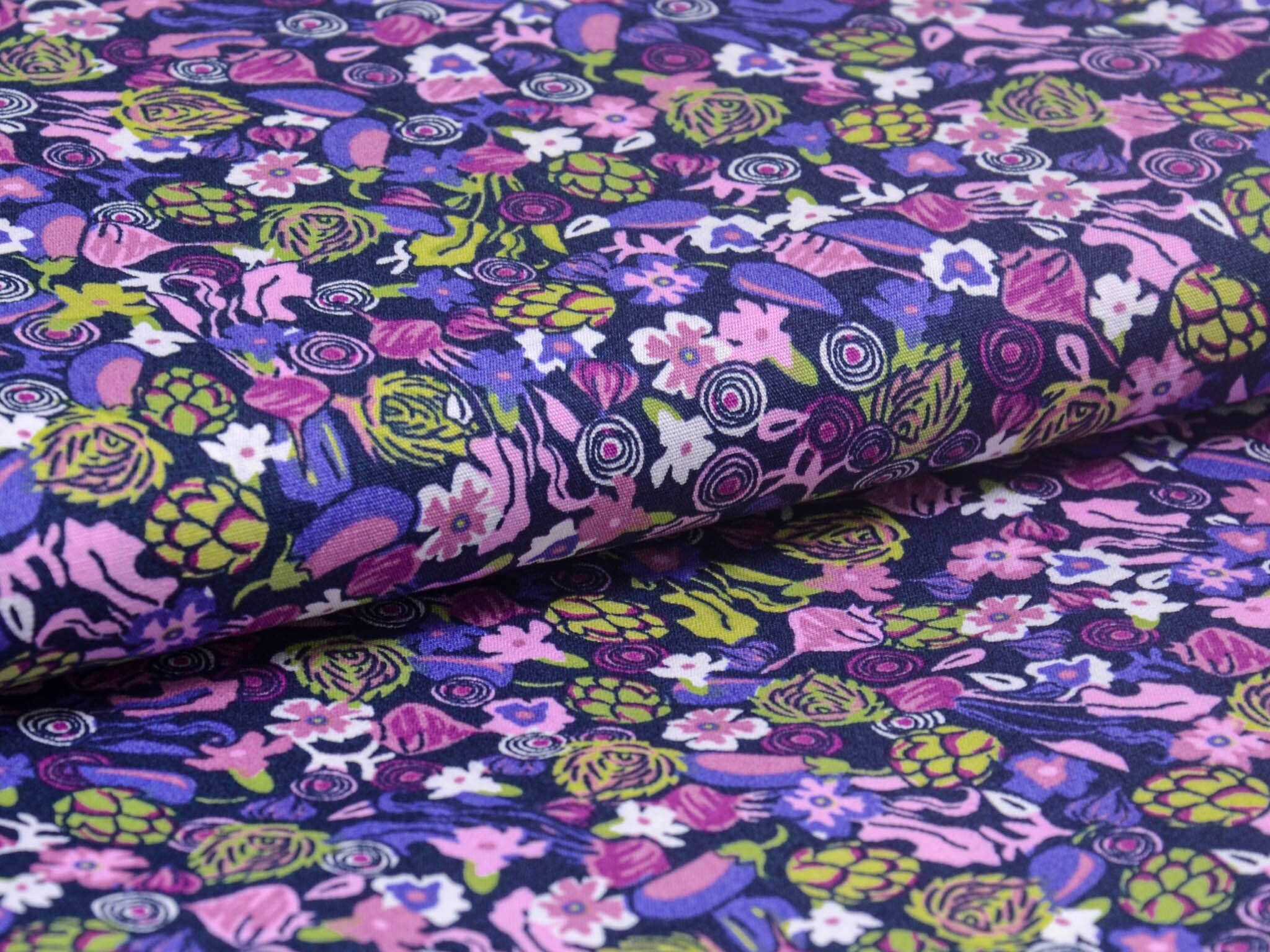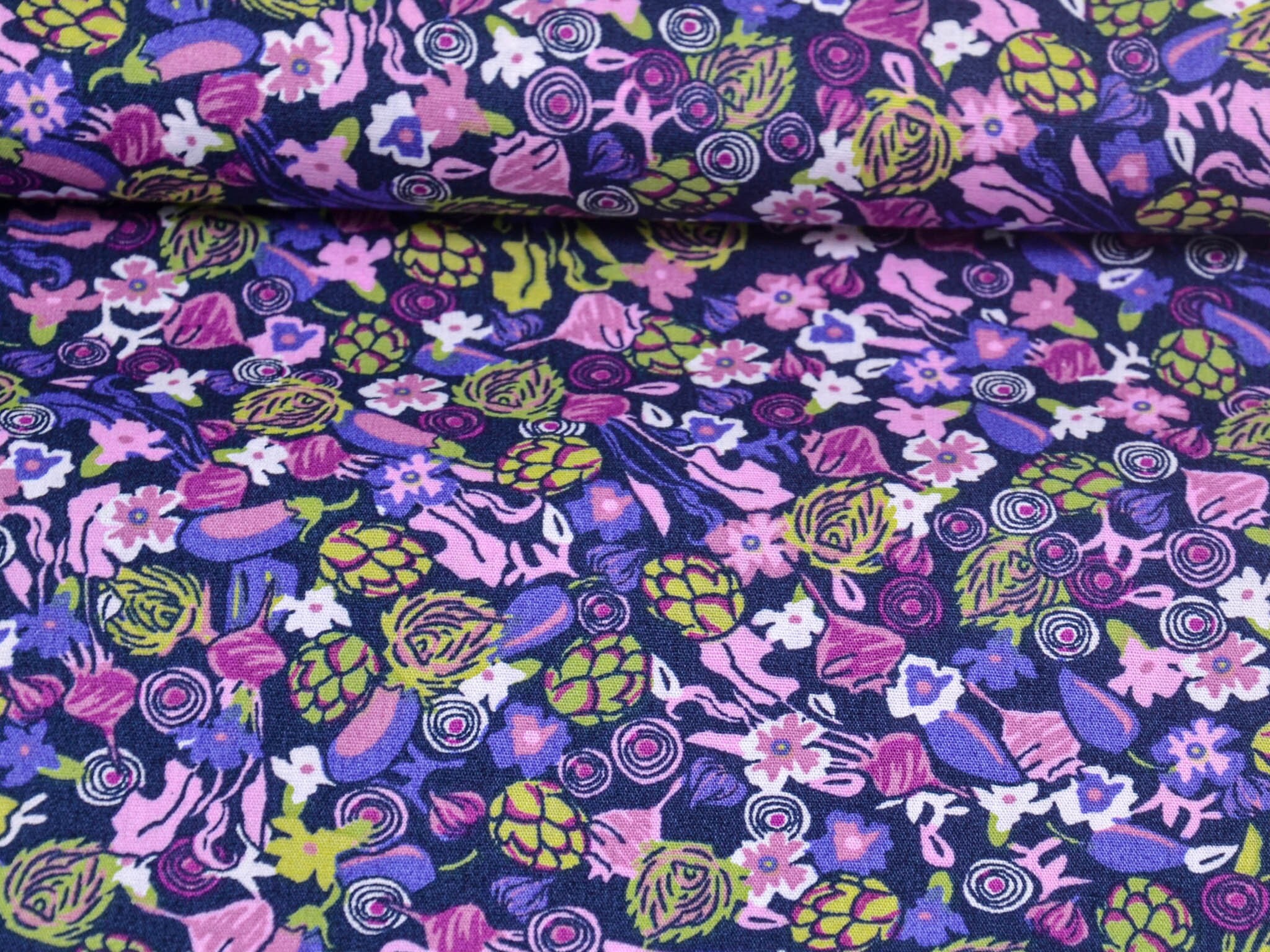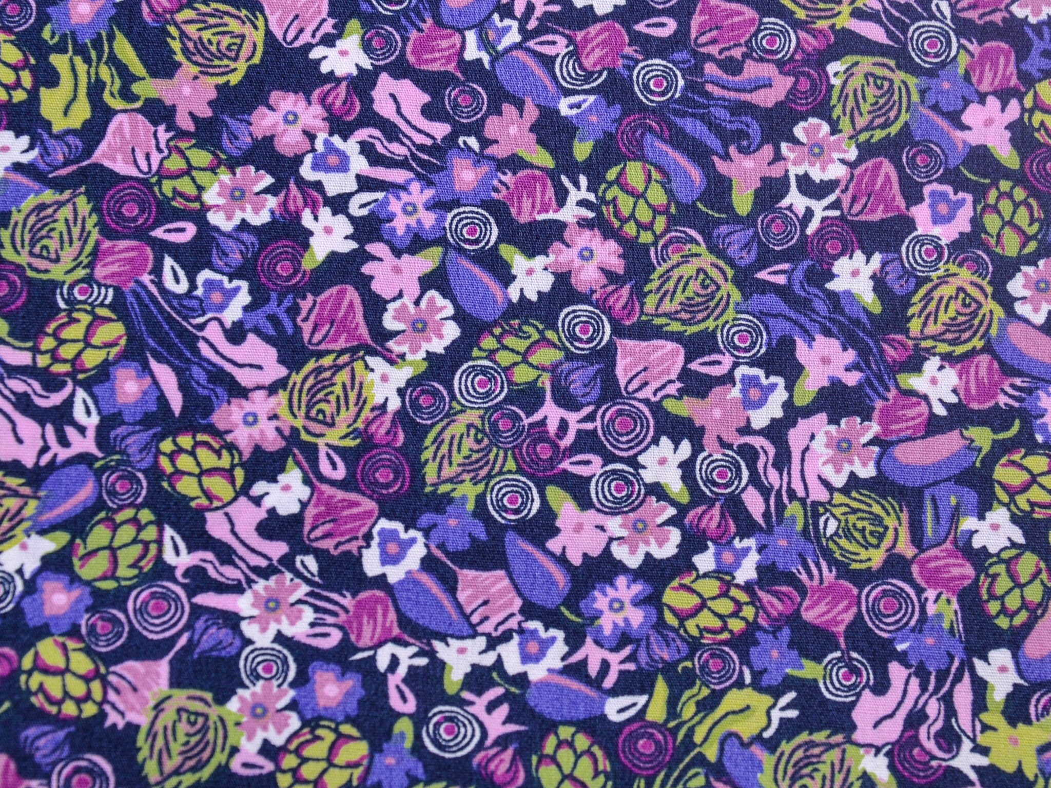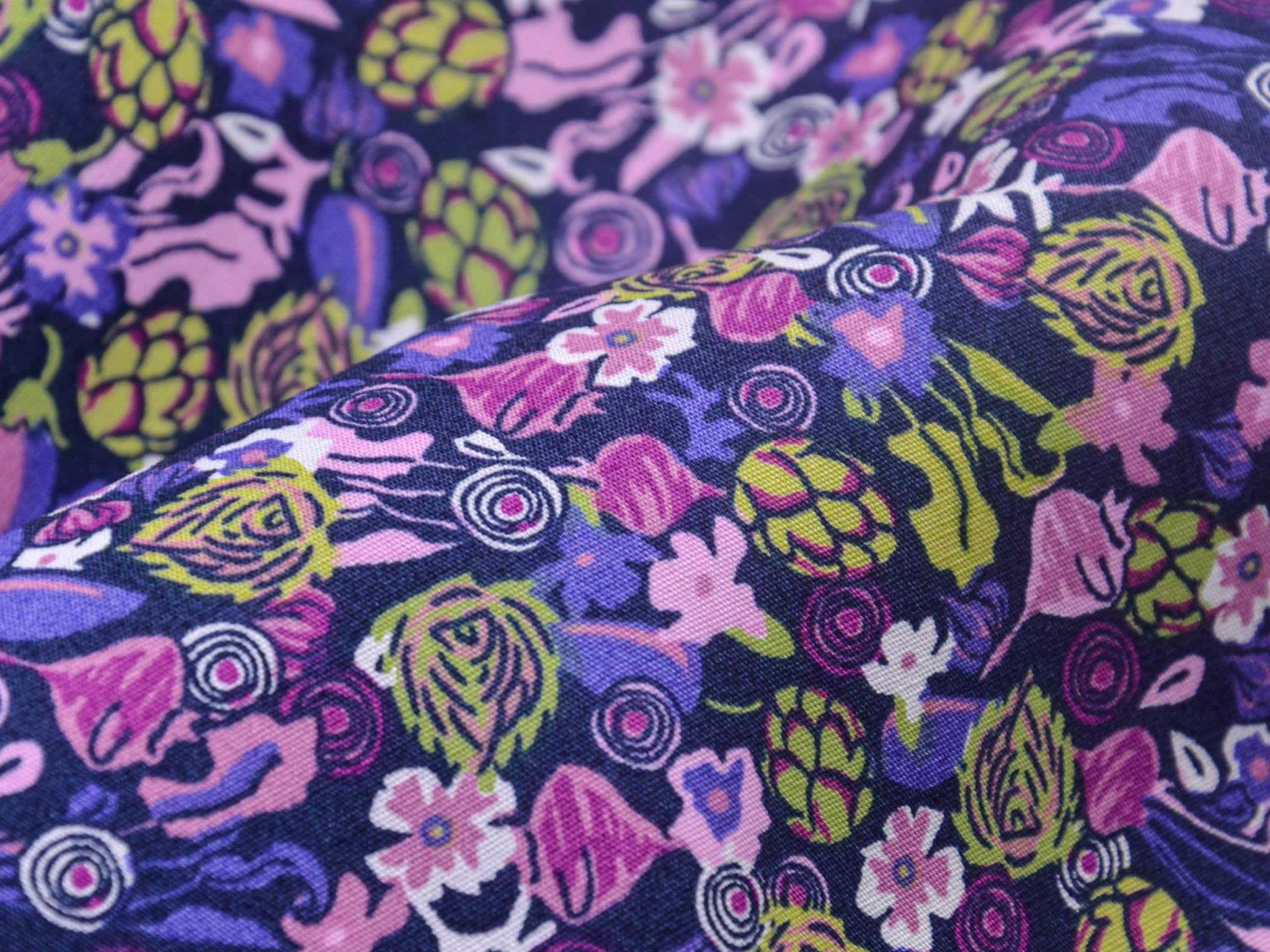 Der Stoff ist ein Popeline aus Baumwolle. Er zeigt Blumen und Gemüse. Du kannst den Stoff zum Nähen von Kleidern, Blusen, Röcken, aber auch für Weihnachtsdeko, Kissen und vieles mehr verwenden.