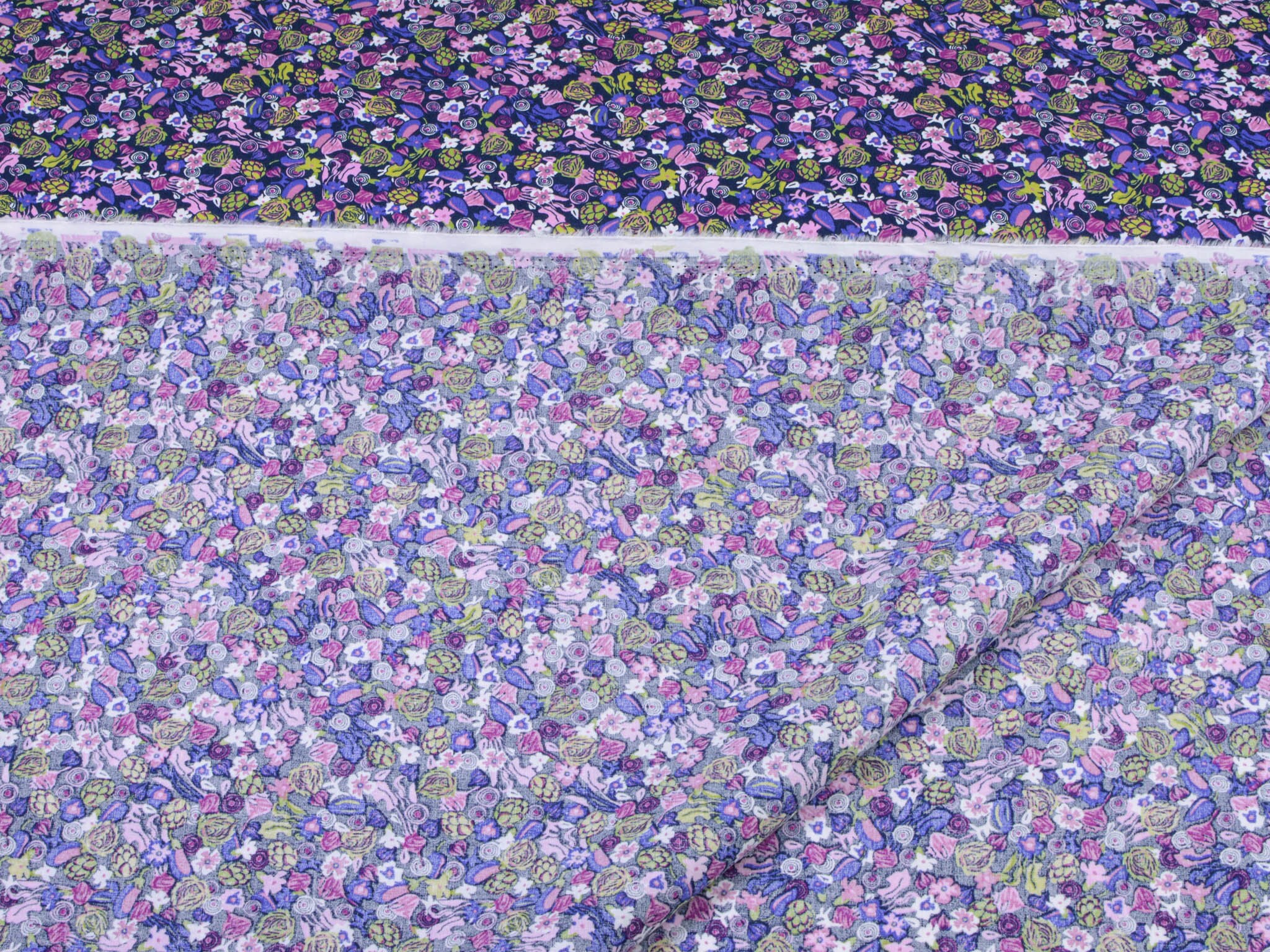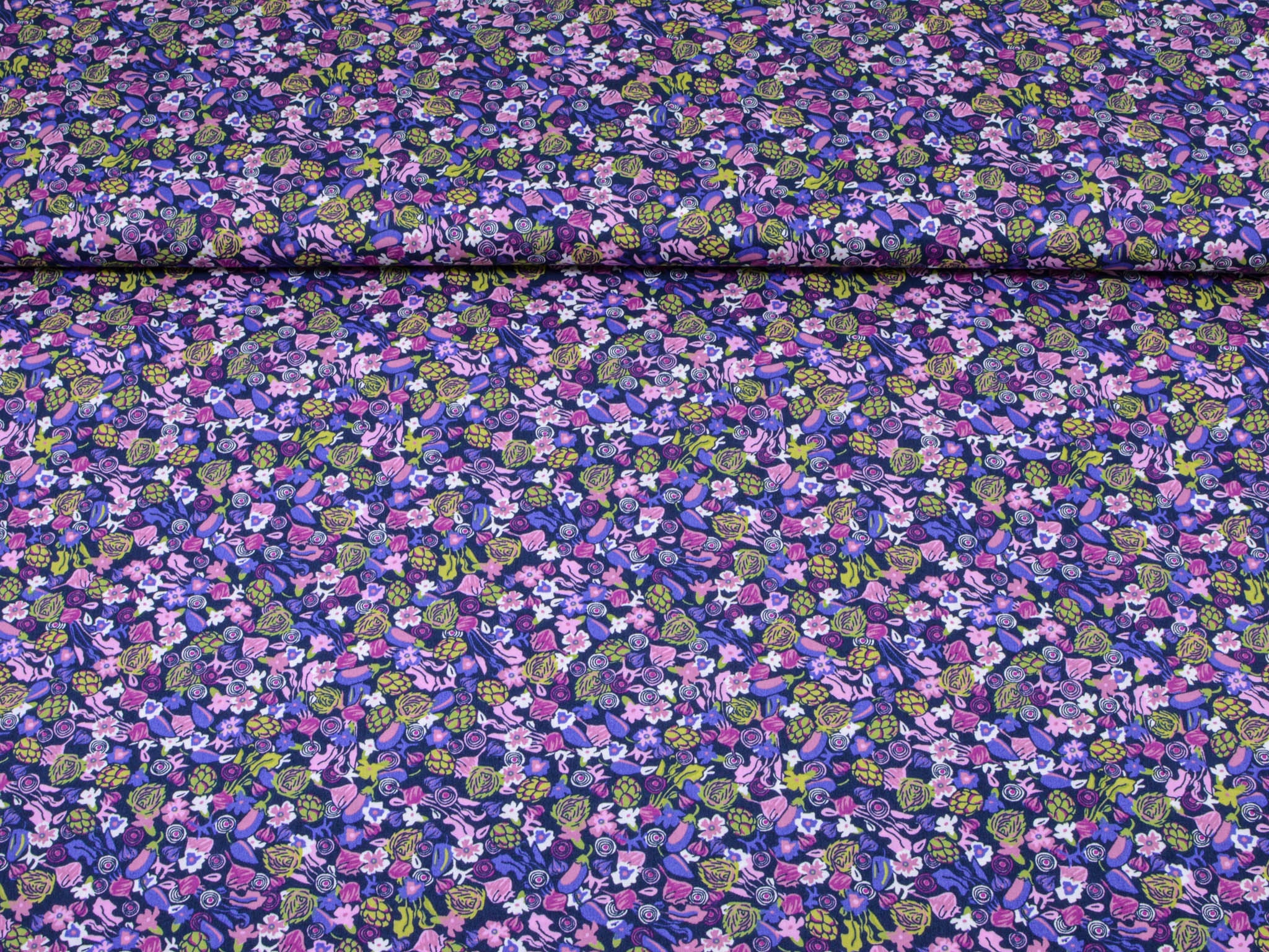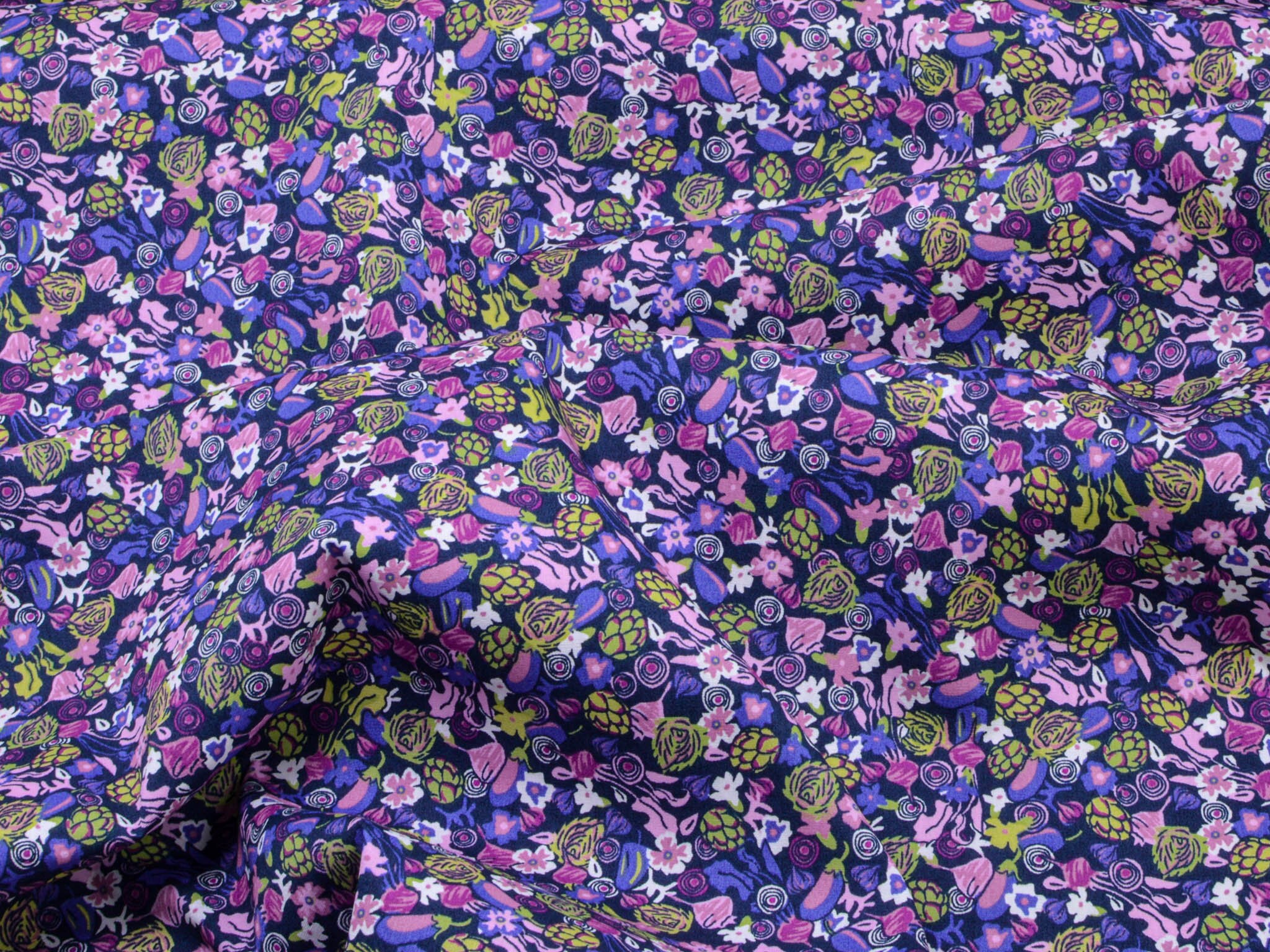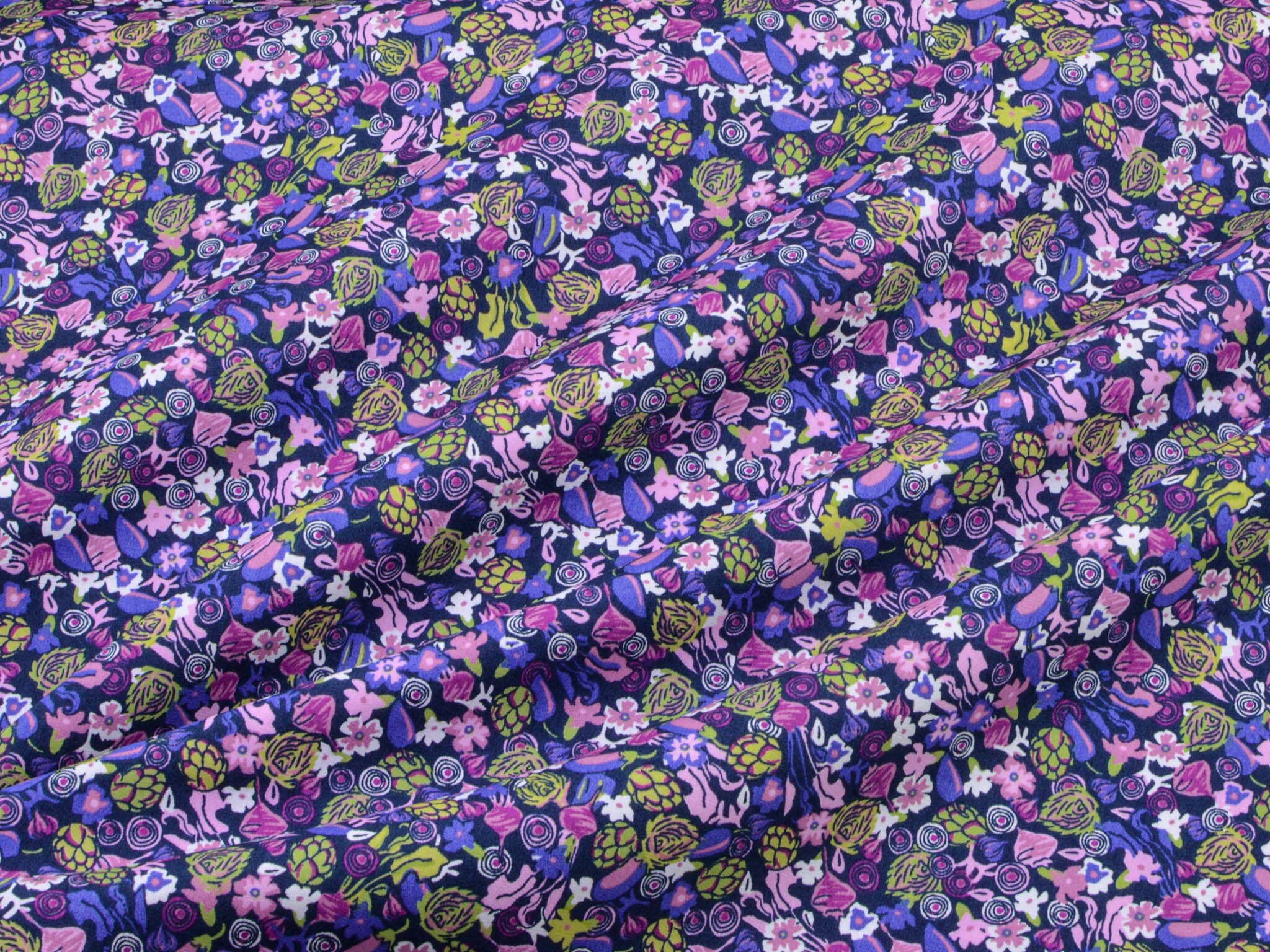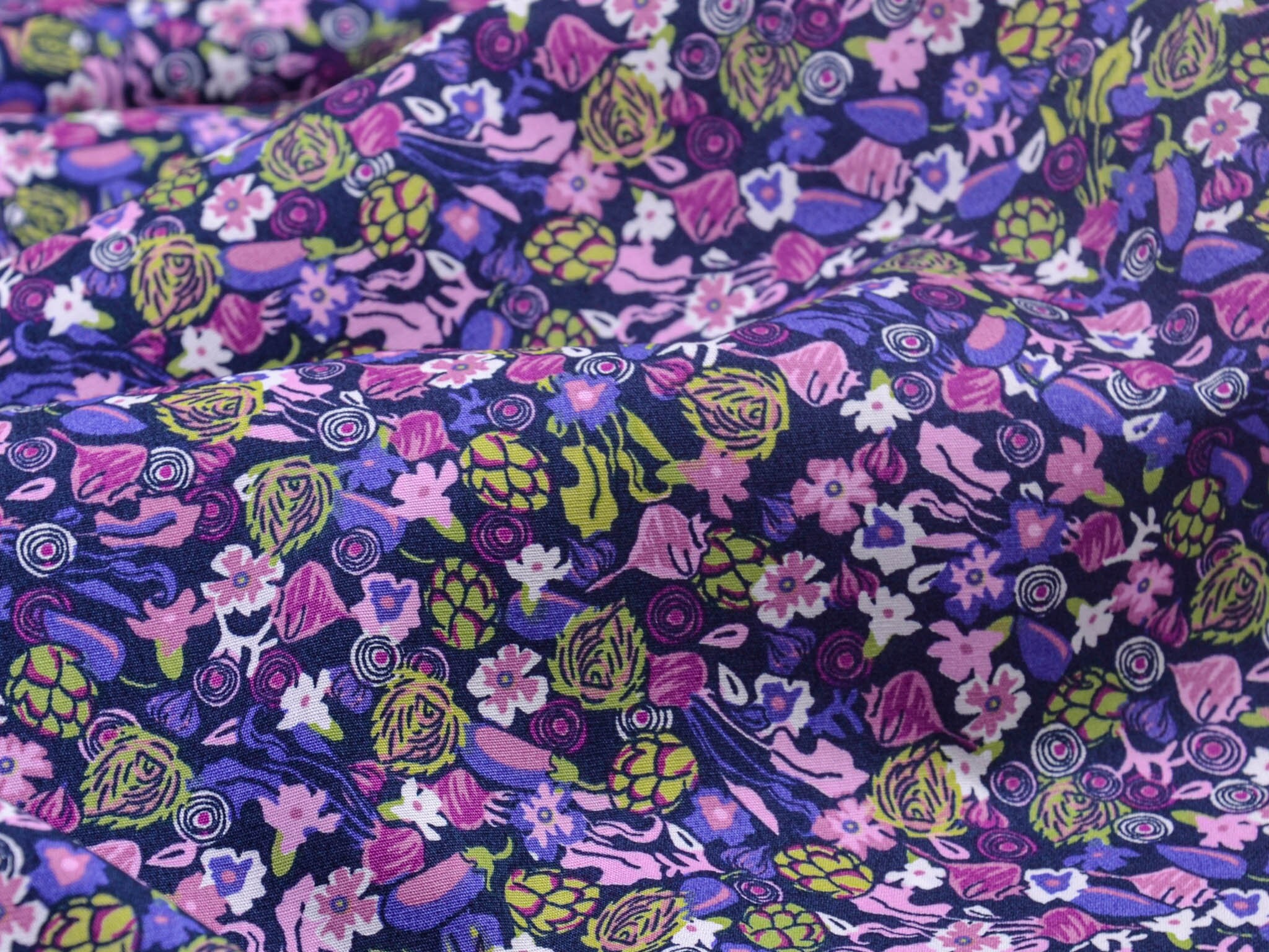 Der Stoff ist ein Popeline aus Baumwolle. Er zeigt Blumen und Gemüse. Du kannst den Stoff zum Nähen von Kleidern, Blusen, Röcken, aber auch für Weihnachtsdeko, Kissen und vieles mehr verwenden.