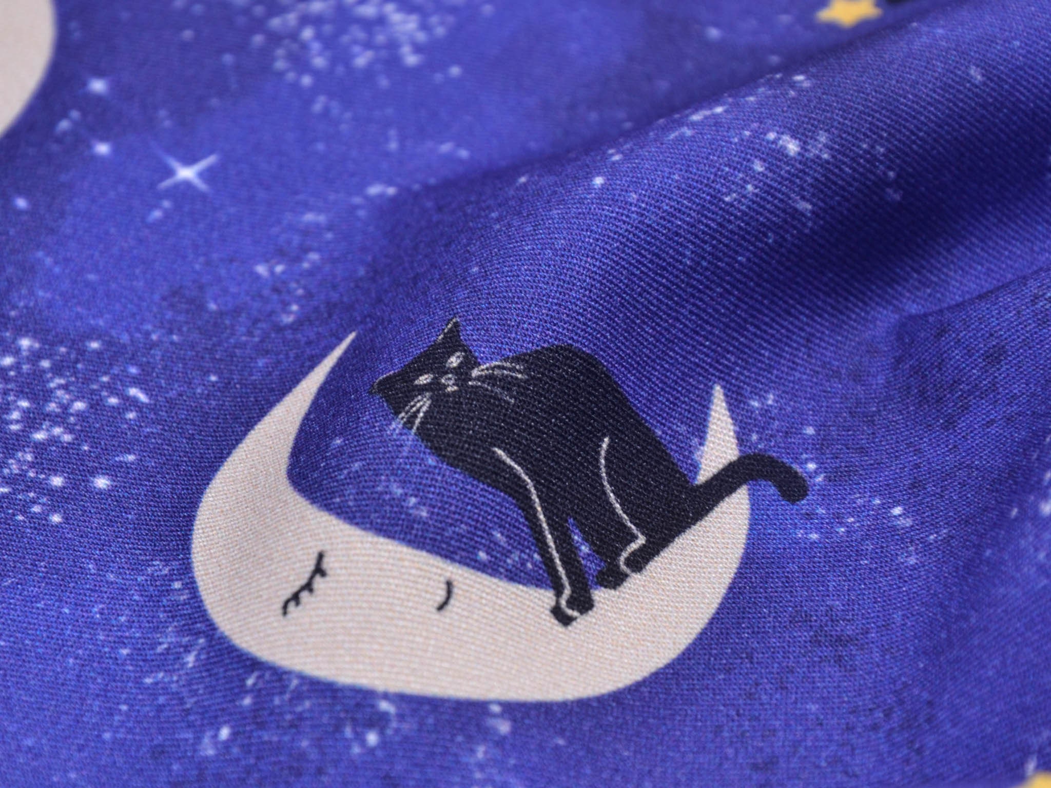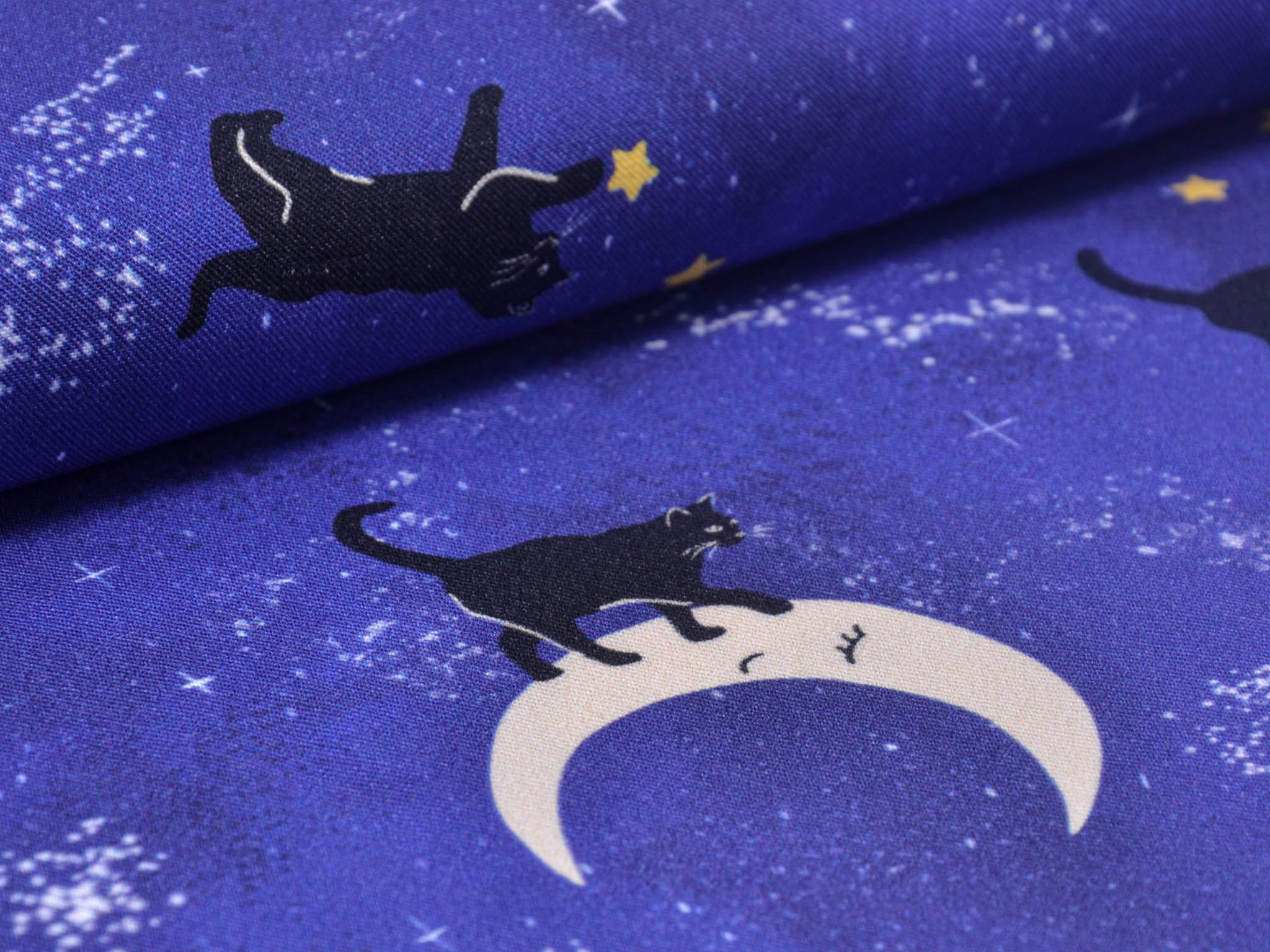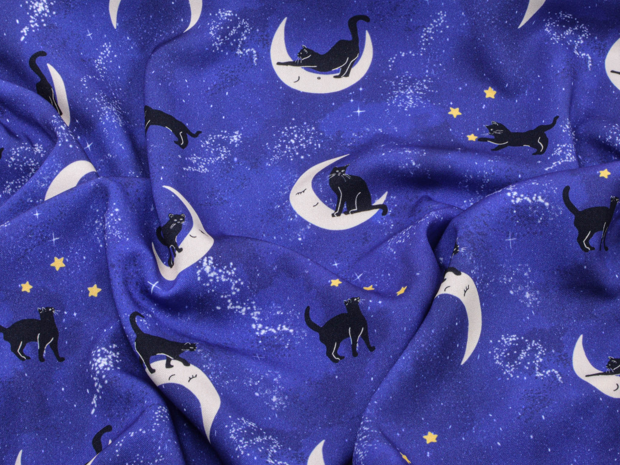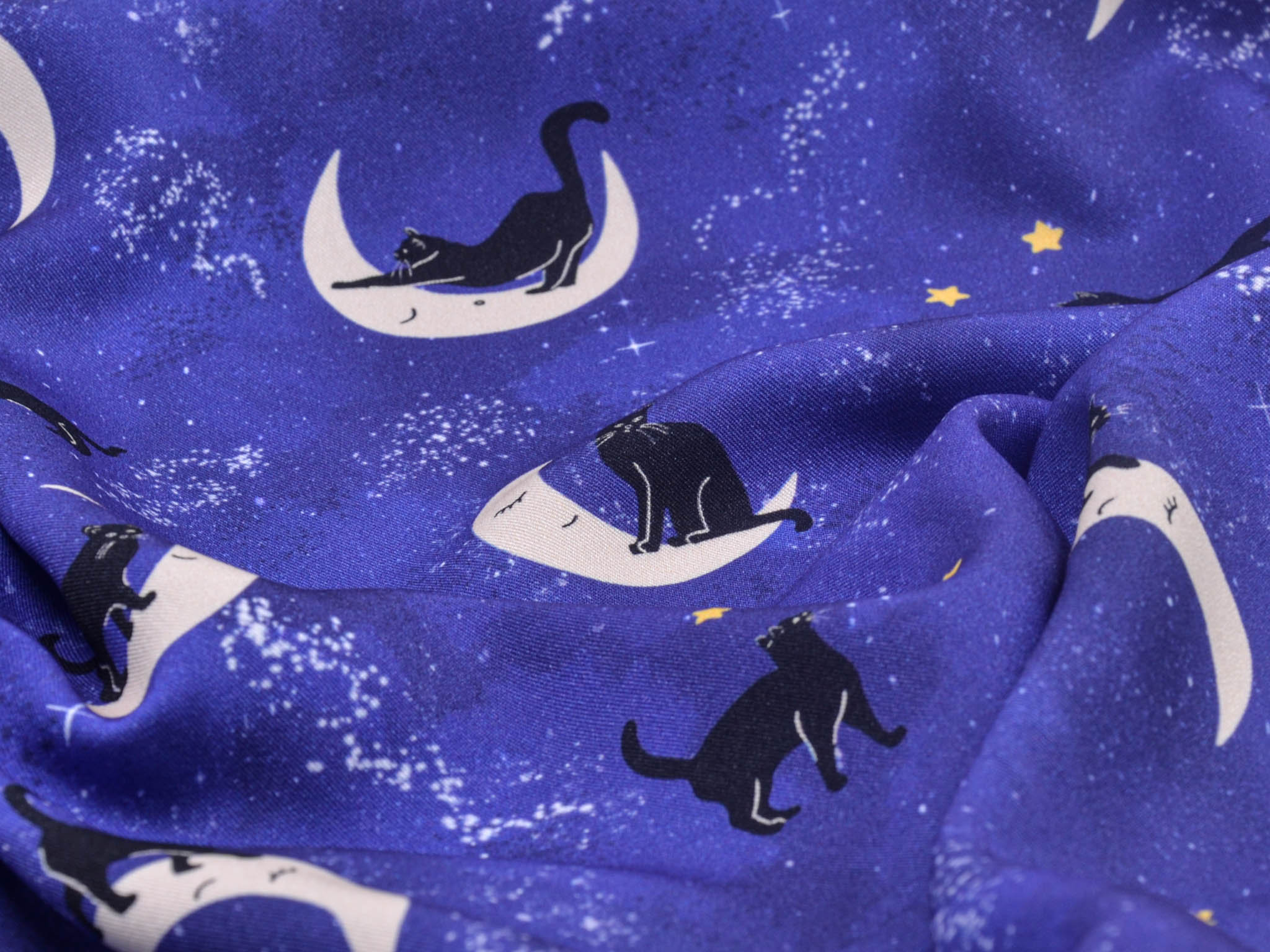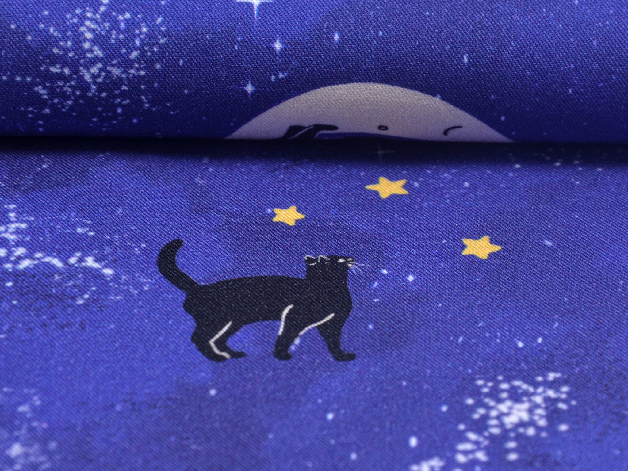 Hochwertiger Stoff aus Ecovero-Viskose. Der blaue Stoff mit Monden, Katzen und Sternen darauf, eignet sich perfekt zum Nähen von Kleidern, Röcken und vielem mehr.