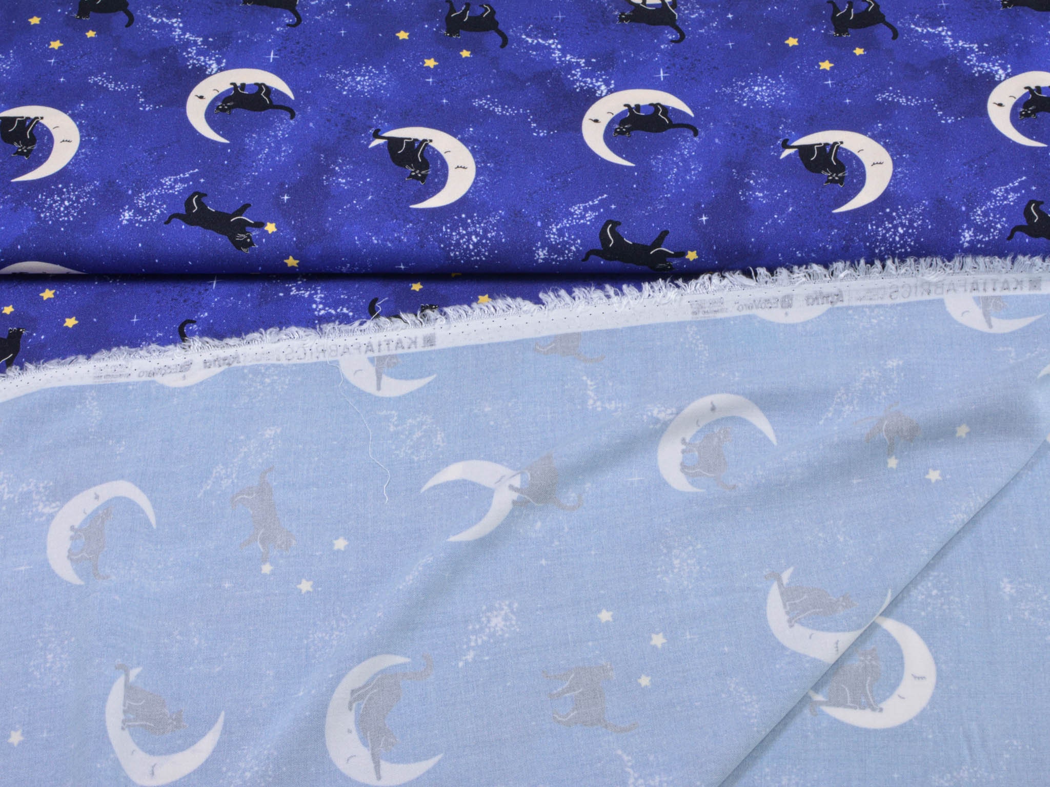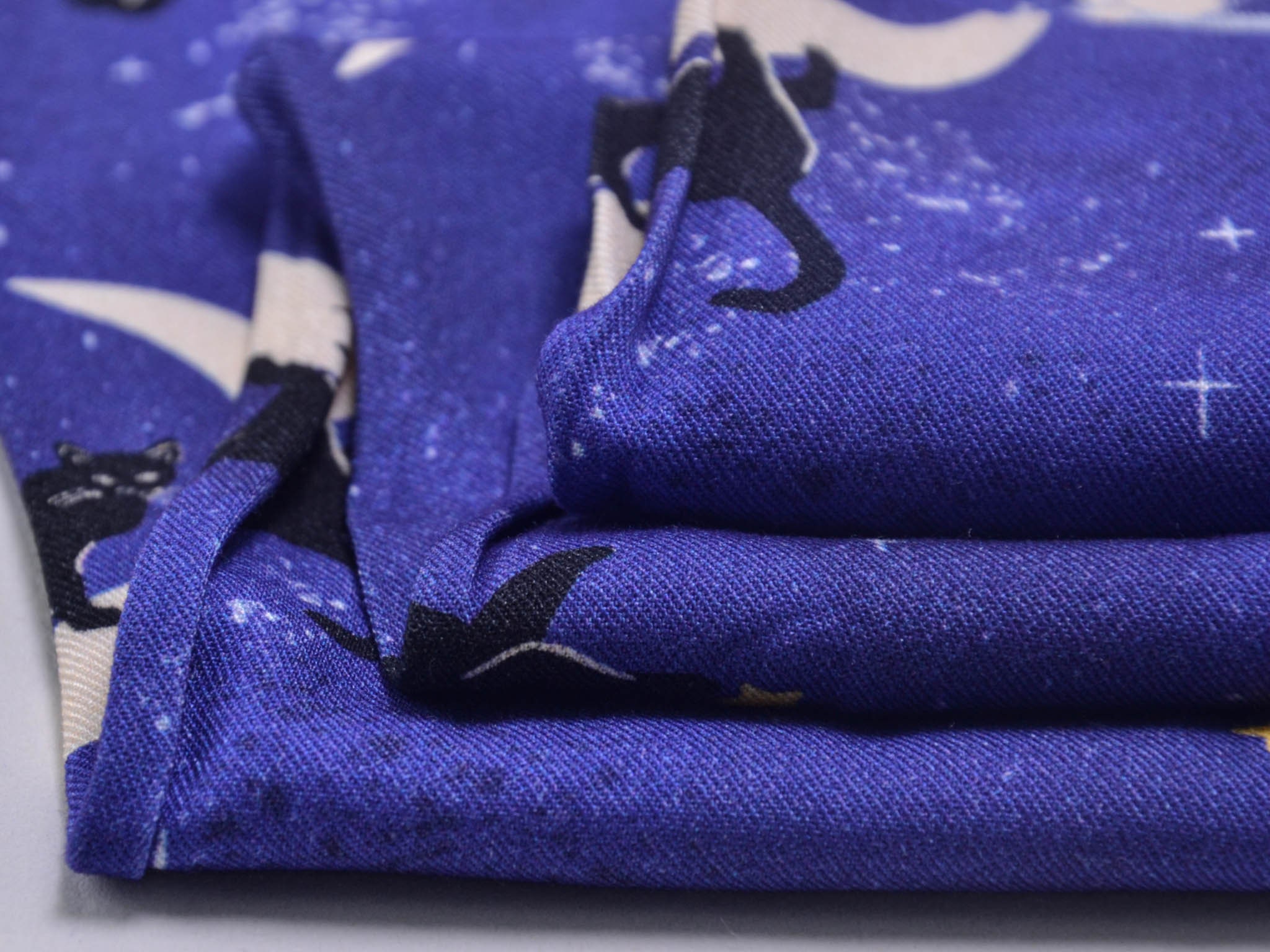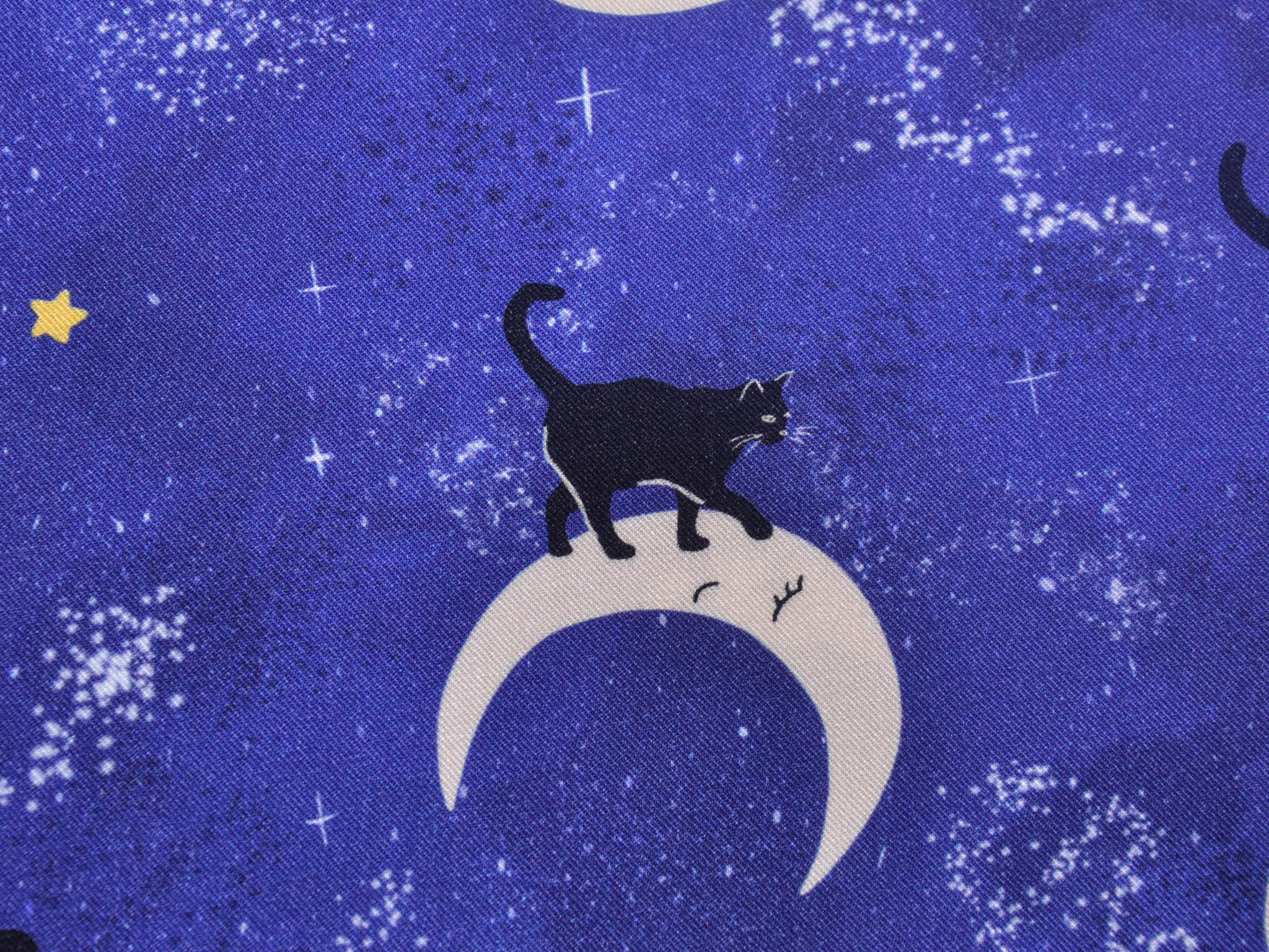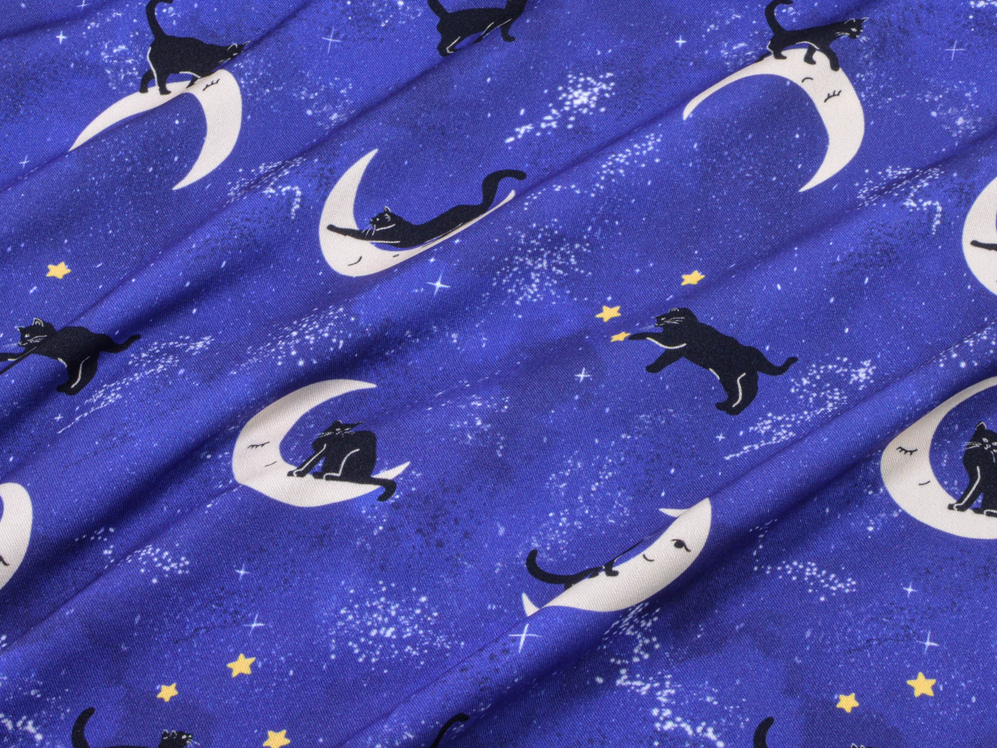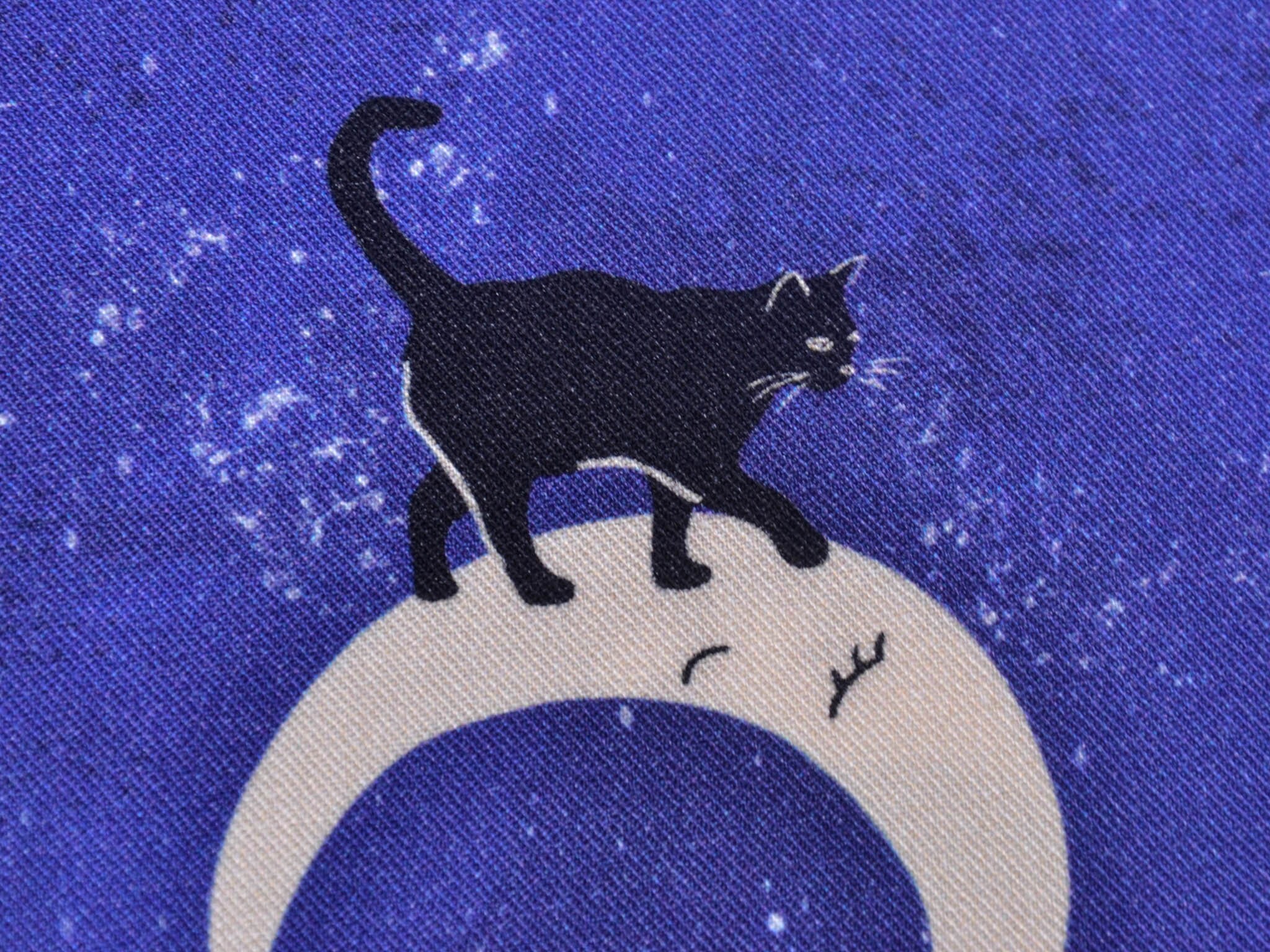 Hochwertiger Stoff aus Ecovero-Viskose. Der blaue Stoff mit Monden, Katzen und Sternen darauf, eignet sich perfekt zum Nähen von Kleidern, Röcken und vielem mehr.