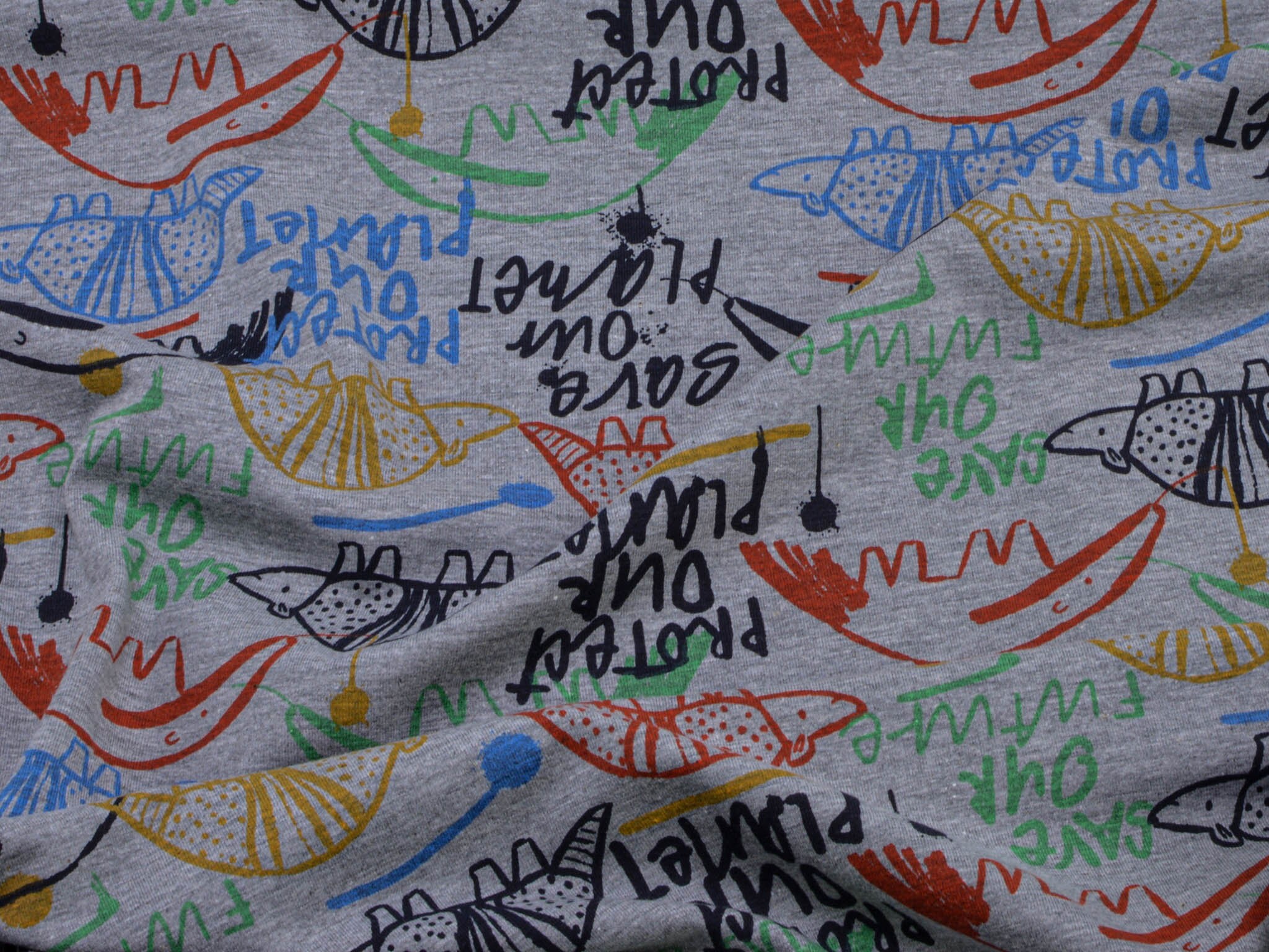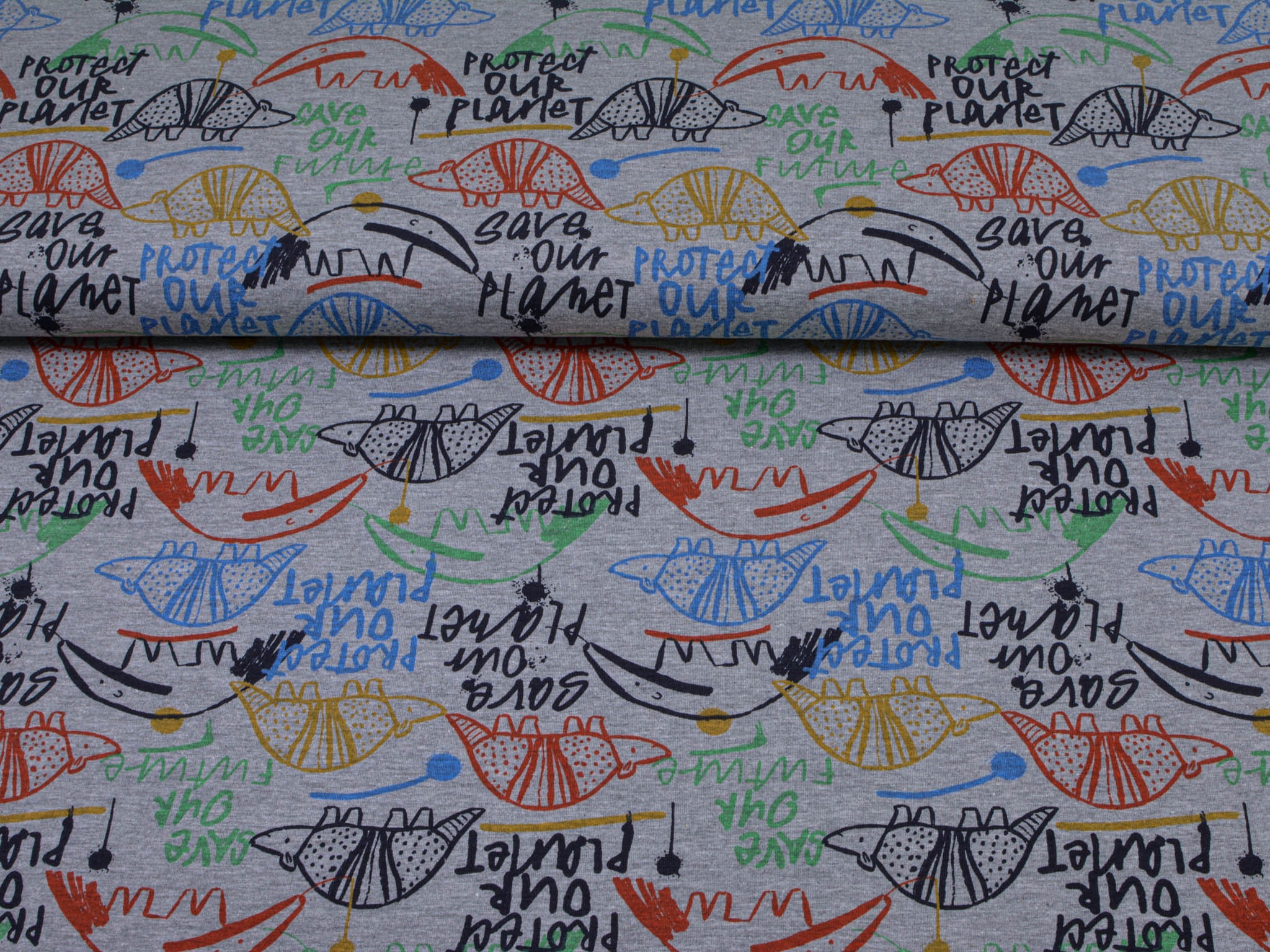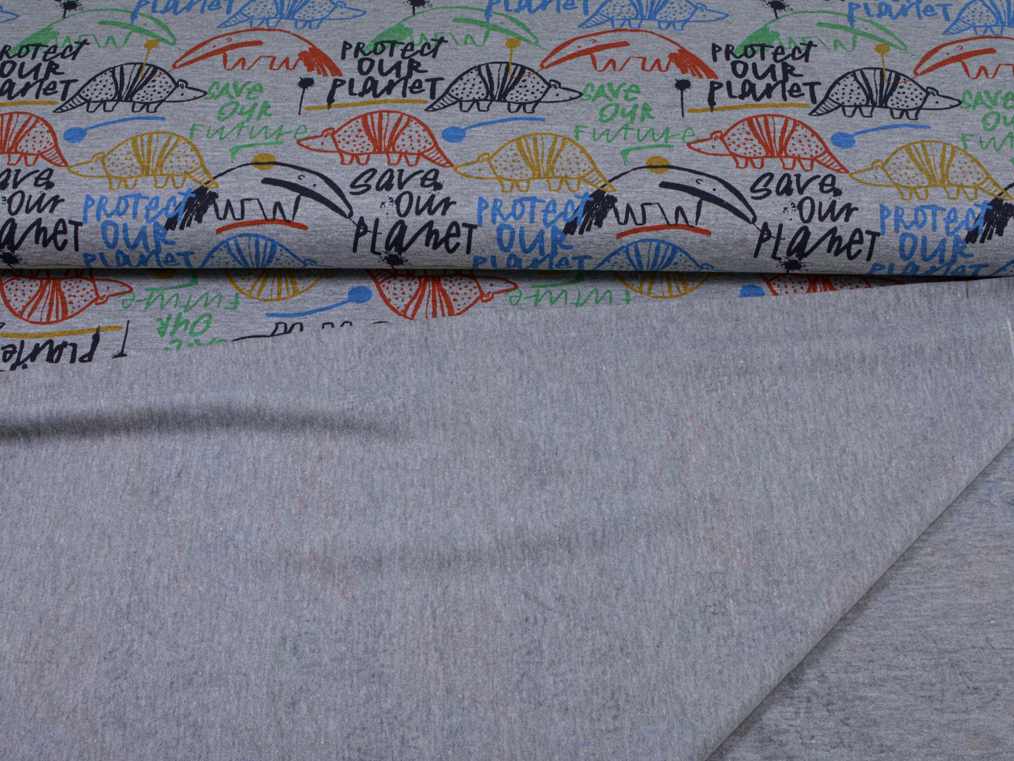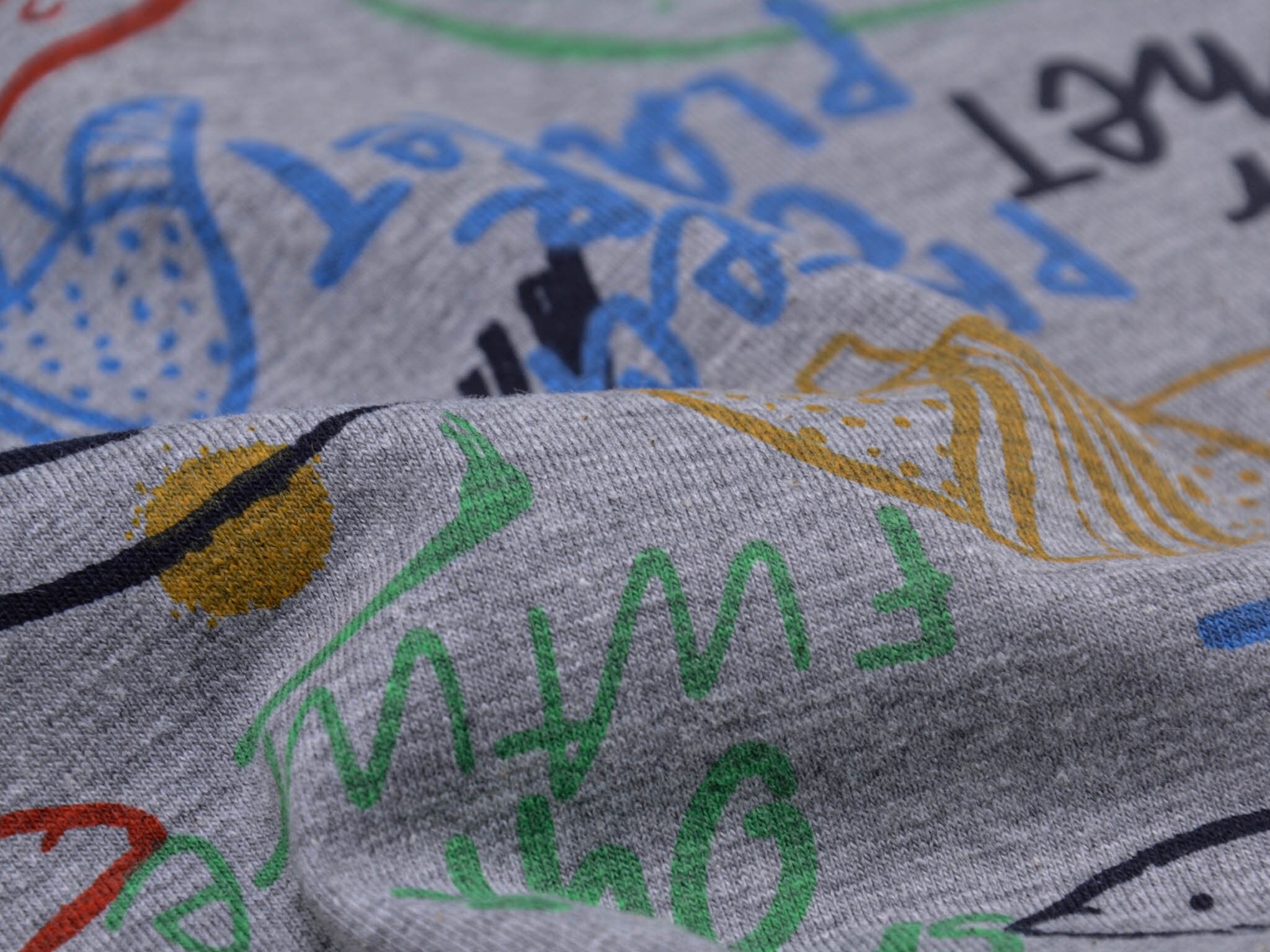Thin jersey with animals. This gray jersey, with colorful animals and colorful lettering, is perfect for sewing T-shirts, long-sleeved shirts, scarves, and much more.