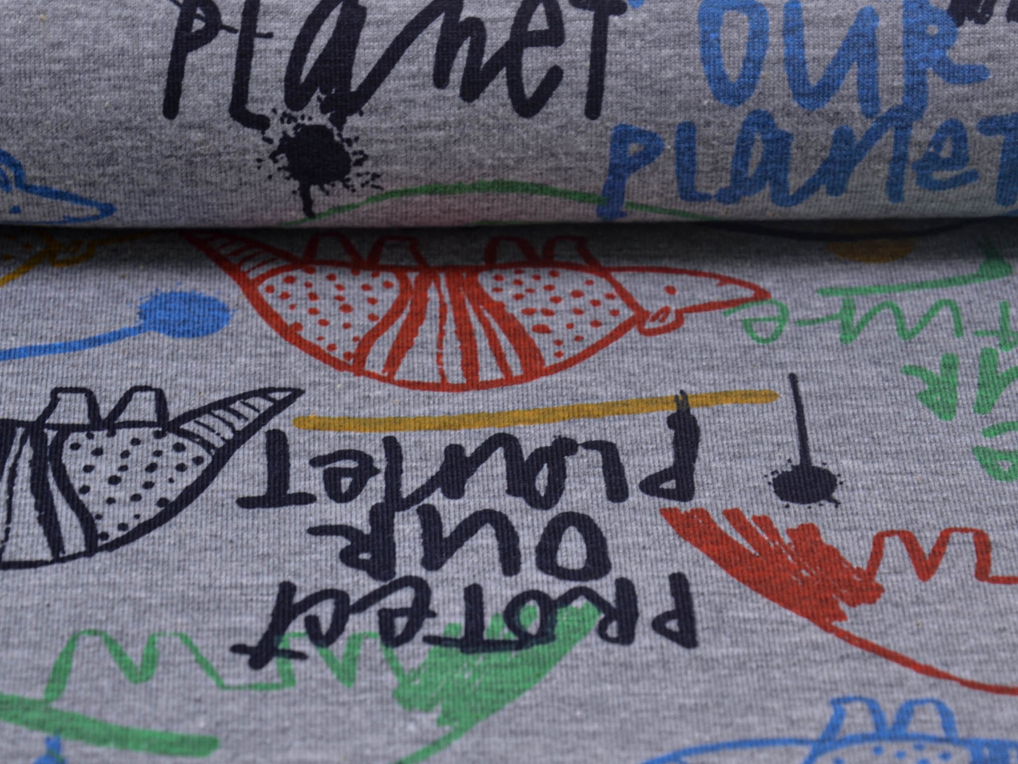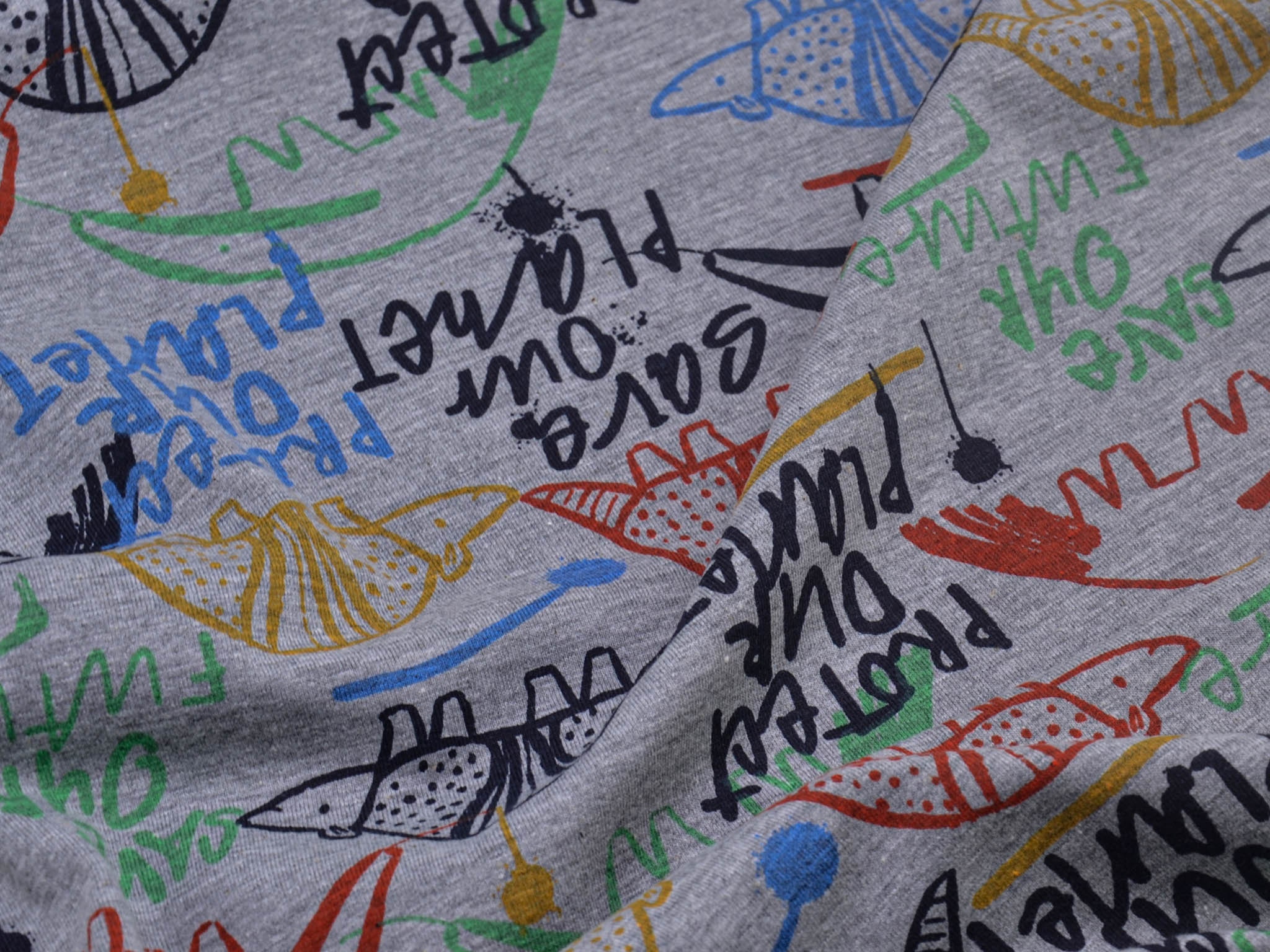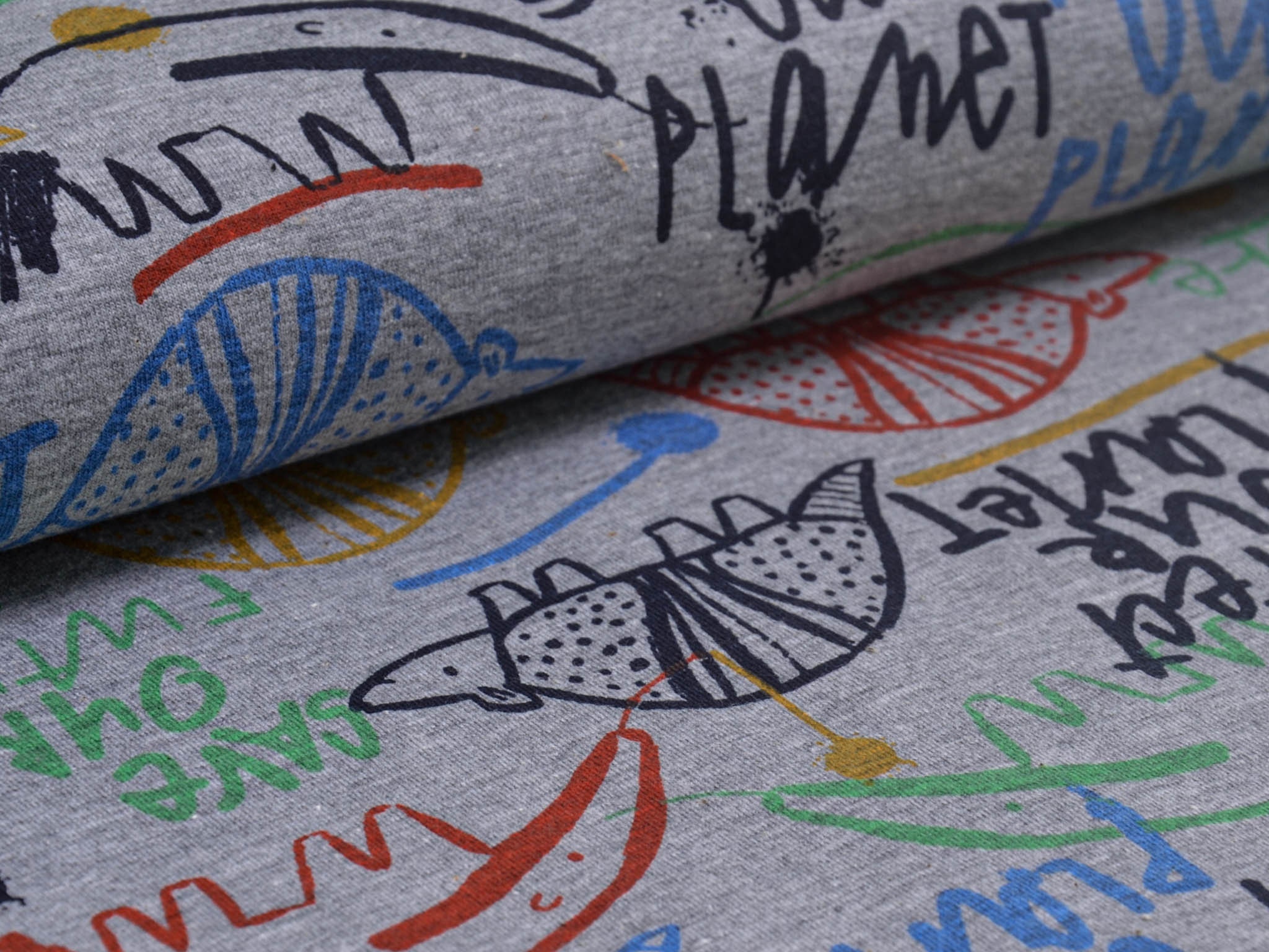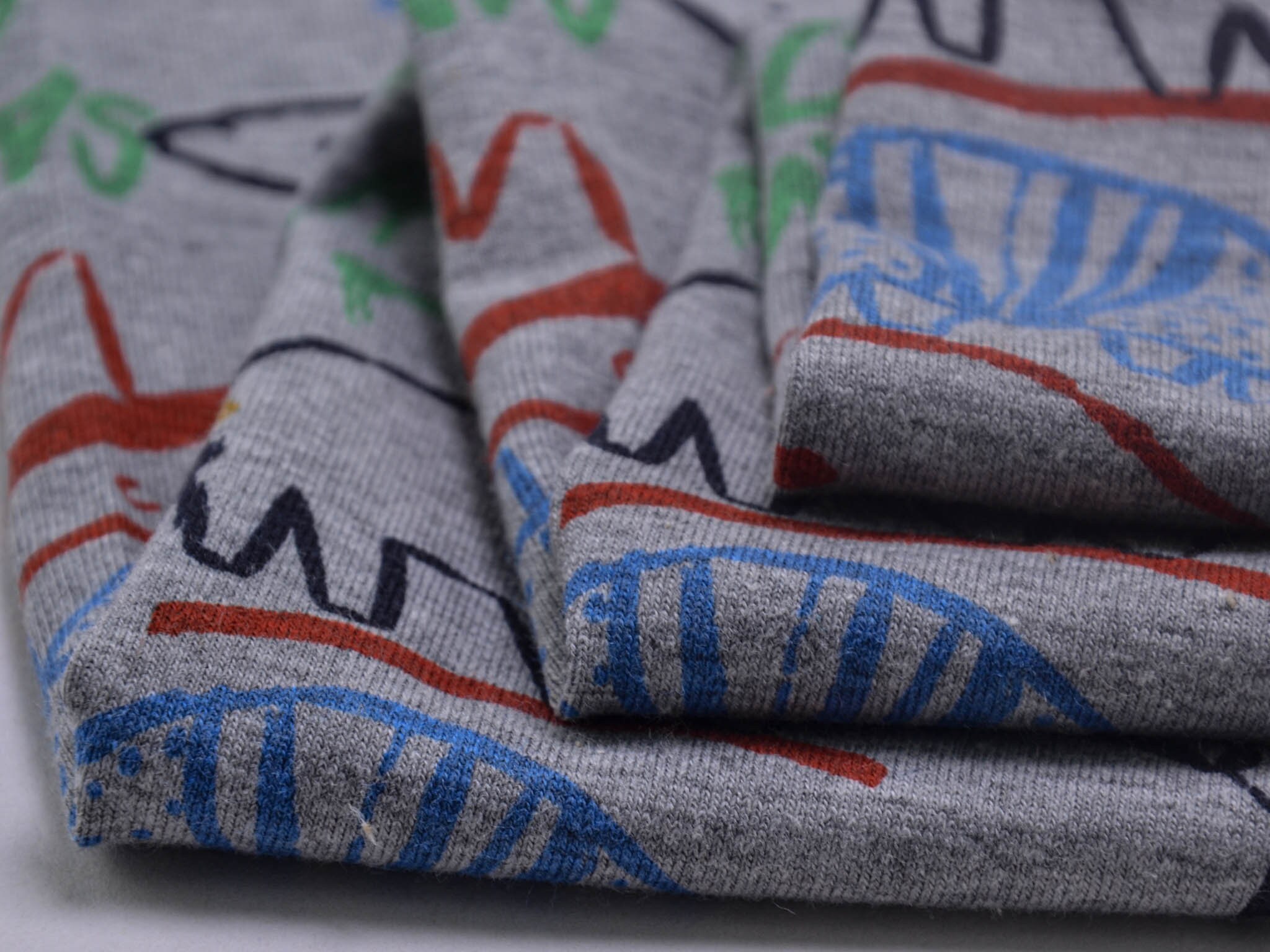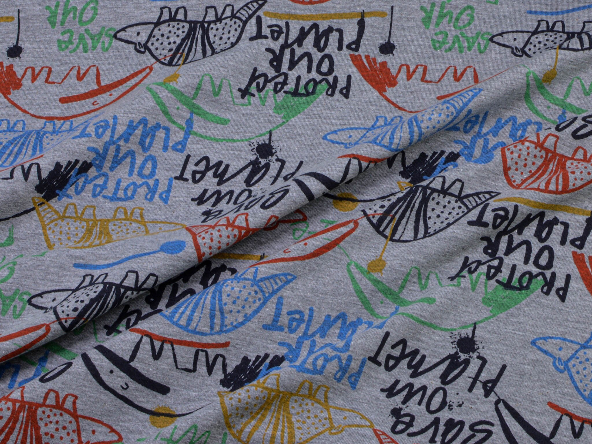 Thin jersey with animals. This gray jersey, with colorful animals and colorful lettering, is perfect for sewing T-shirts, long-sleeved shirts, scarves, and much more.
