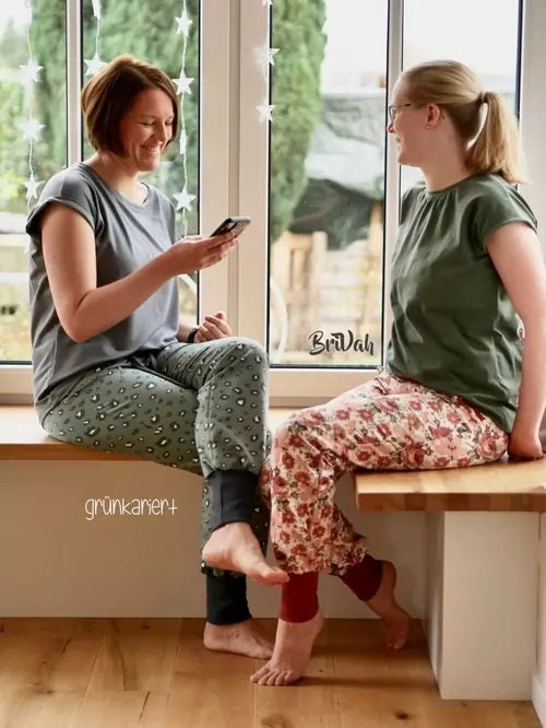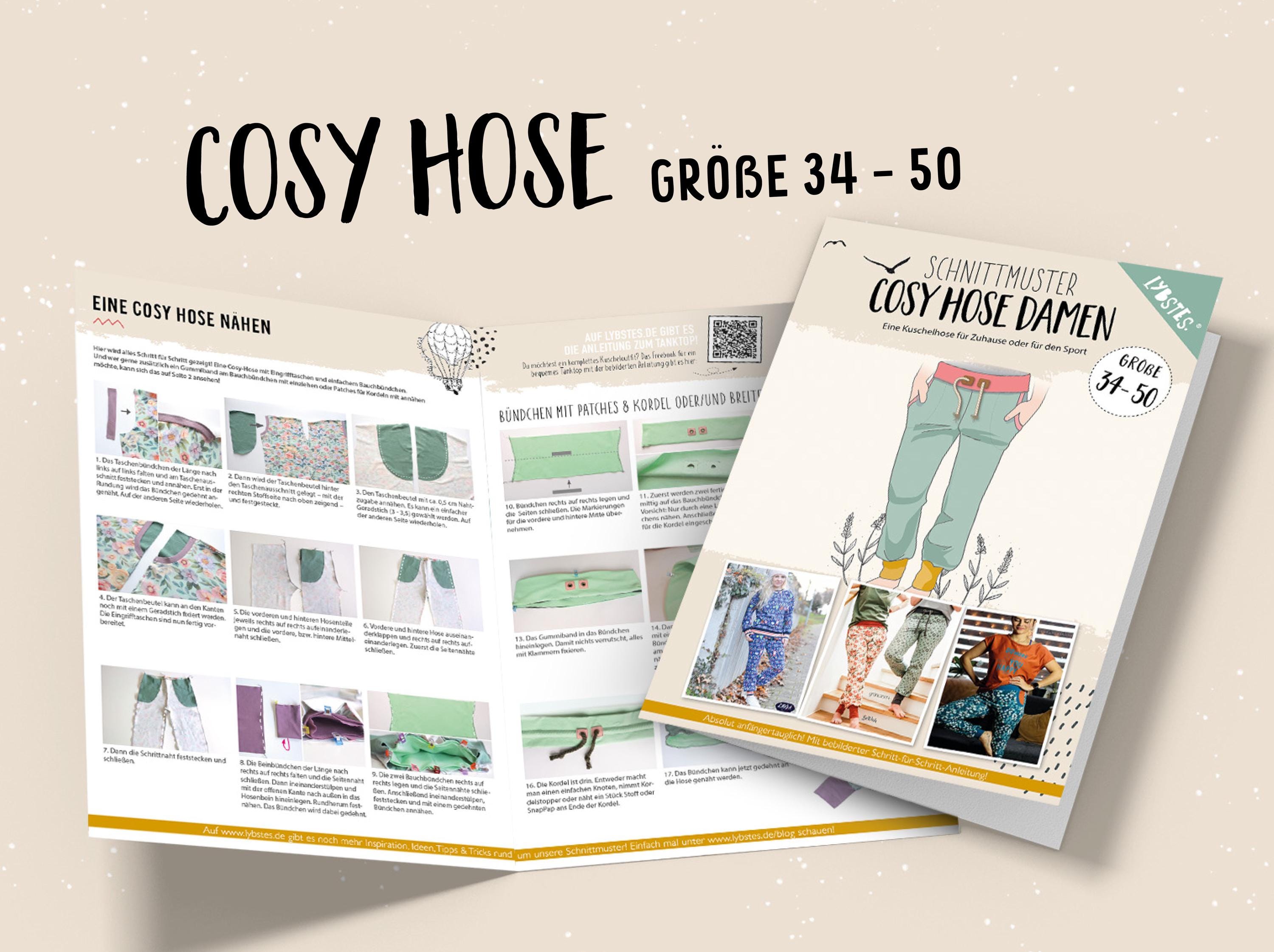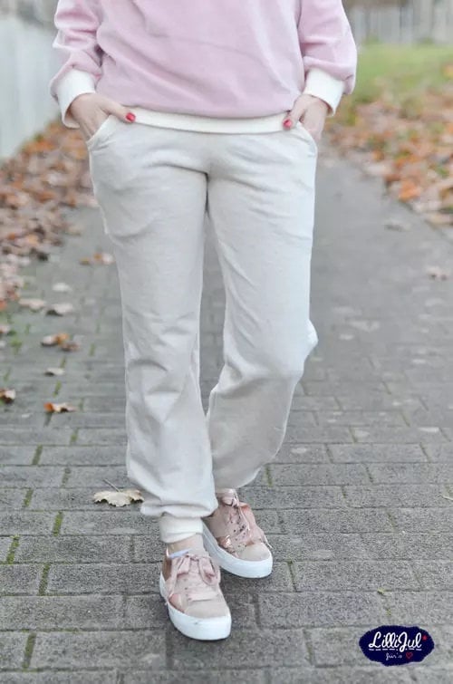 The Cosy Pants are comfortable, feel-good pants with a harem-style fit for us ladies! They have wide, comfortable cuffs, but overall, they're not too baggy! The pattern is perfect for summer sweats and jersey. Stretchy fabric is recommended. A ribbed fabric is recommended for the cuffs. A 10 cm wide elastic band can also be sewn into the cuffs.