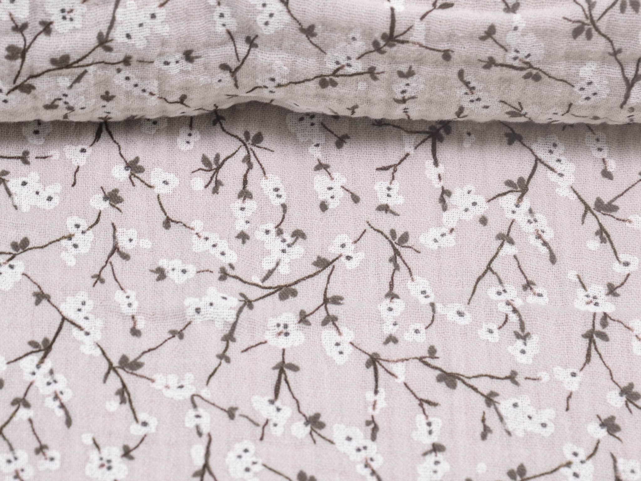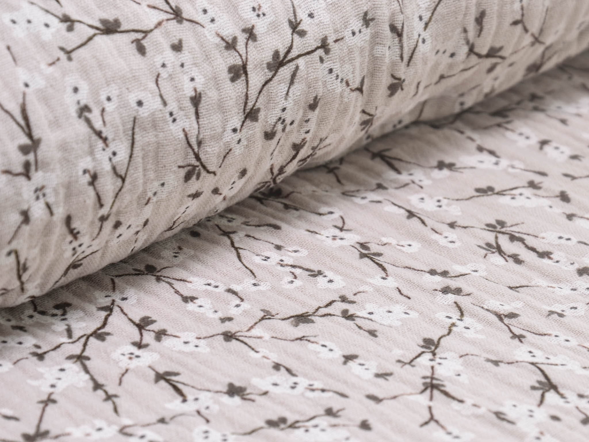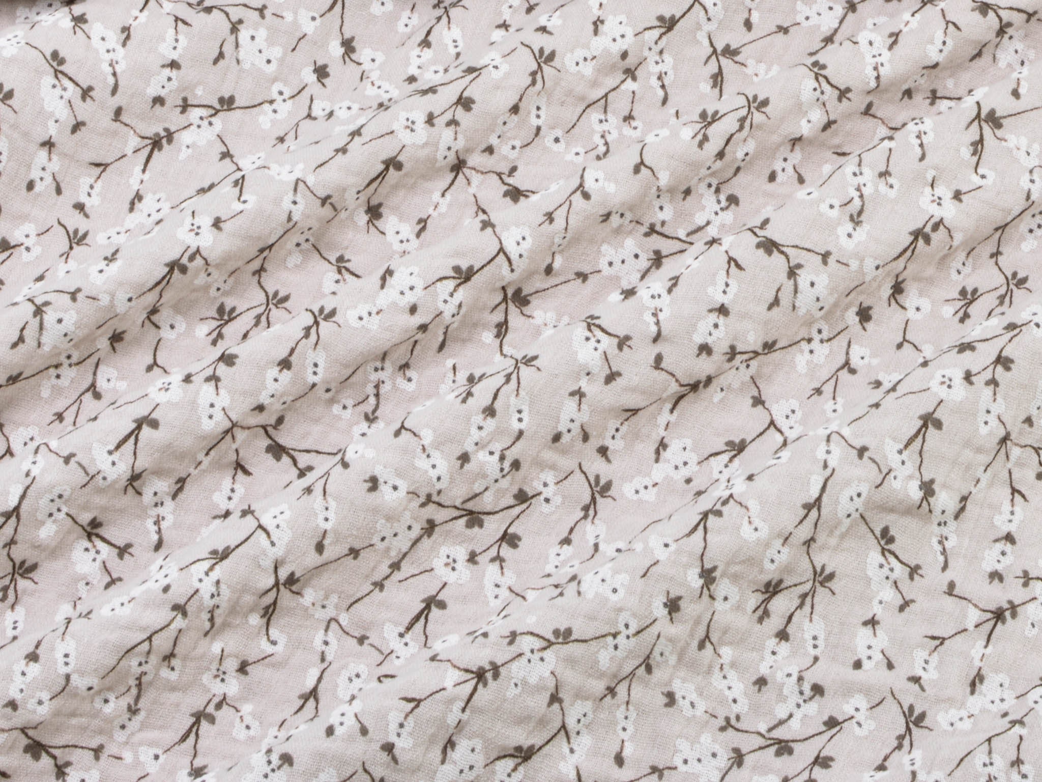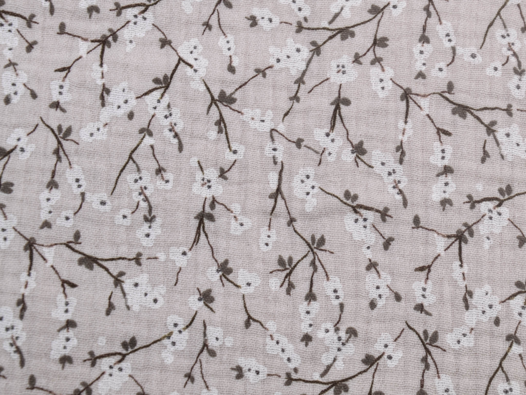Hochwertiger Musselin Stoff aus Baumwolle von Hilco. Der Stoff ist beige mit Blumen. Er eignet sich zum Nähen von Blusen, Kleidern, Röcken, Hosen, Decken, Kissen und so vielem mehr.