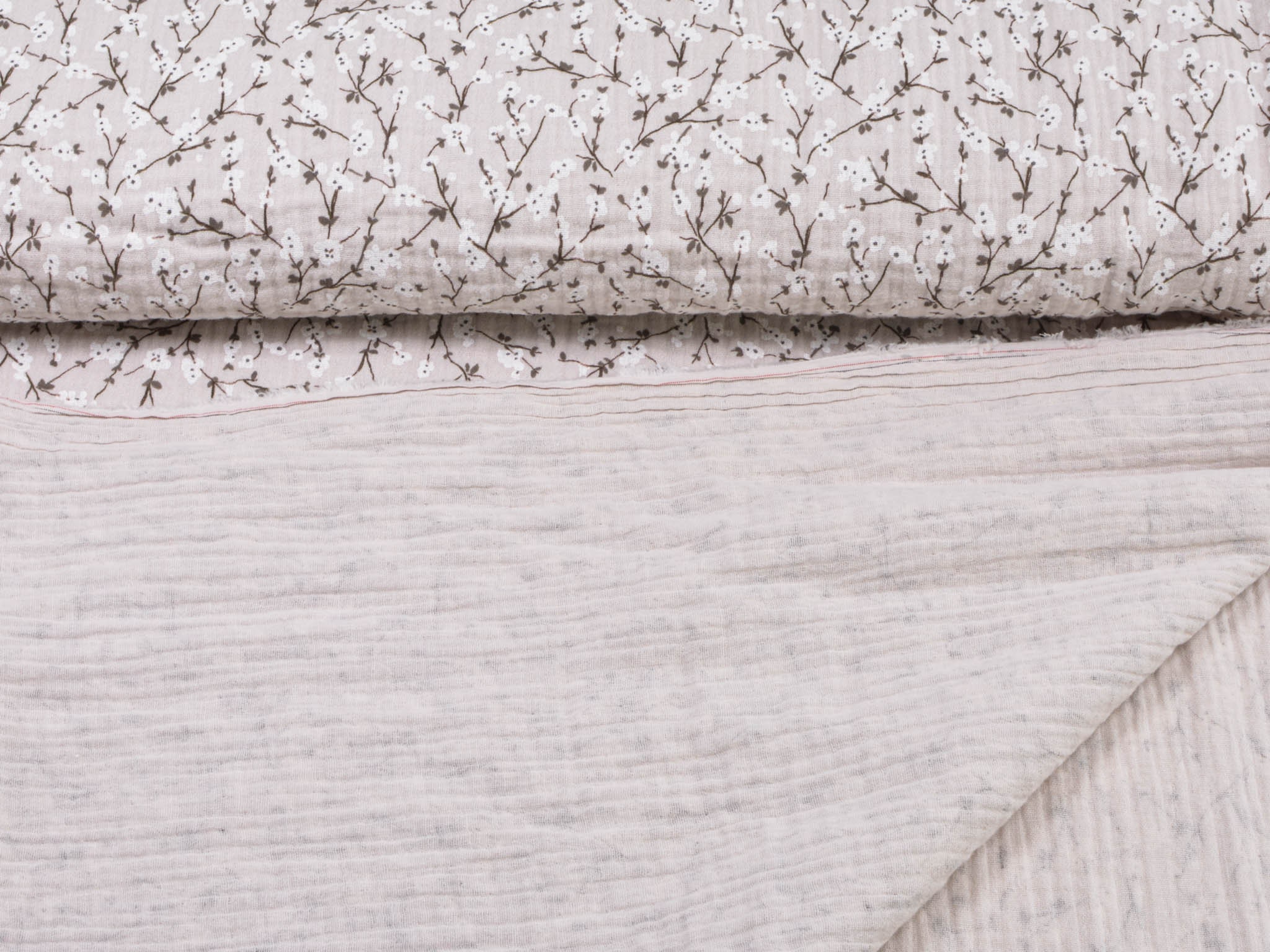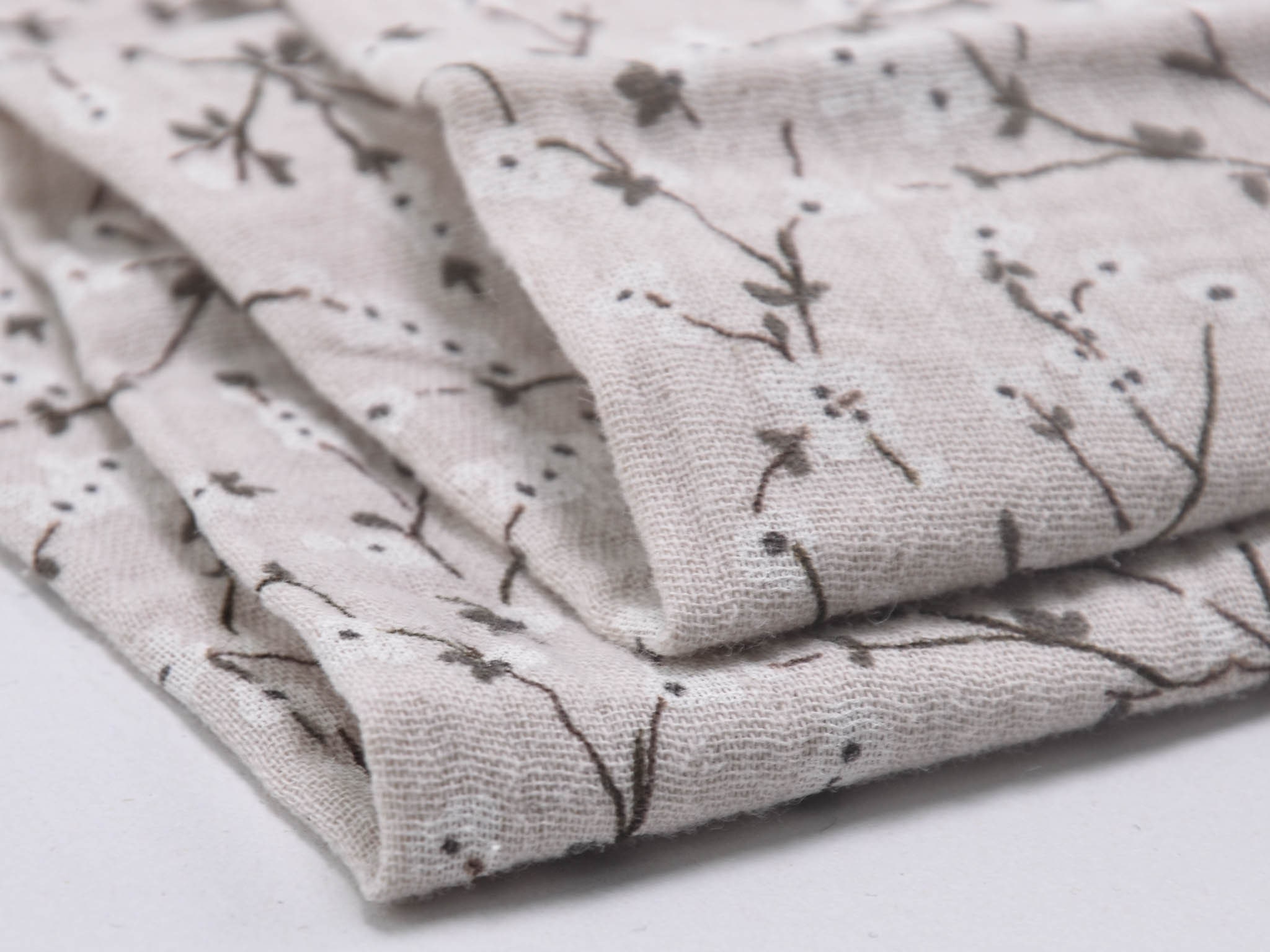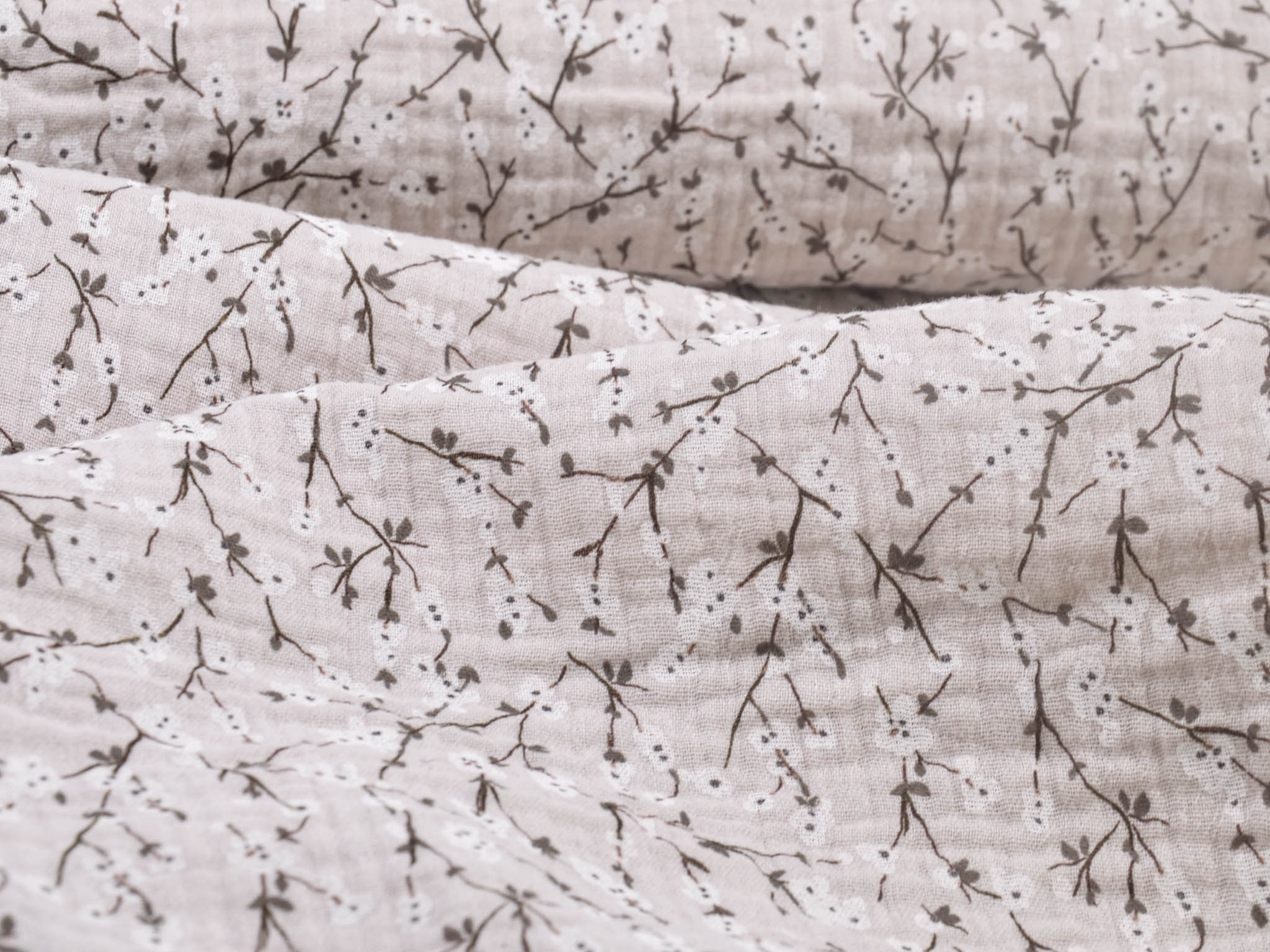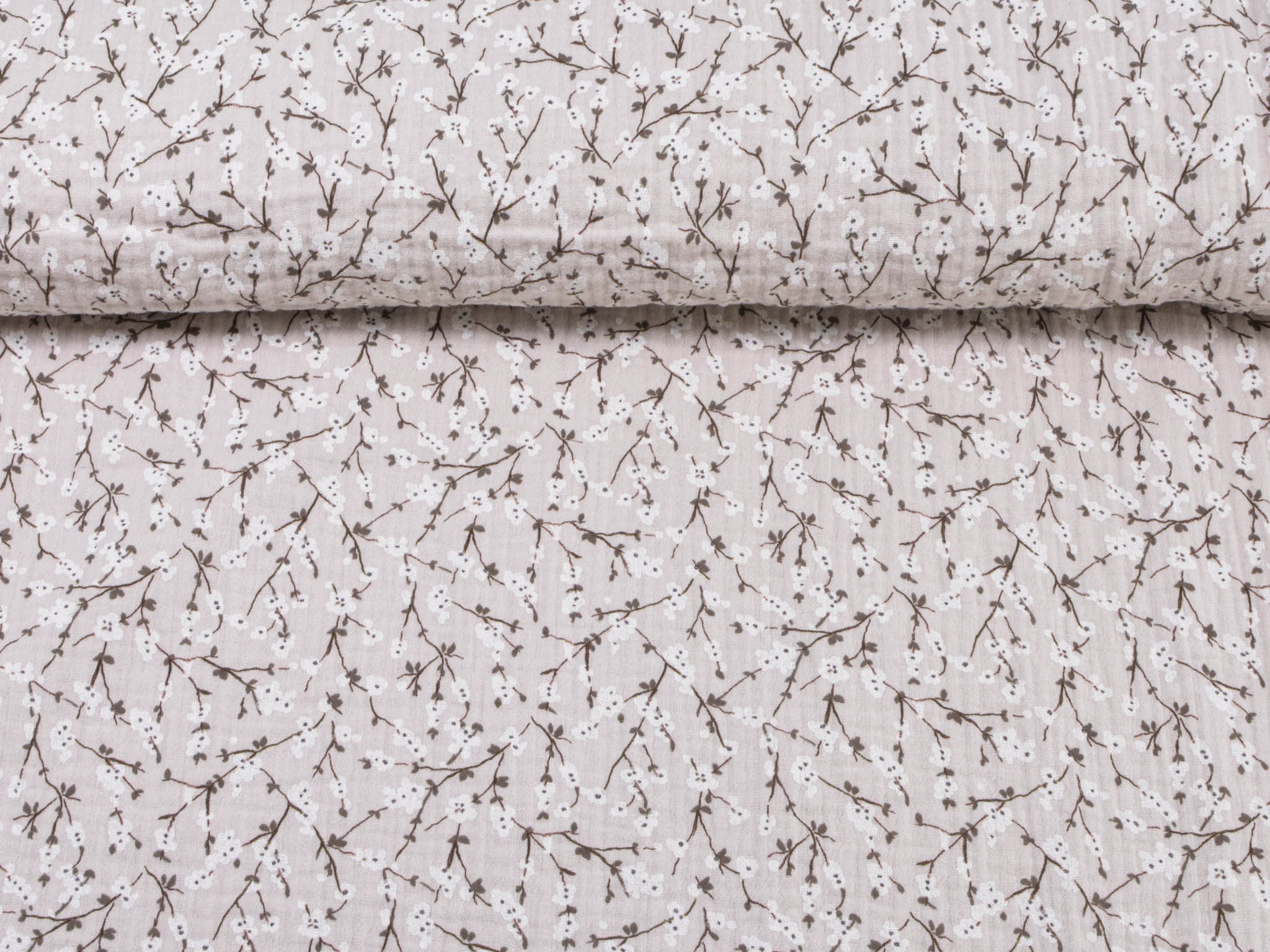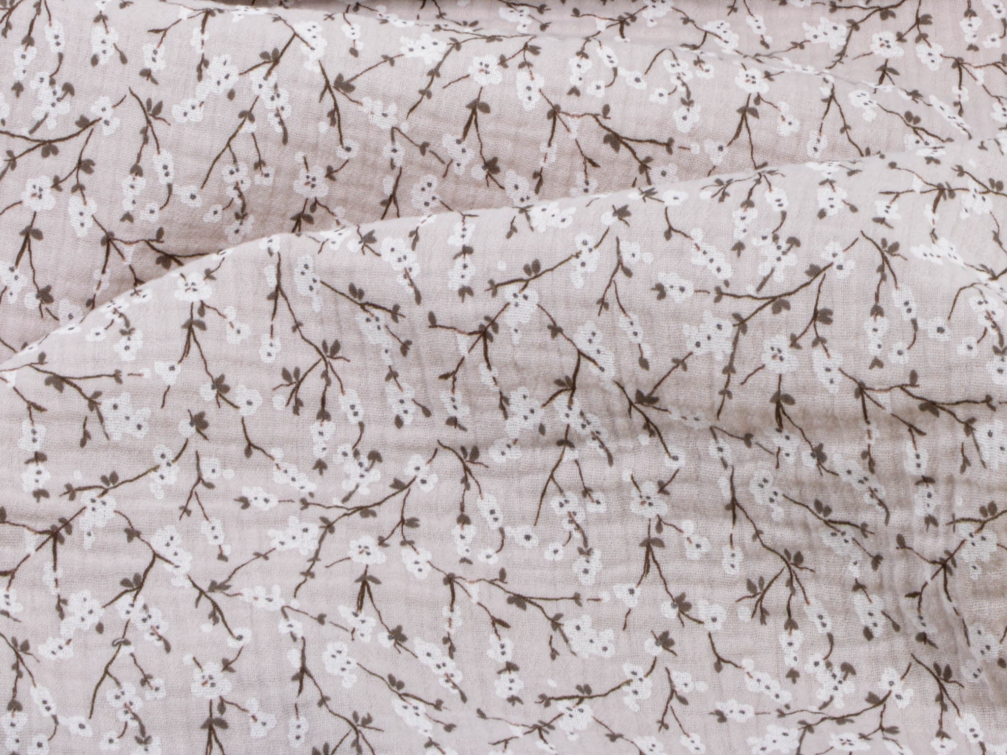 Hochwertiger Musselin Stoff aus Baumwolle von Hilco. Der Stoff ist beige mit Blumen. Er eignet sich zum Nähen von Blusen, Kleidern, Röcken, Hosen, Decken, Kissen und so vielem mehr.