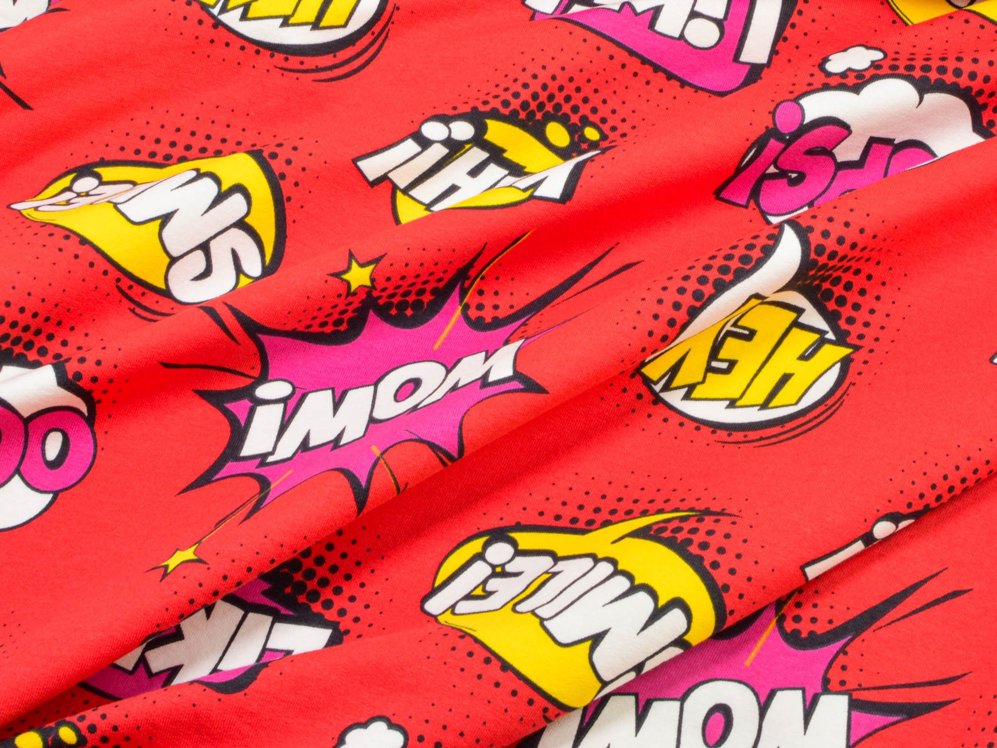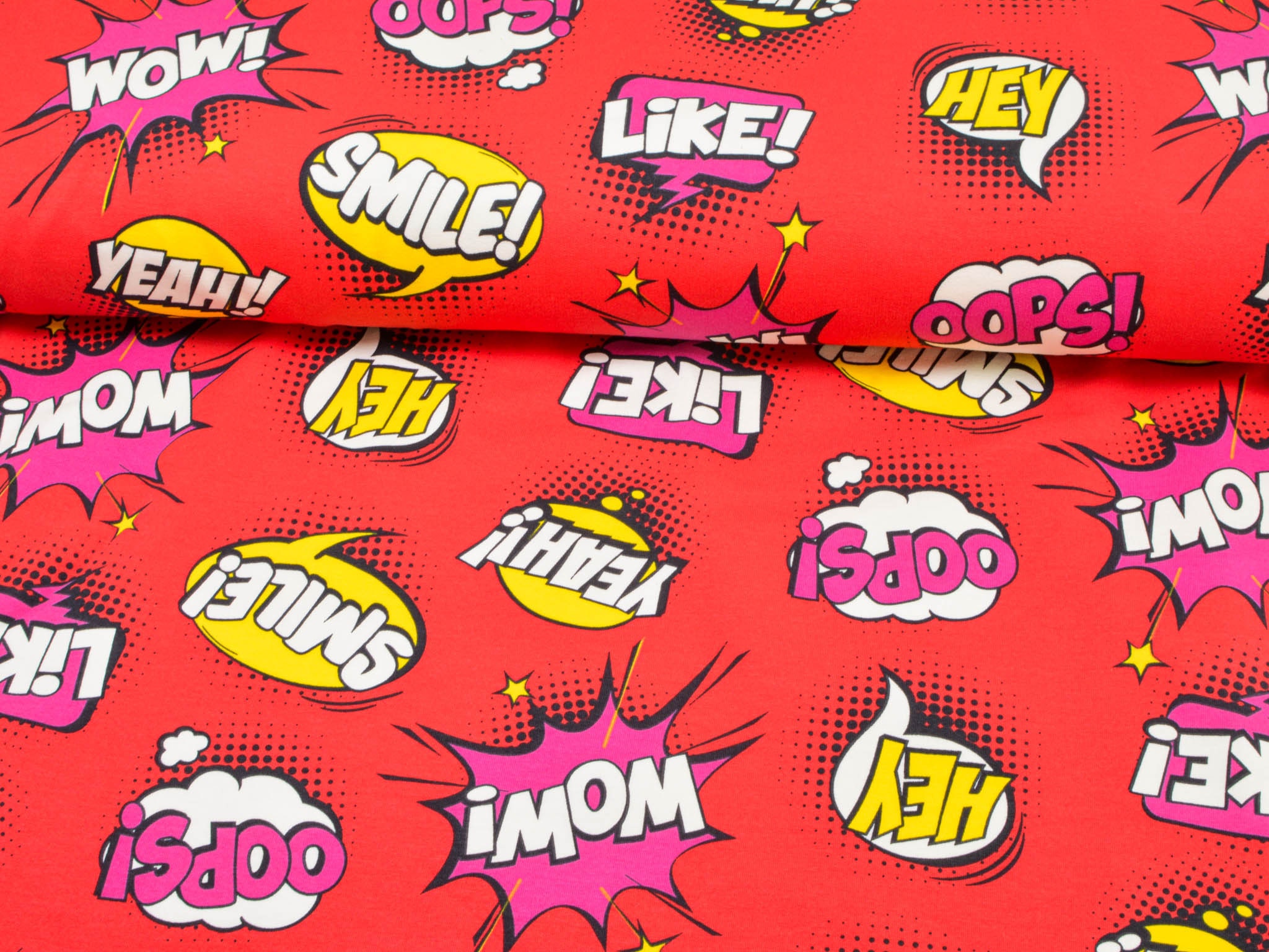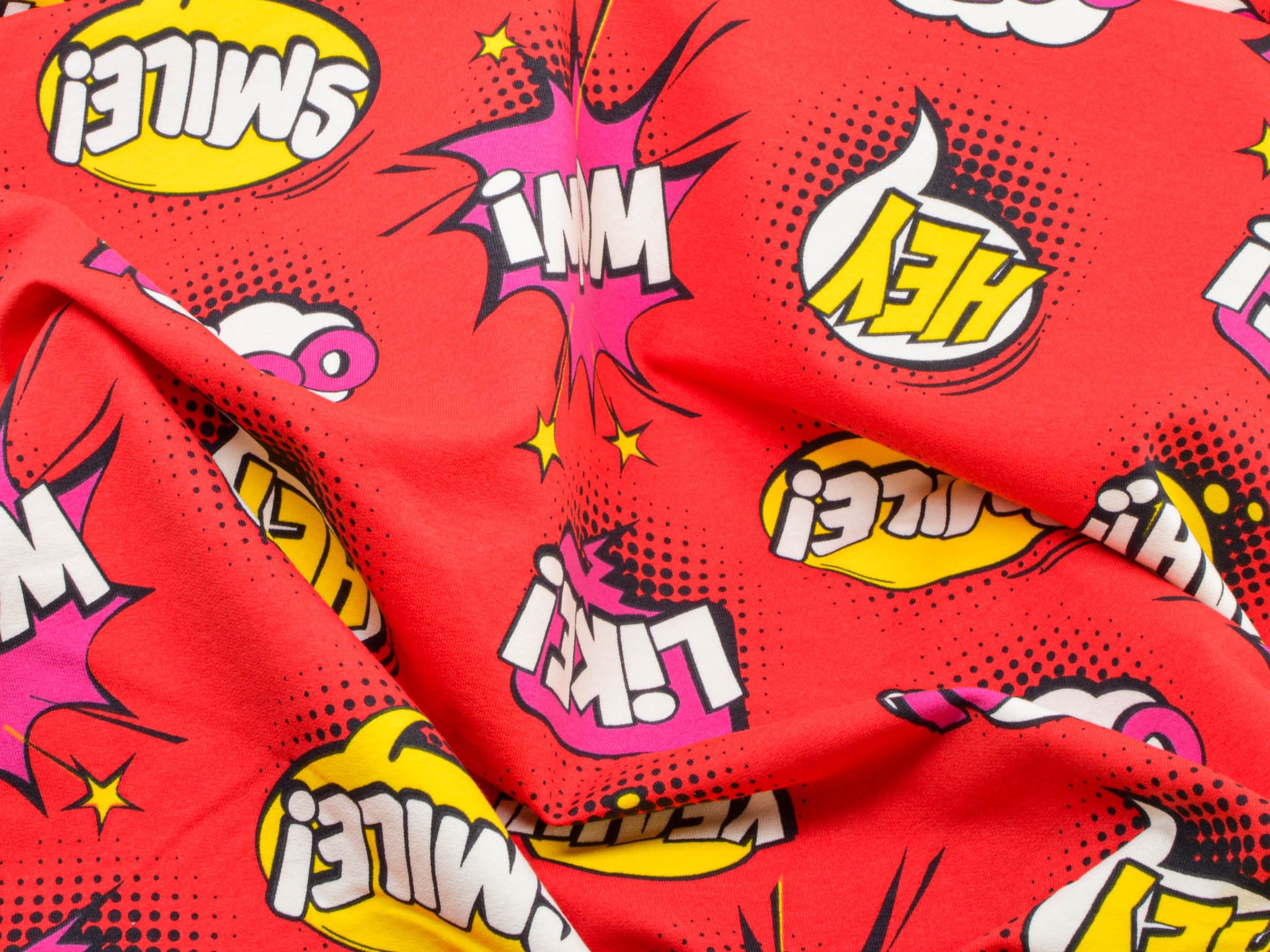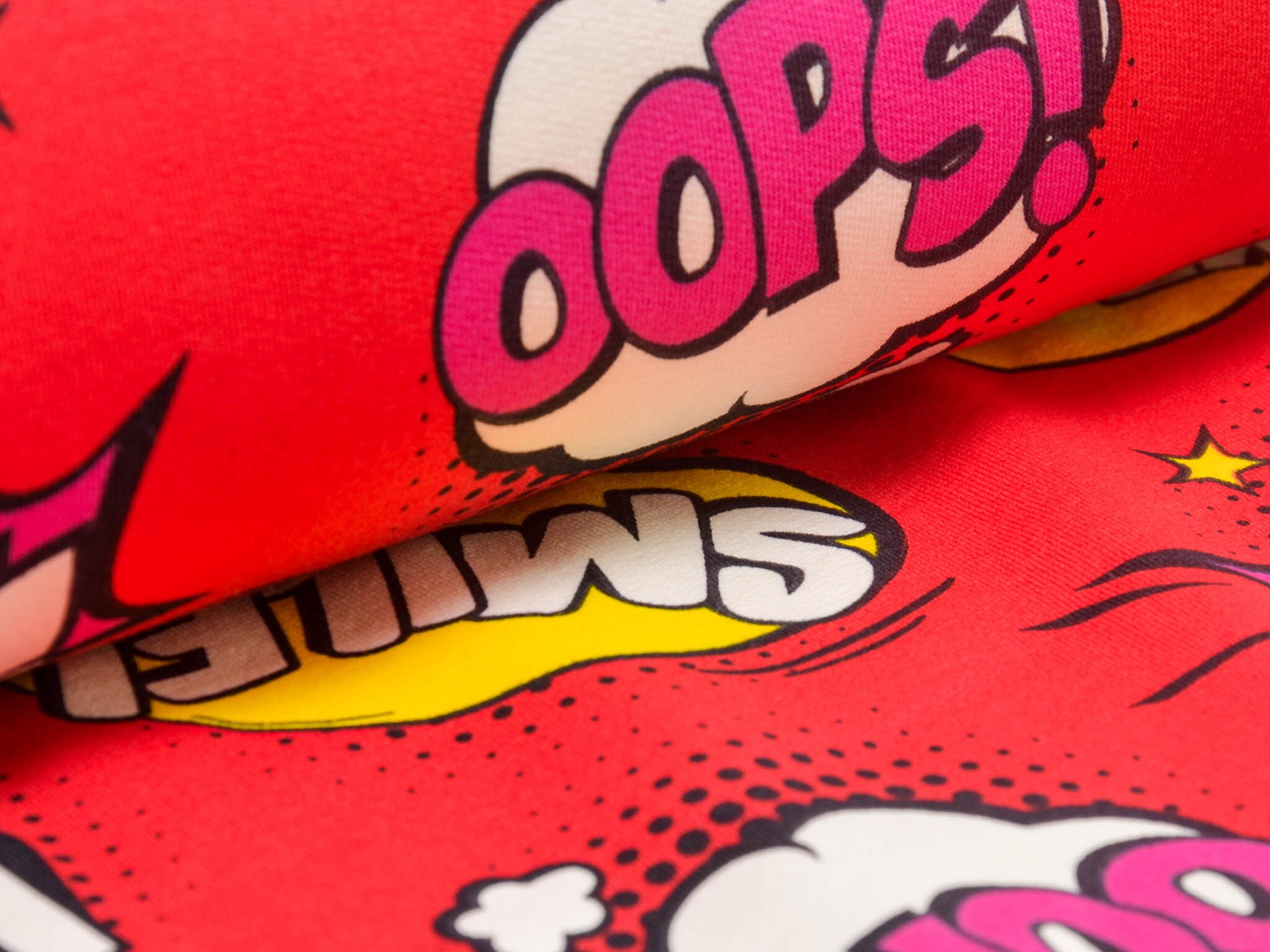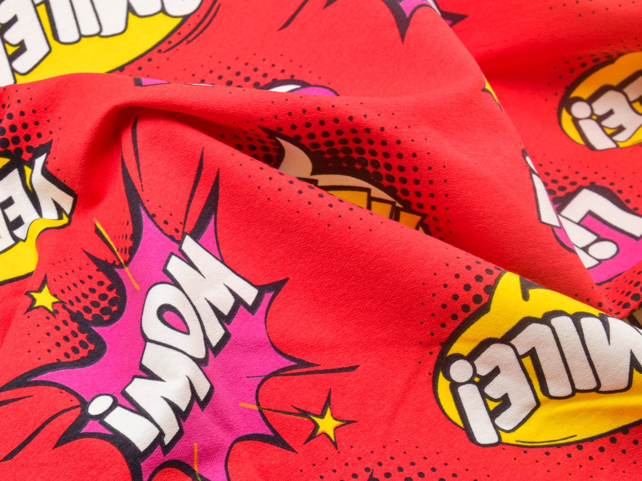Roter Sweatstoff aus Baumwolle mit Comic Muster. Wunderbar für Jogginghose, Pullover, Sweatshirts und vieles mehr.