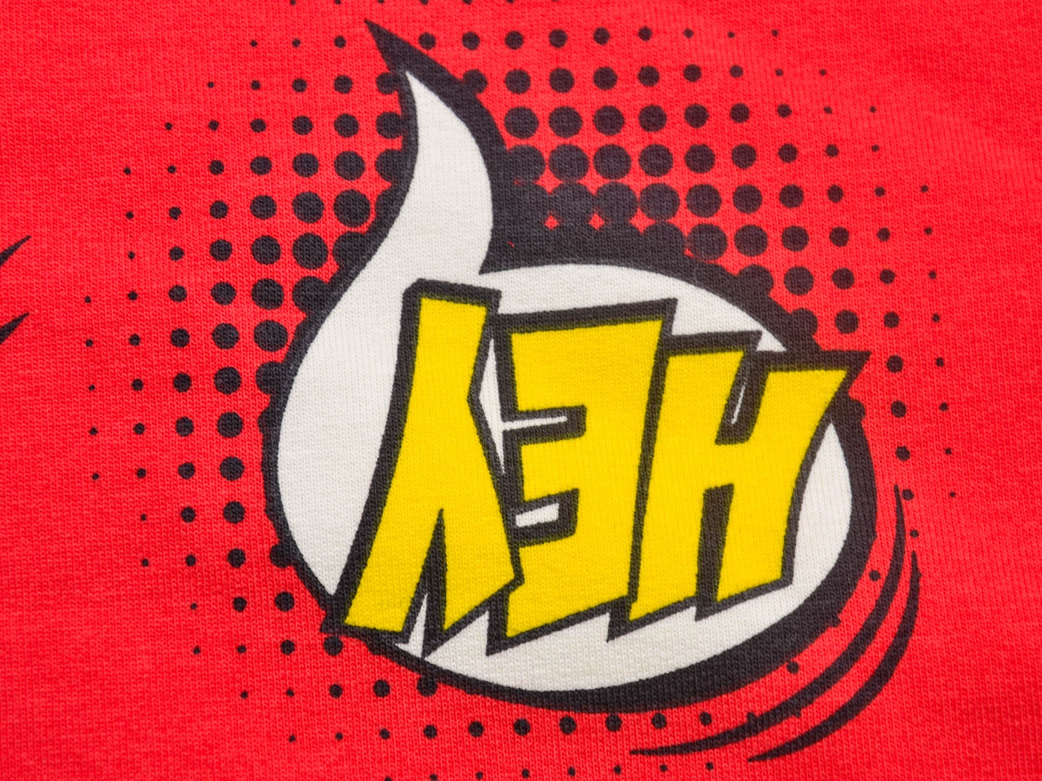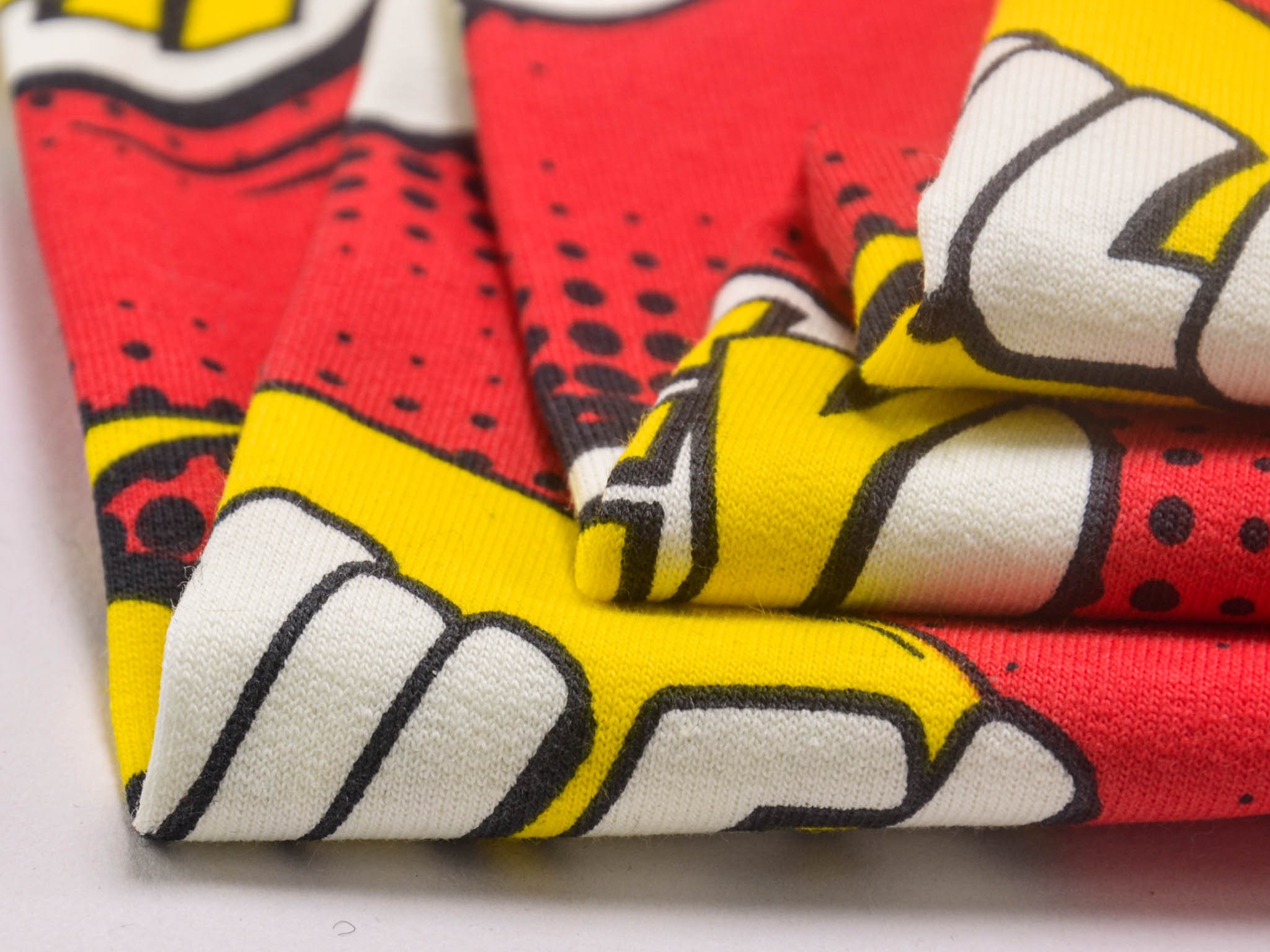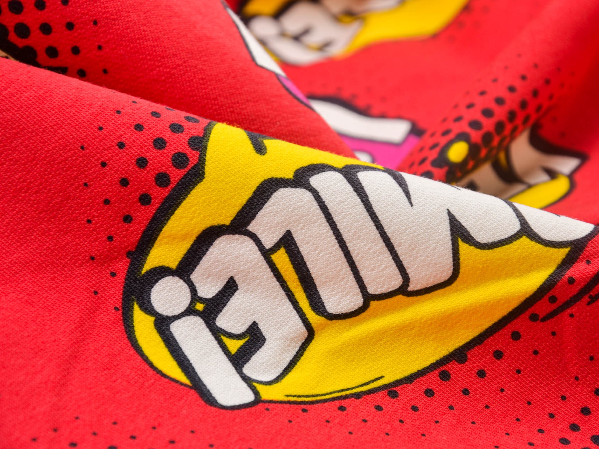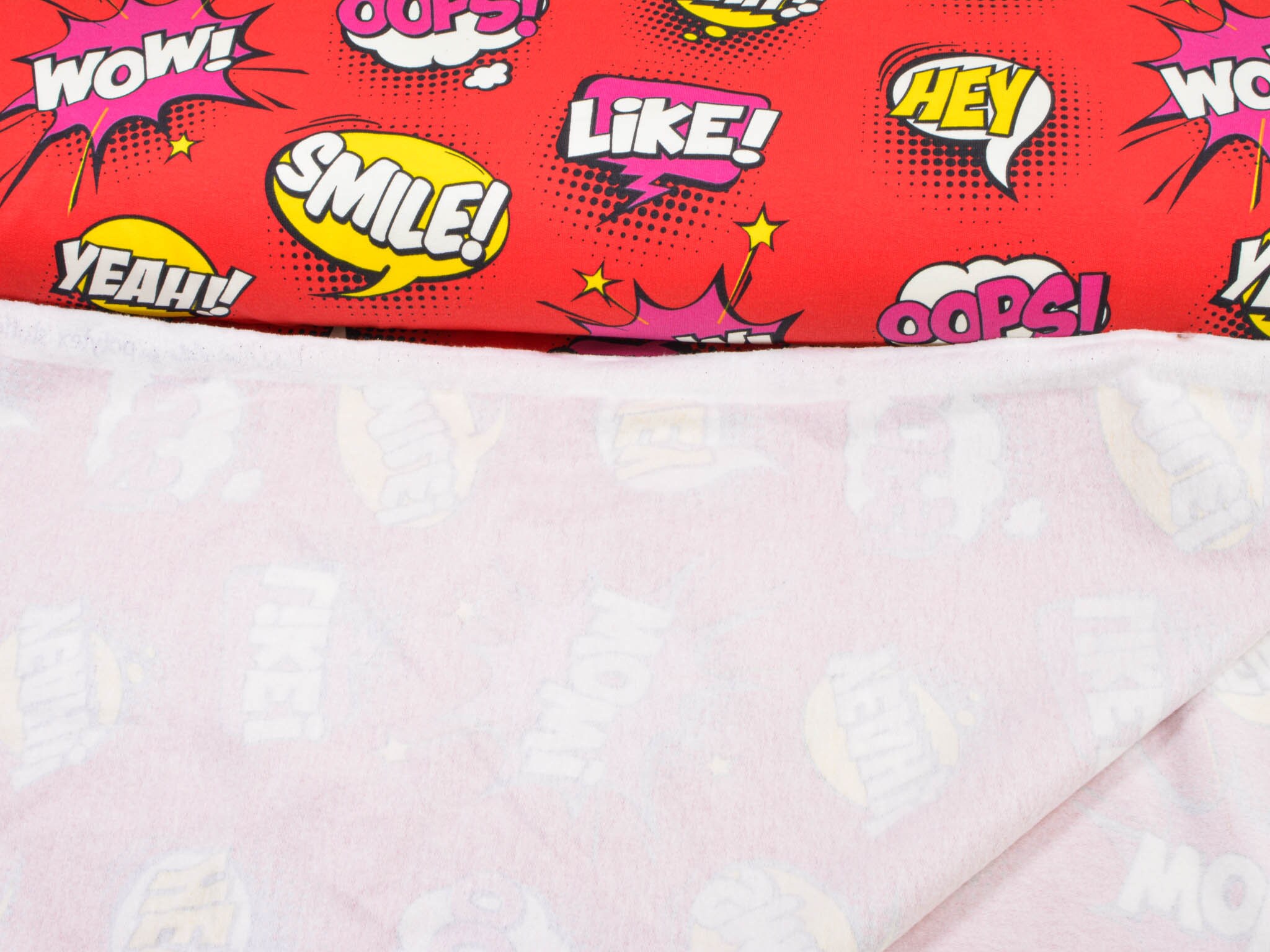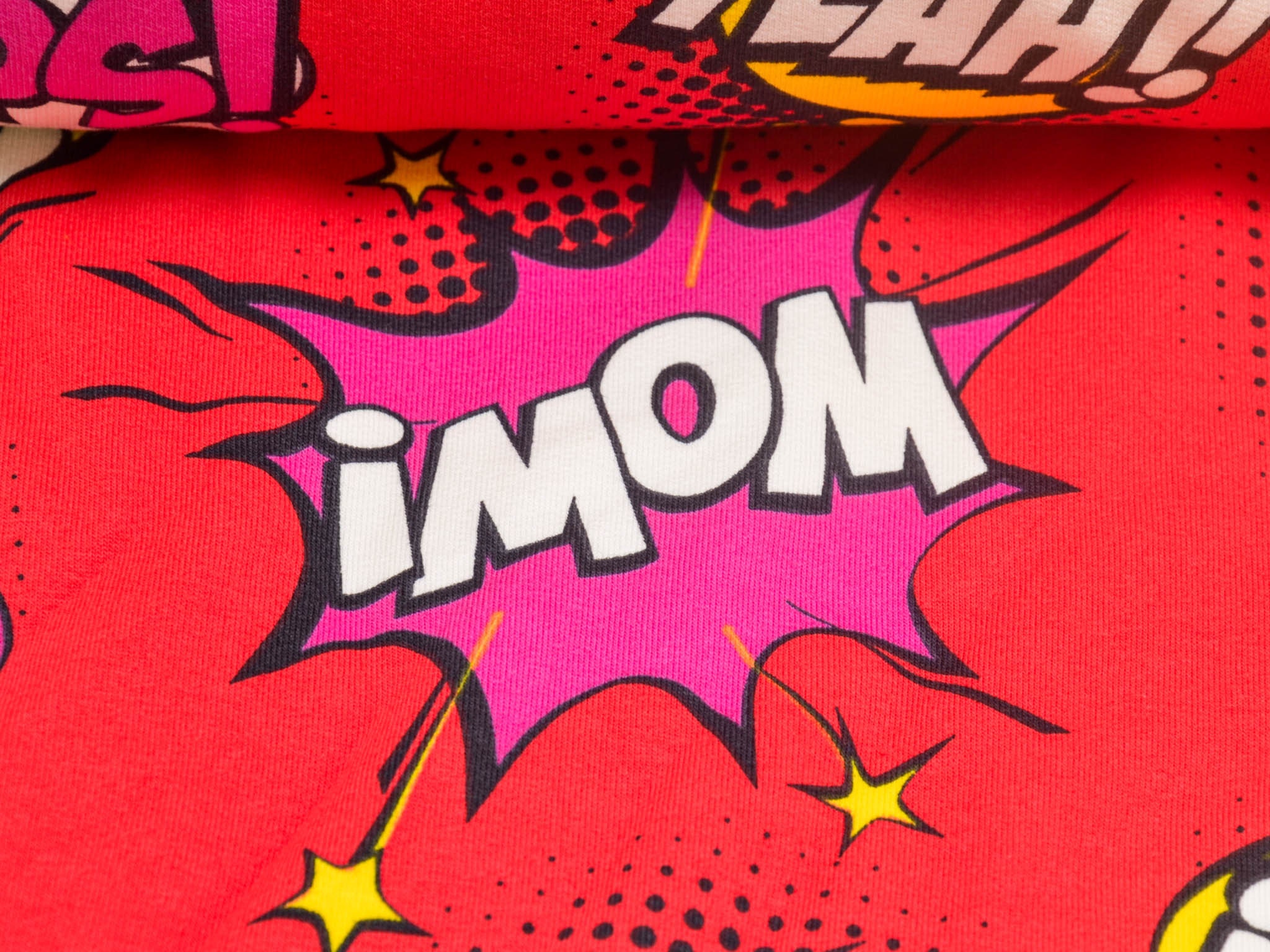 Roter Sweatstoff aus Baumwolle mit Comic Muster. Wunderbar für Jogginghose, Pullover, Sweatshirts und vieles mehr.