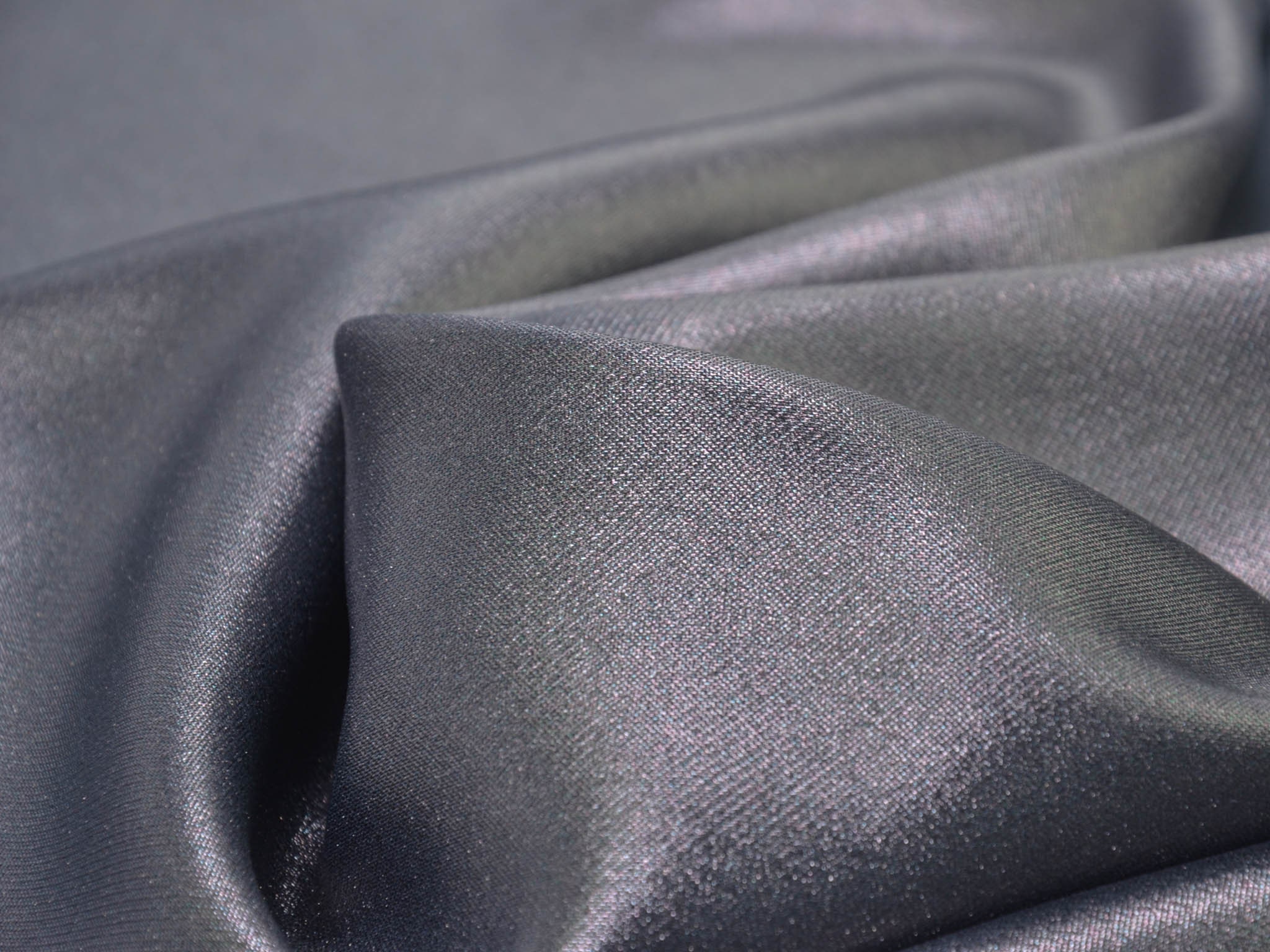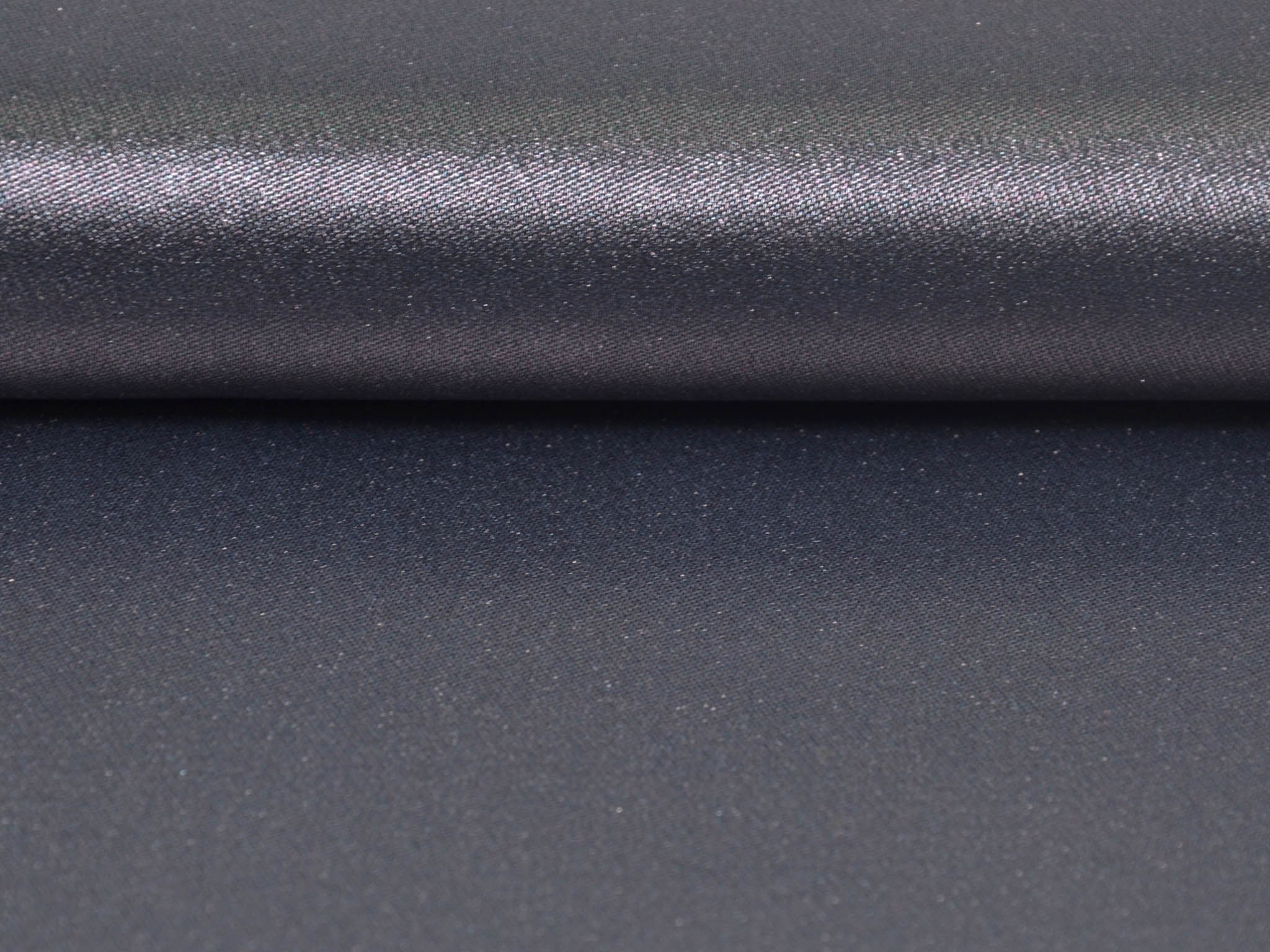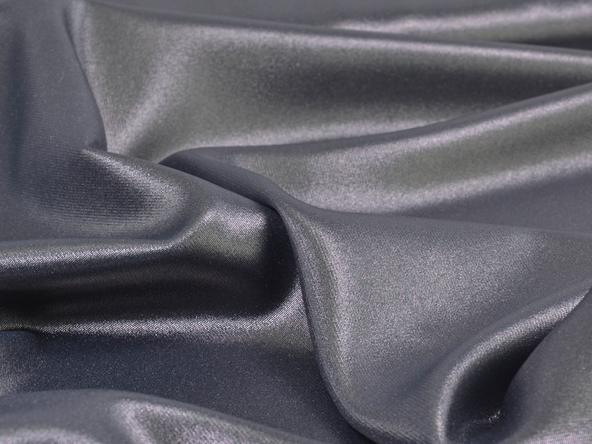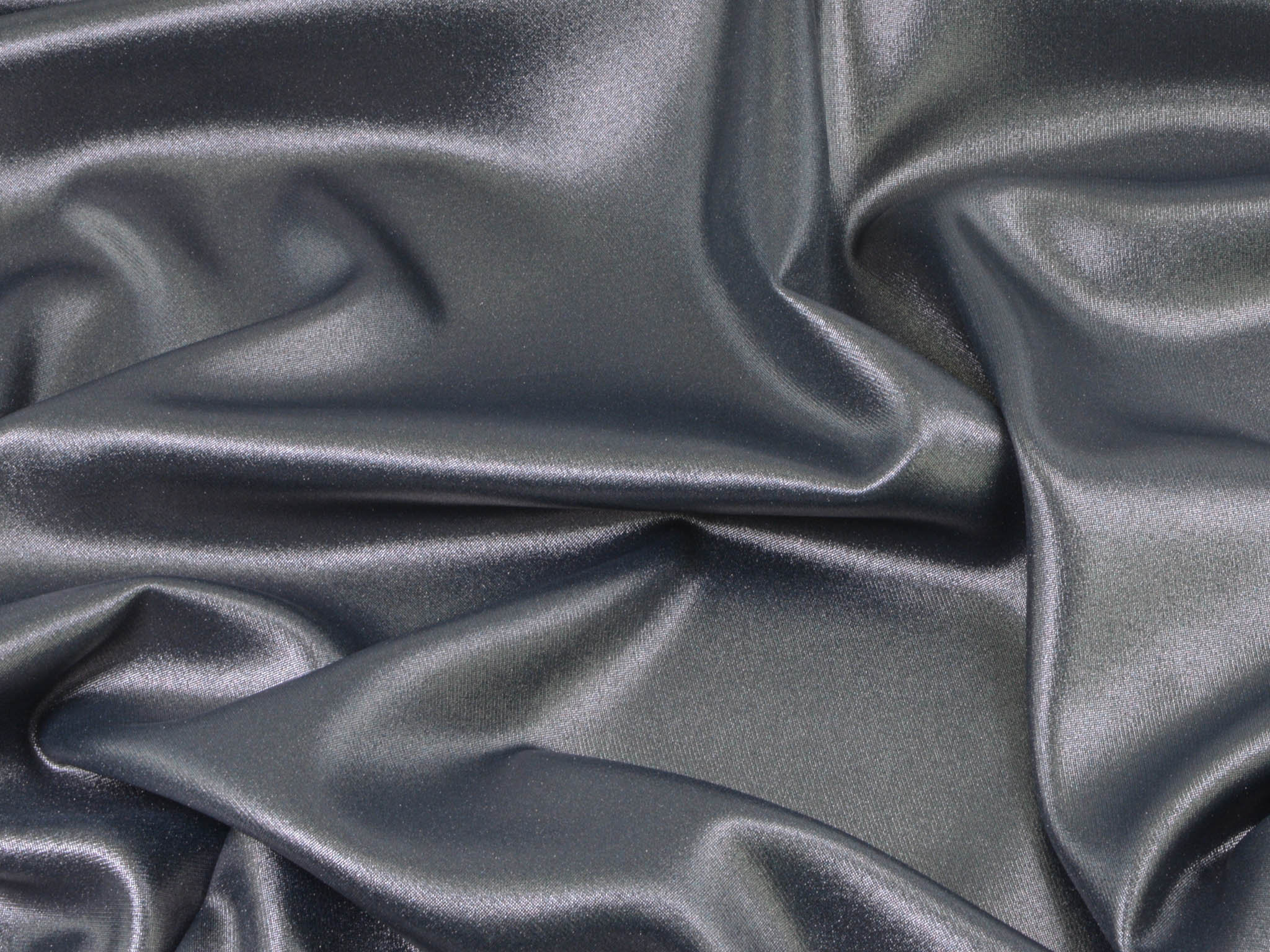 Designer-Stoff aus Microfaser made in Italy. Die dünne, fließende Ware glänzt silbern. Der Stoff reflektiert das Licht wunderbar und schimmert/ glitzert sehr edel. Er eignet sich zum Nähen von Blusen und Kleidern für die Abendmode. Die linke Stoffseite ist grau-grün.