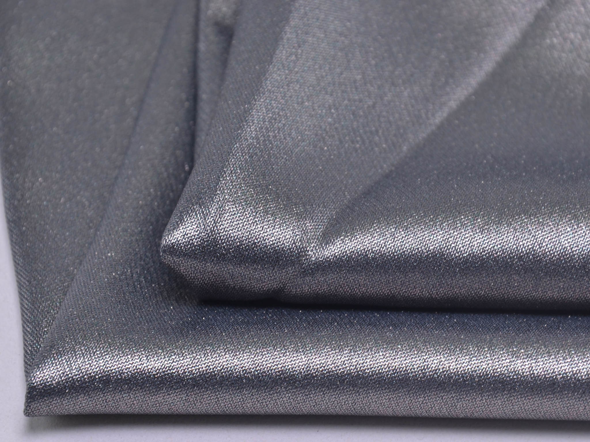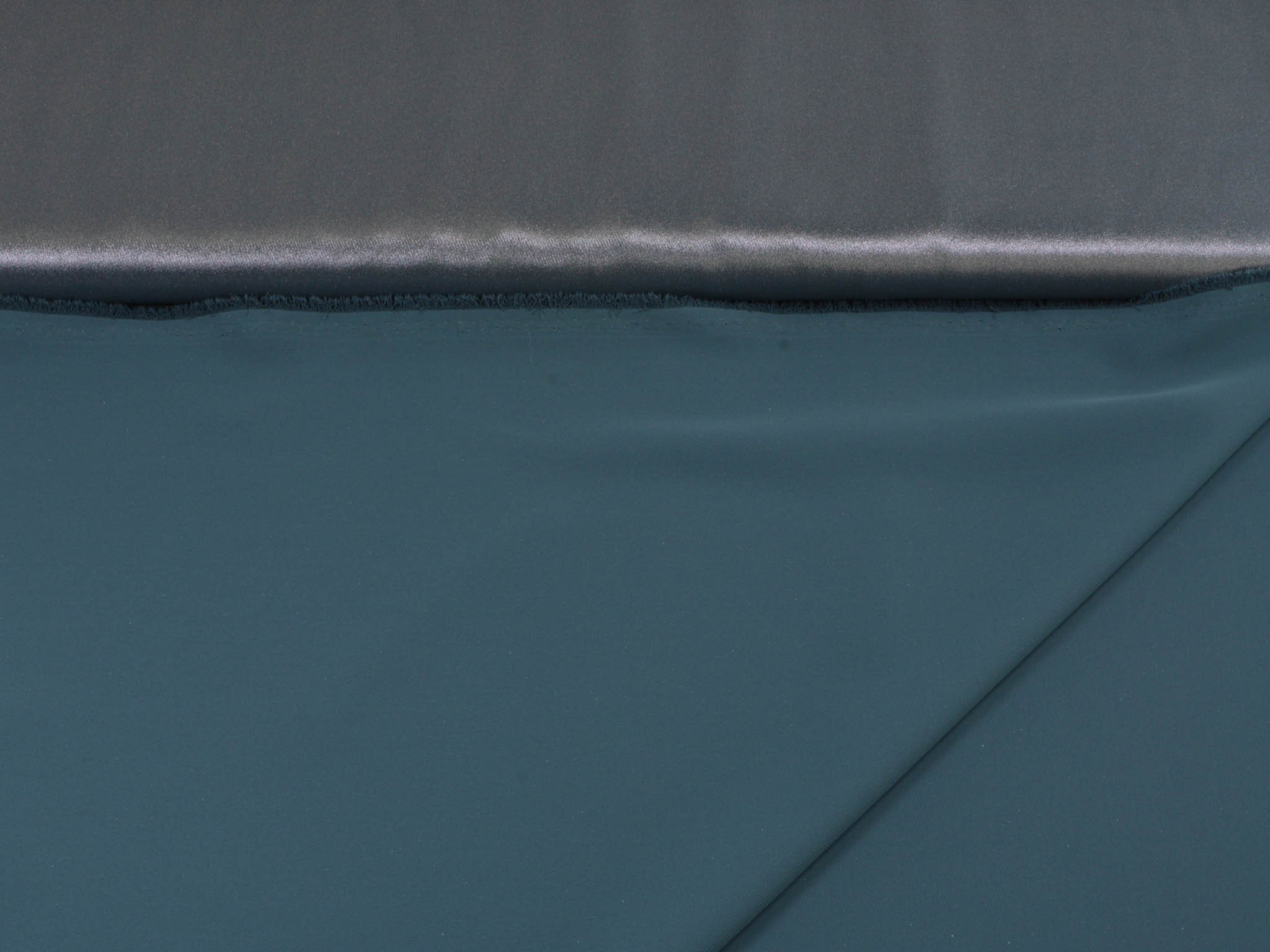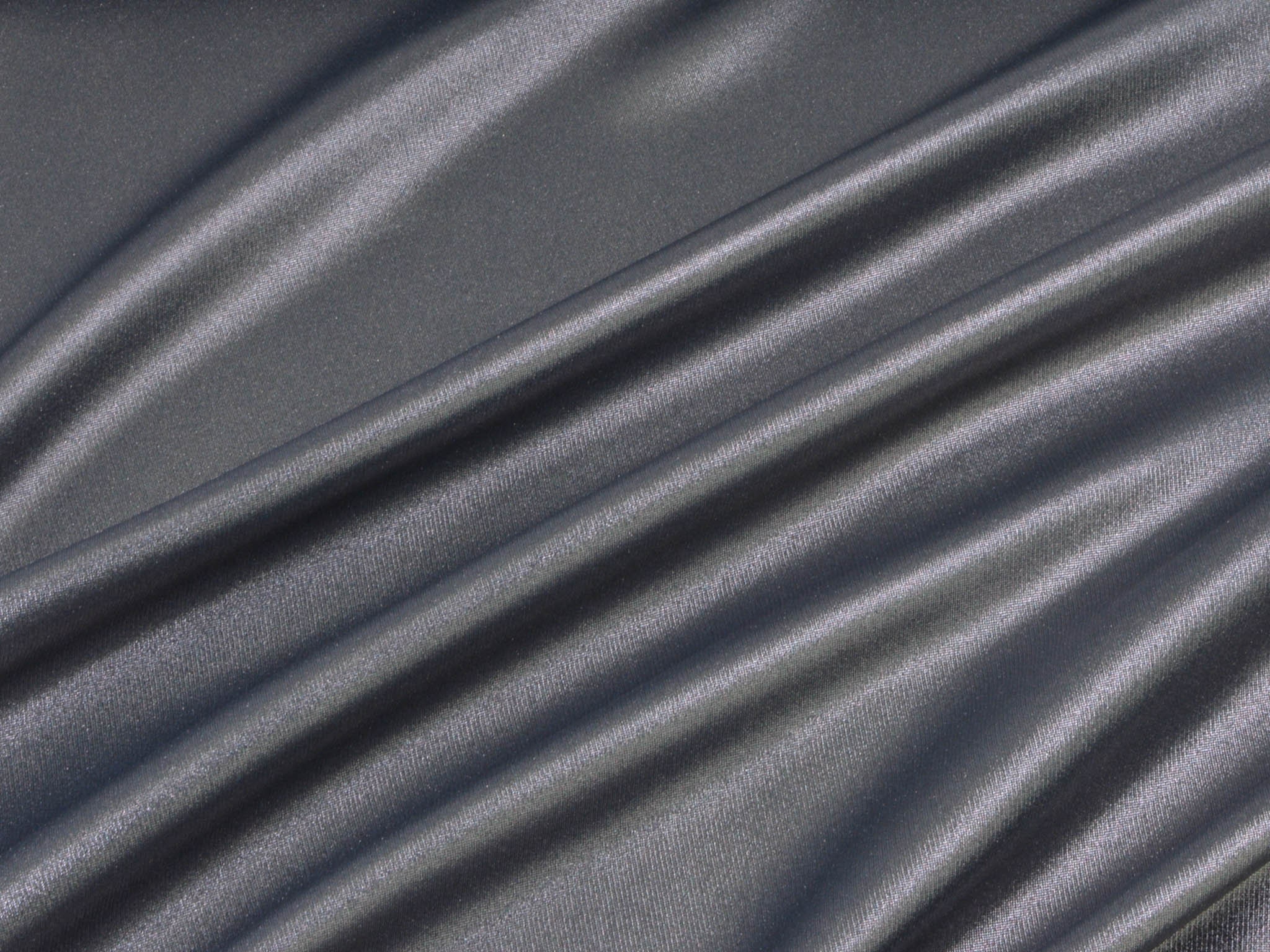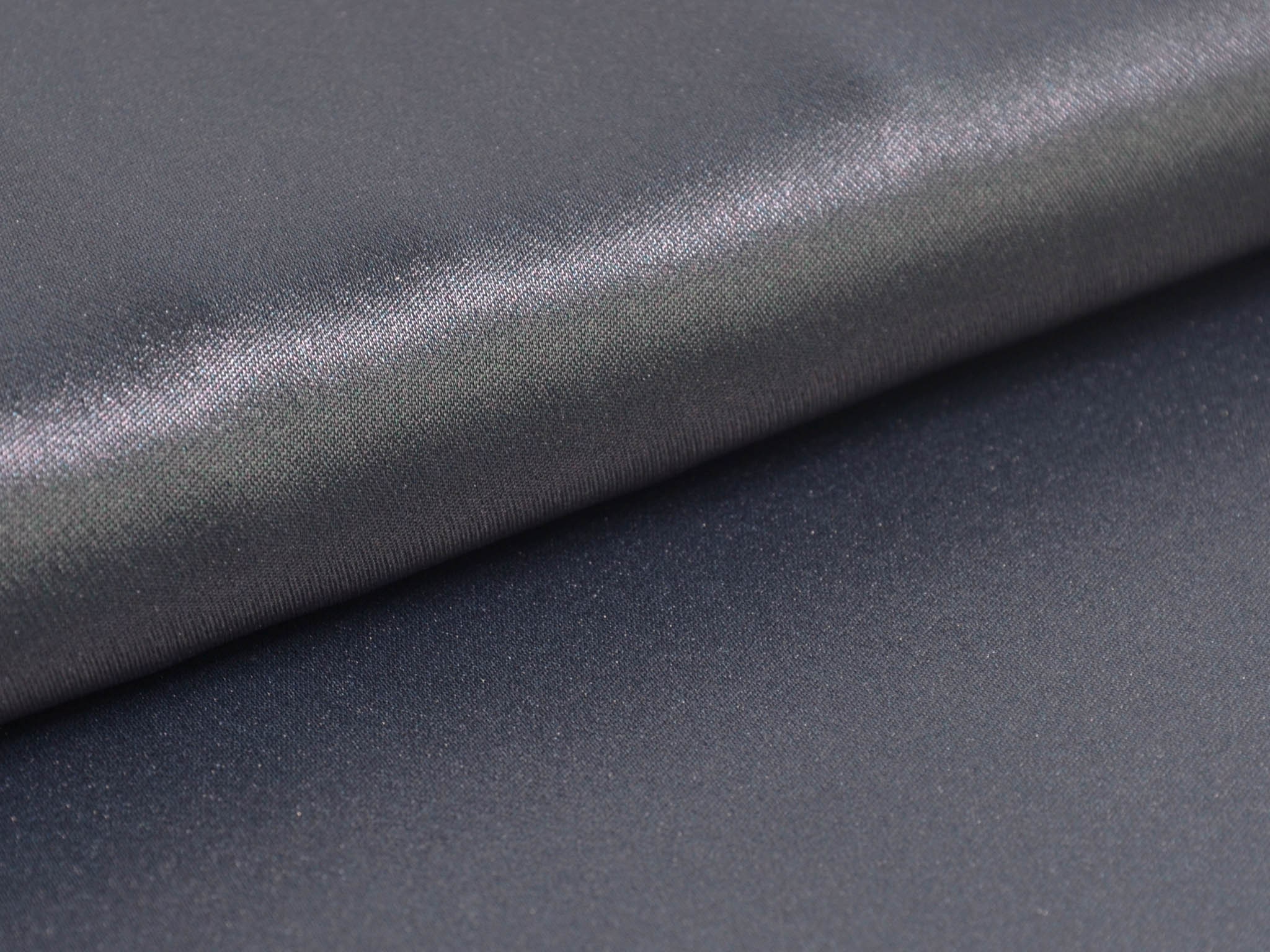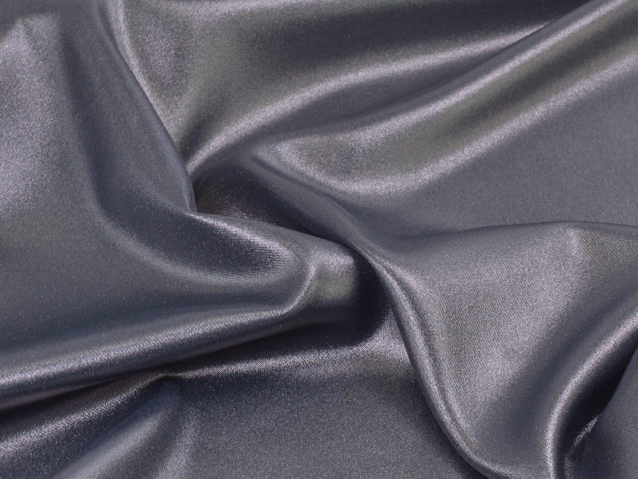 Designer-Stoff aus Microfaser made in Italy. Die dünne, fließende Ware glänzt silbern. Der Stoff reflektiert das Licht wunderbar und schimmert/ glitzert sehr edel. Er eignet sich zum Nähen von Blusen und Kleidern für die Abendmode. Die linke Stoffseite ist grau-grün.