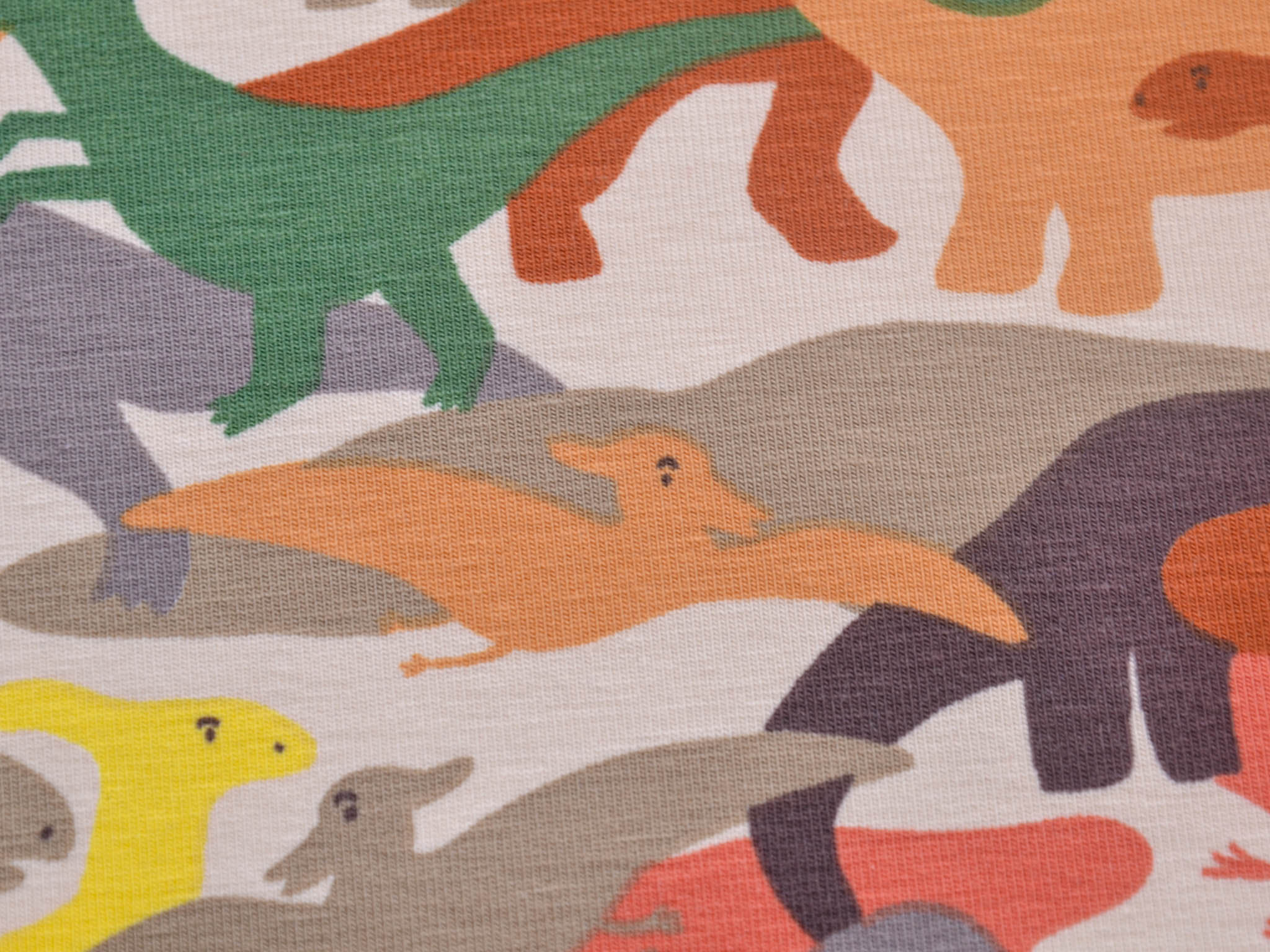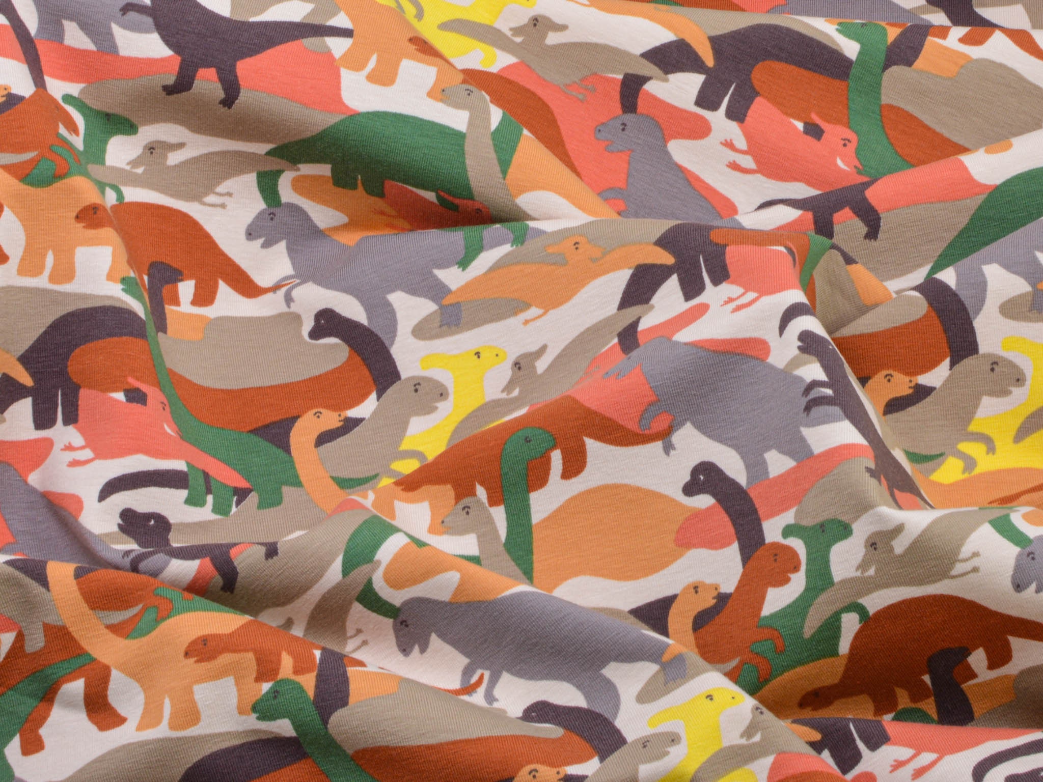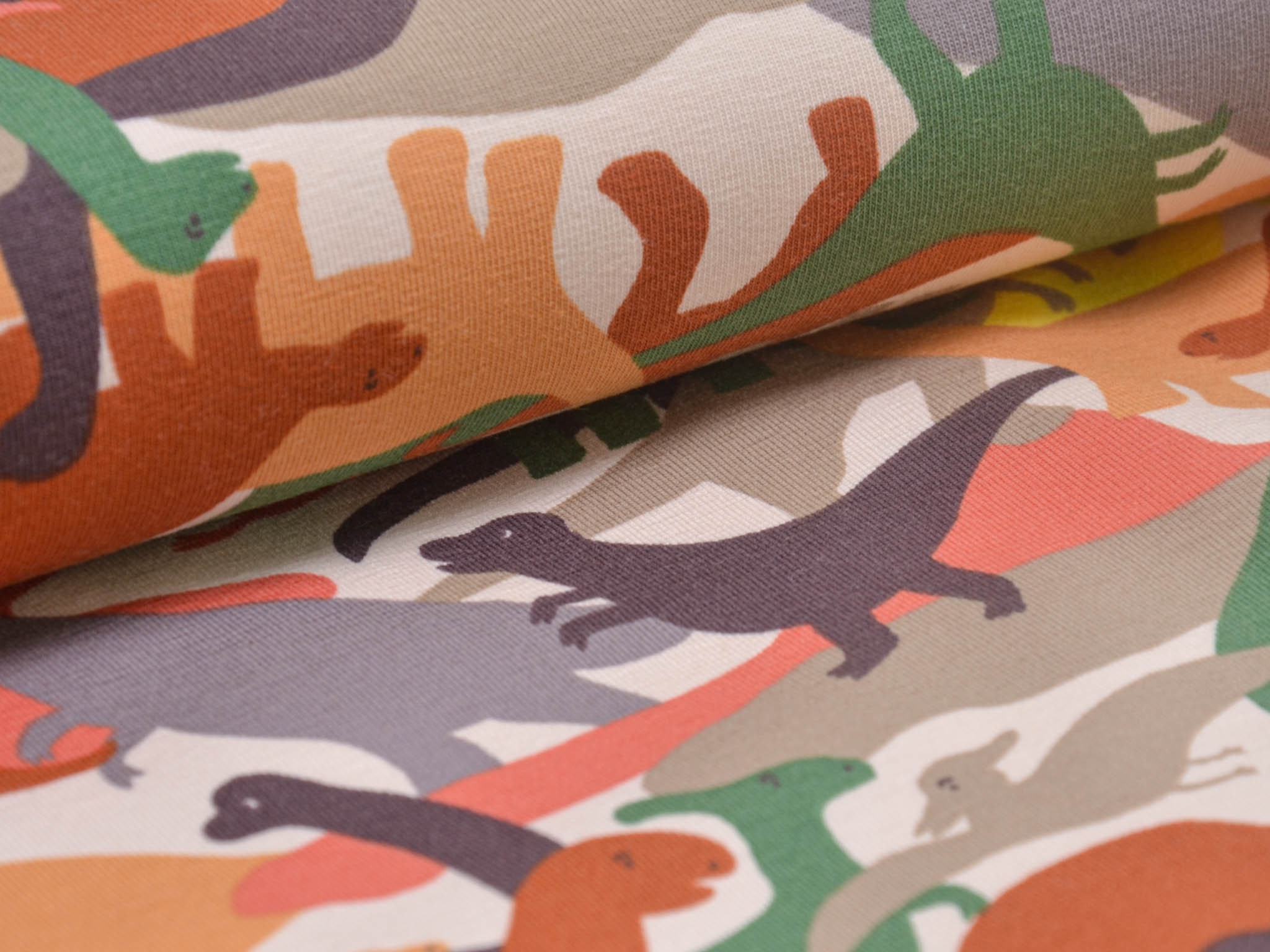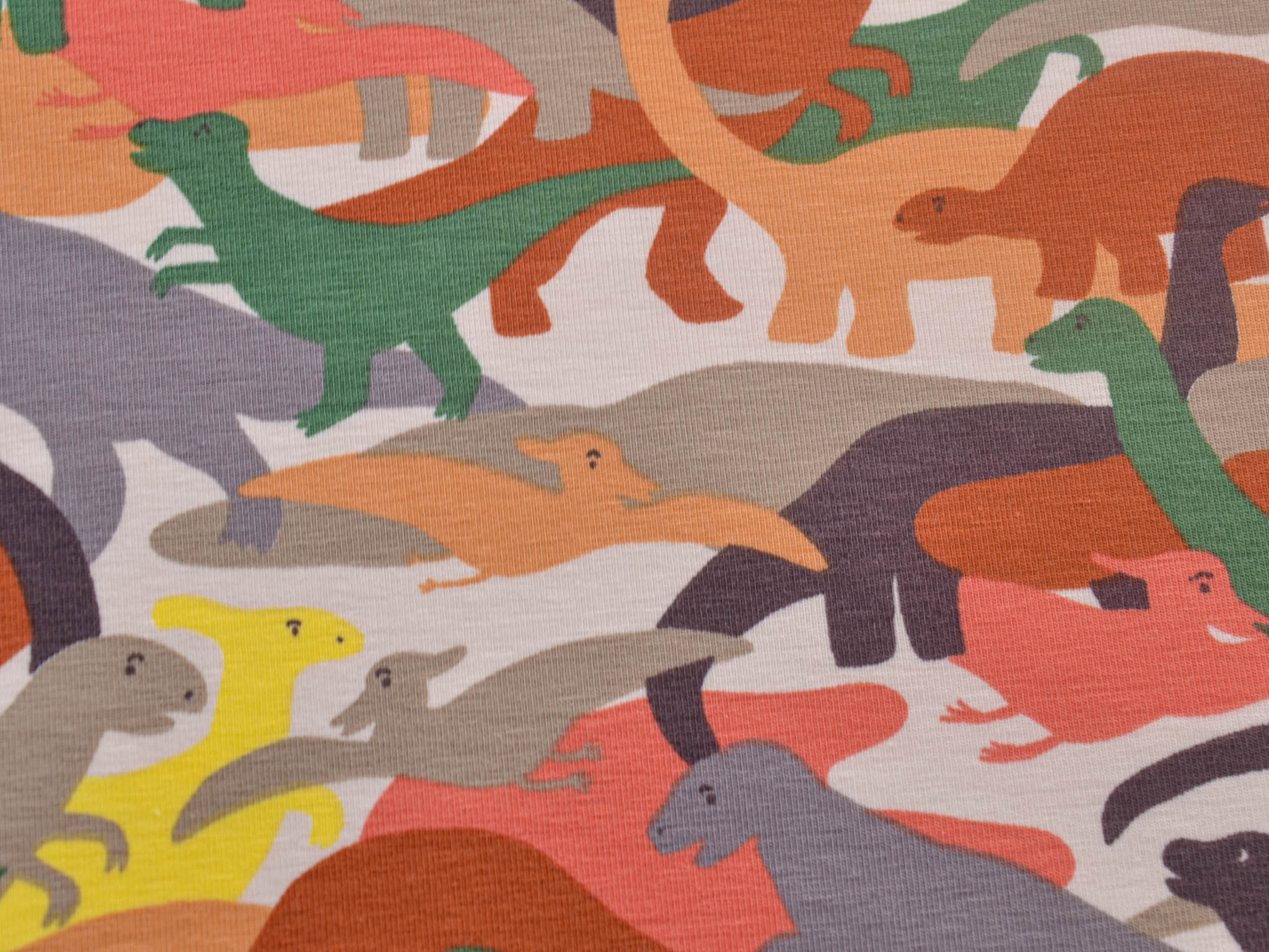 Jersey aus Baumwolle mit Dinos. Der Jersey eignet sich zum Nähen von T-Shirts, Langarmshirts, Leggings, Pumphosen, Mützen und vielem mehr.