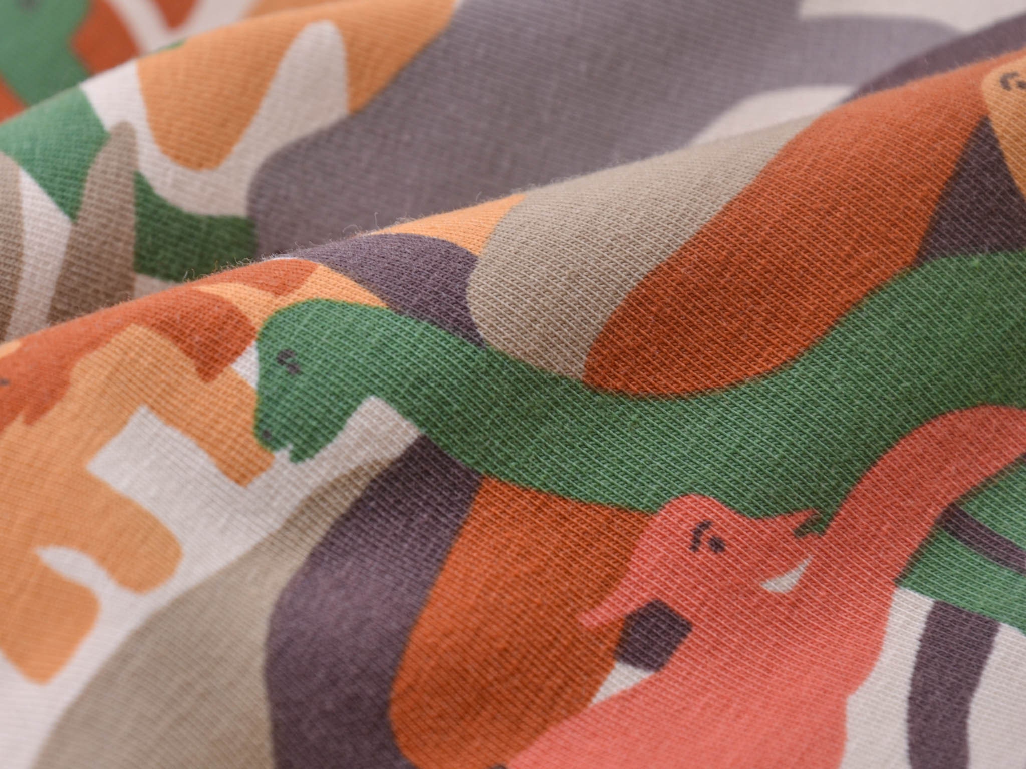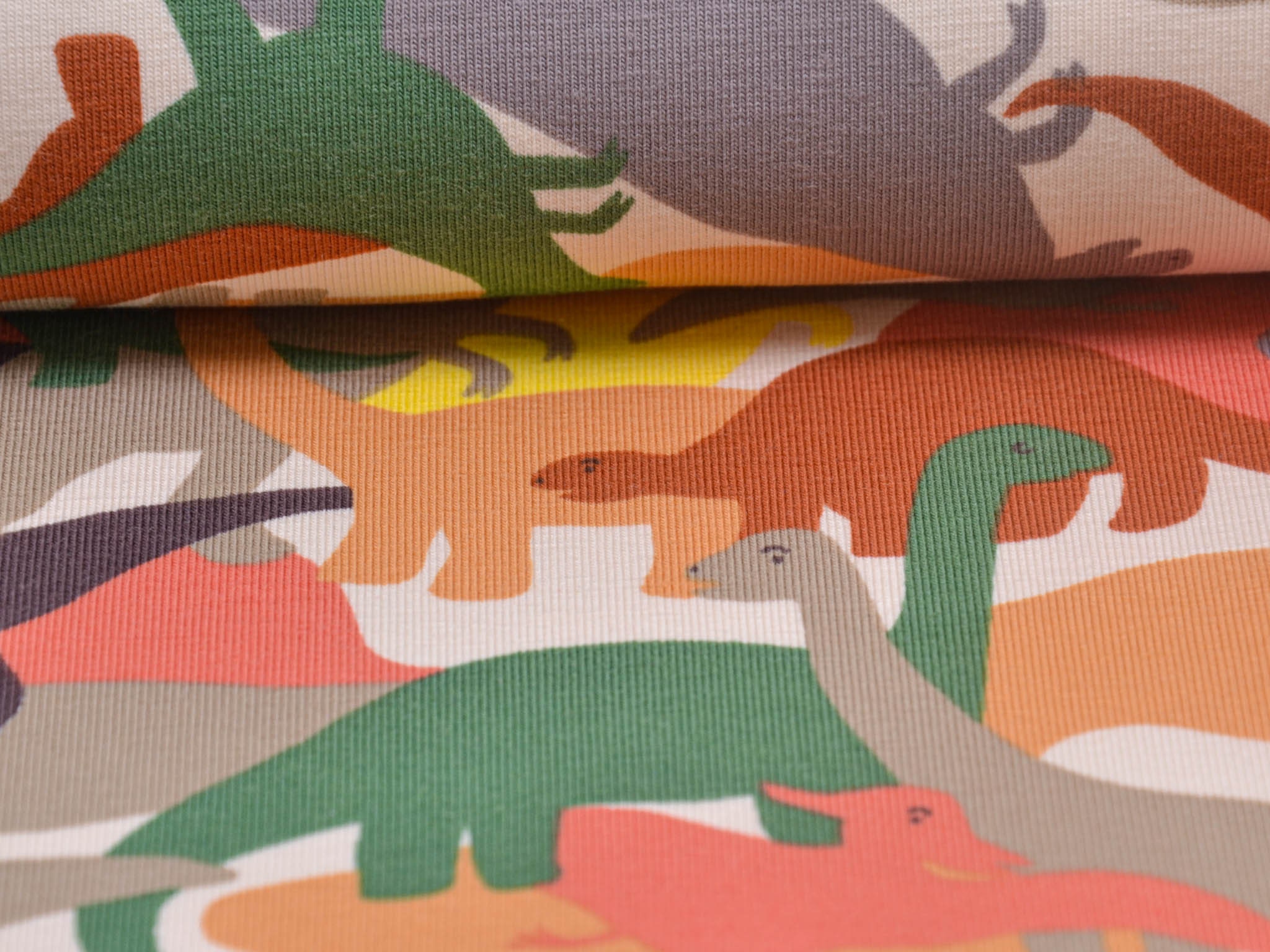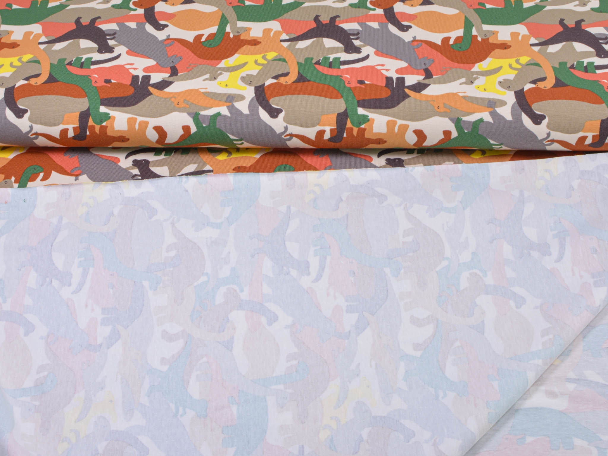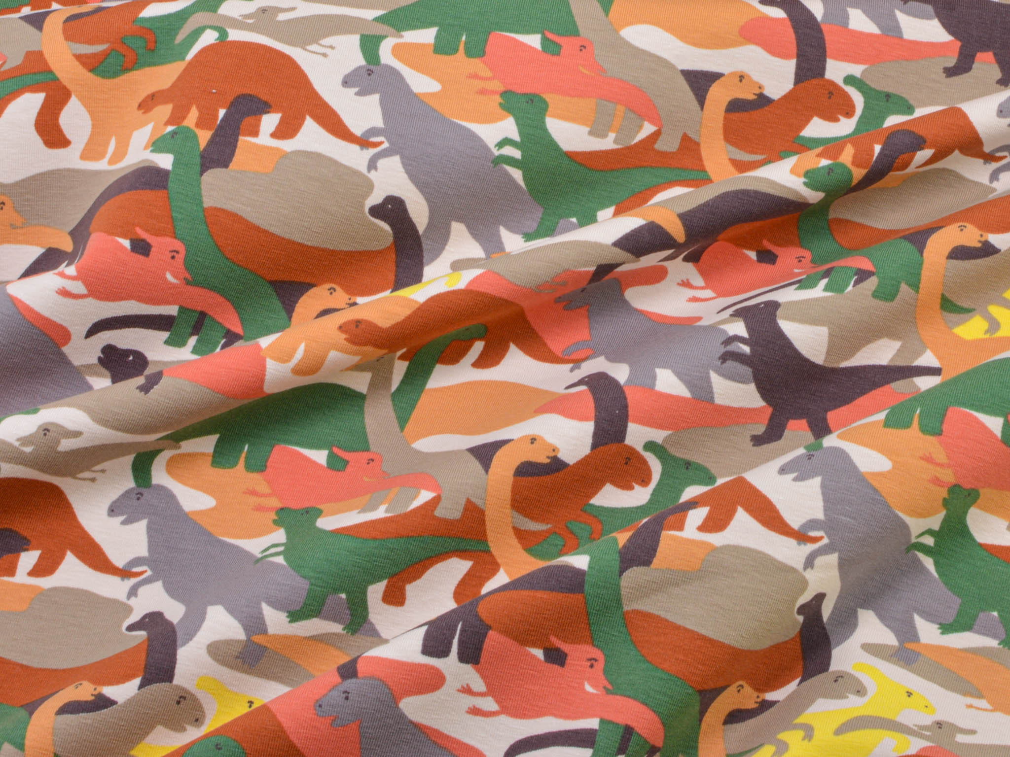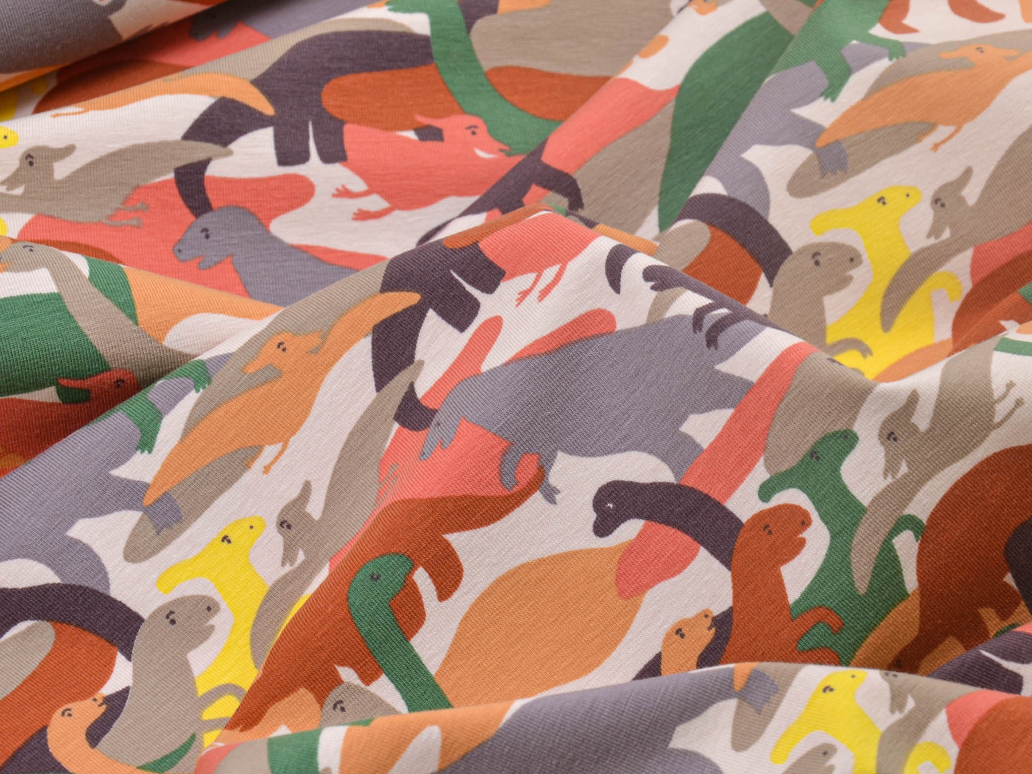 Jersey aus Baumwolle mit Dinos. Der Jersey eignet sich zum Nähen von T-Shirts, Langarmshirts, Leggings, Pumphosen, Mützen und vielem mehr.