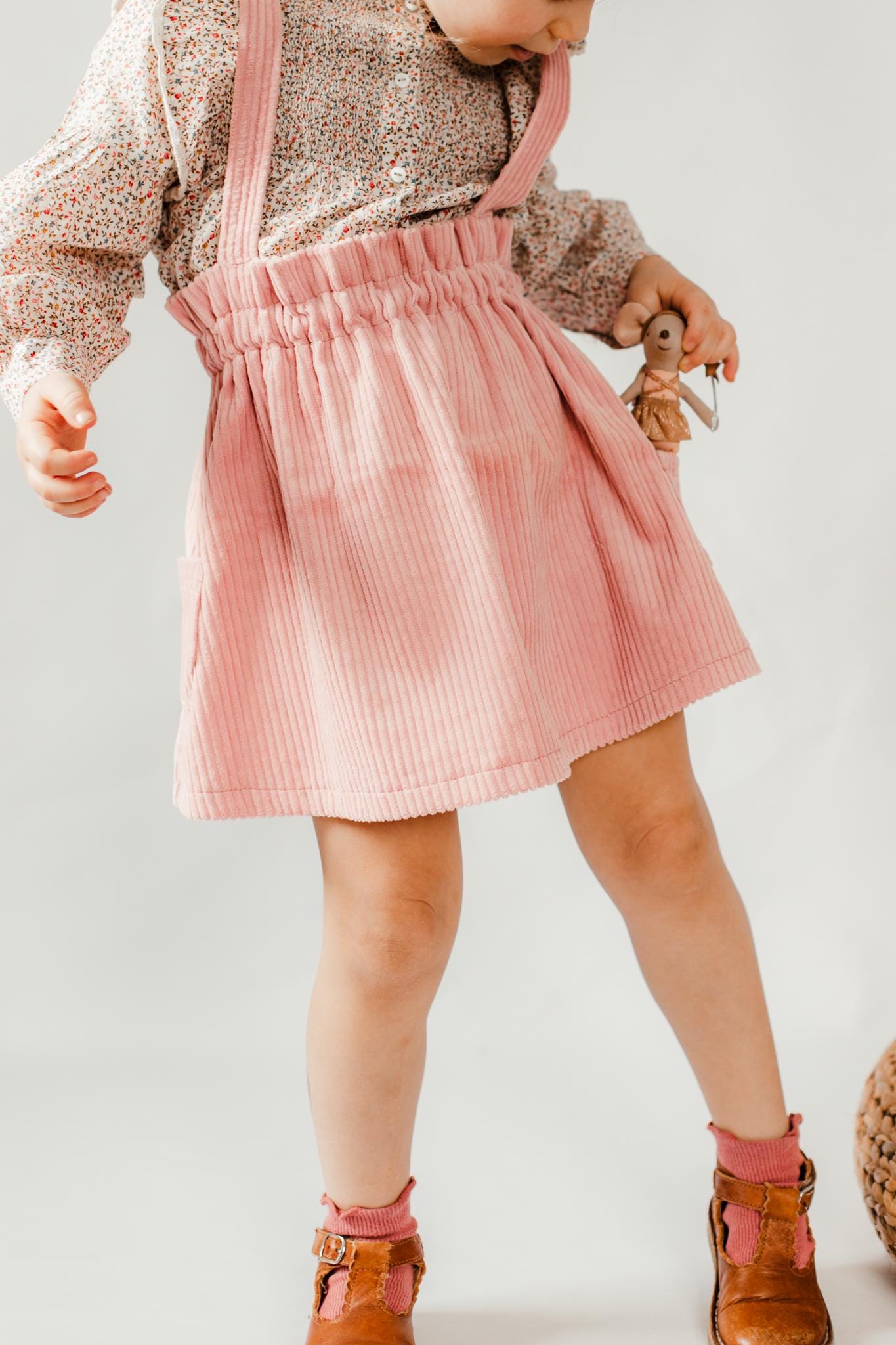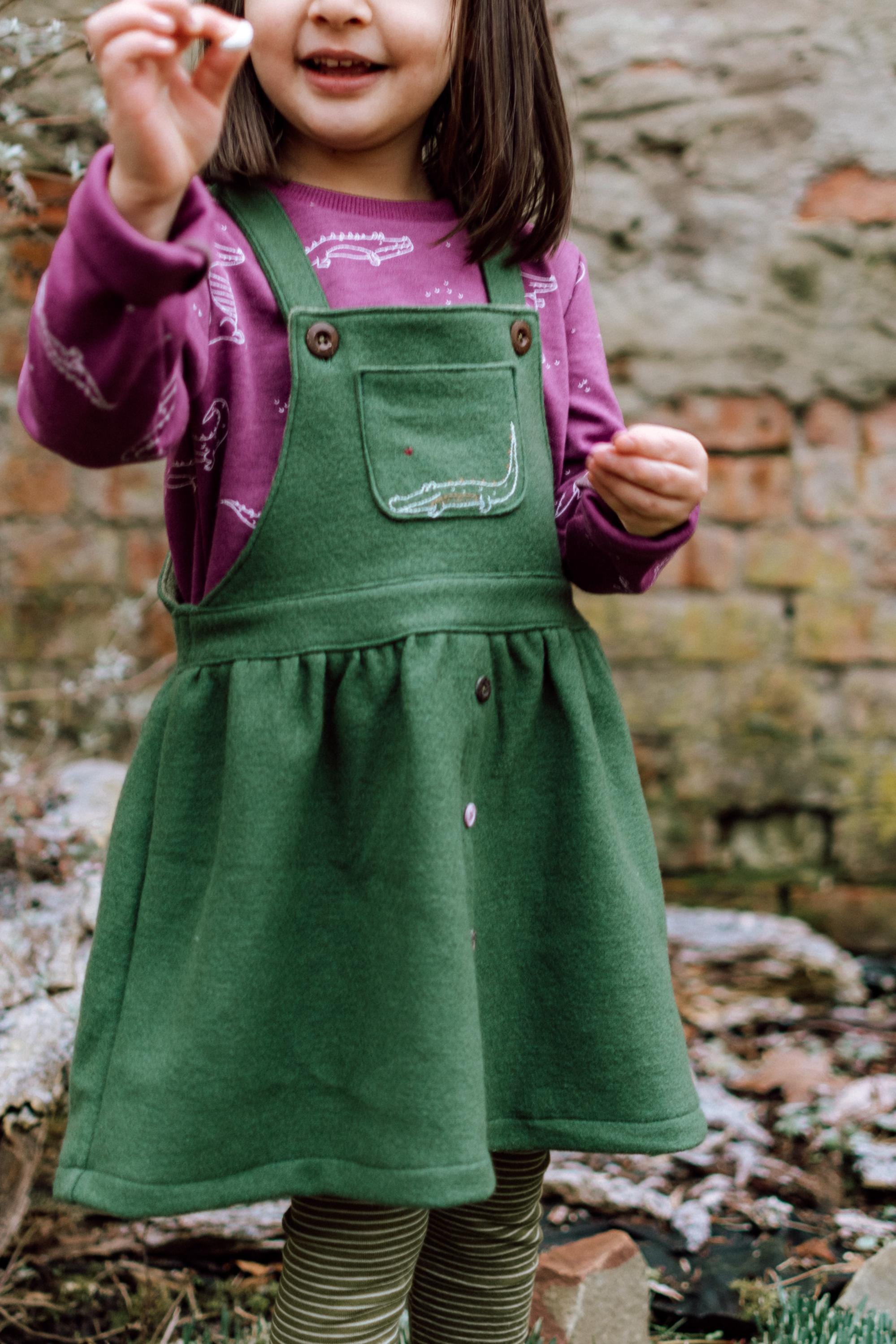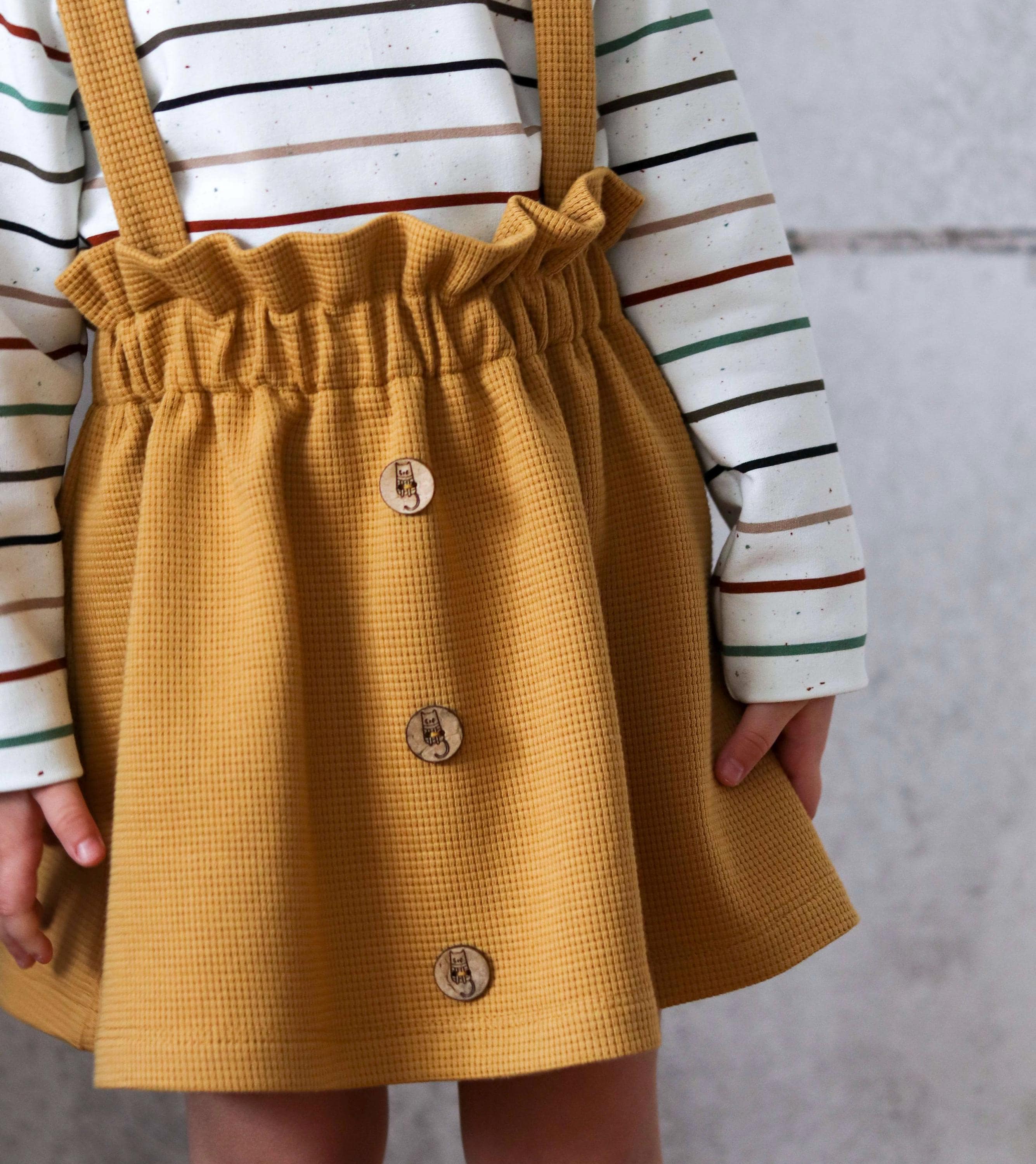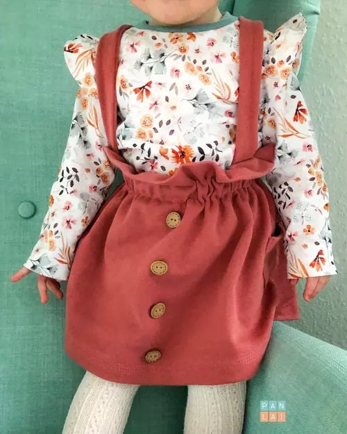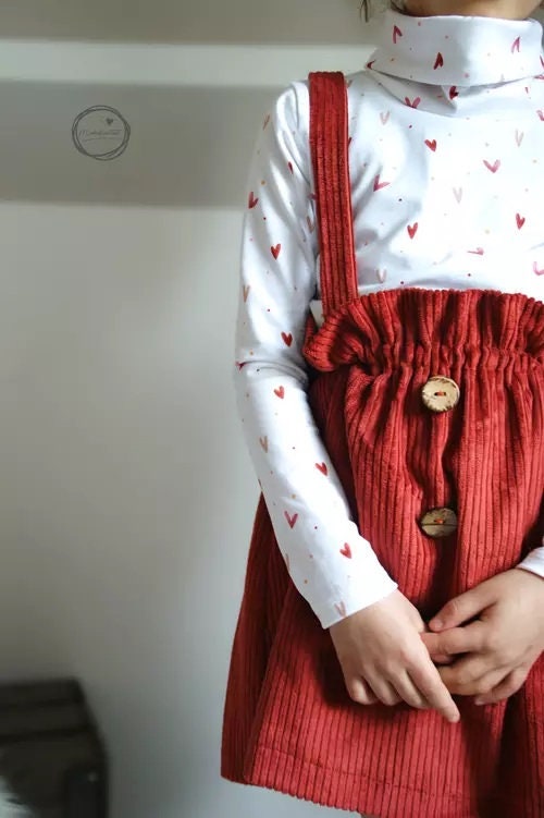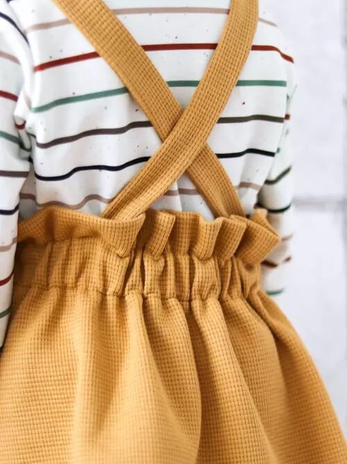 Fabric recommendation: The skirt and dress are designed for both stretchy and non-stretchy fabrics. For stretchy fabrics, sweat, French terry/summer sweat, waffle jersey, and stretch corduroy are best. For woven fabrics, corduroy is naturally great for skirts and dungarees! But denim or jacquard are also suitable.