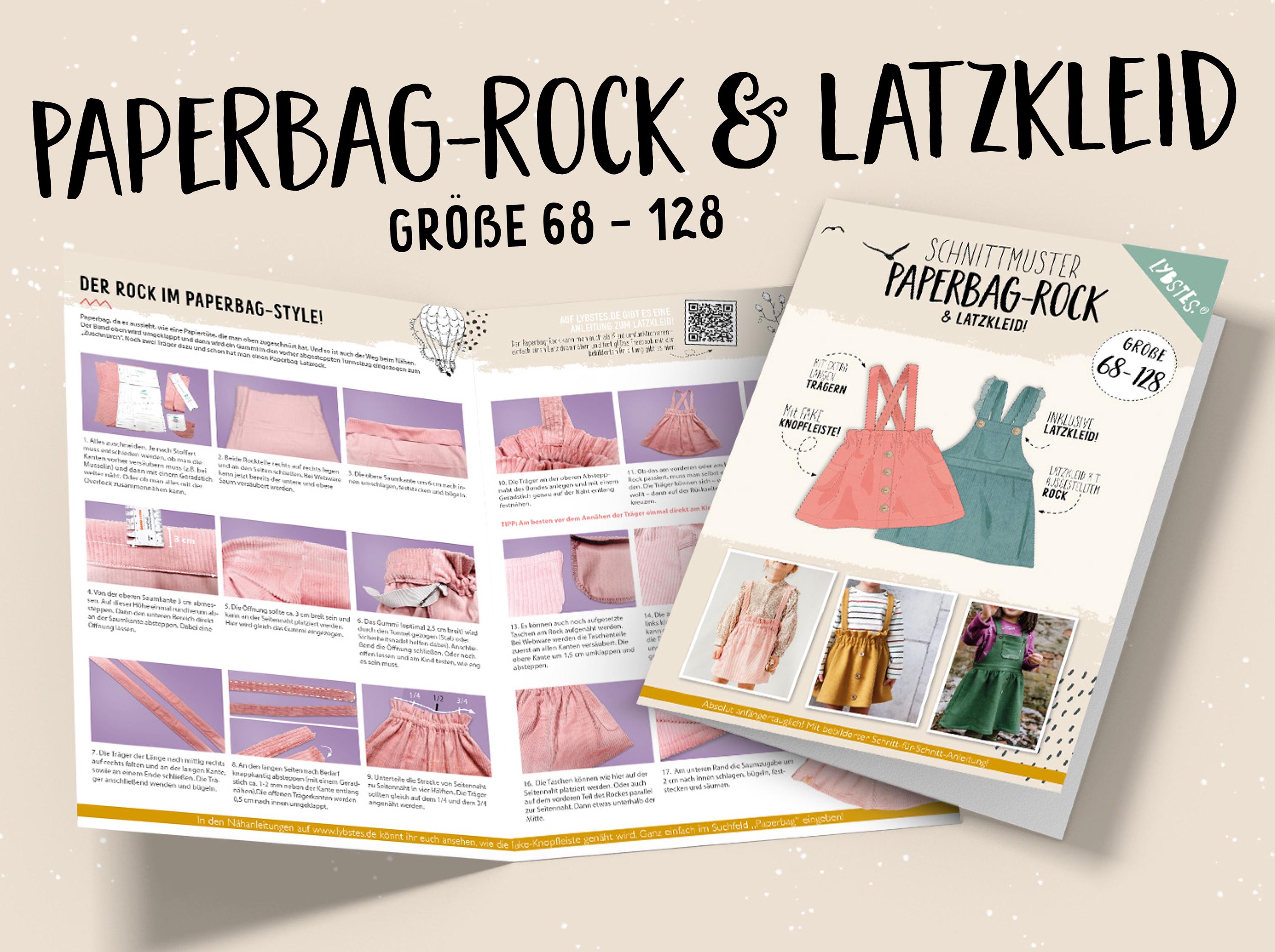 A paper bag skirt (which looks like a tied-up paper bag at the top) and a simple dungaree dress in sizes 68 - 128 await you in this paper pattern.