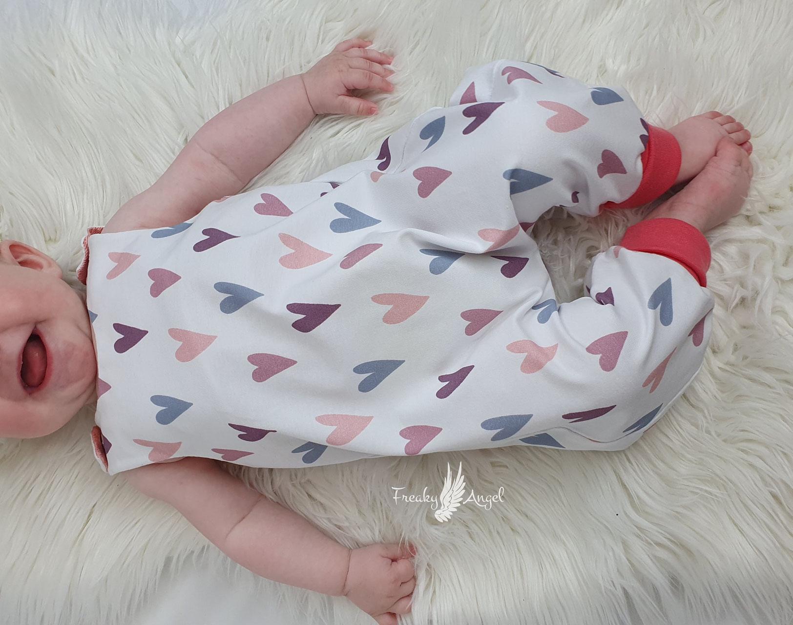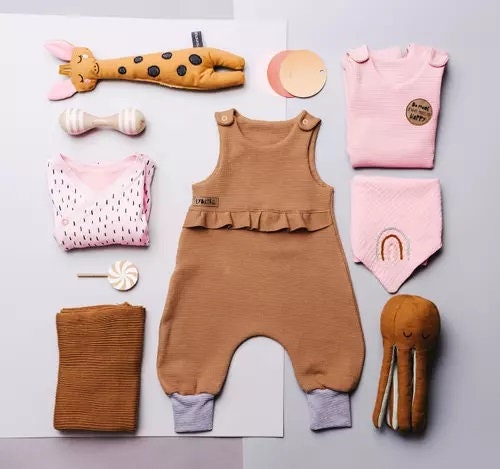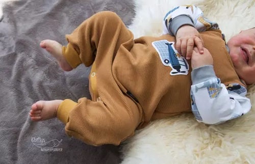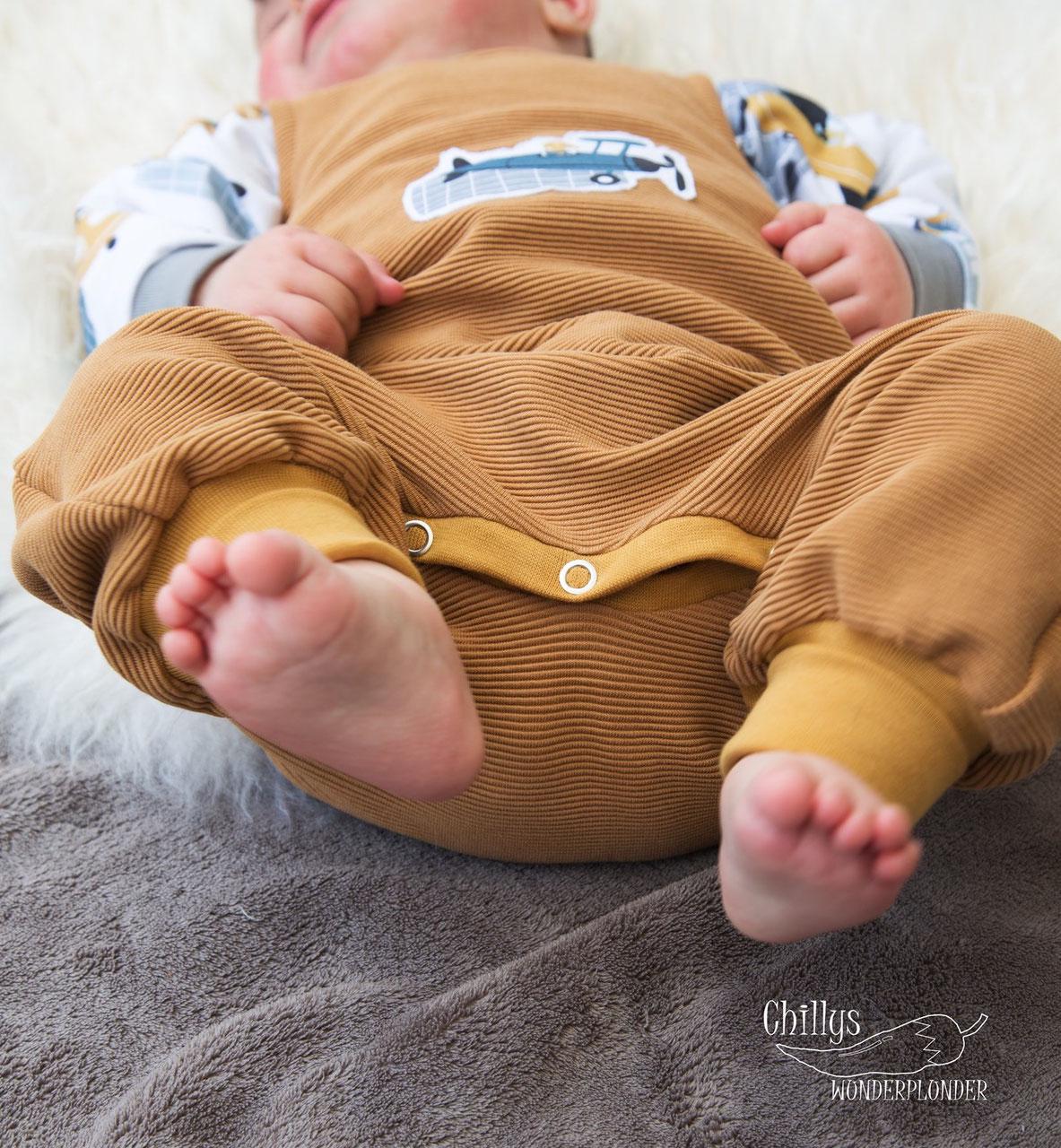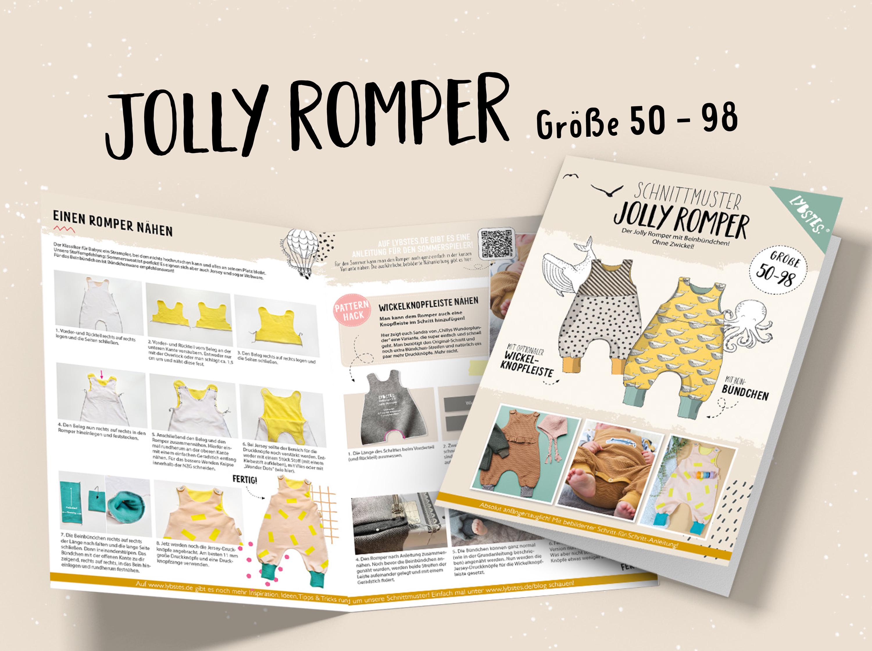Romper without sleeves with leg cuffs and buttons on the shoulder. Optionally, you can also sew a wrap-around button placket. You can sew the Jolly Romper from jersey, sweat or muslin. You need cuff fabric for the leg cuffs.