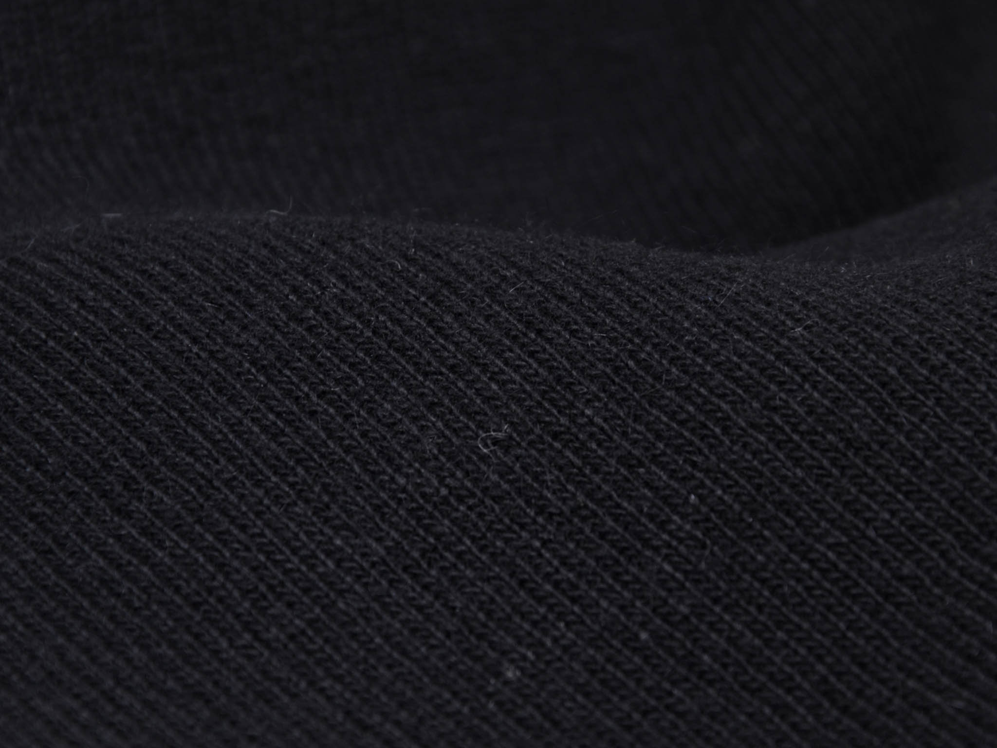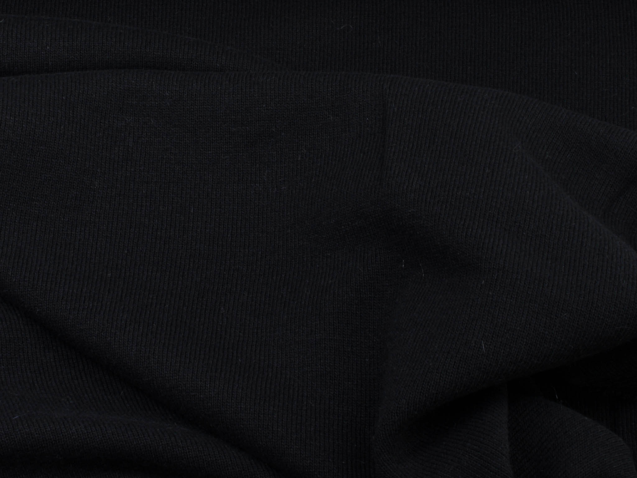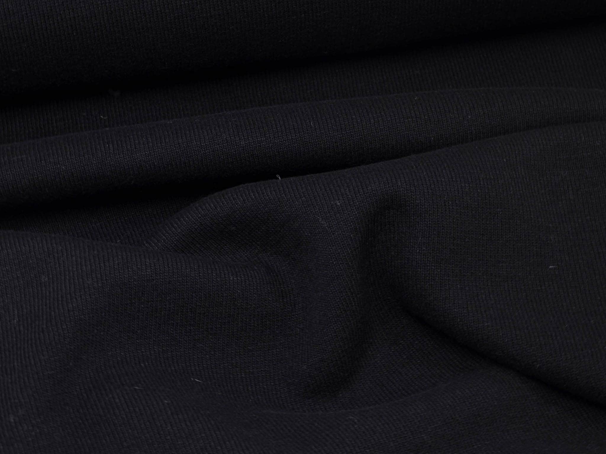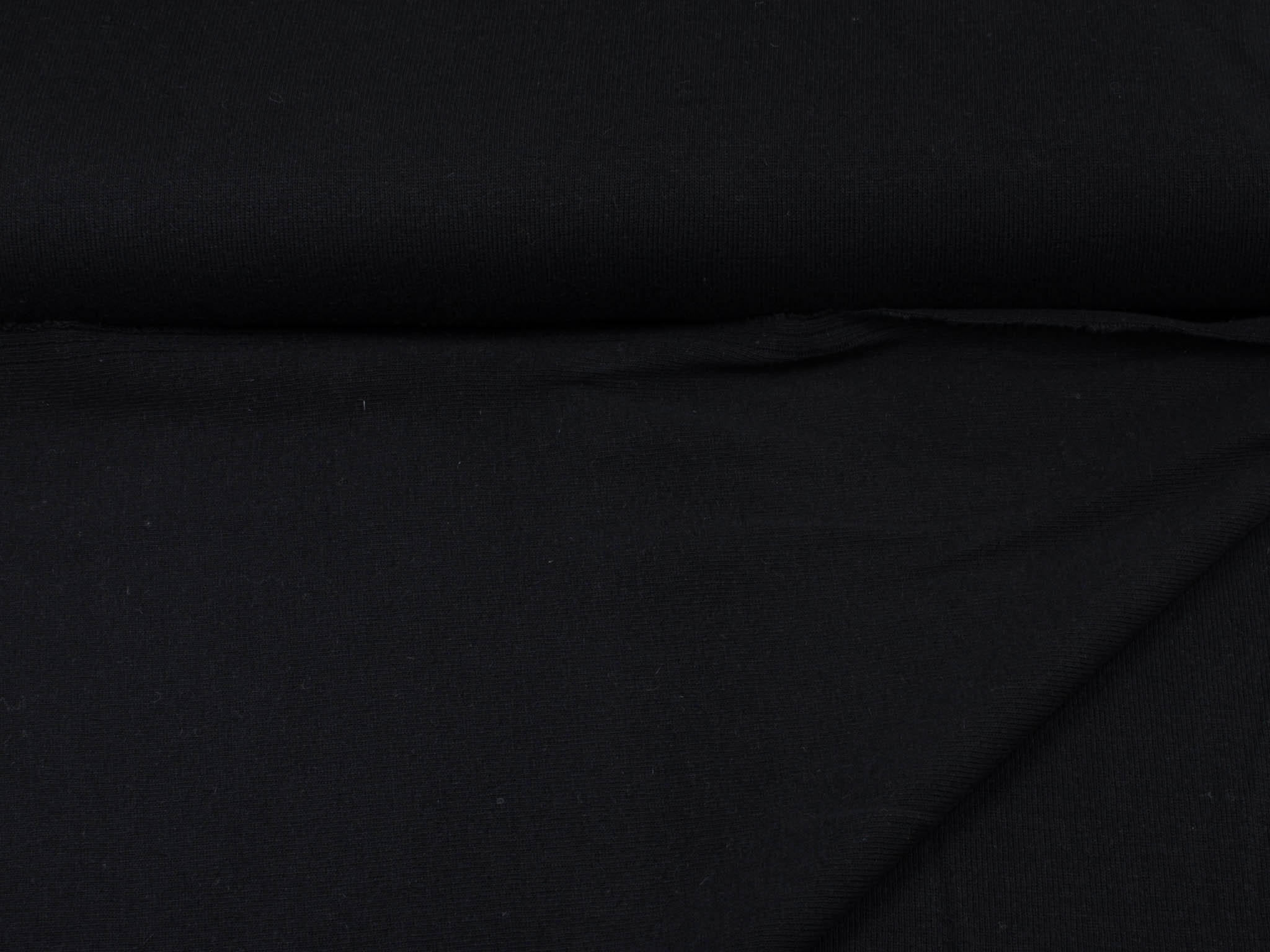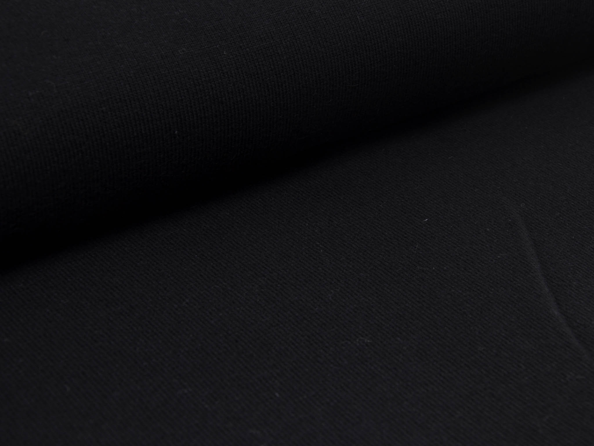 Doubleknit Stoff aus Italien. Der Strickstoff ist schwarz und fühlt sich ganz weich an. Er hat die übliche Strickstruktur und einen fließenden Fall. Er eignet sich zum Nähen von Kleidern, Strickjacken und Röcken.