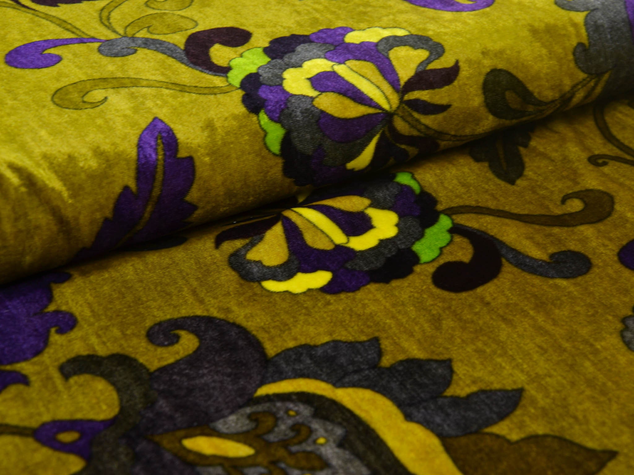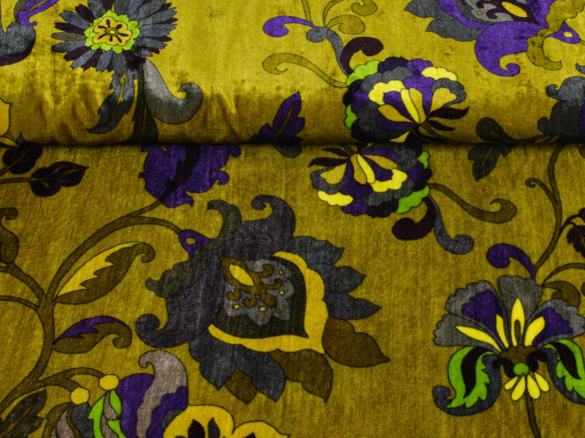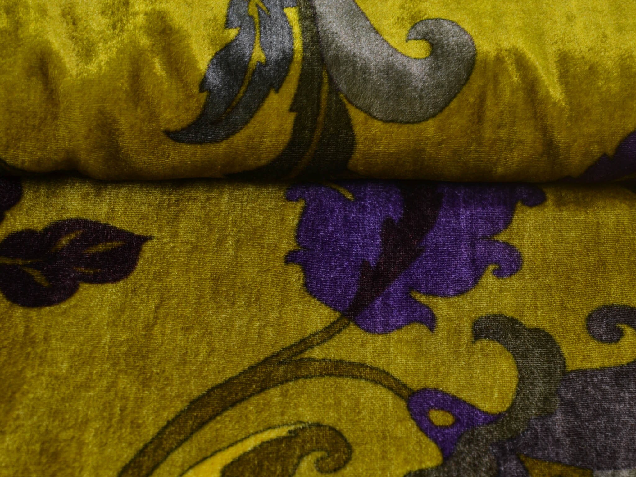 Hochwertiger Designer-Samt made in Italy. Der Viskose-Samt ist gelb-grün mit großen Blumen und Ranken. Der glänzende Stoff hat einen fließenden Fall und einen samtigen Griff. Die linke Stoffseite ist glatt. Du kannst den Stoff zum Nähen von Kleidern, Kimonos und vielem mehr verwenden.