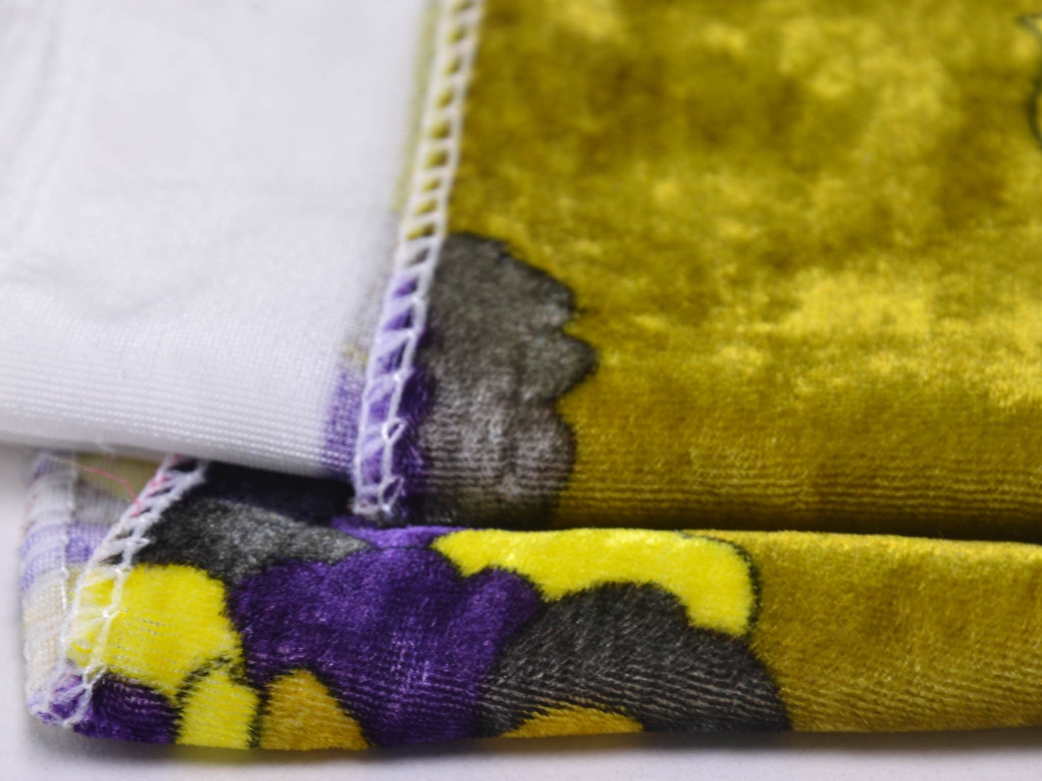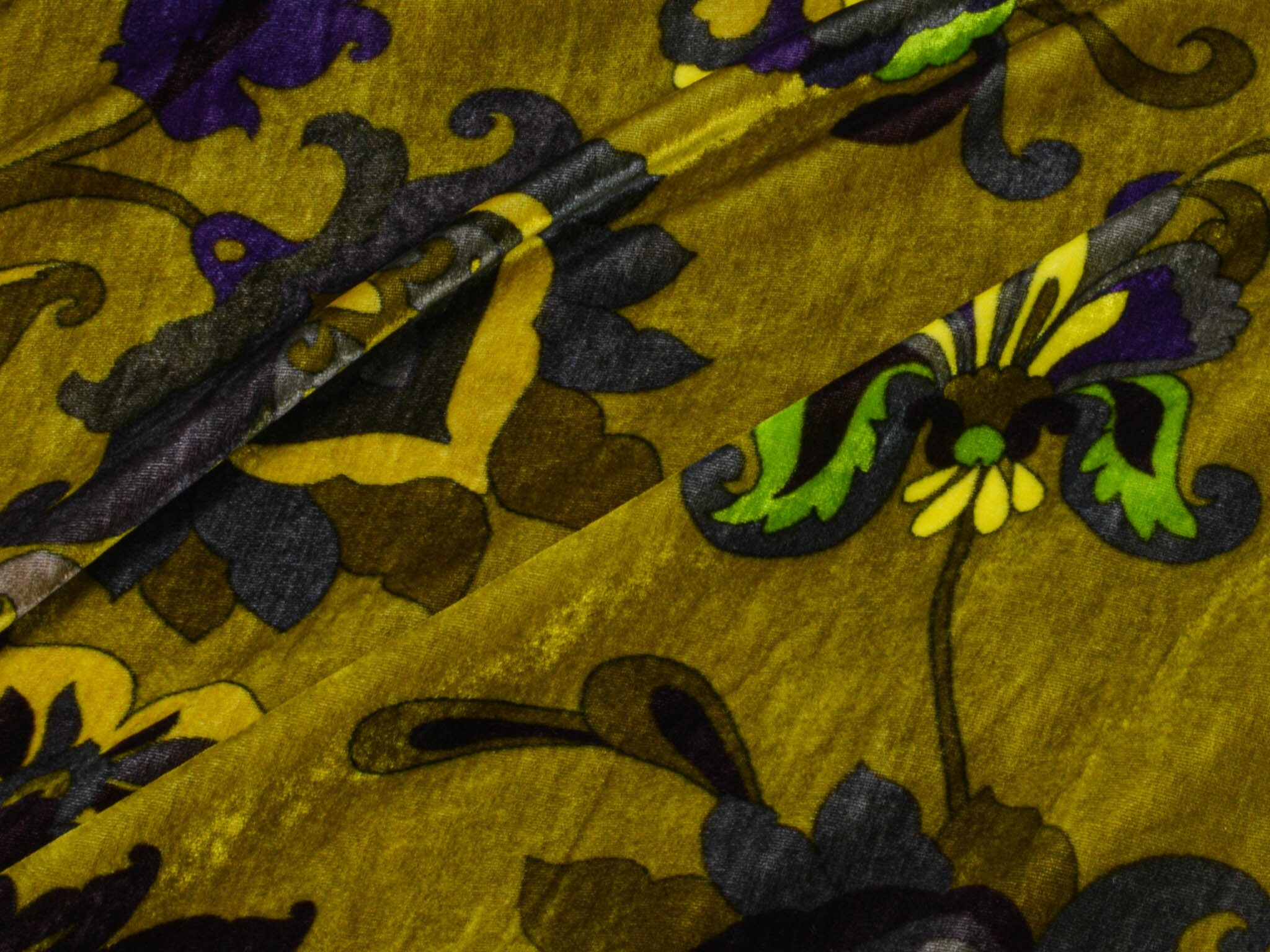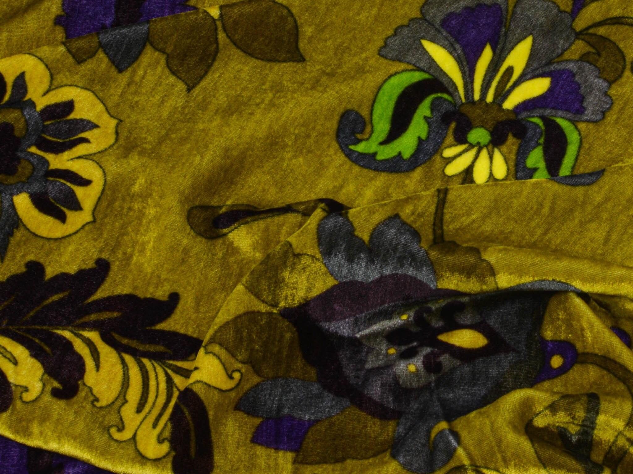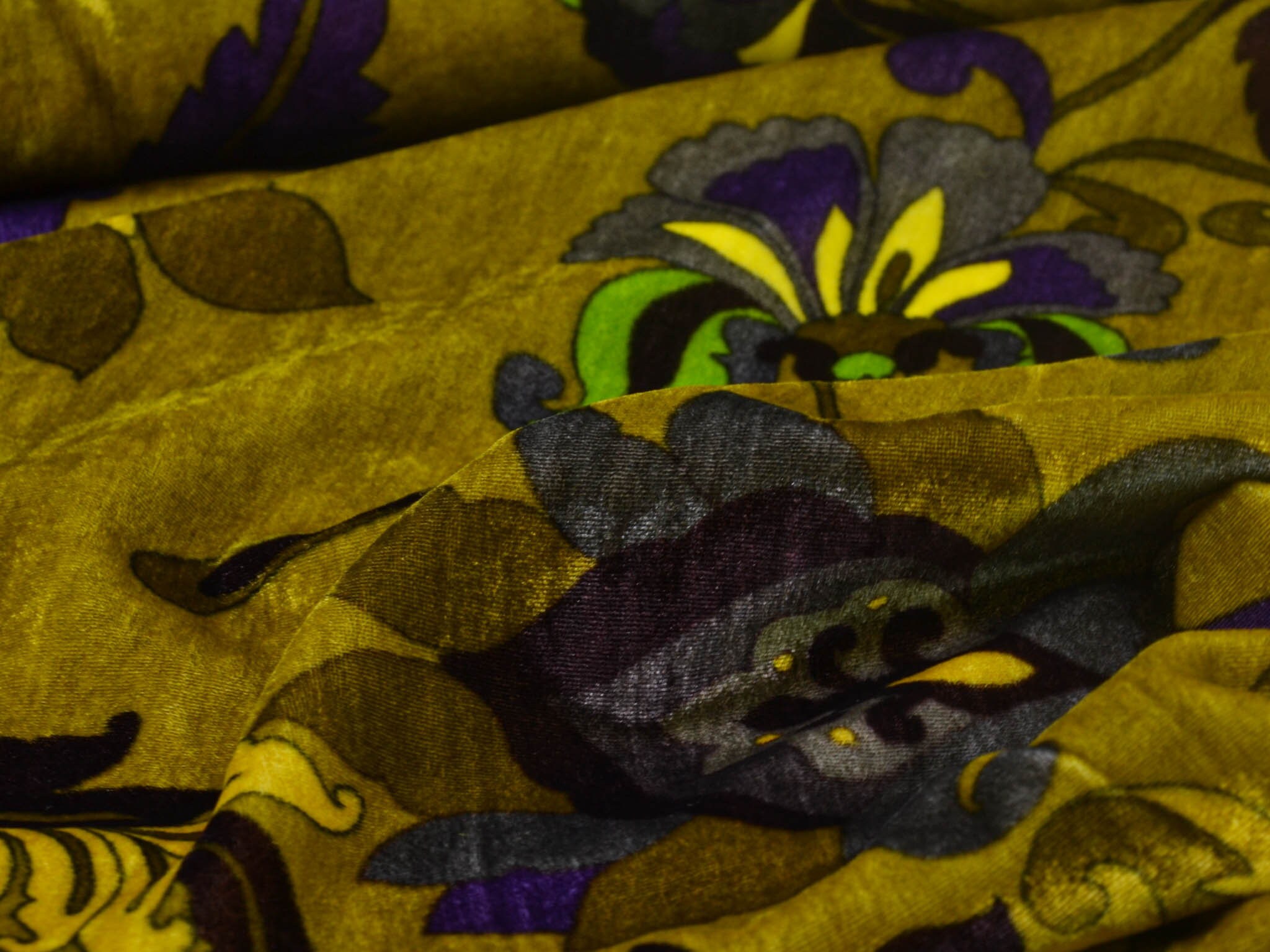 Hochwertiger Designer-Samt made in Italy. Der Viskose-Samt ist gelb-grün mit großen Blumen und Ranken. Der glänzende Stoff hat einen fließenden Fall und einen samtigen Griff. Die linke Stoffseite ist glatt. Du kannst den Stoff zum Nähen von Kleidern, Kimonos und vielem mehr verwenden.