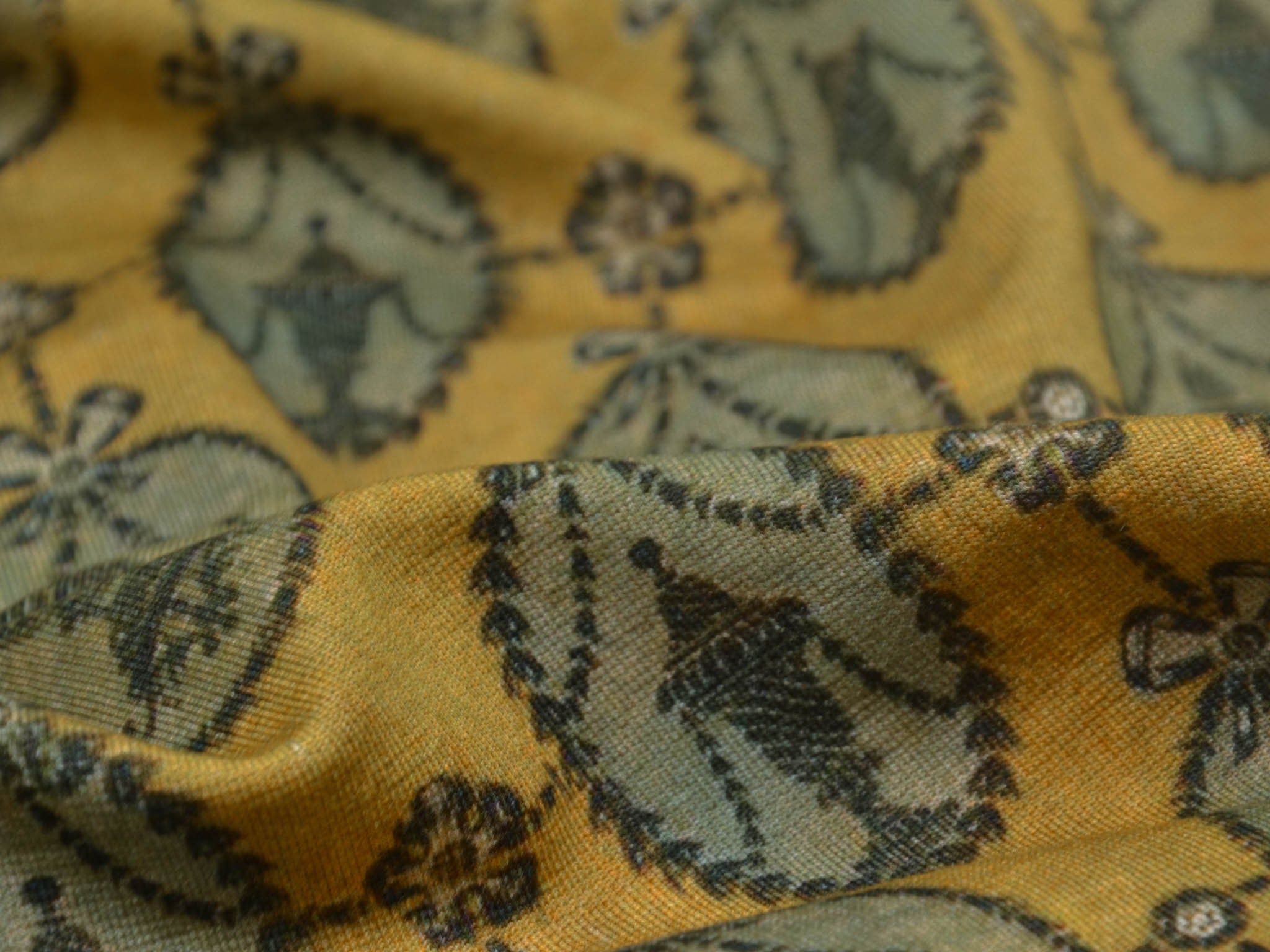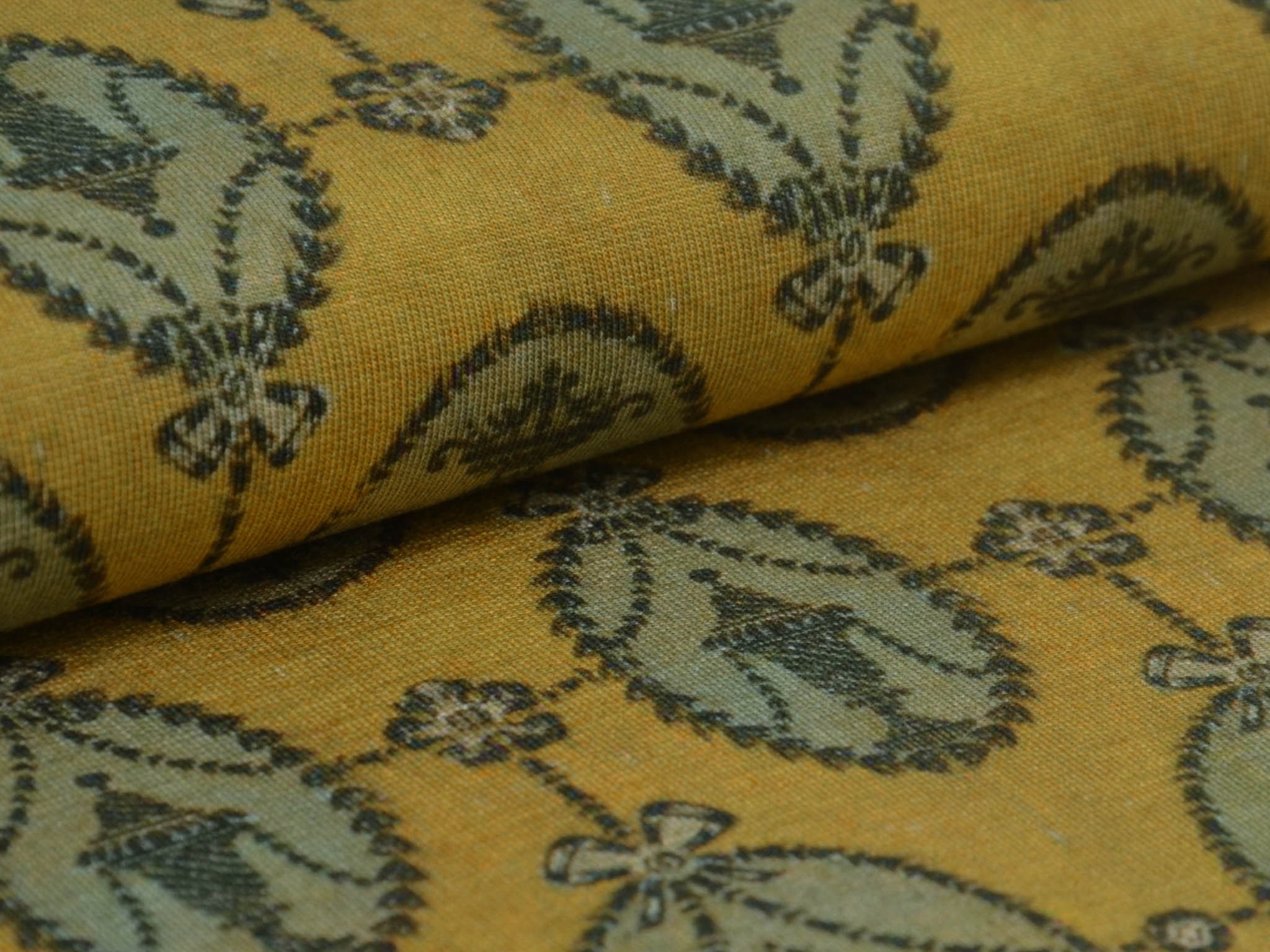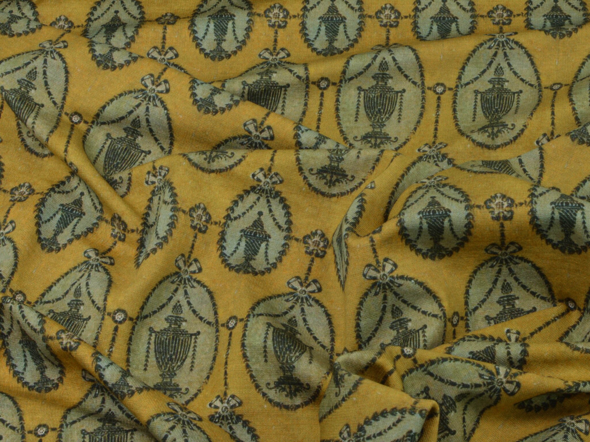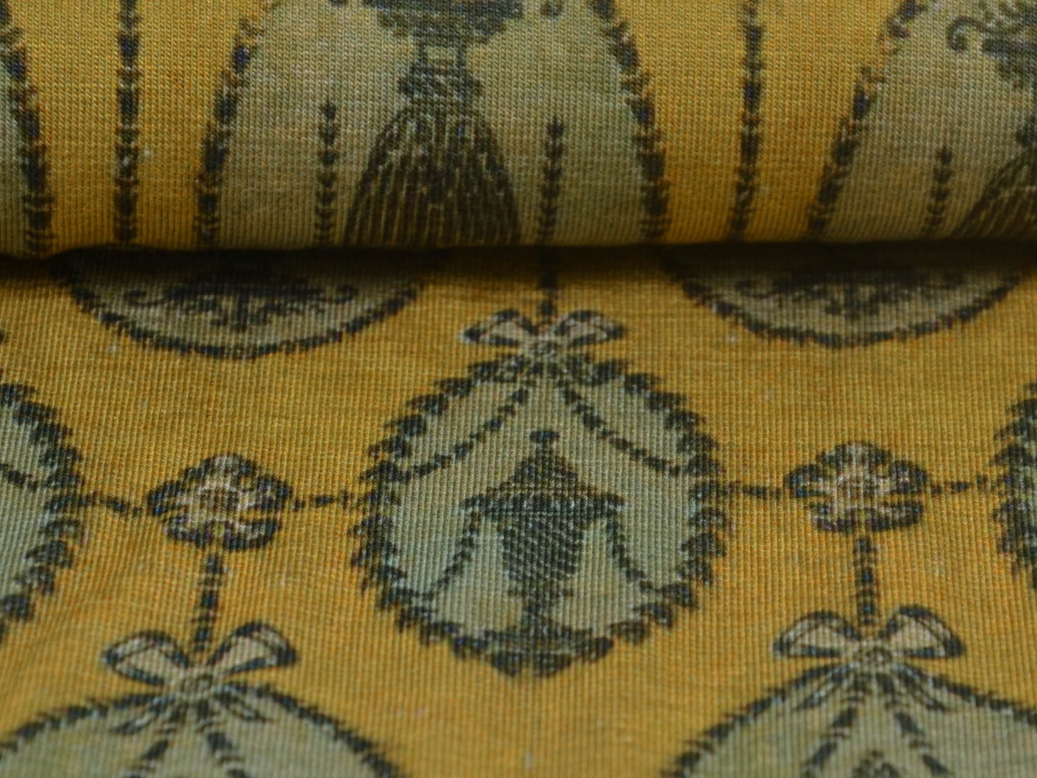 Hochwertiger Designer-Jersey made in Italy. Der Viskose-Jersey zeigt einen Print aus Ornamenten in gelb, grün und grau. Der Stoff hat die Eigenschaften eines Interlock-Jerseys. Er eignet sich wunderbar zum Nähen von T-Shirts, Kleidern und Röcken.