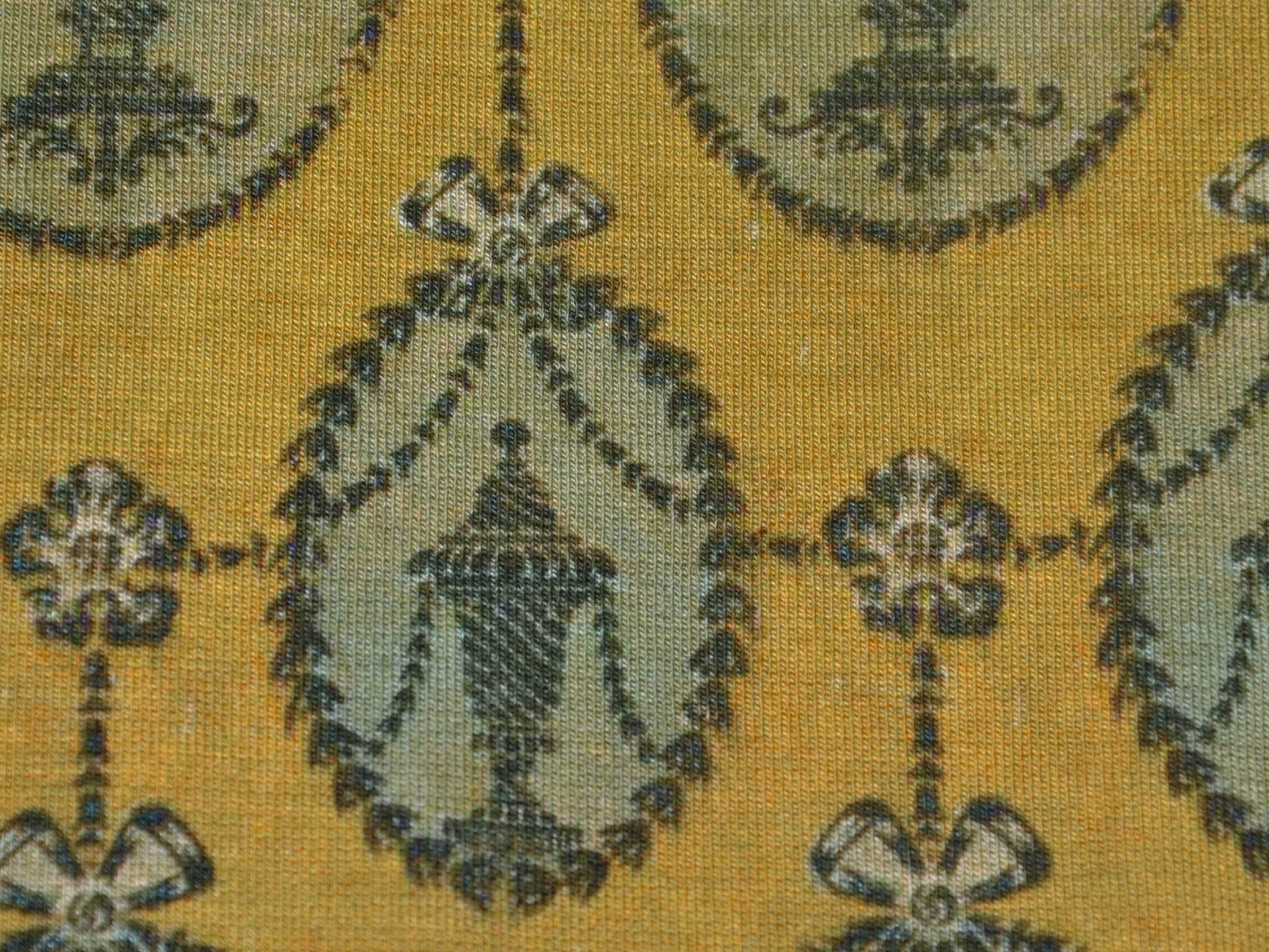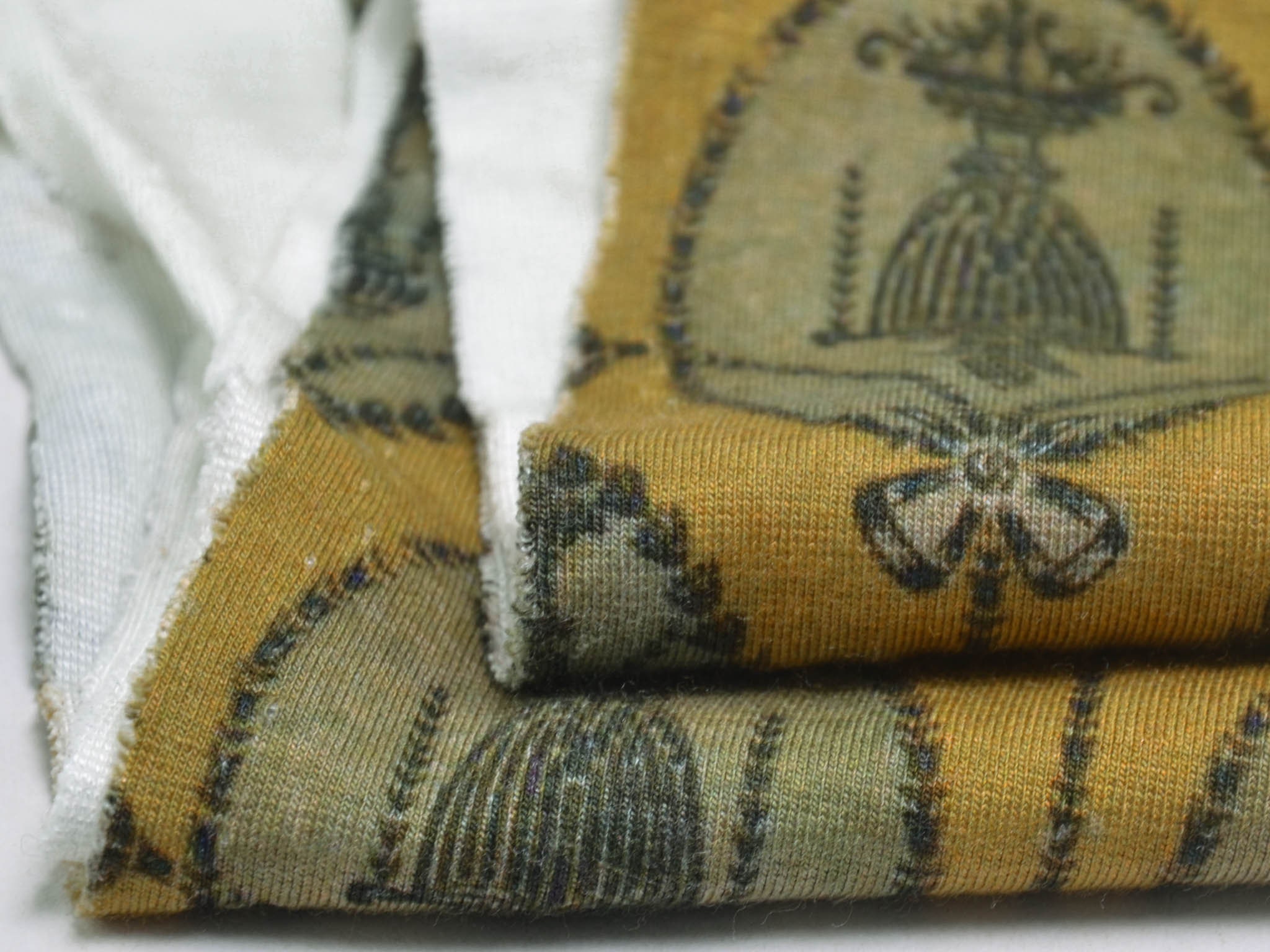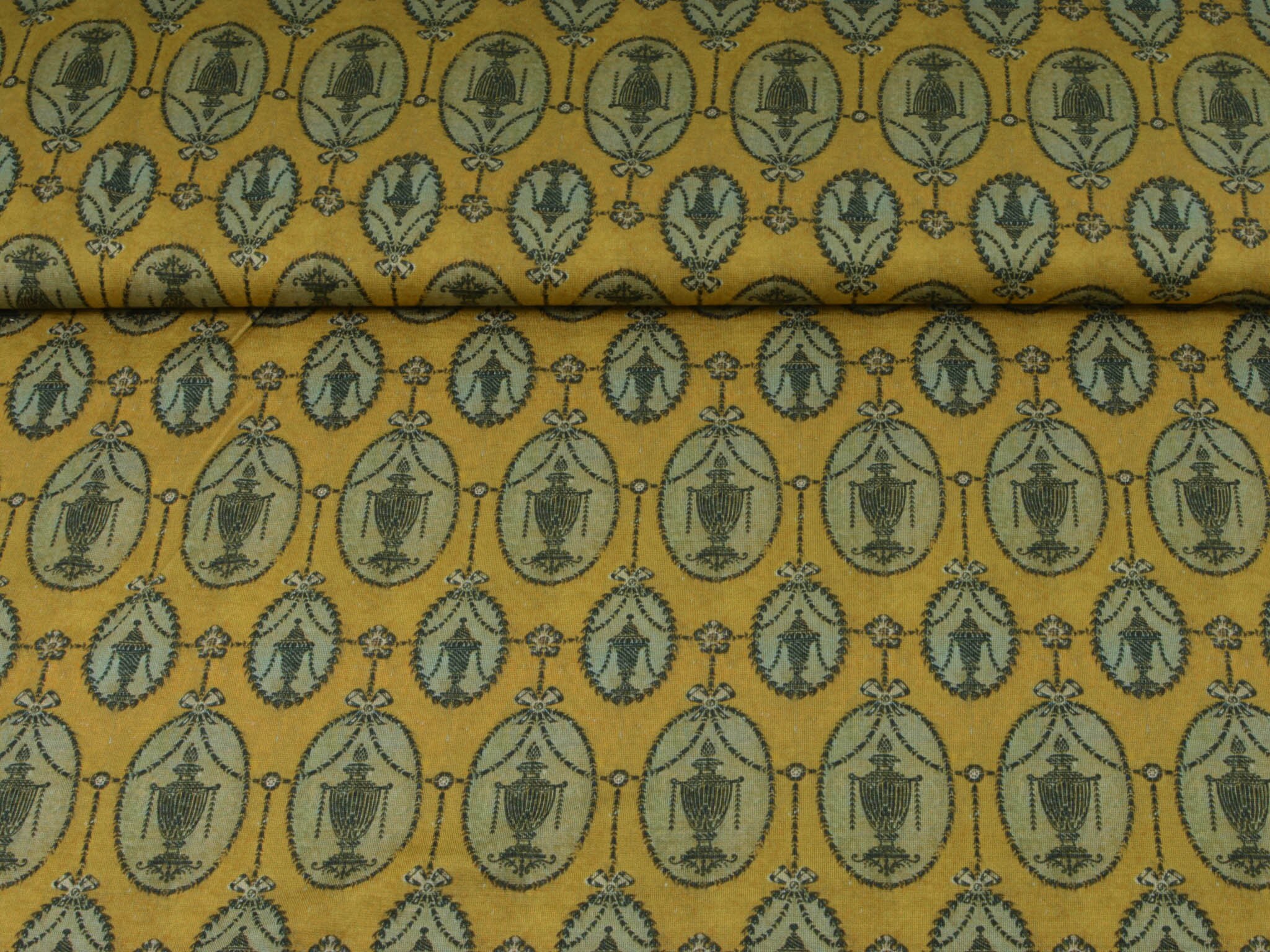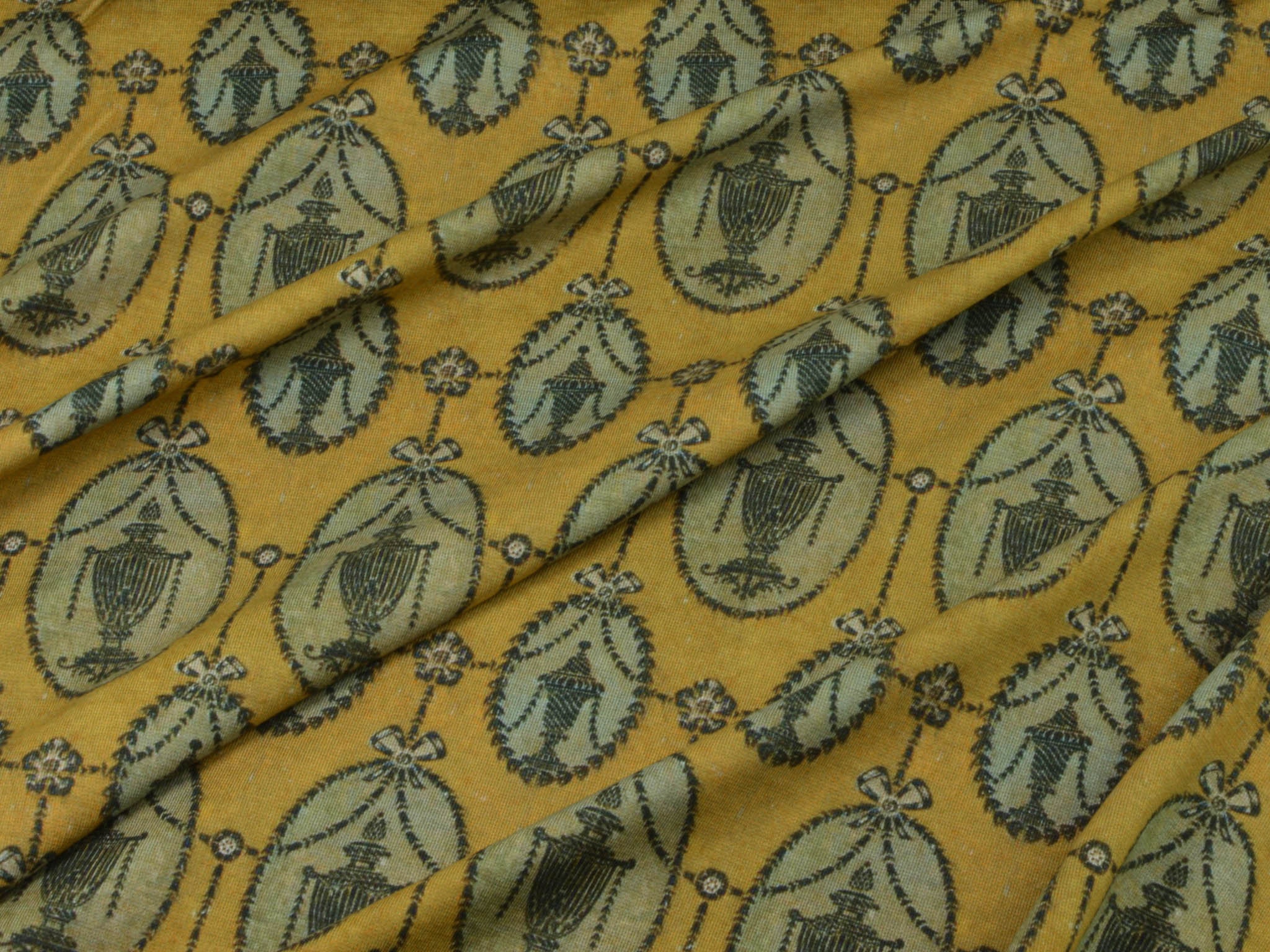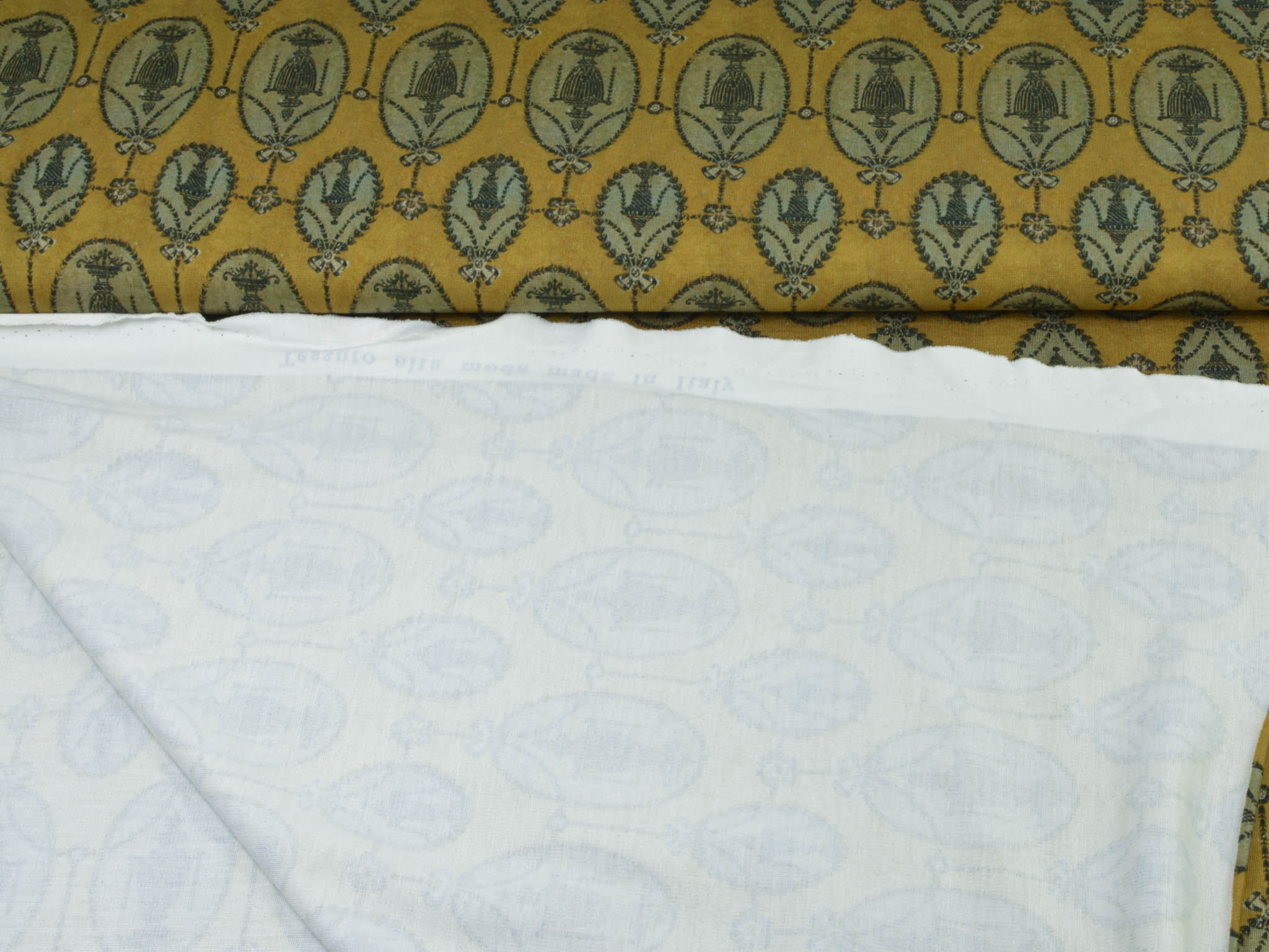 Hochwertiger Designer-Jersey made in Italy. Der Viskose-Jersey zeigt einen Print aus Ornamenten in gelb, grün und grau. Der Stoff hat die Eigenschaften eines Interlock-Jerseys. Er eignet sich wunderbar zum Nähen von T-Shirts, Kleidern und Röcken.