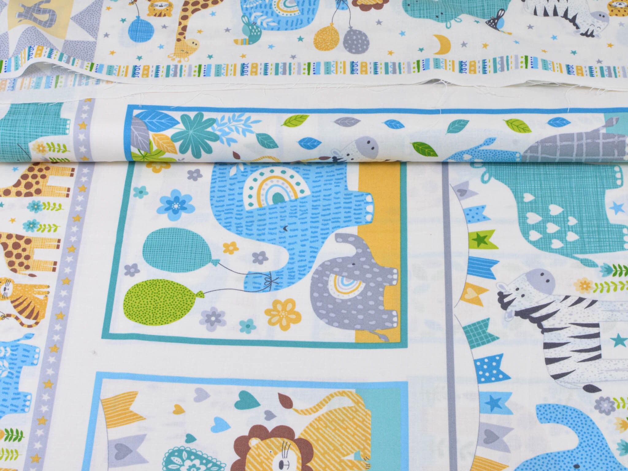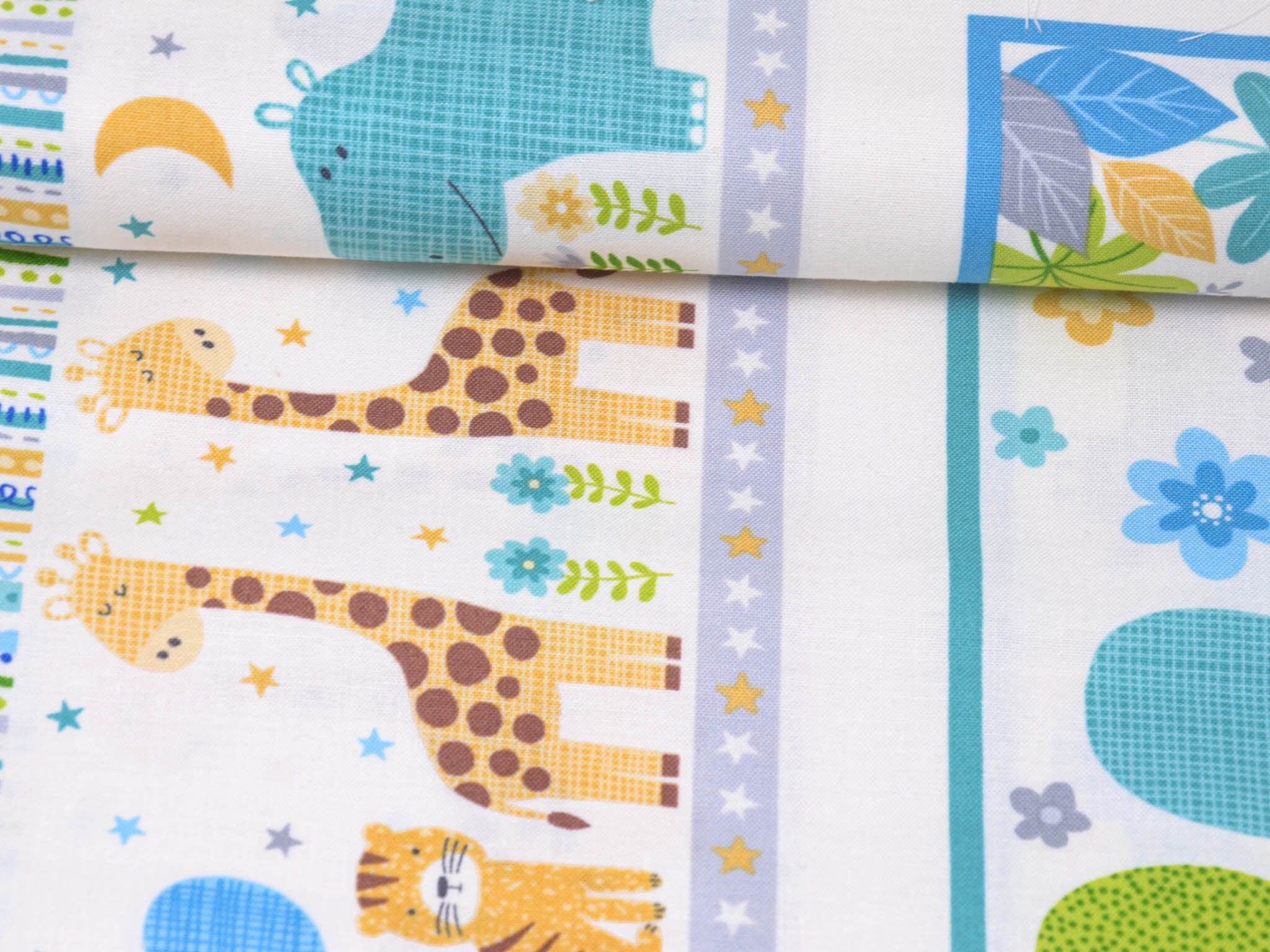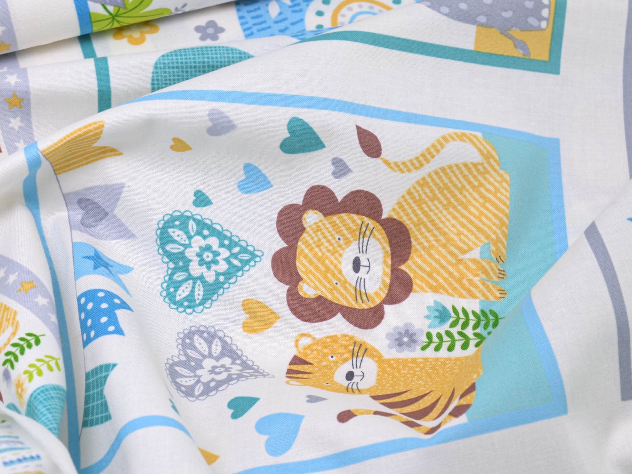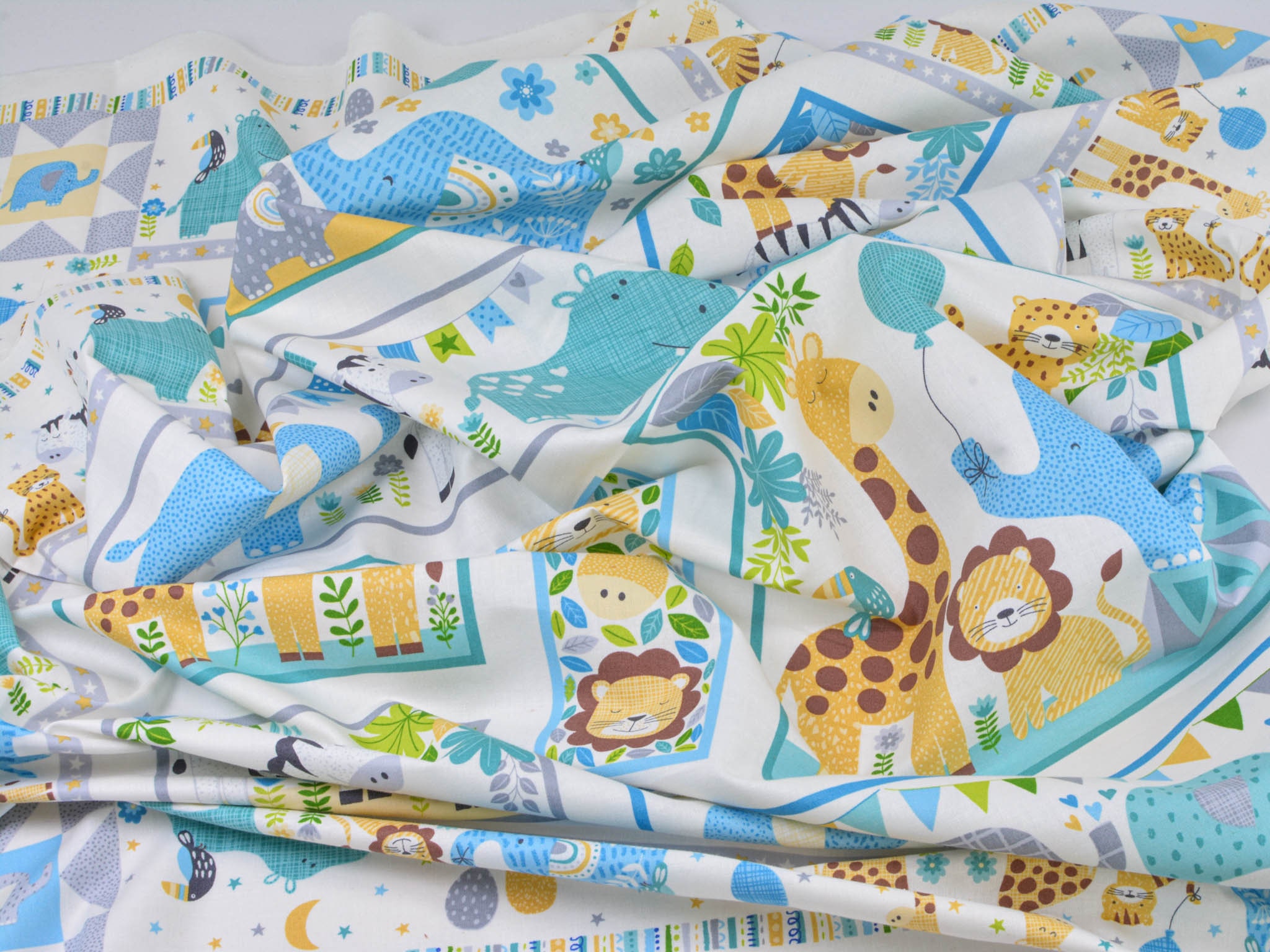 Hochwertiges Panel aus Baumwolle. Der Grund ist weiß, darauf Löwen, Giraffen, Elefanten, Zebras, Nilpferde und Leoparden zu entdecken. Dieses Panel ist zum Nähen von Decken und Krabbel-Decken gedacht. Auf die Rückseite kannst du einen tollen Fleecestoff nähen, dieser ist kuschelig und voluminös zugleich. Wenn du es gerne noch dicker haben möchtest, zum Beispiel für eine Krabbel-Decke, verwende zusätzlich ein Volumenvlies. Tipp: Fleece und Volumenvlies gibt es aus Polyester oder aus Baumwolle.