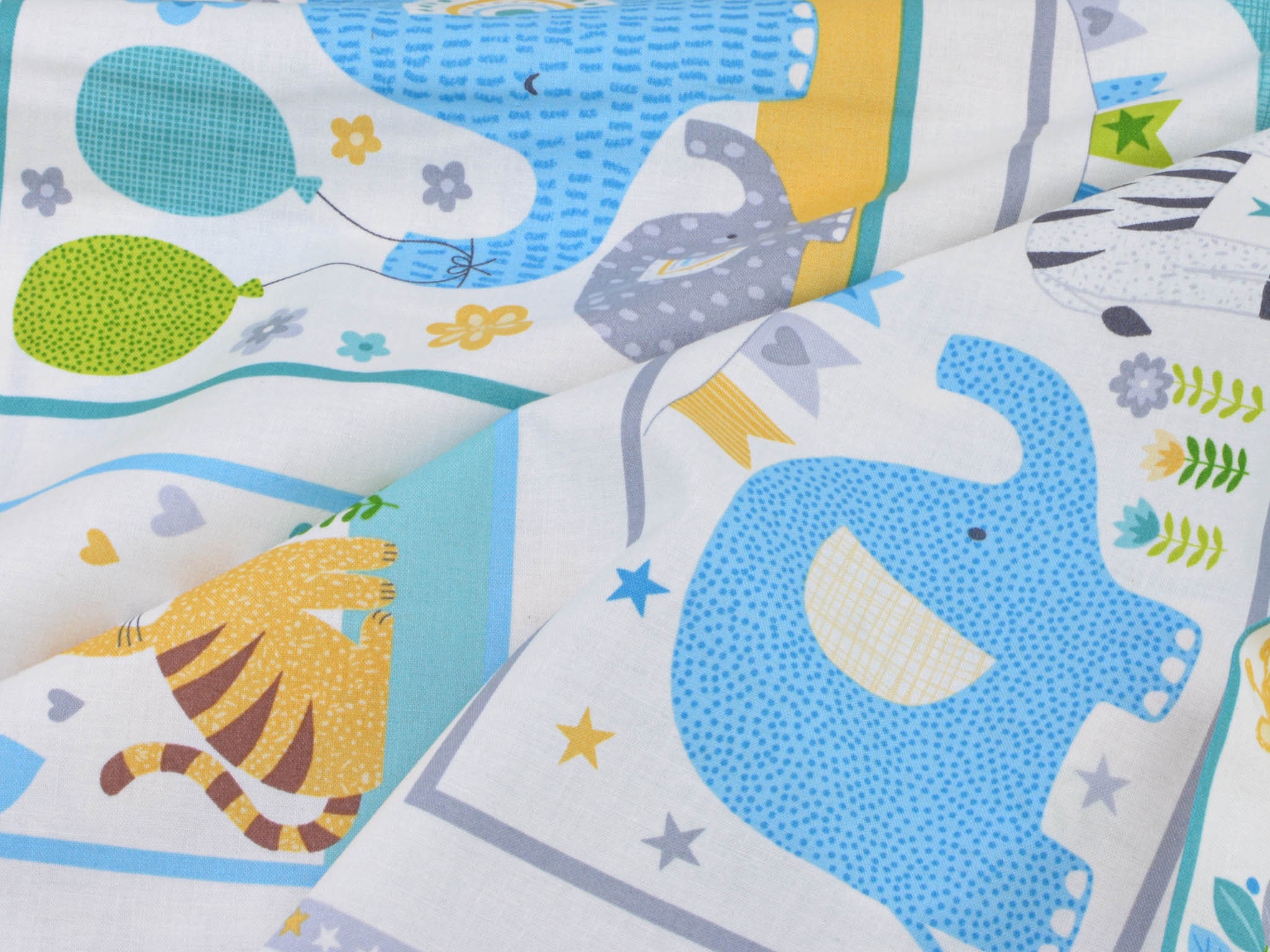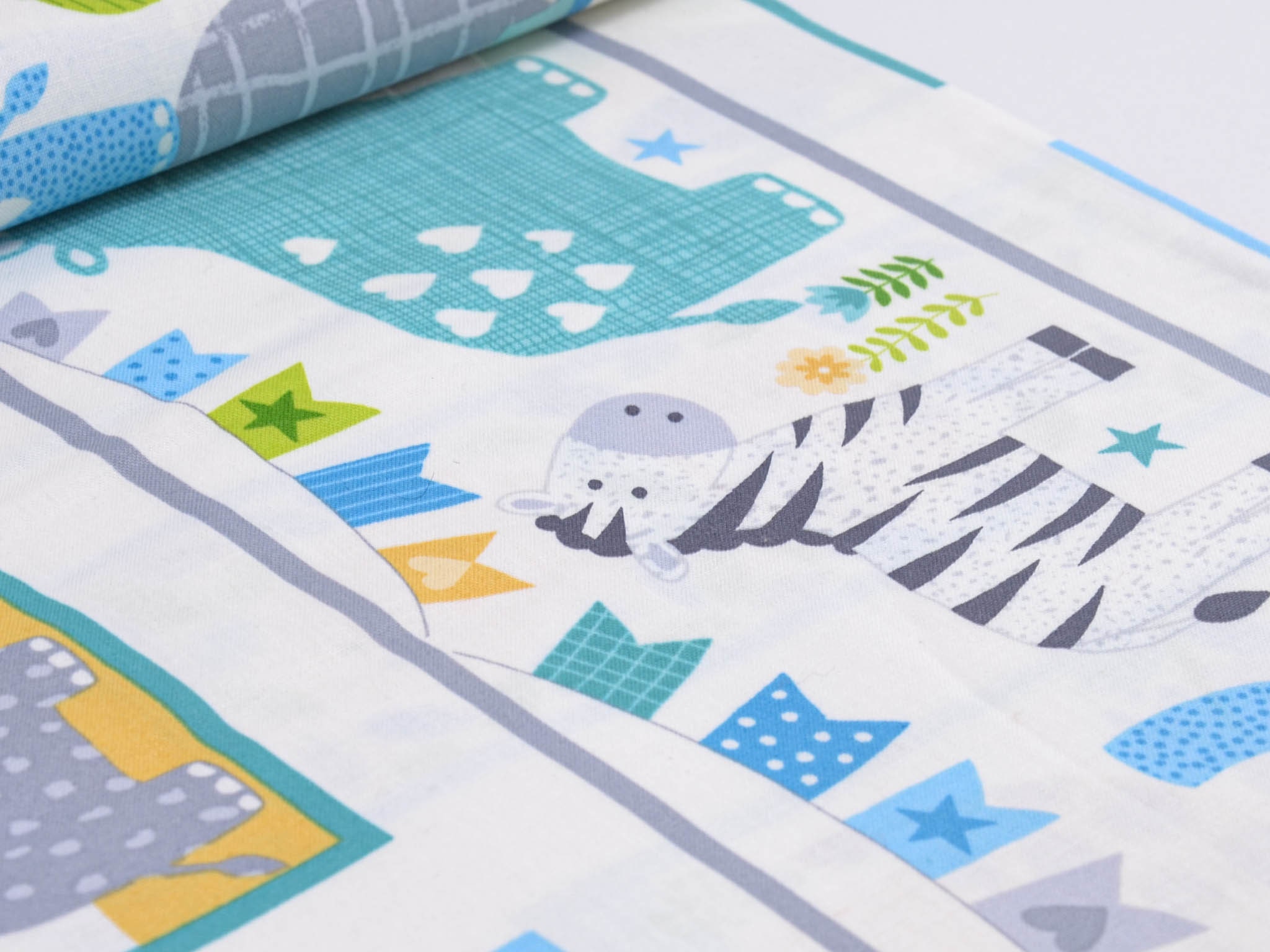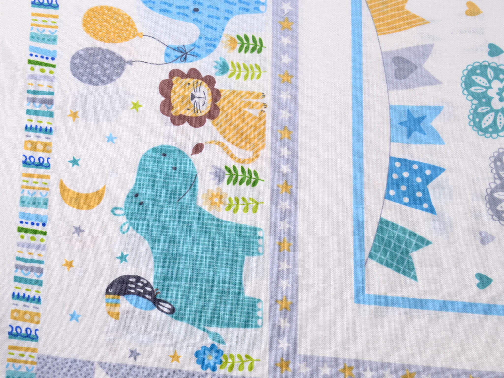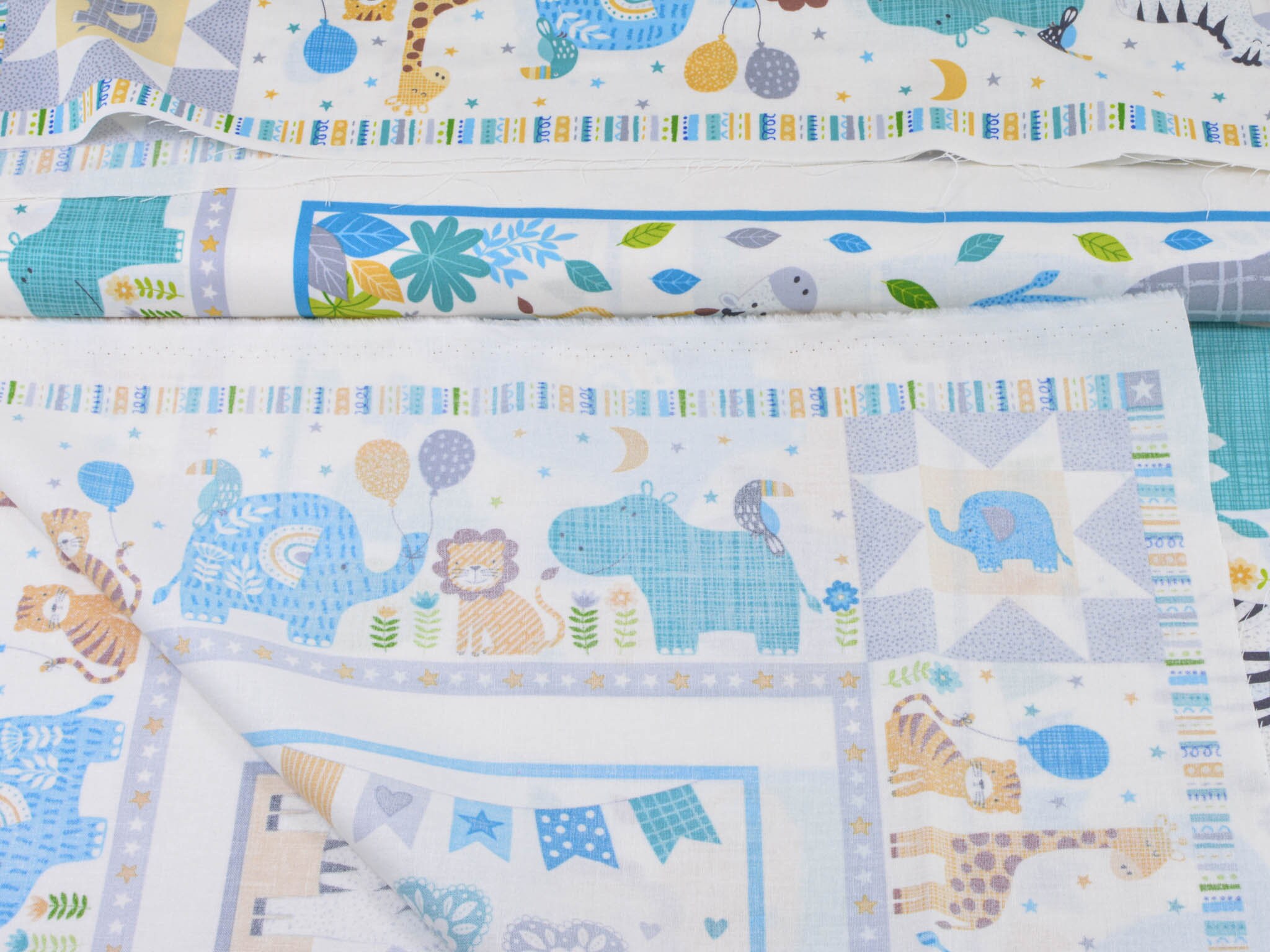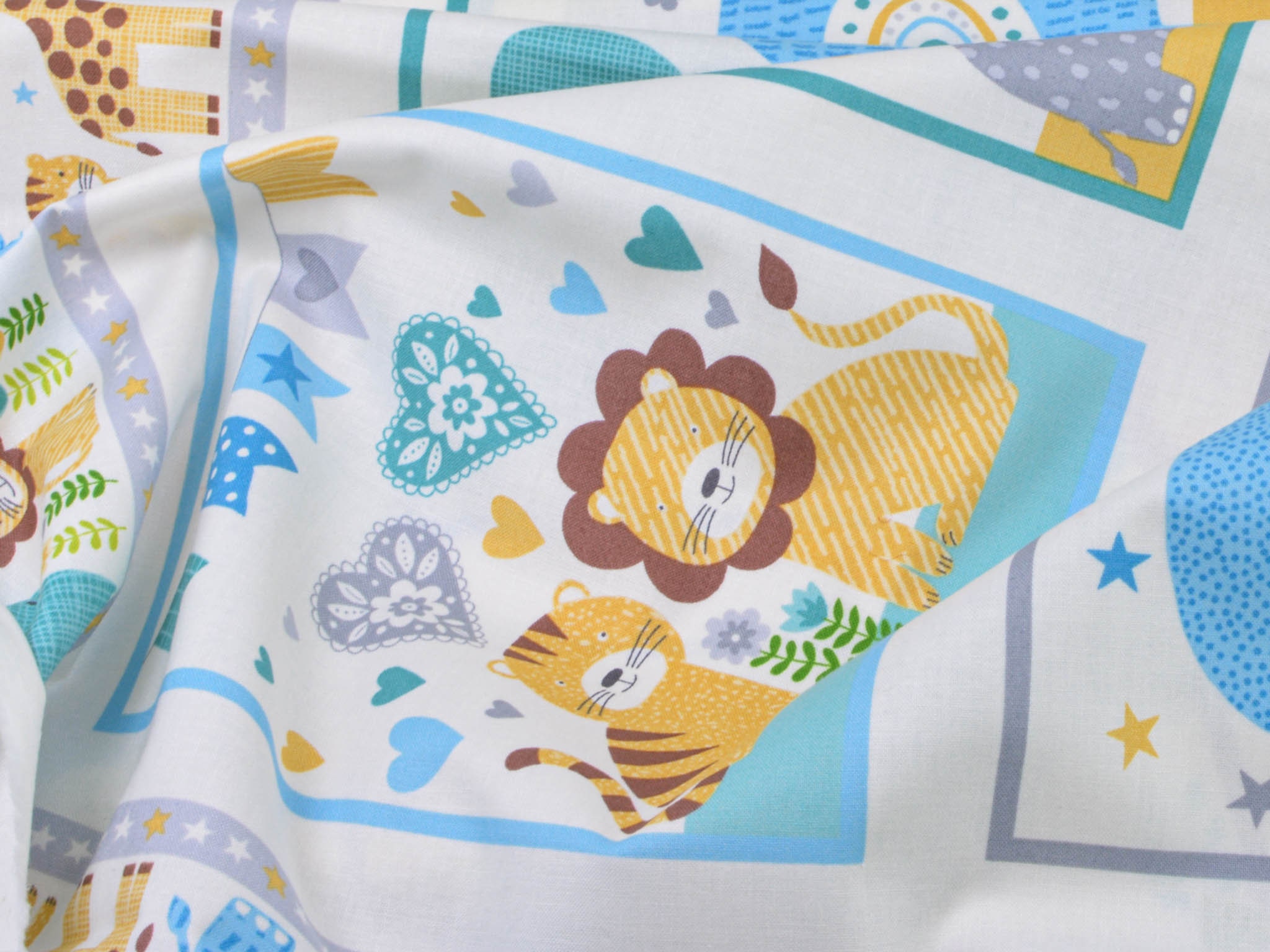 Hochwertiges Panel aus Baumwolle. Der Grund ist weiß, darauf Löwen, Giraffen, Elefanten, Zebras, Nilpferde und Leoparden zu entdecken. Dieses Panel ist zum Nähen von Decken und Krabbel-Decken gedacht. Auf die Rückseite kannst du einen tollen Fleecestoff nähen, dieser ist kuschelig und voluminös zugleich. Wenn du es gerne noch dicker haben möchtest, zum Beispiel für eine Krabbel-Decke, verwende zusätzlich ein Volumenvlies. Tipp: Fleece und Volumenvlies gibt es aus Polyester oder aus Baumwolle.