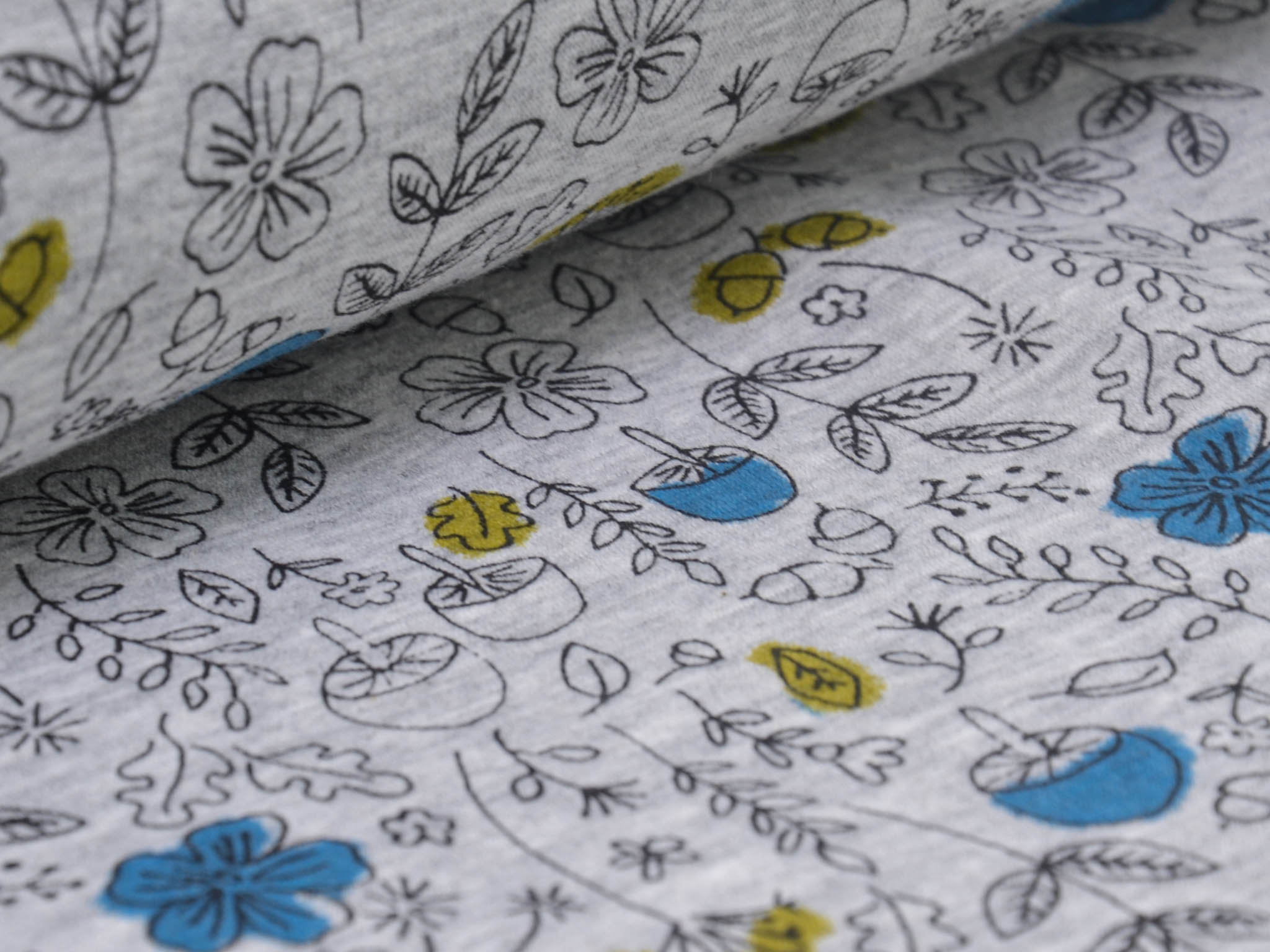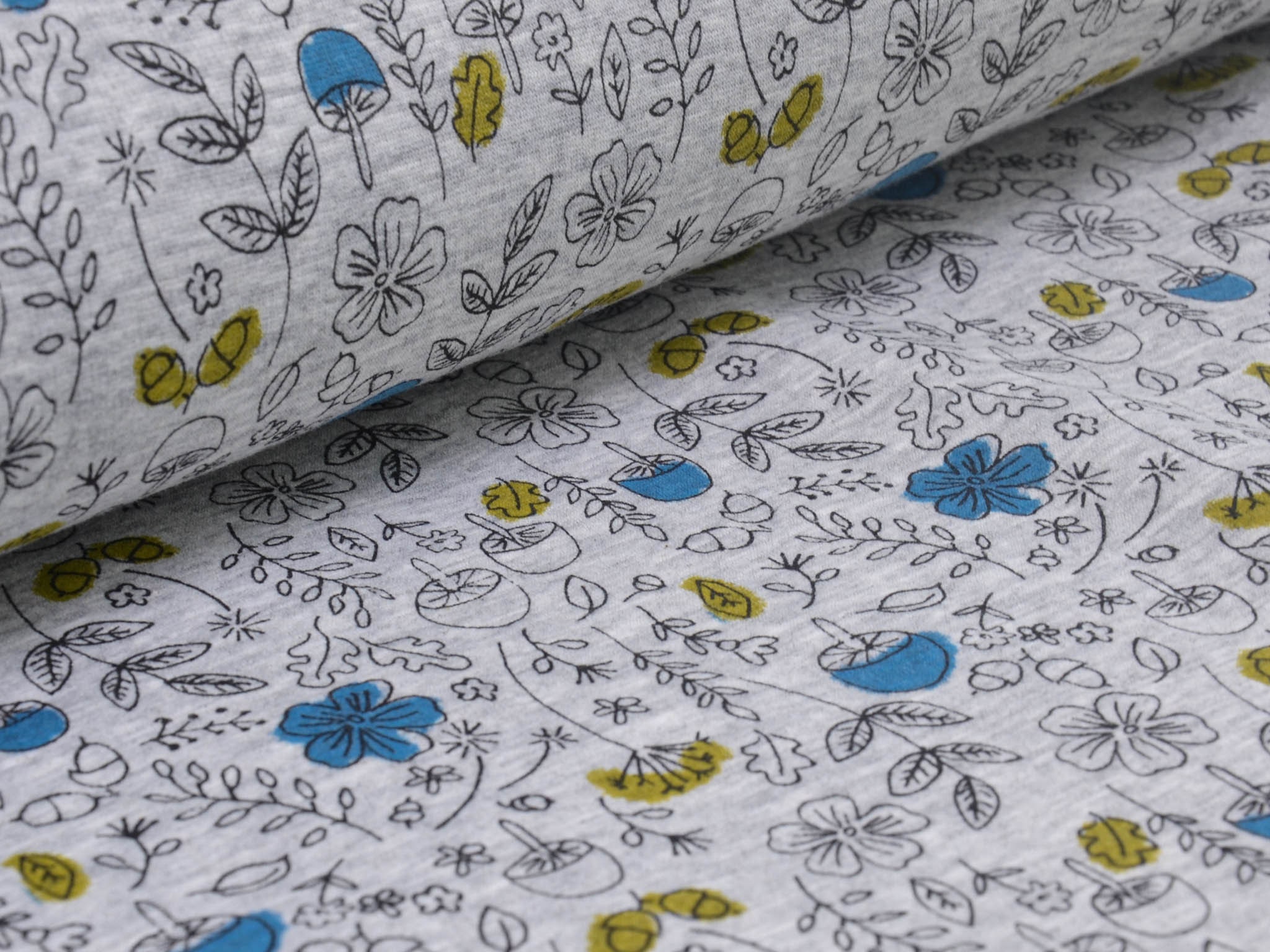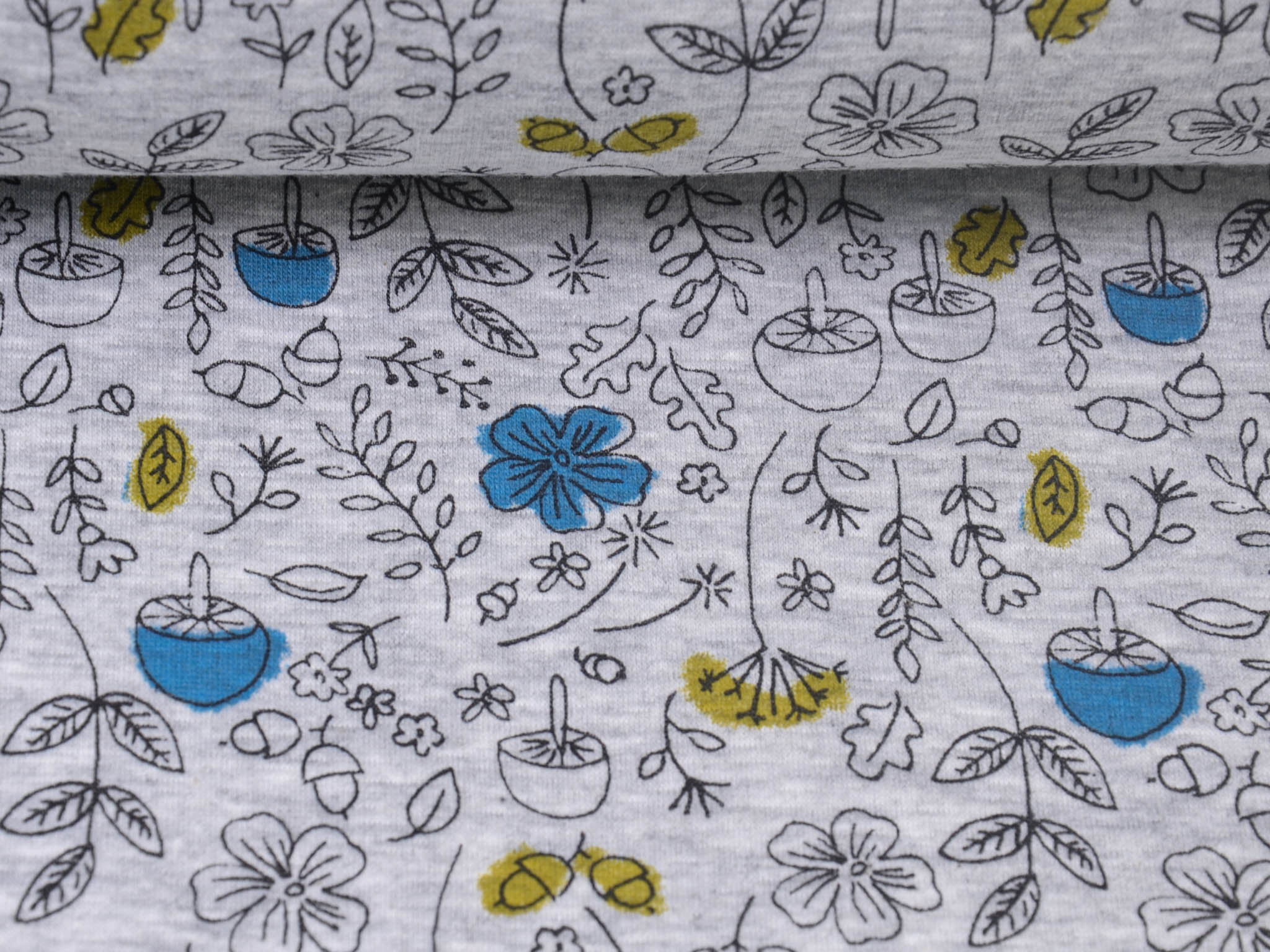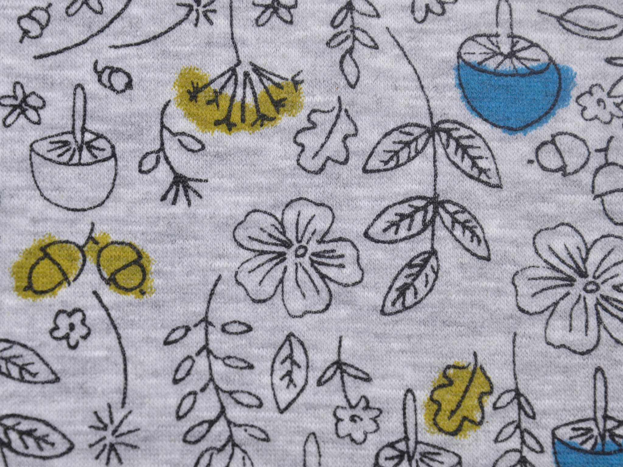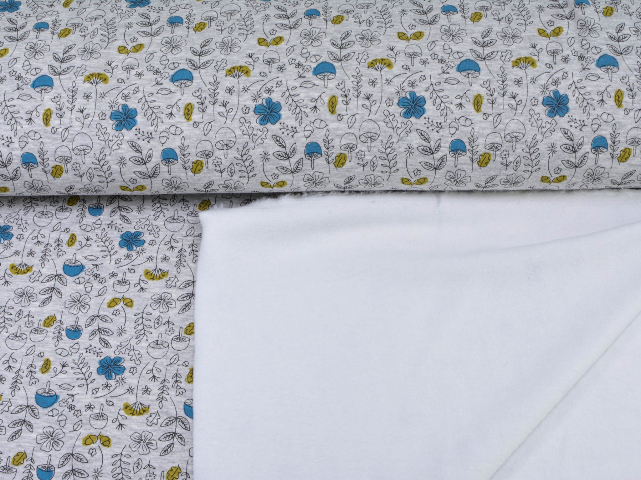Sweatstoff, Alpenfleece in grau meliert mit Blumen und Pilzen. Der Stoff ist auf der Innenseite weiß, weich und flauschig. Du kannst aus dem Stoff Pullover, Sweatjacken, Pumphosen, Jogginghose, Schals und vielem mehr nähen.