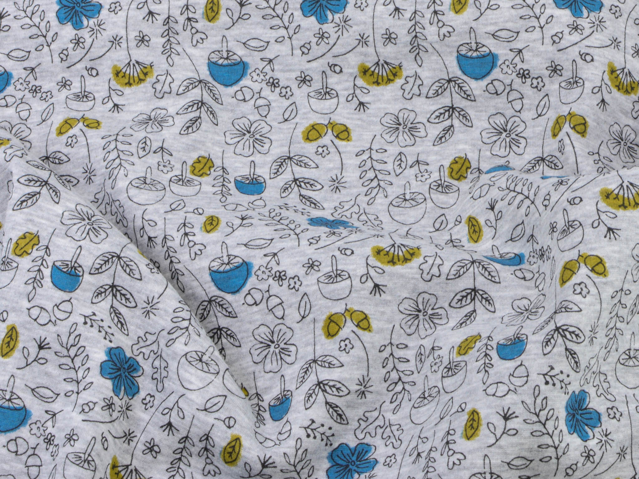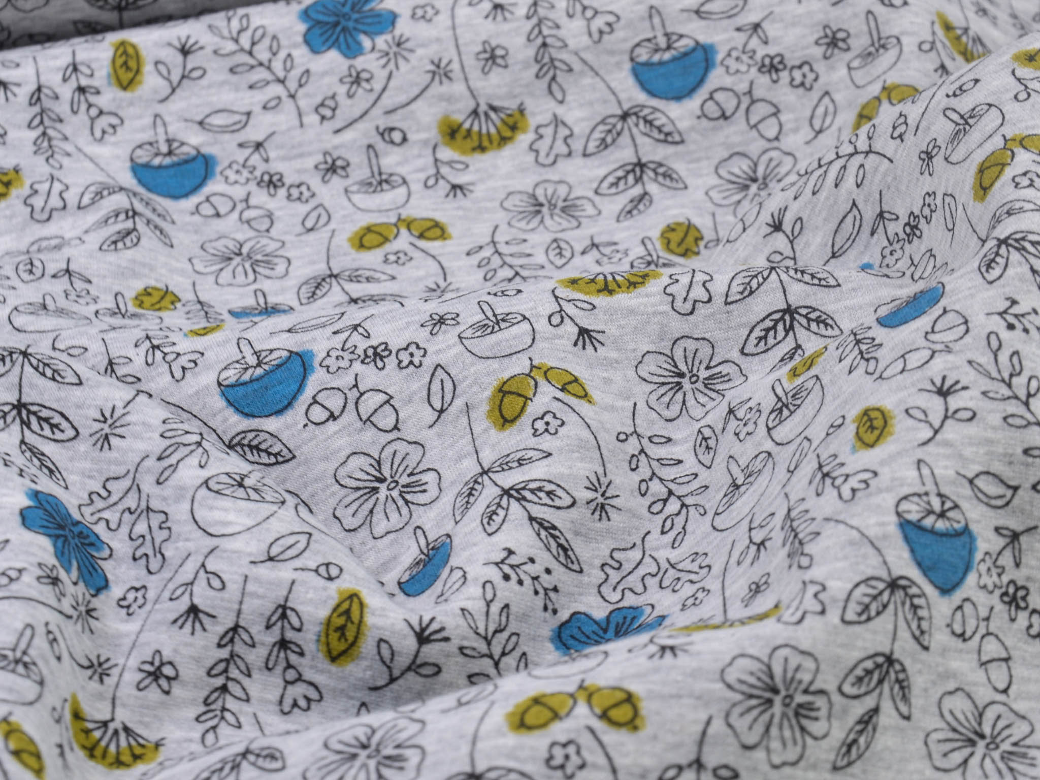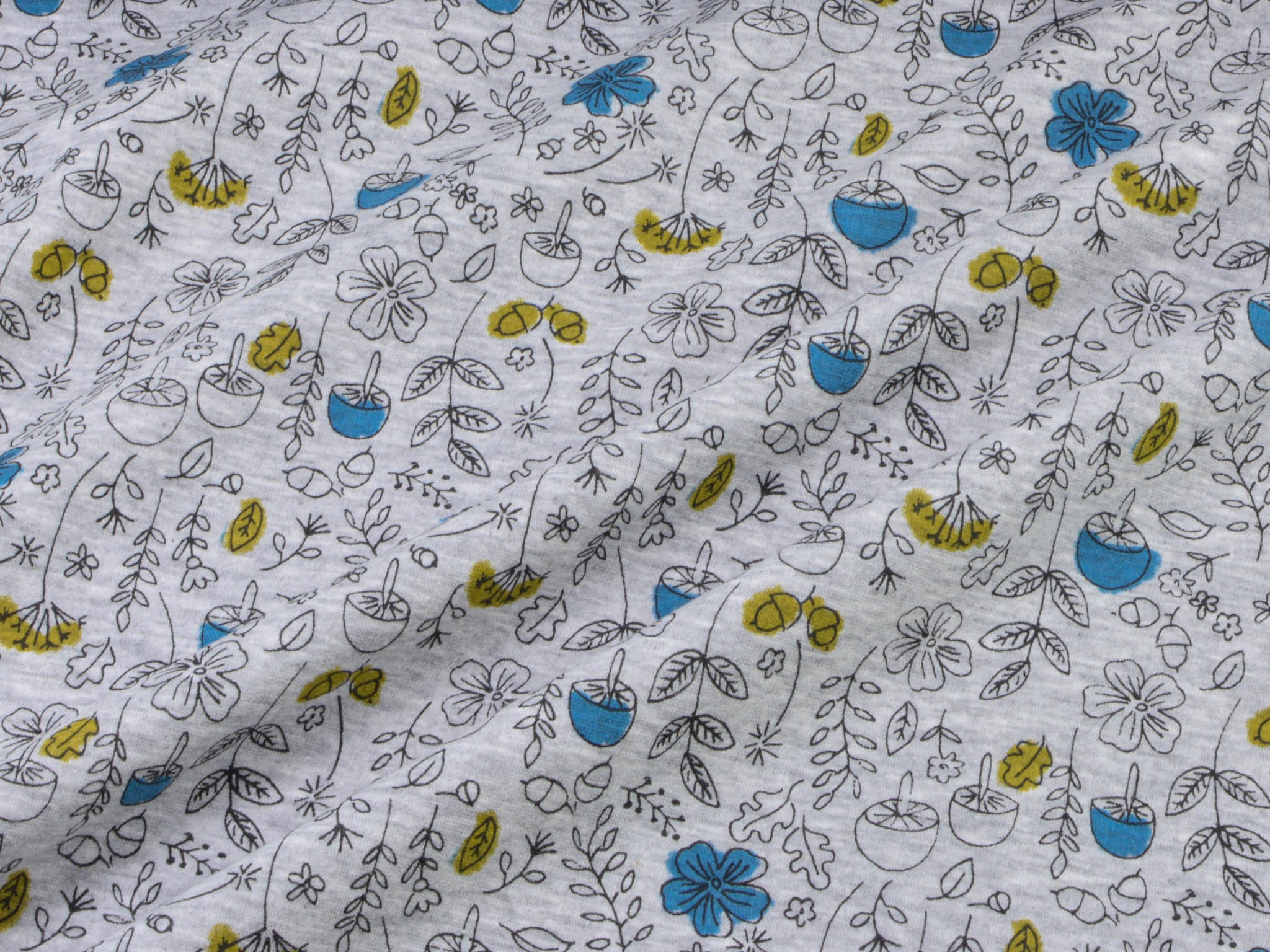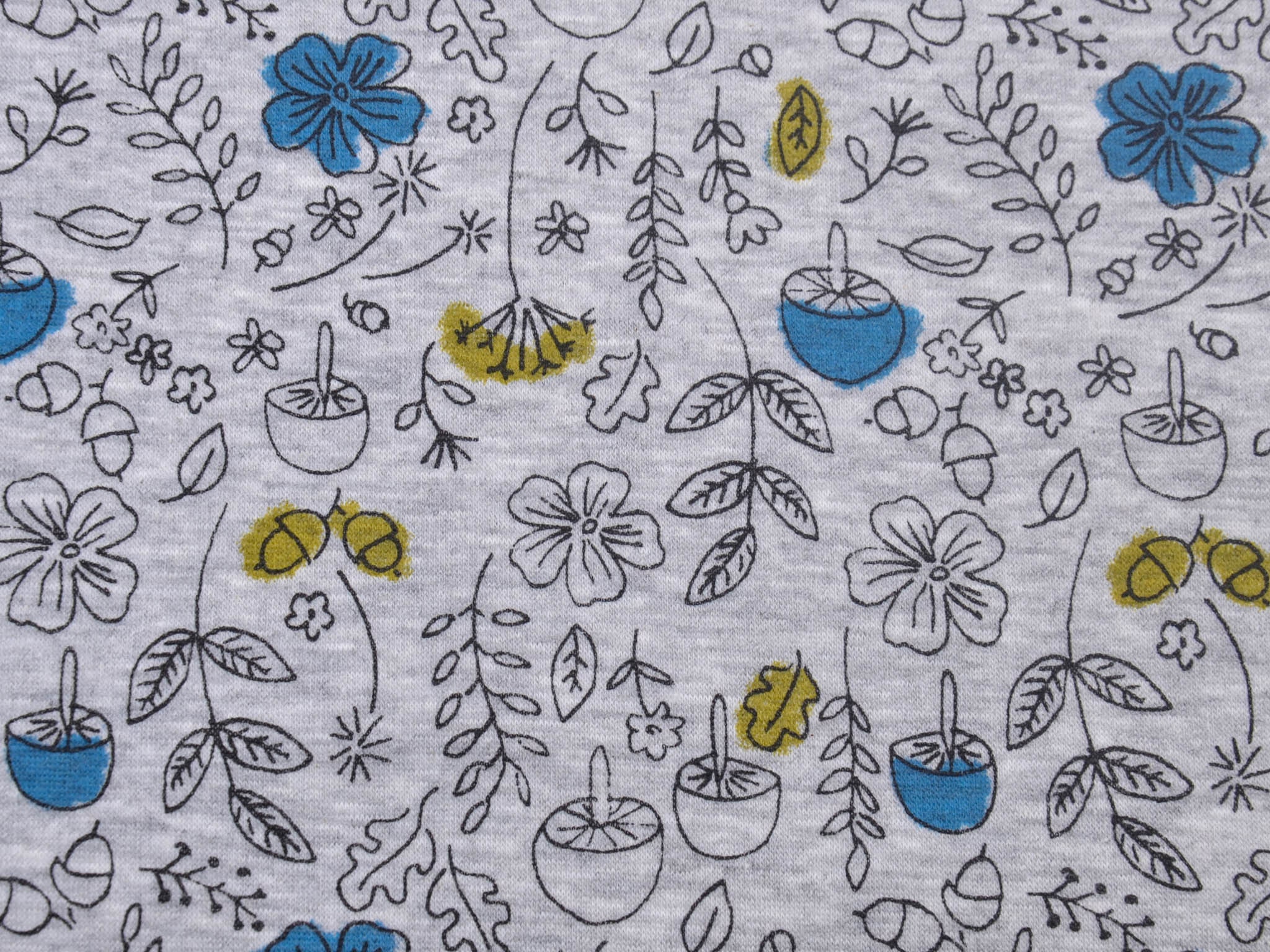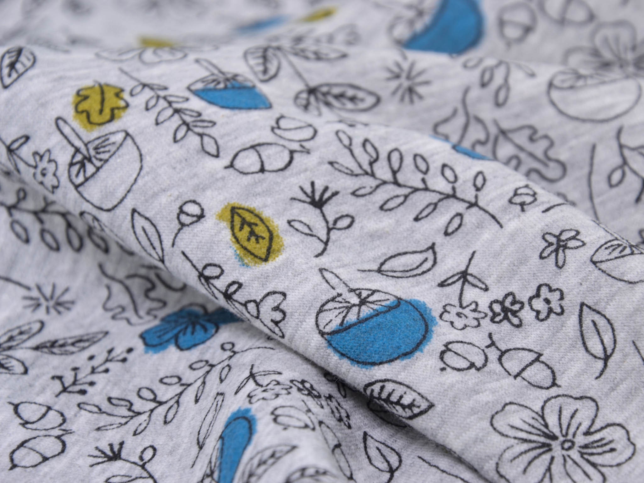 Sweatstoff, Alpenfleece in grau meliert mit Blumen und Pilzen. Der Stoff ist auf der Innenseite weiß, weich und flauschig. Du kannst aus dem Stoff Pullover, Sweatjacken, Pumphosen, Jogginghose, Schals und vielem mehr nähen.