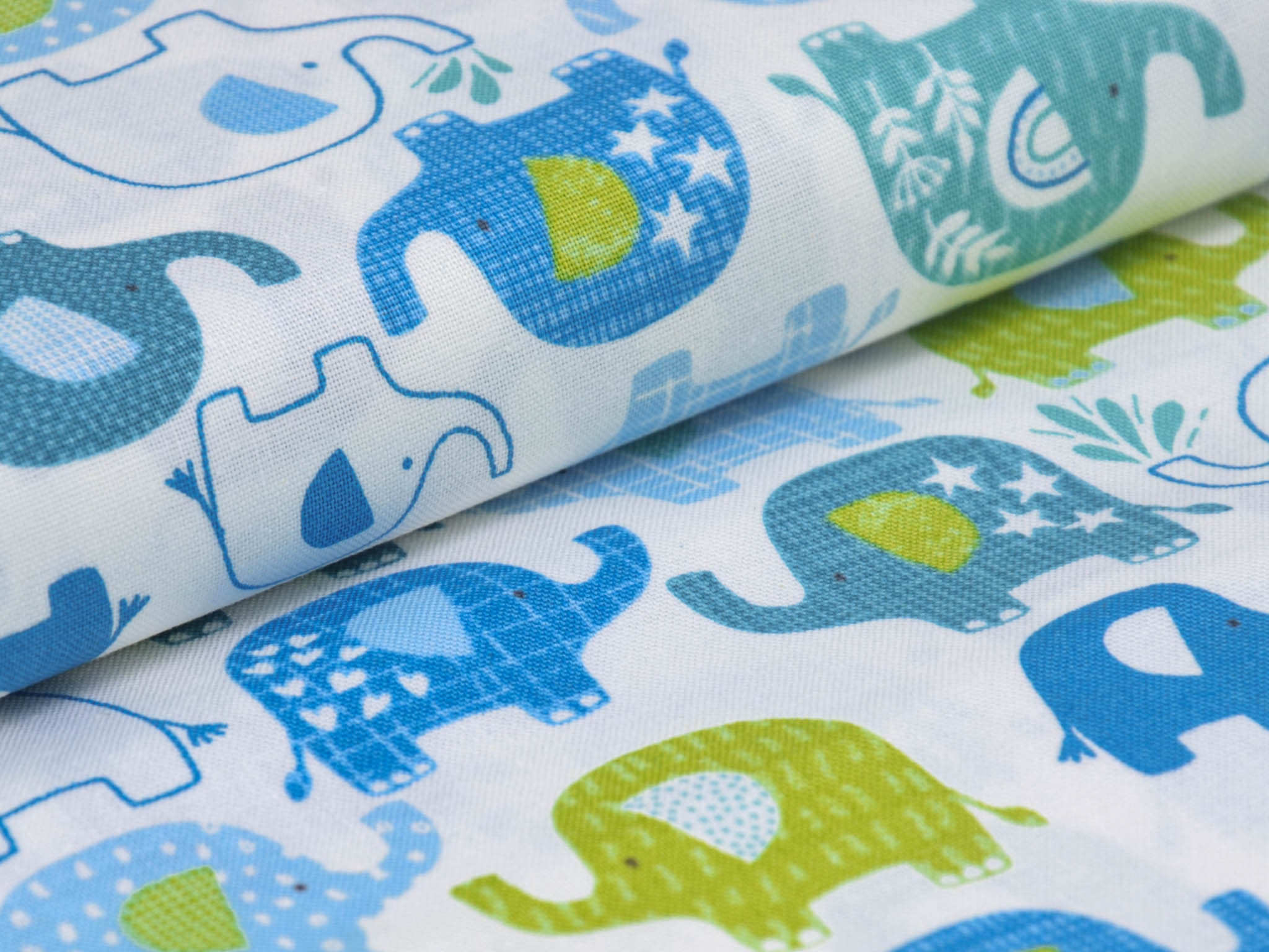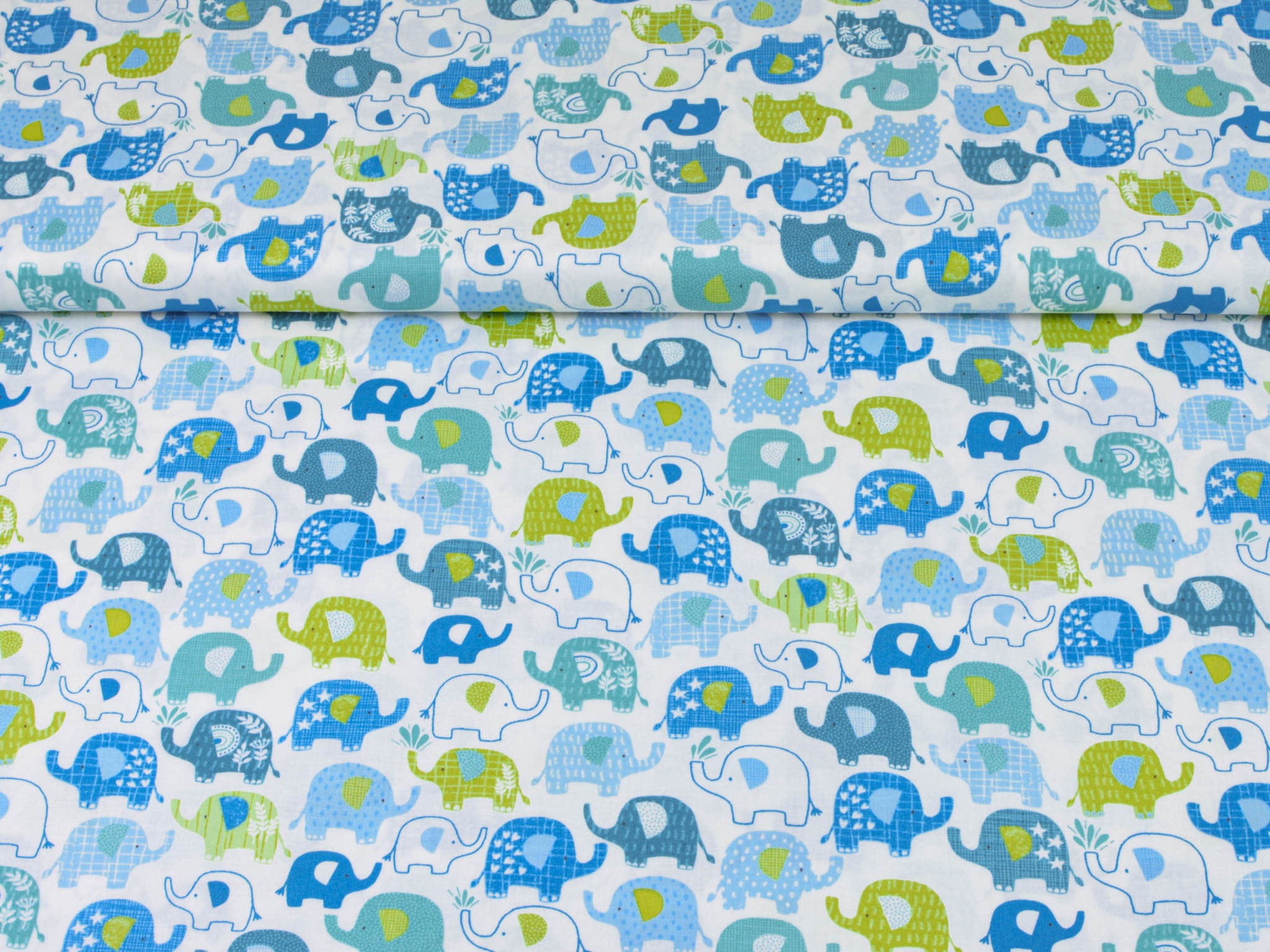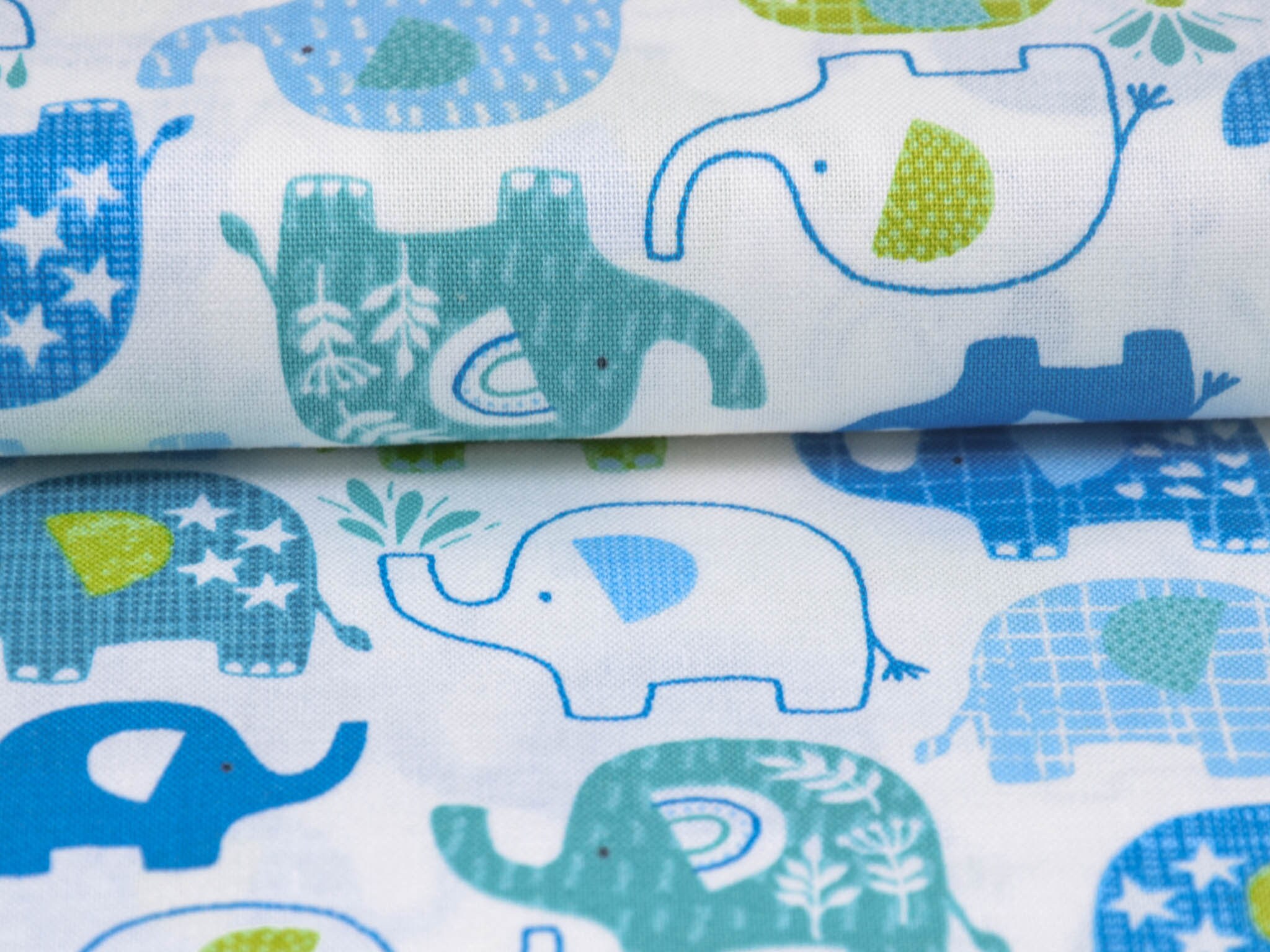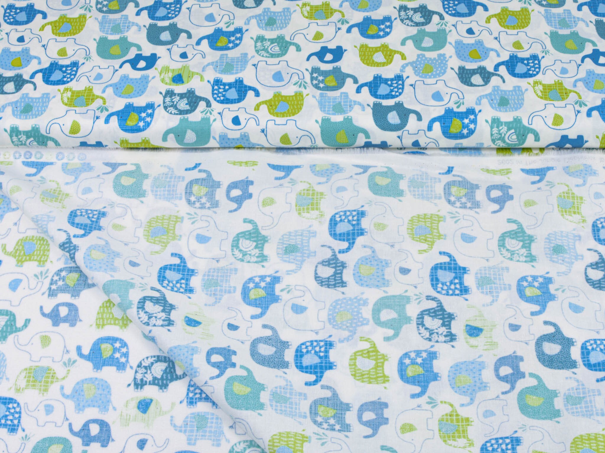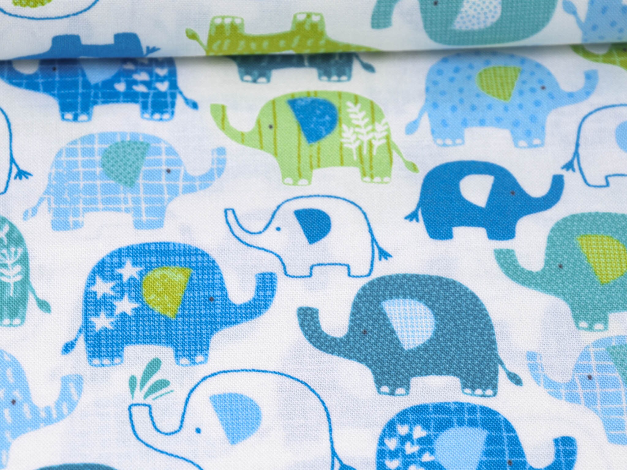 Hochwertiger Patchwork Stoff aus Baumwolle. Der Grund ist weiß, darauf sind Elefanten in grün, blau und petrol. Du kannst den Stoff zum Patchworken verwenden. Aber auch zum Nähen von Kuscheltieren, Utensilos, Kissen, Kinderdeko und vielem mehr. Ein Elefant ist ca. 3 cm hoch.