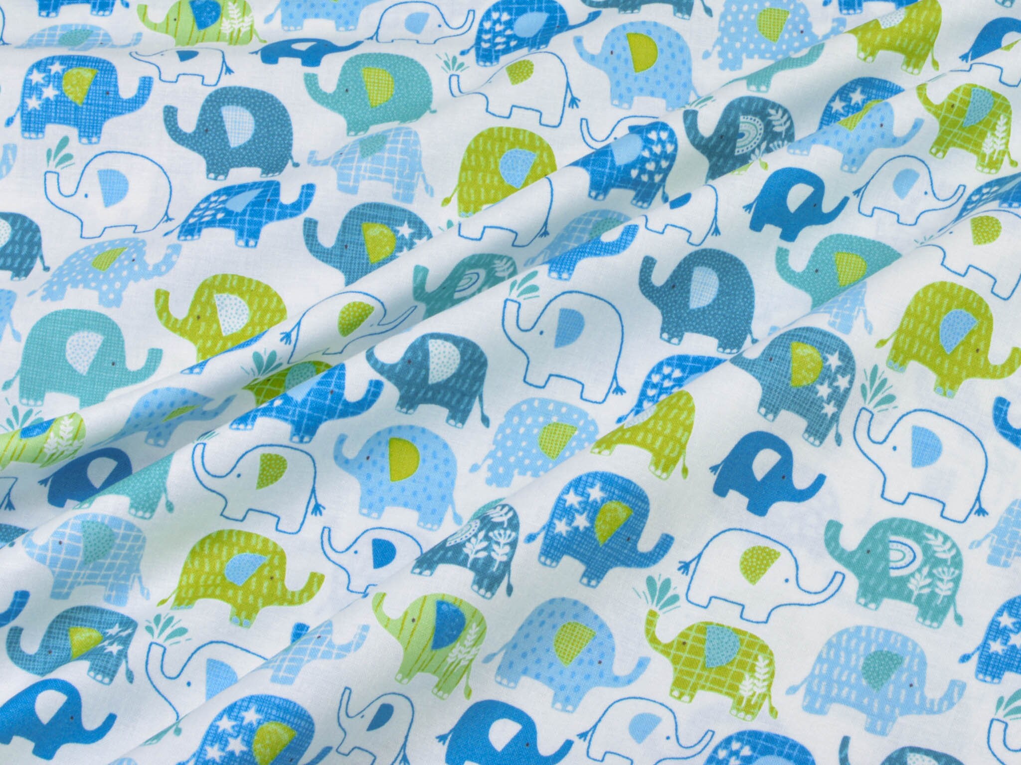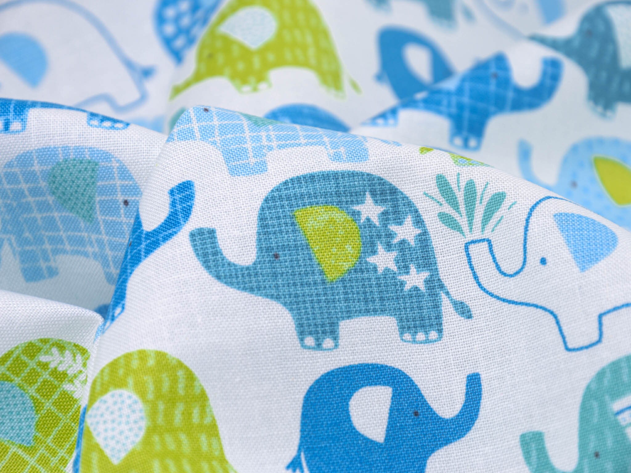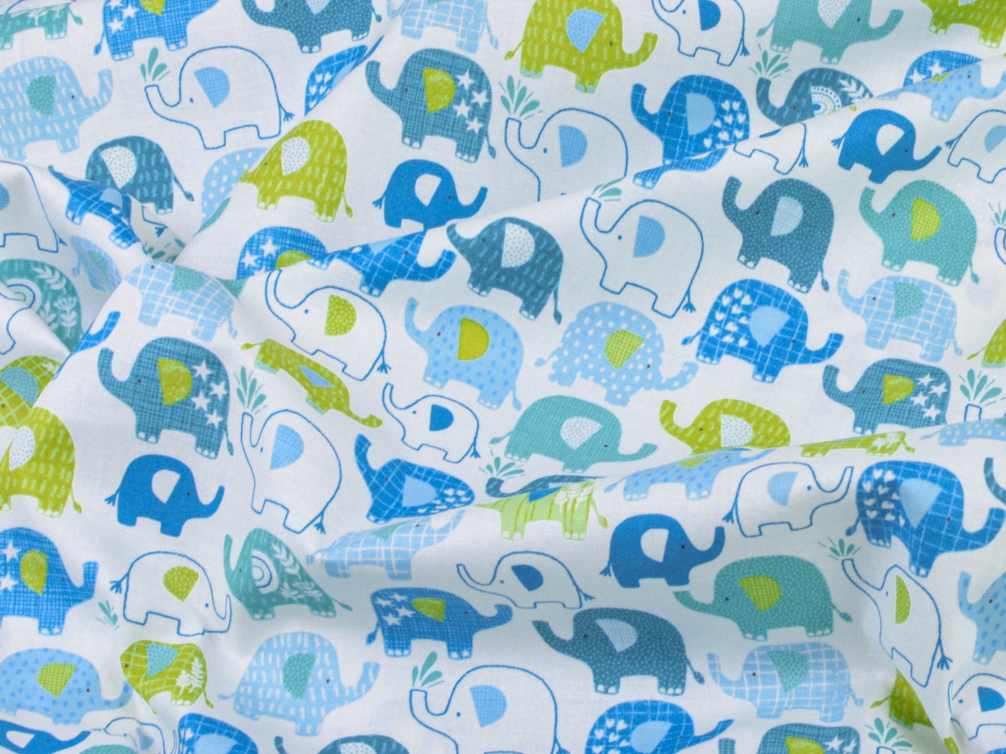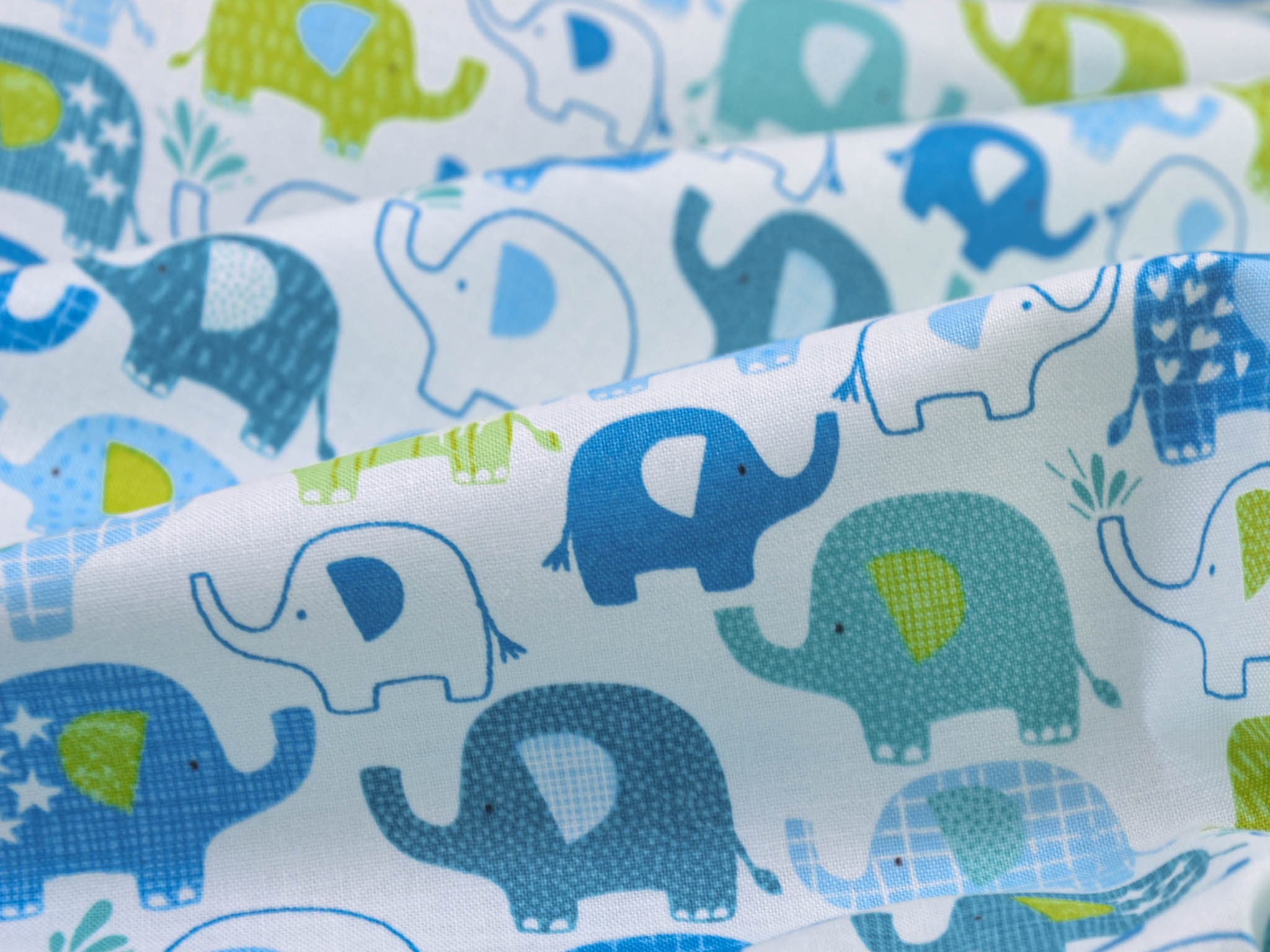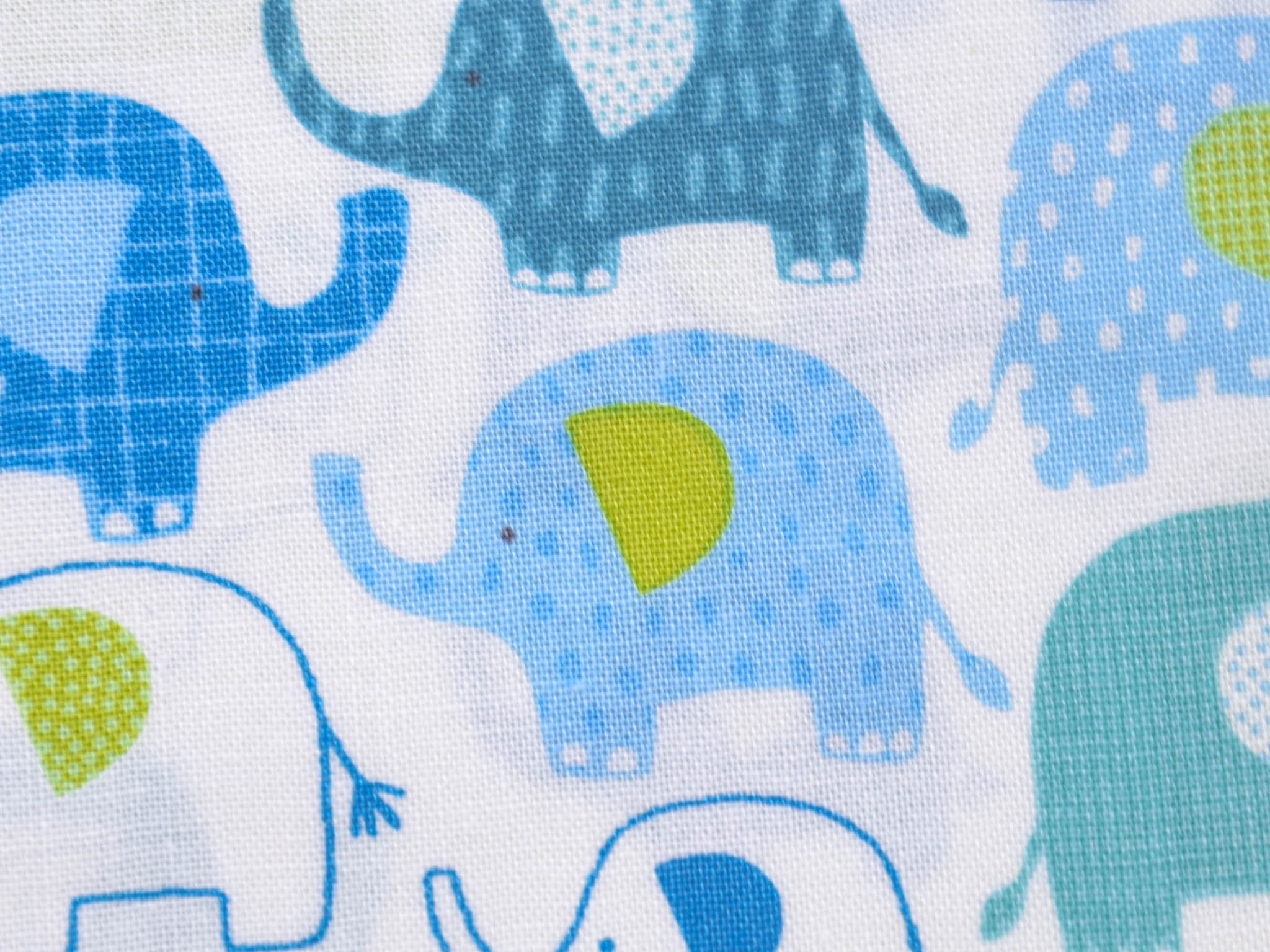 Hochwertiger Patchwork Stoff aus Baumwolle. Der Grund ist weiß, darauf sind Elefanten in grün, blau und petrol. Du kannst den Stoff zum Patchworken verwenden. Aber auch zum Nähen von Kuscheltieren, Utensilos, Kissen, Kinderdeko und vielem mehr. Ein Elefant ist ca. 3 cm hoch.